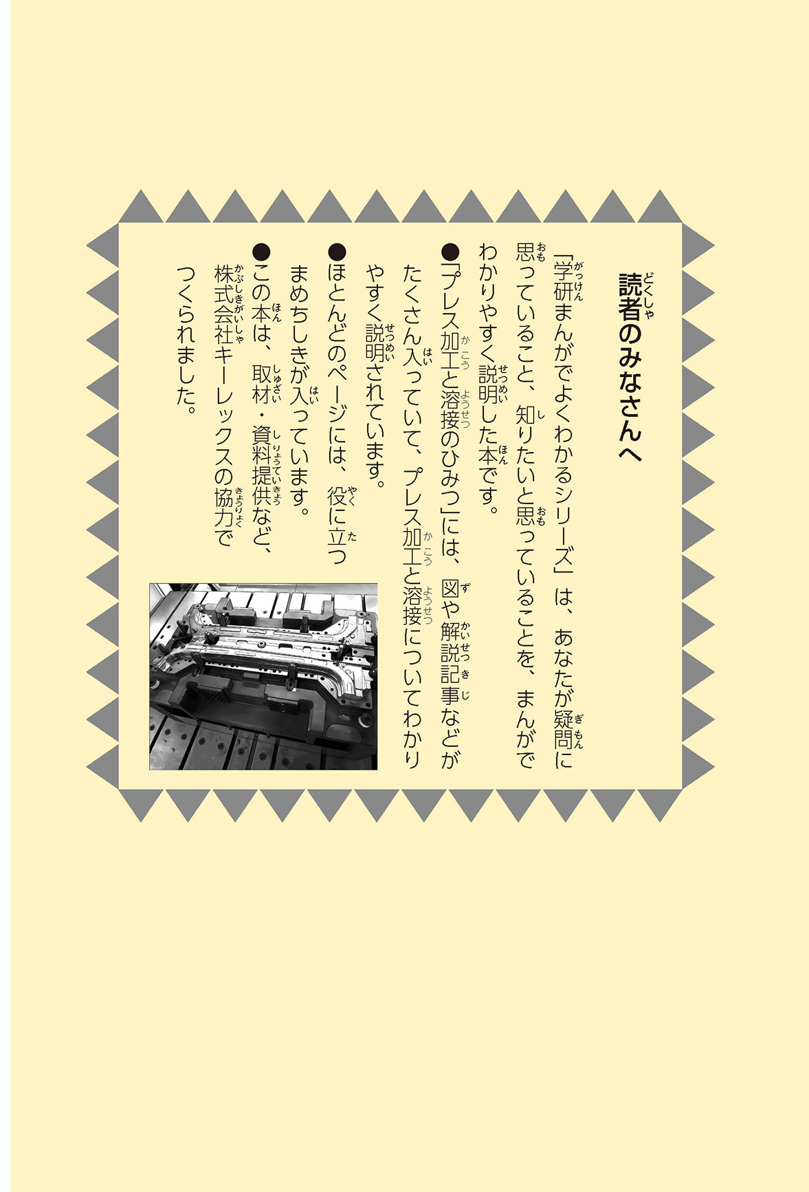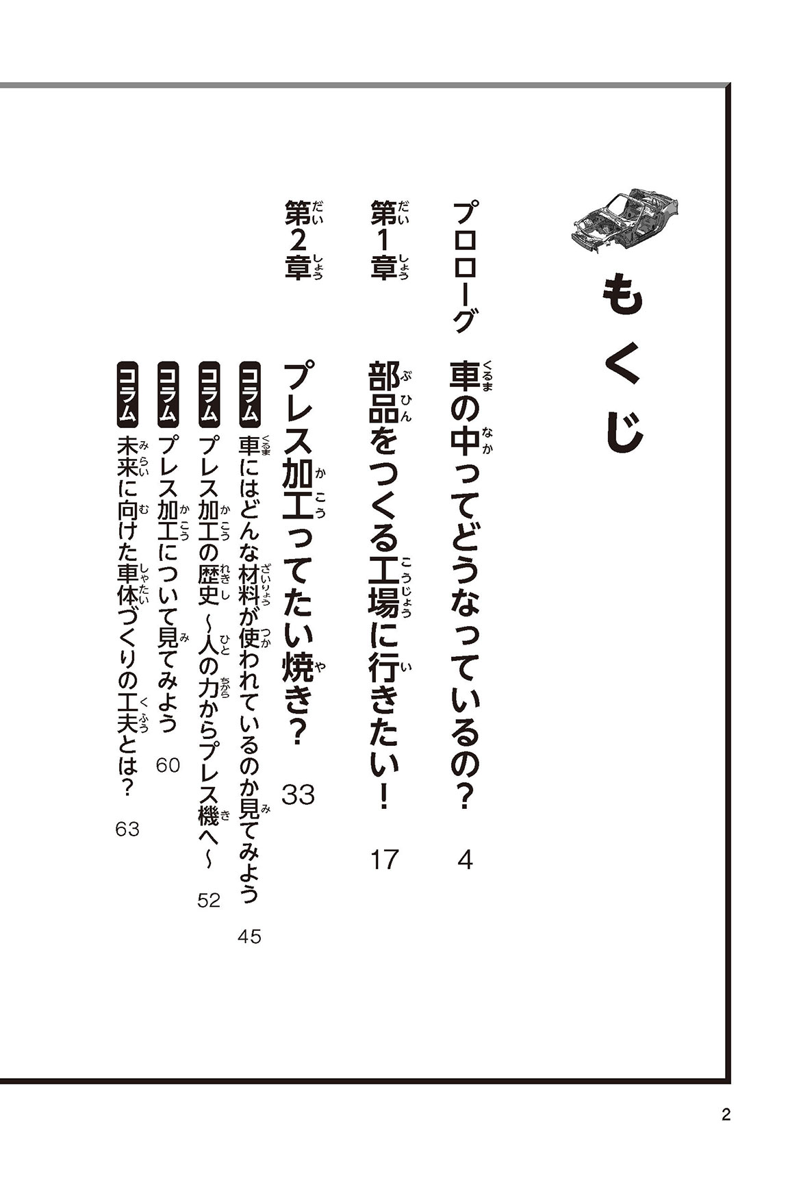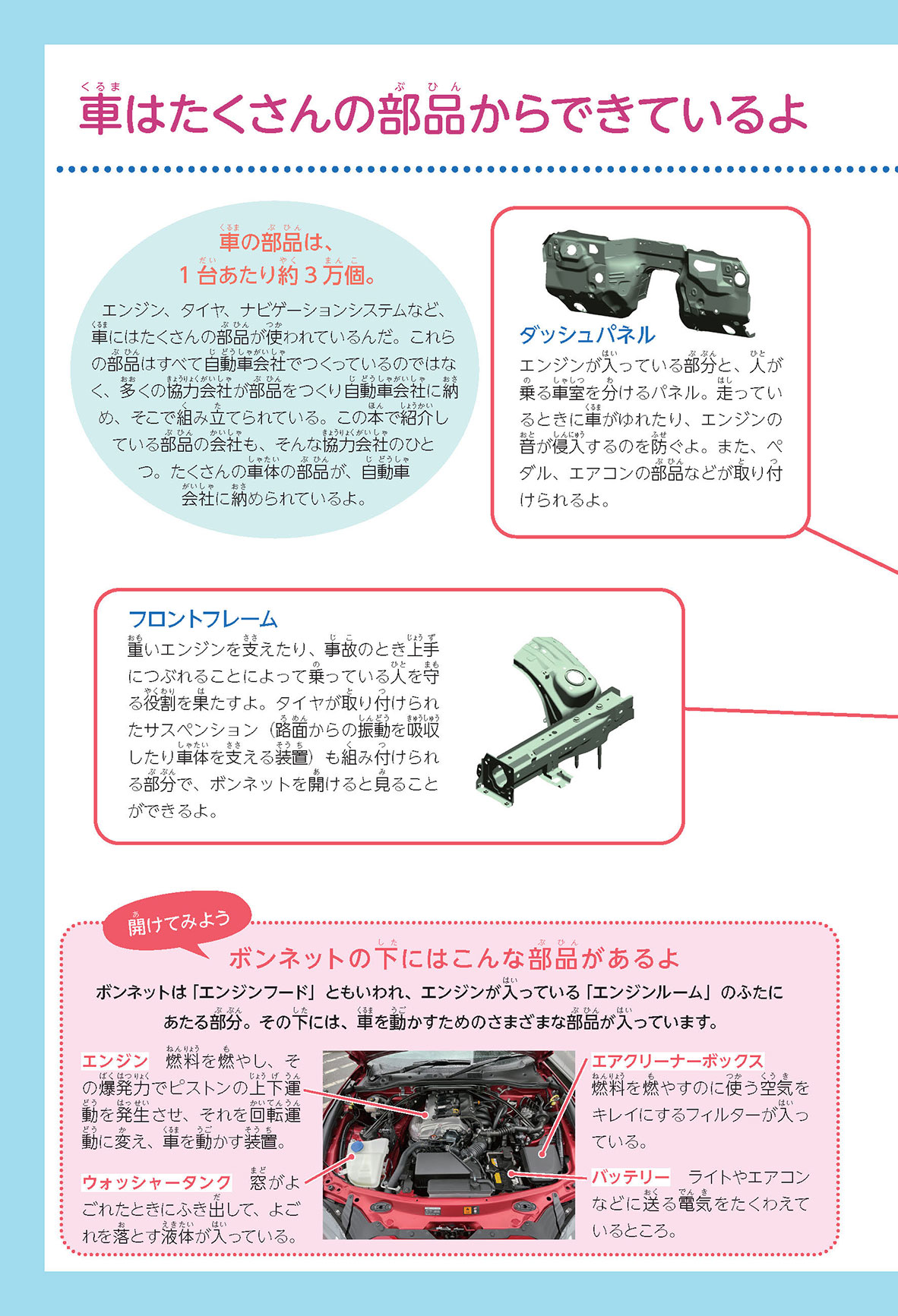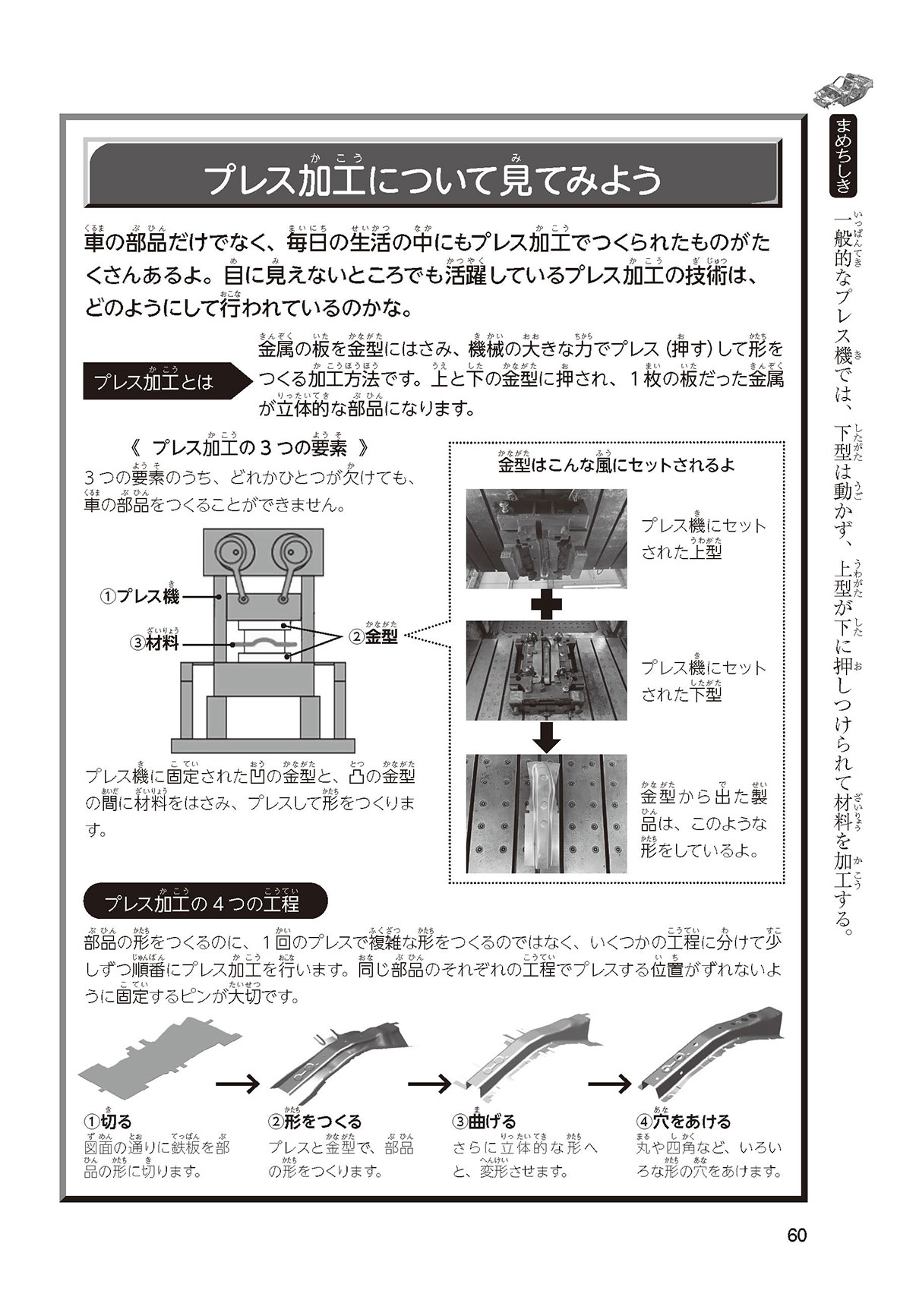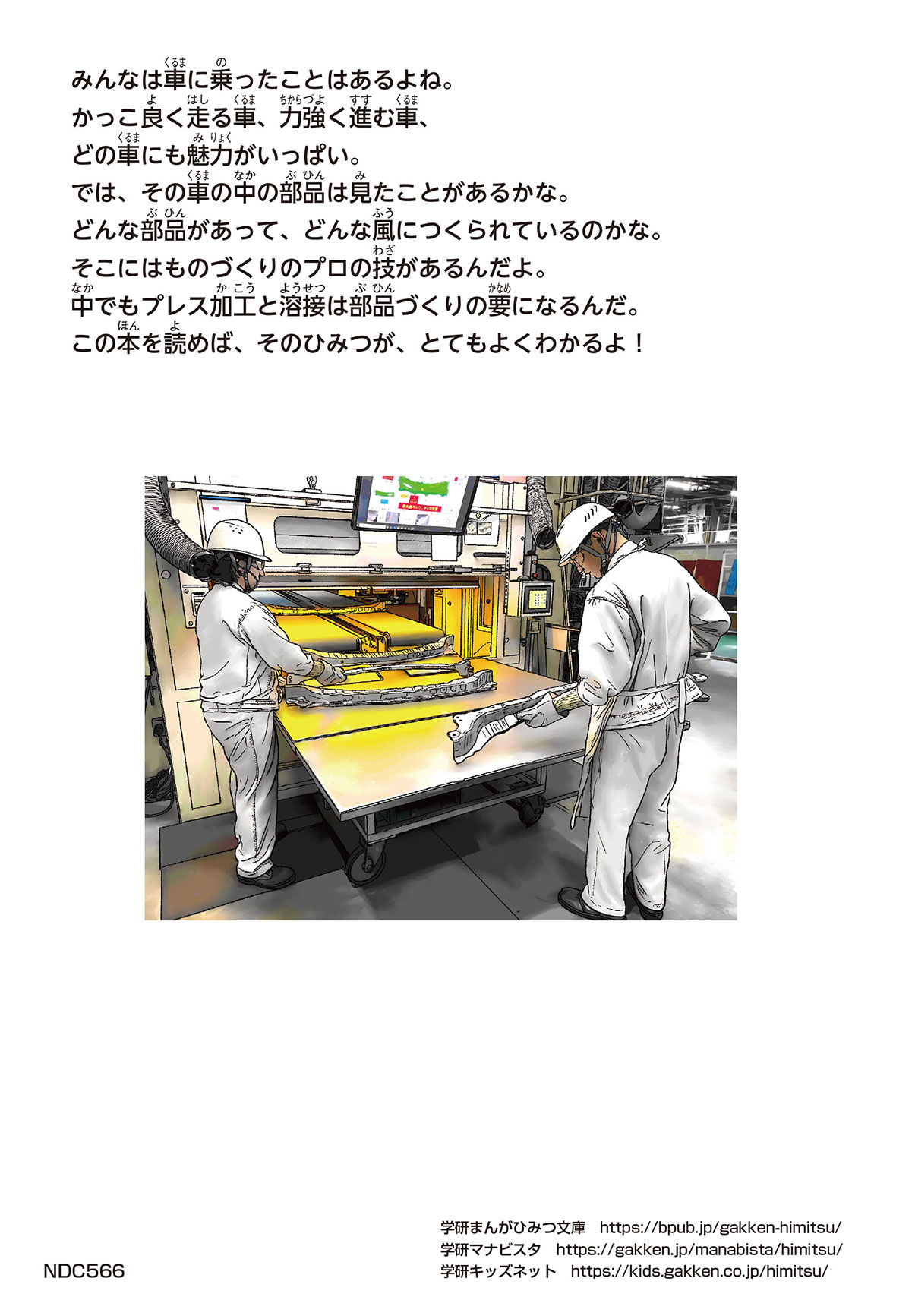 みんなは車に乗ったことはあるよね。かっこ良く走る車、力強く進む車、どの車にも魅力がいっぱい。では、その車の中の部品は見たことがあるかな。どんな部品があって、どんな風につくられているのかな。そこにはものづくりのプロの技があるんだよ。中でもプレス加工と溶接は部品づくりの要になるんだ。この本を読めば、そのひみつが、とてもよくわかるよ!