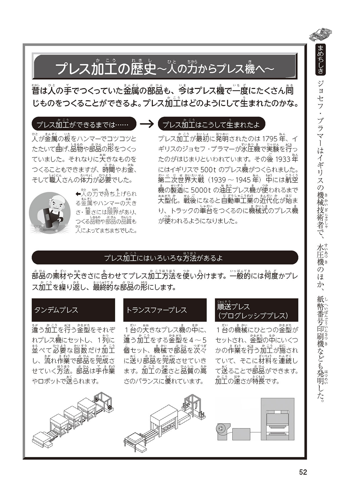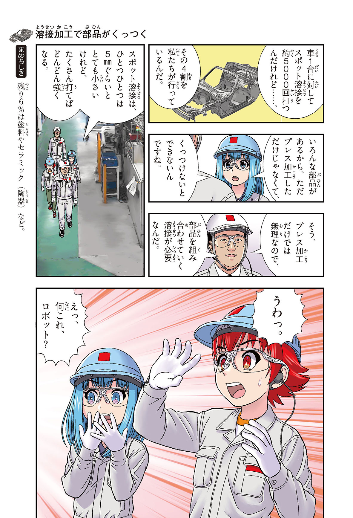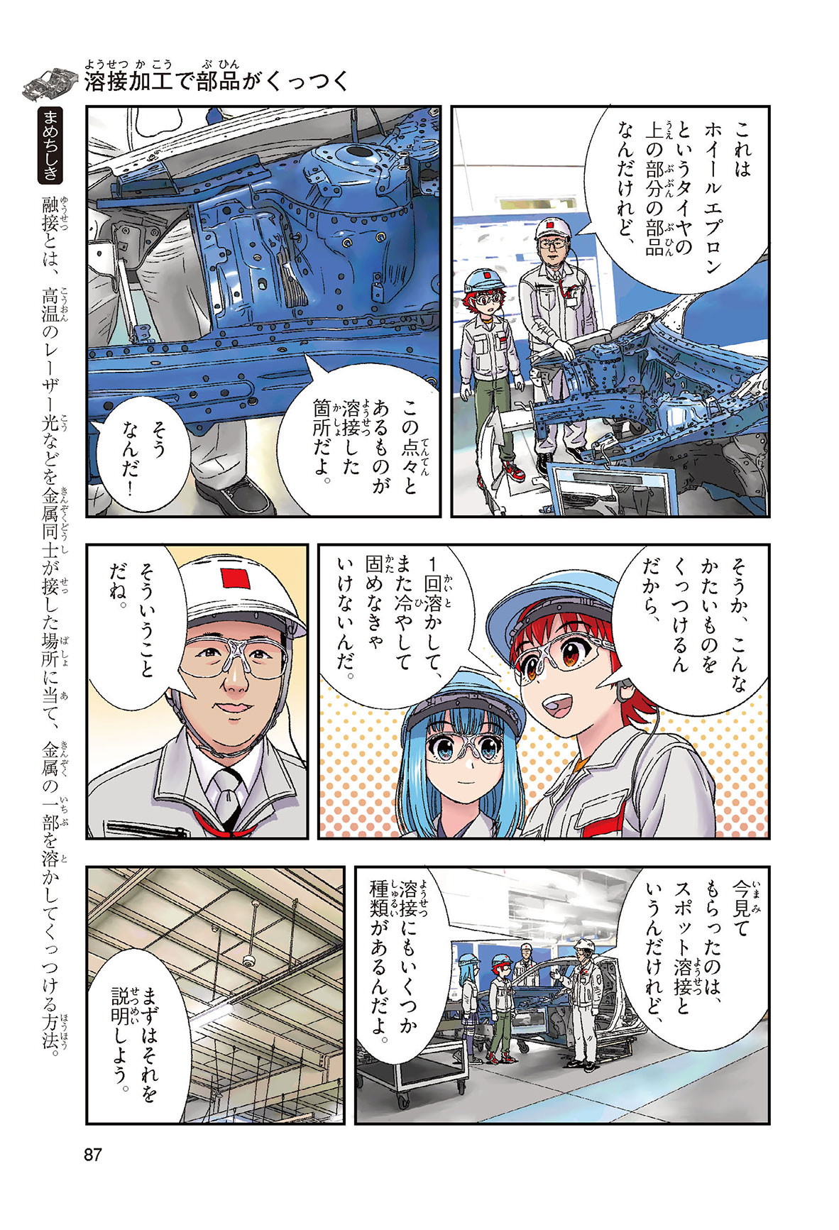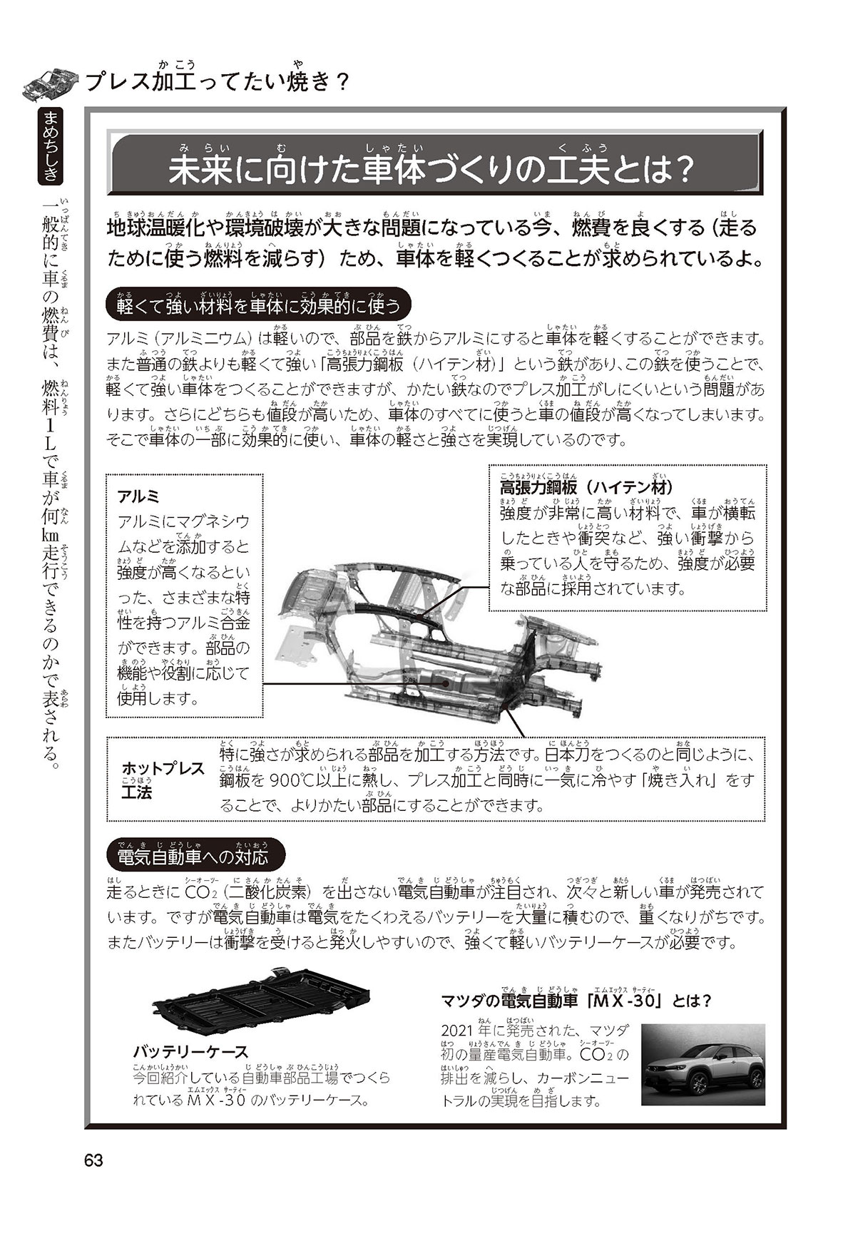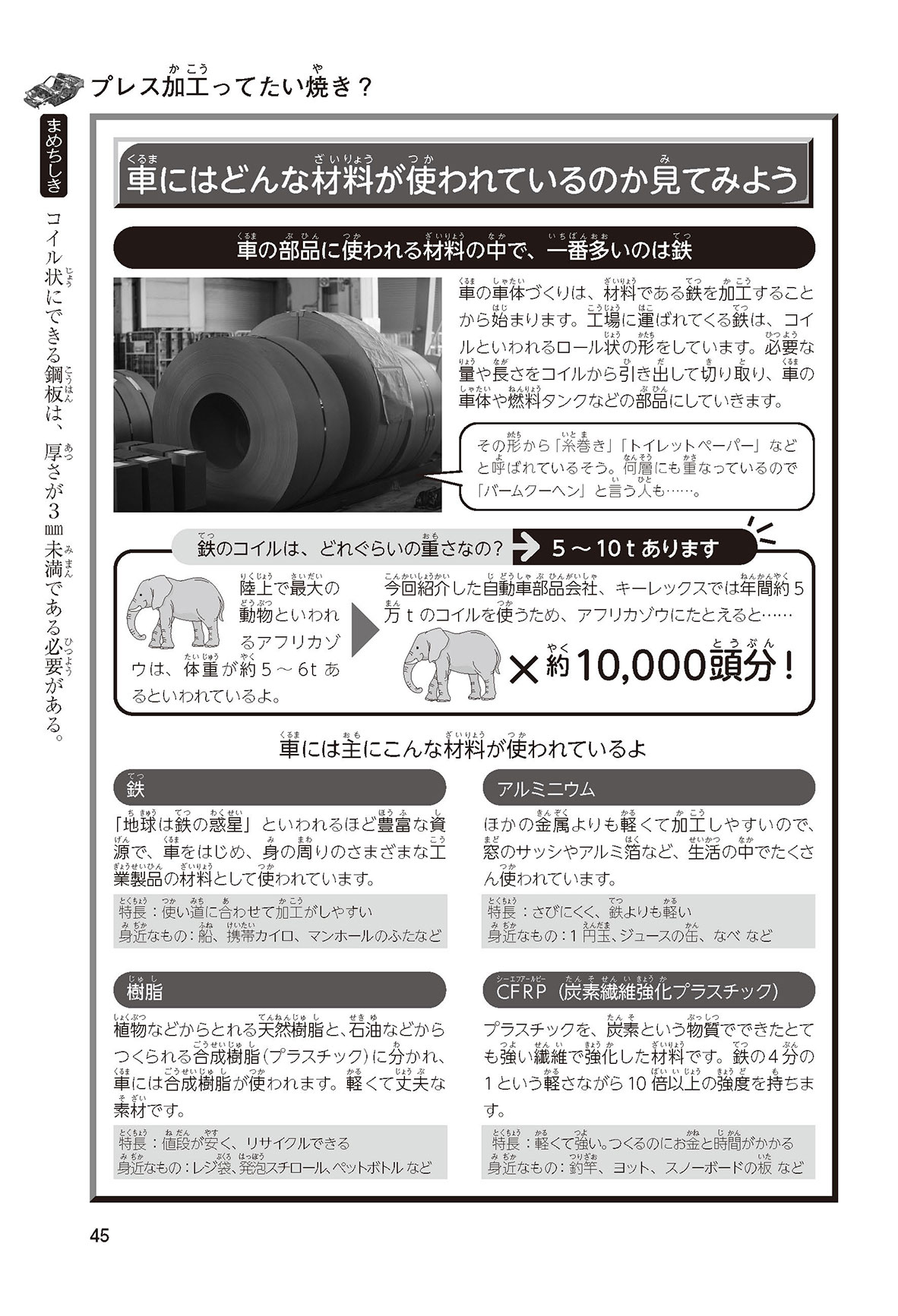 みんなは車に乗ったことはあるよね。かっこ良く走る車、力強く進む車、どの車にも魅力がいっぱい。では、その車の中の部品は見たことがあるかな。どんな部品があって、どんな風につくられているのかな。そこにはものづくりのプロの技があるんだよ。中でもプレス加工と溶接は部品づくりの要になるんだ。この本を読めば、そのひみつが、とてもよくわかるよ!