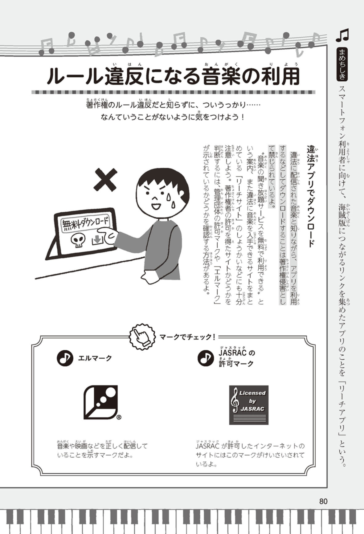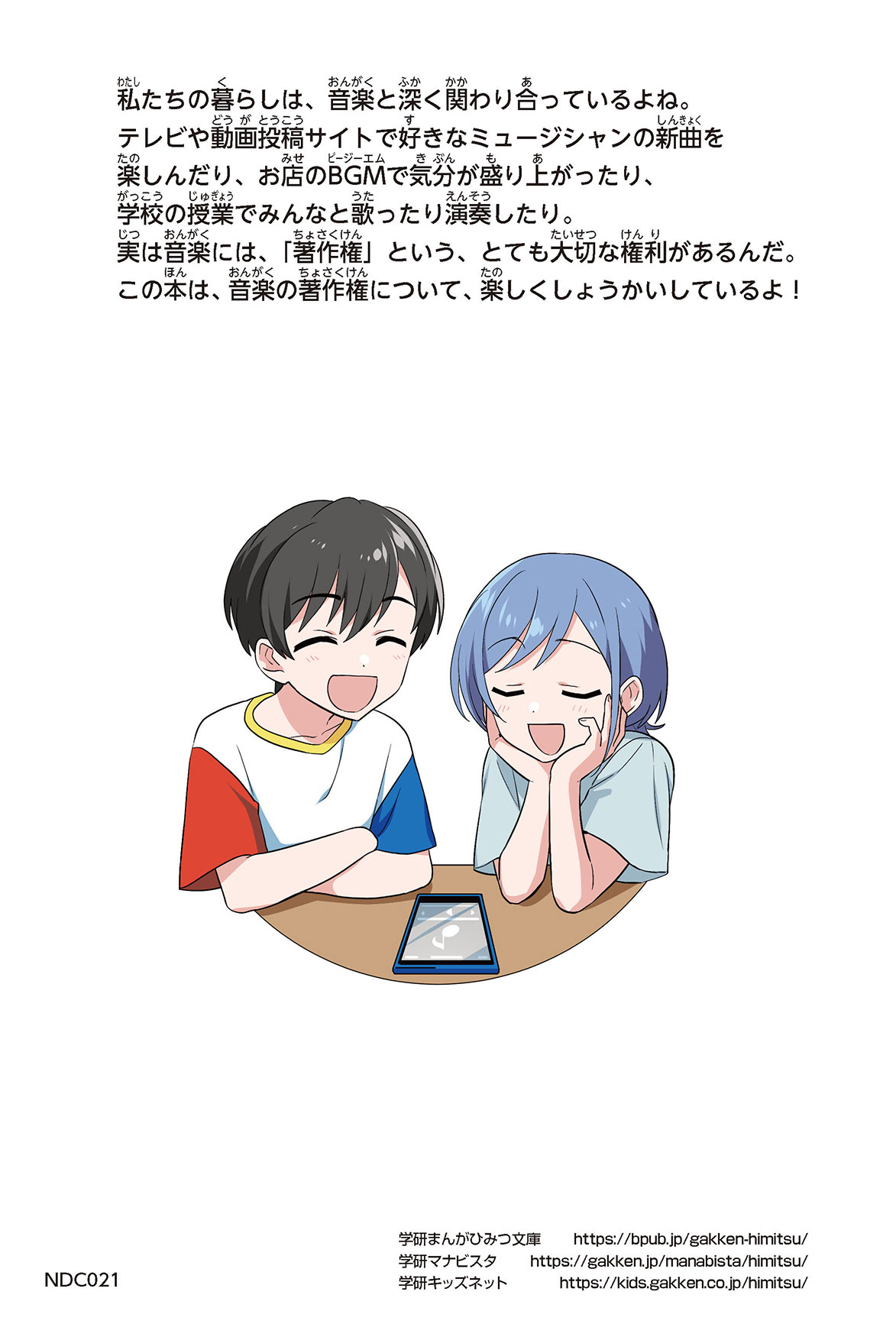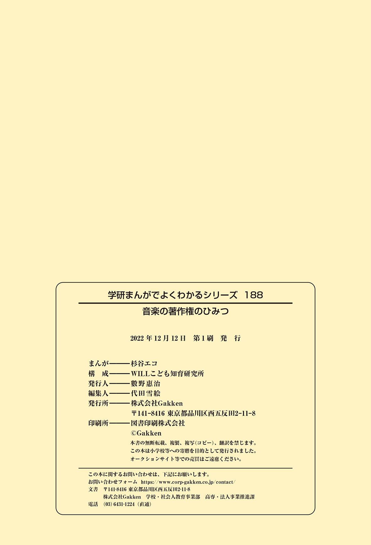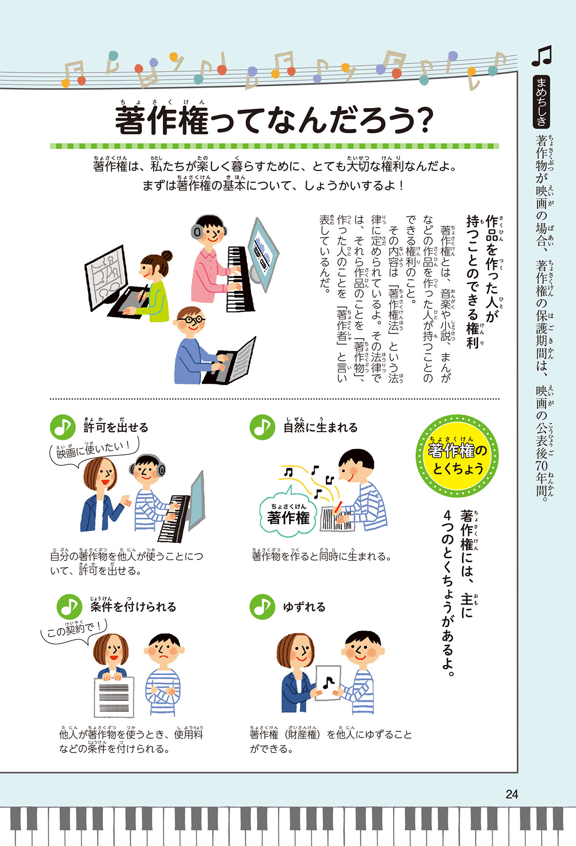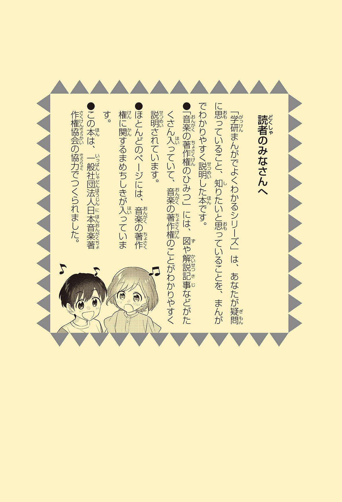 私たちの暮らしは、音楽と深く関わり合っているよね。テレビや動画投稿サイトで好きなミュージシャンの新曲を楽しんだり、お店のBGMで気分が盛り上がったり、学校の授業でみんなと歌ったり演奏したり。実は音楽には、「著作権」という、とても大切な権利があるんだ。 この本は、音楽の著作権について、楽しくしょうかいしているよ!