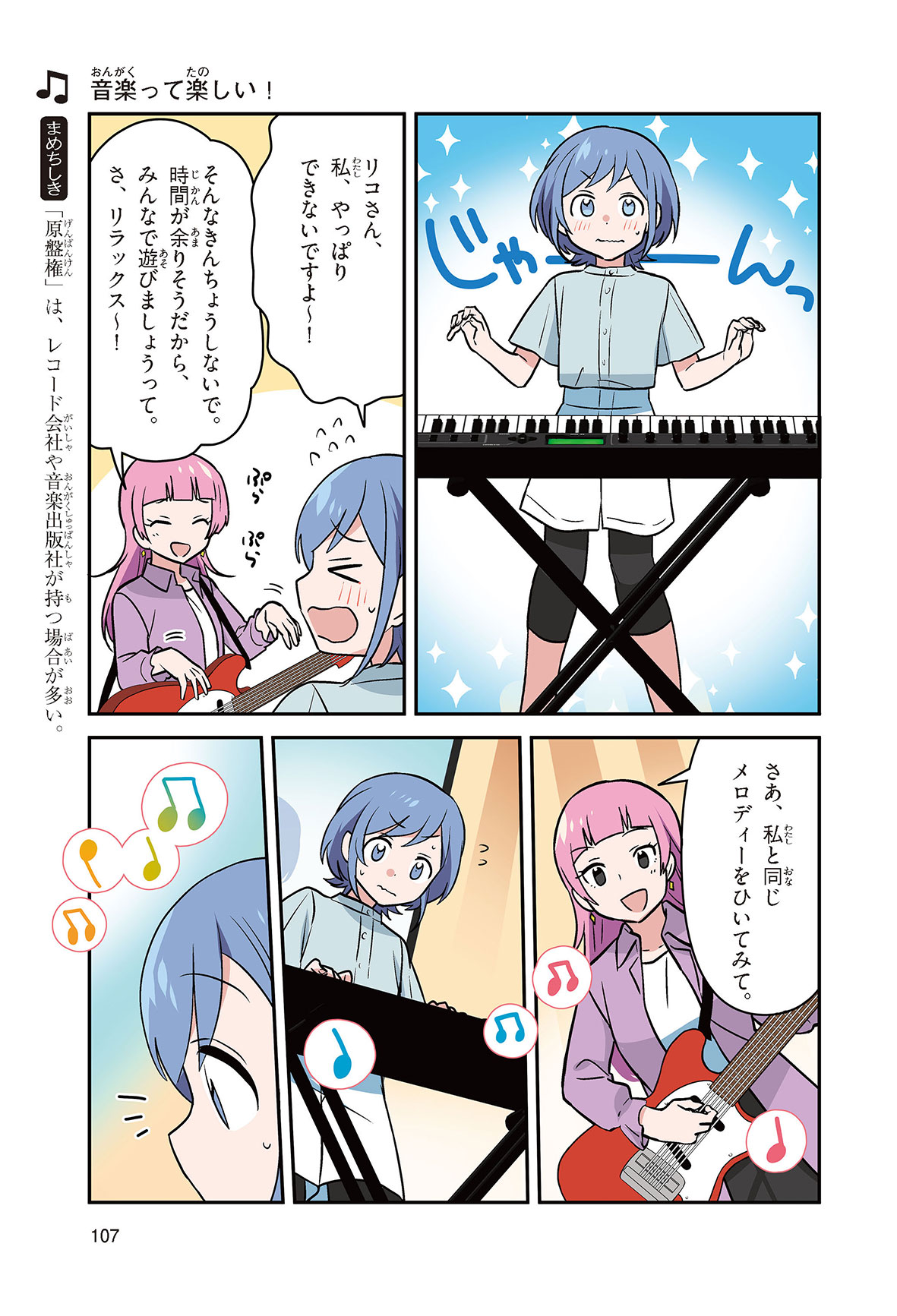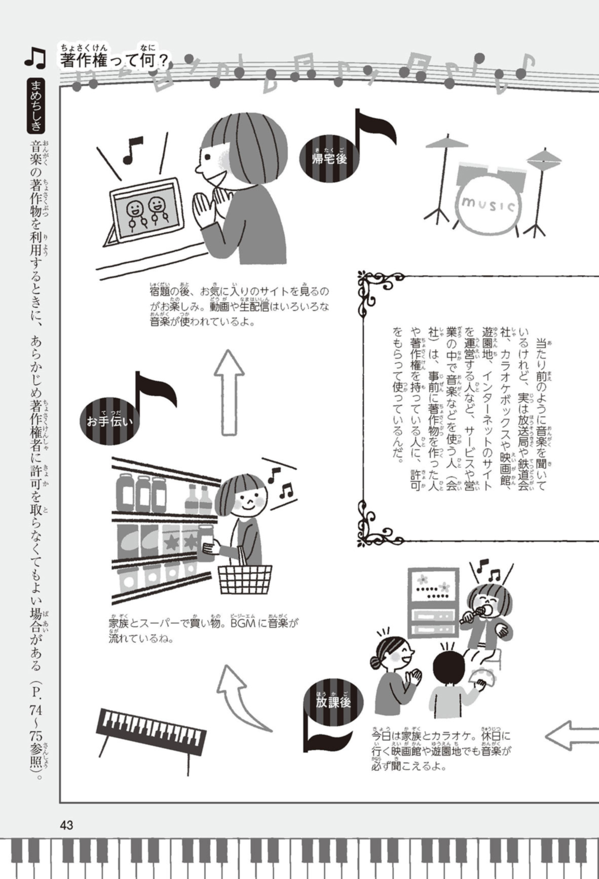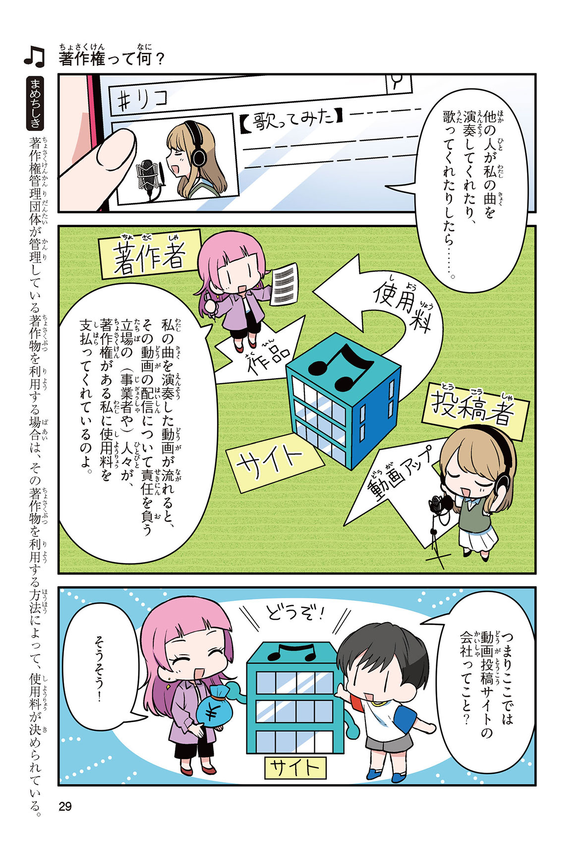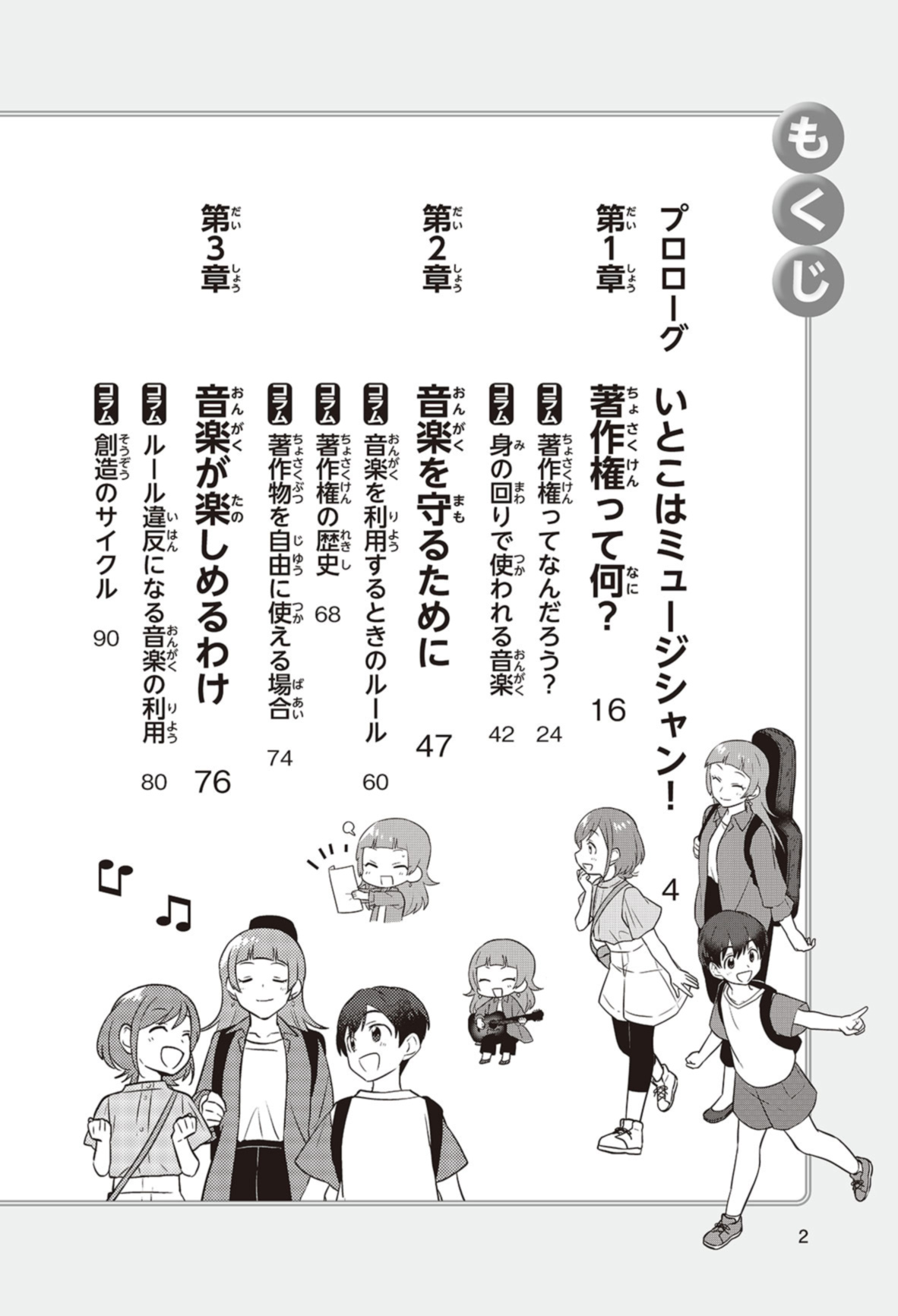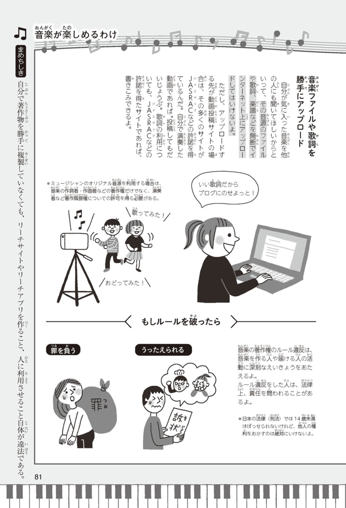 私たちの暮らしは、音楽と深く関わり合っているよね。テレビや動画投稿サイトで好きなミュージシャンの新曲を楽しんだり、お店のBGMで気分が盛り上がったり、学校の授業でみんなと歌ったり演奏したり。実は音楽には、「著作権」という、とても大切な権利があるんだ。 この本は、音楽の著作権について、楽しくしょうかいしているよ!