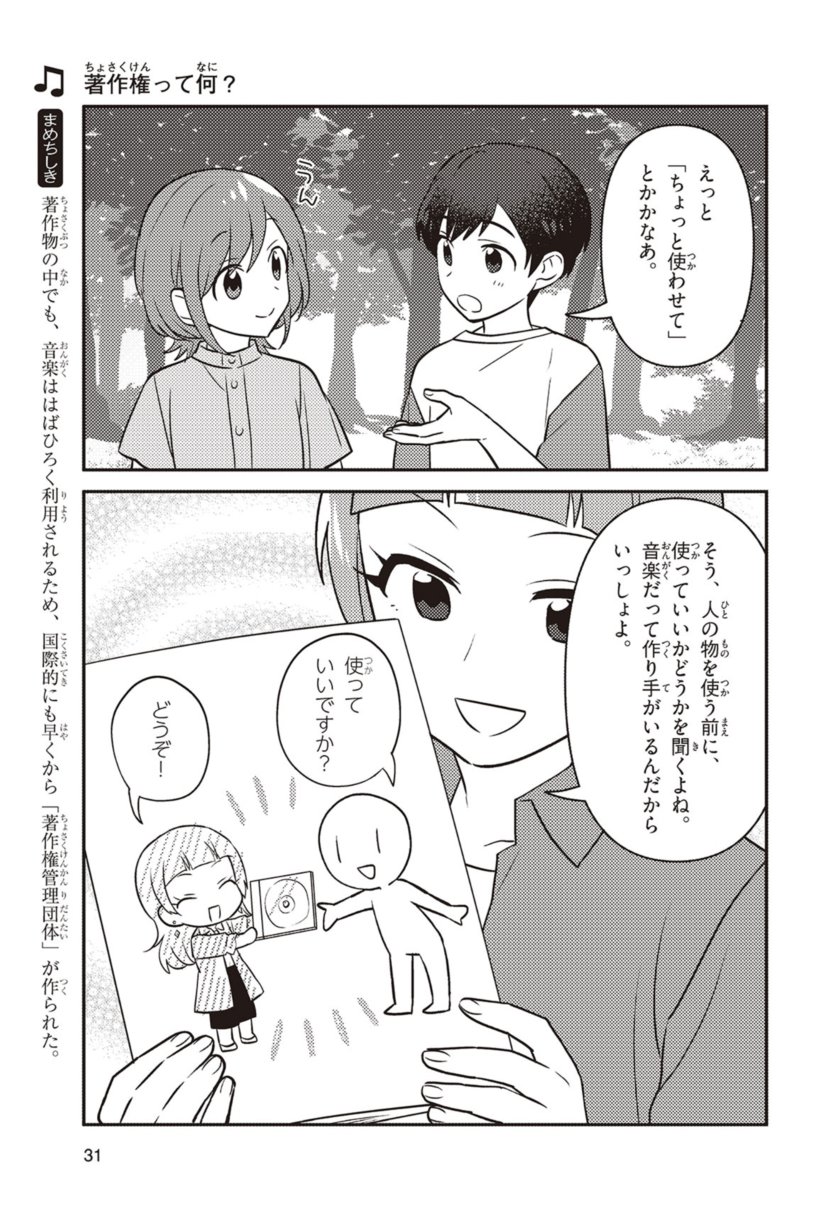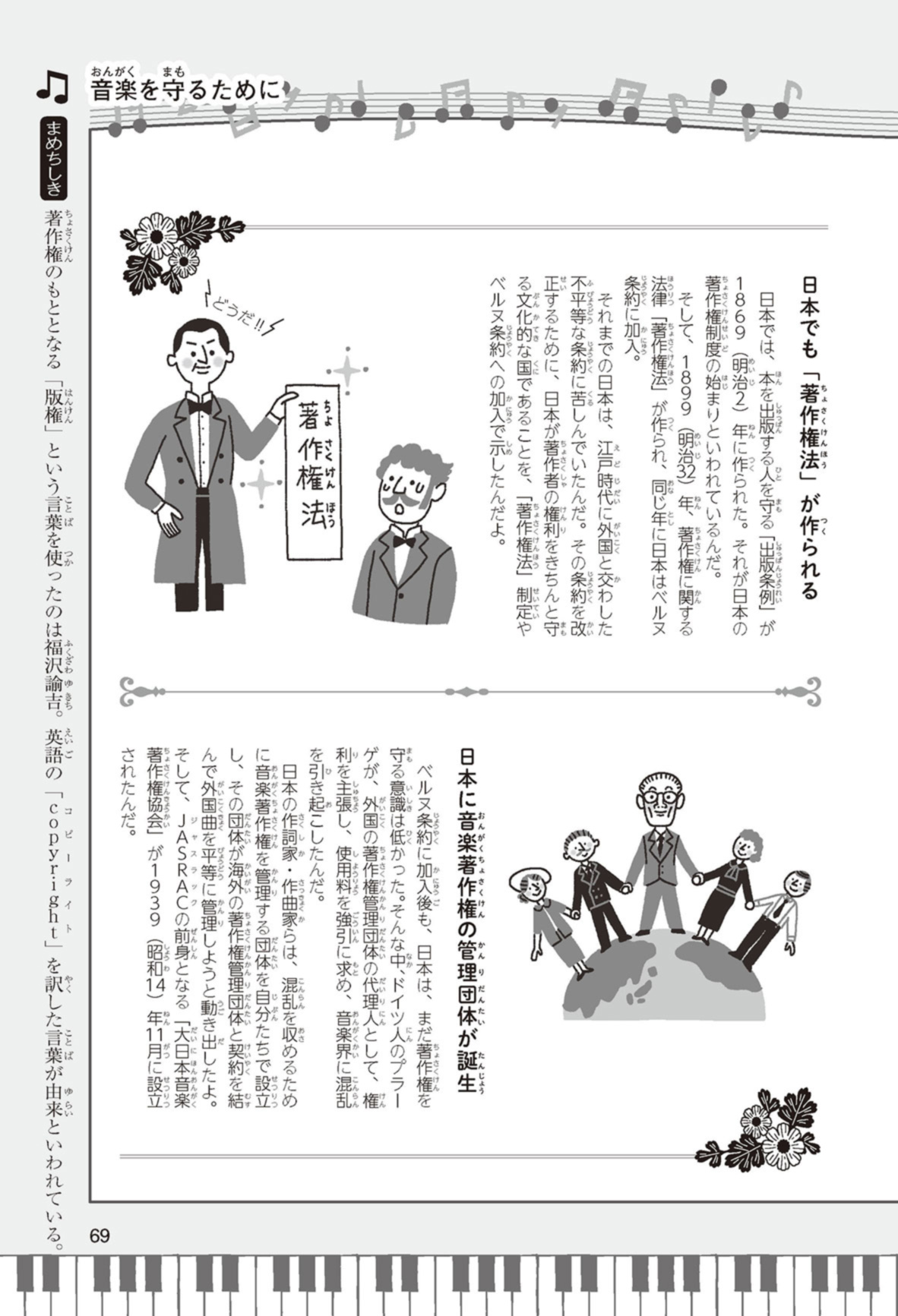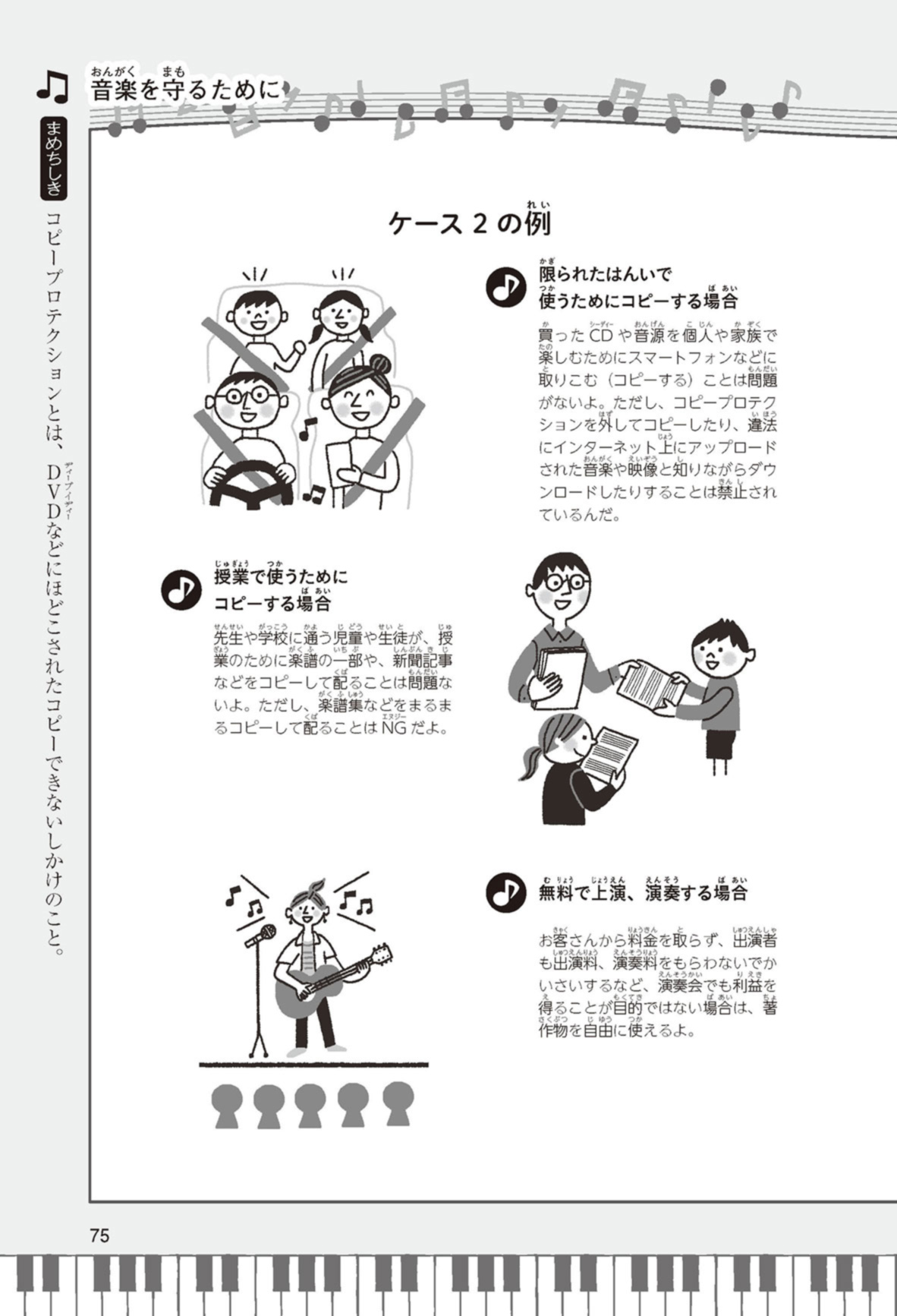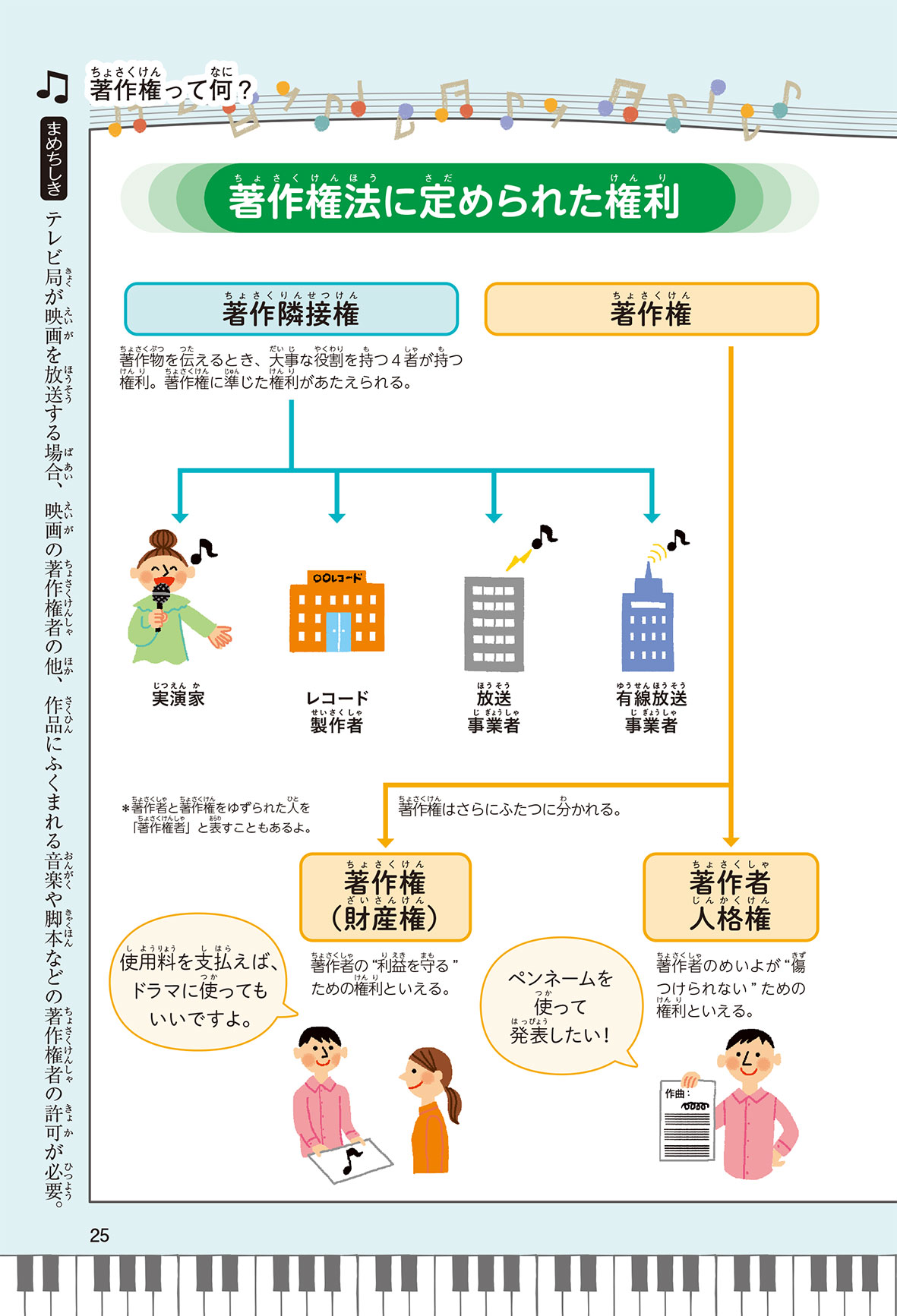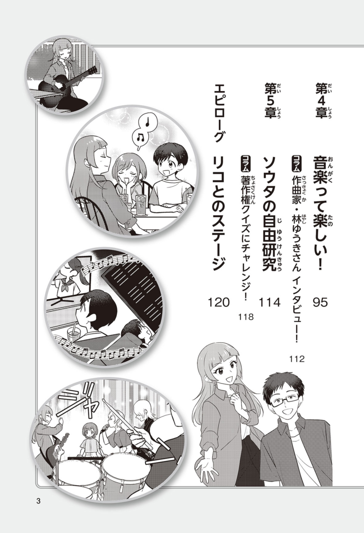 私たちの暮らしは、音楽と深く関わり合っているよね。テレビや動画投稿サイトで好きなミュージシャンの新曲を楽しんだり、お店のBGMで気分が盛り上がったり、学校の授業でみんなと歌ったり演奏したり。実は音楽には、「著作権」という、とても大切な権利があるんだ。 この本は、音楽の著作権について、楽しくしょうかいしているよ!