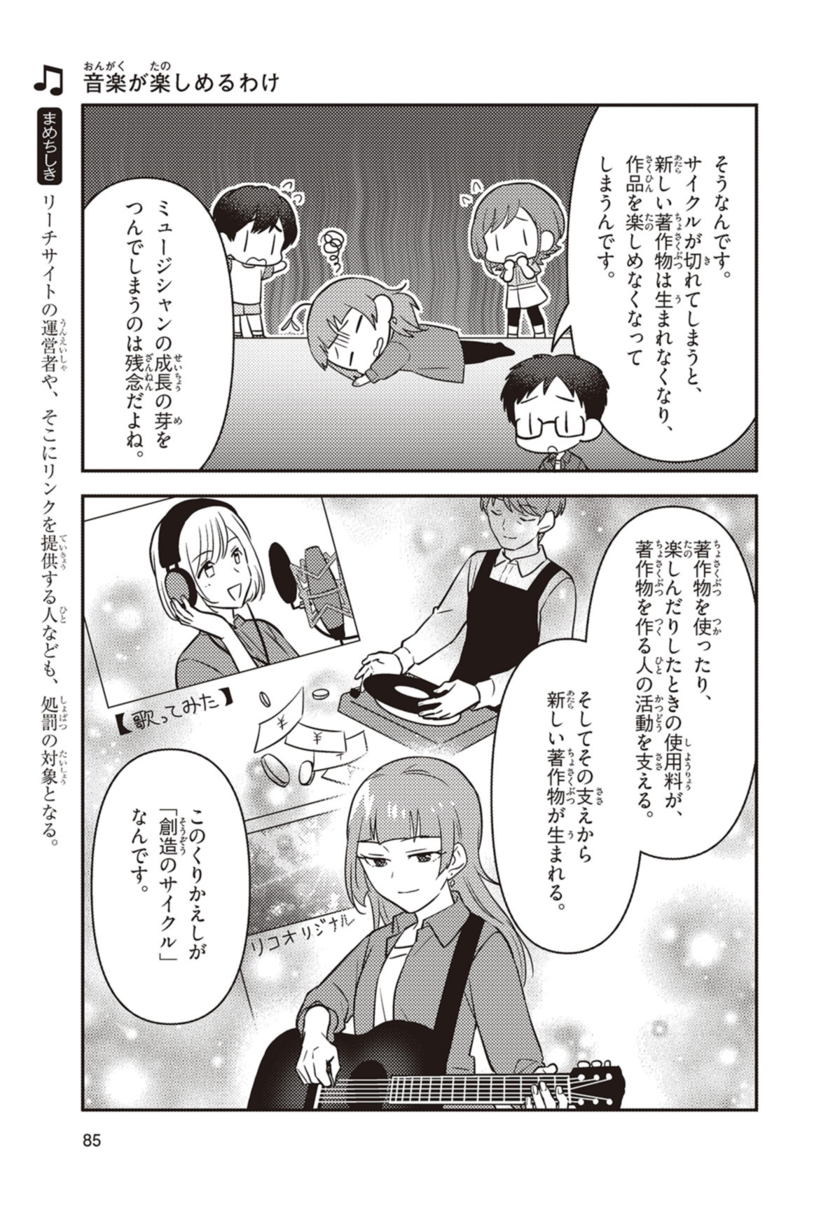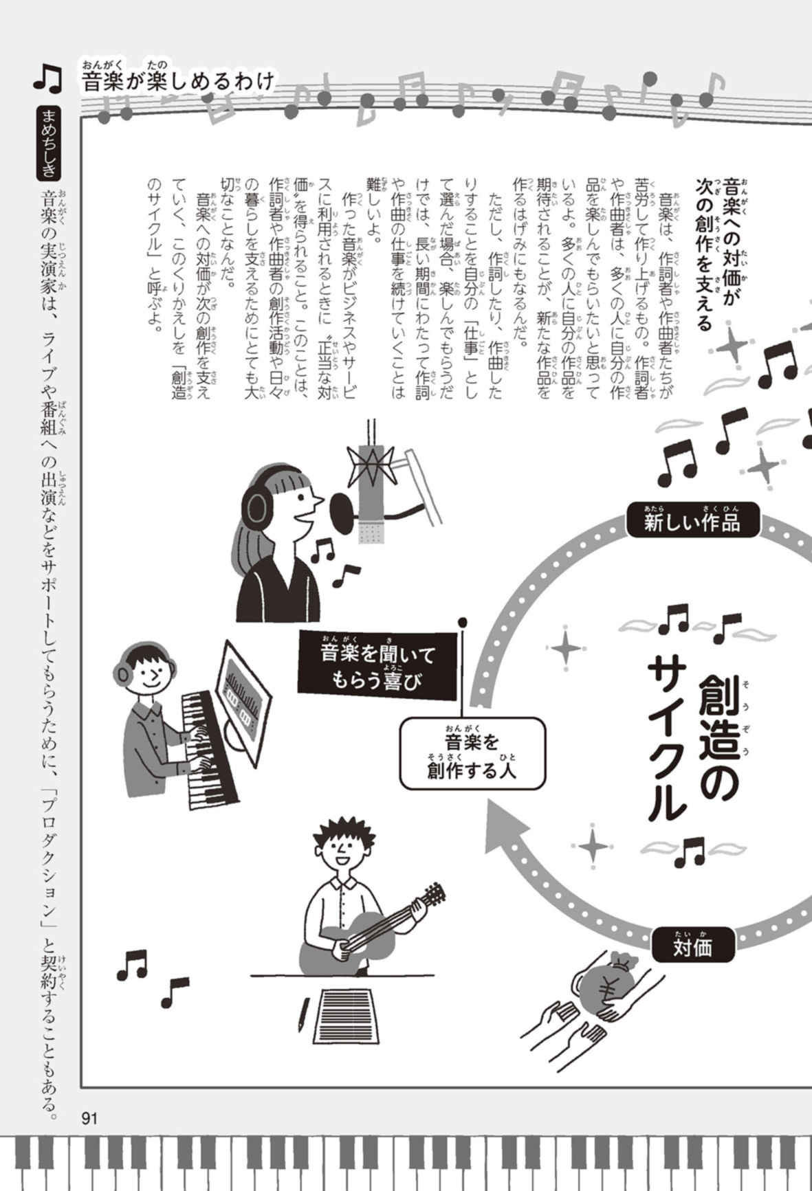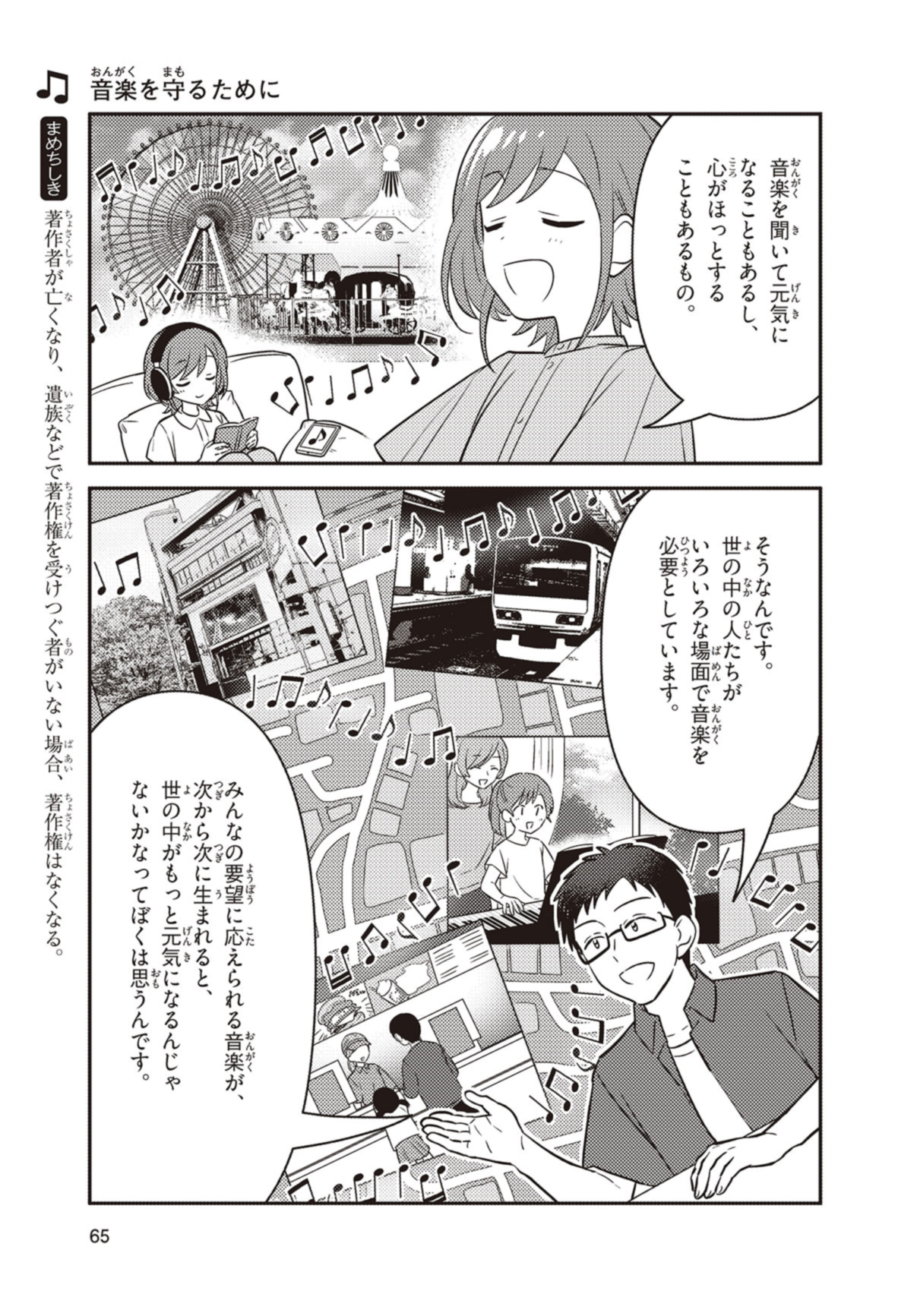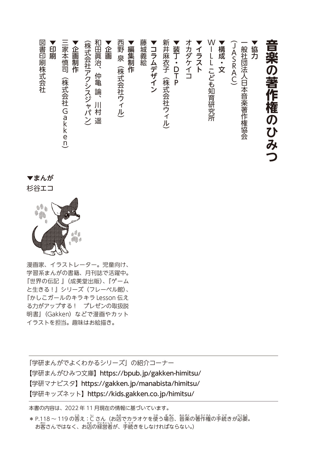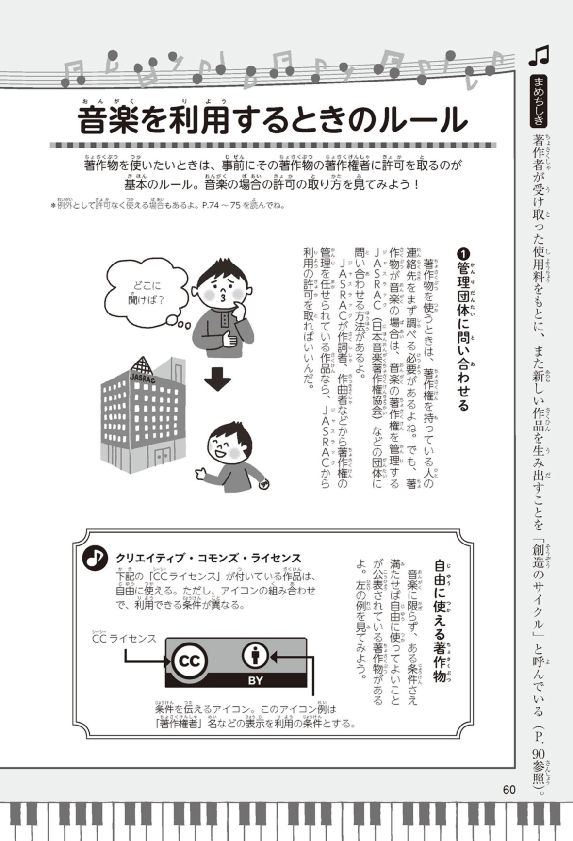 私たちの暮らしは、音楽と深く関わり合っているよね。テレビや動画投稿サイトで好きなミュージシャンの新曲を楽しんだり、お店のBGMで気分が盛り上がったり、学校の授業でみんなと歌ったり演奏したり。実は音楽には、「著作権」という、とても大切な権利があるんだ。 この本は、音楽の著作権について、楽しくしょうかいしているよ!