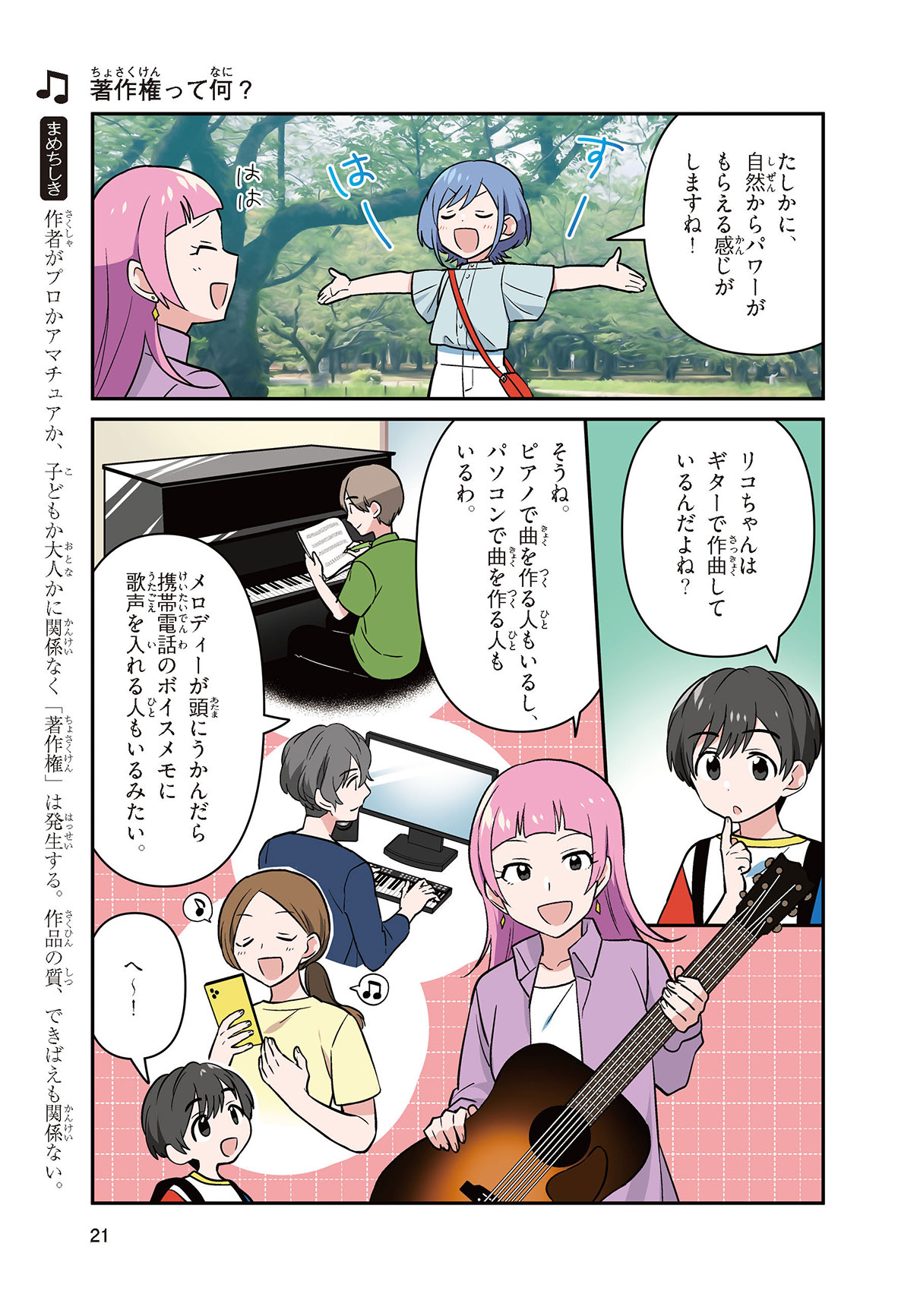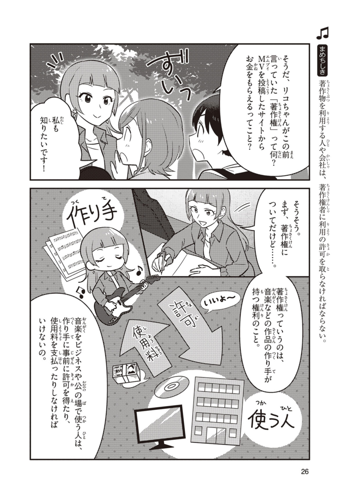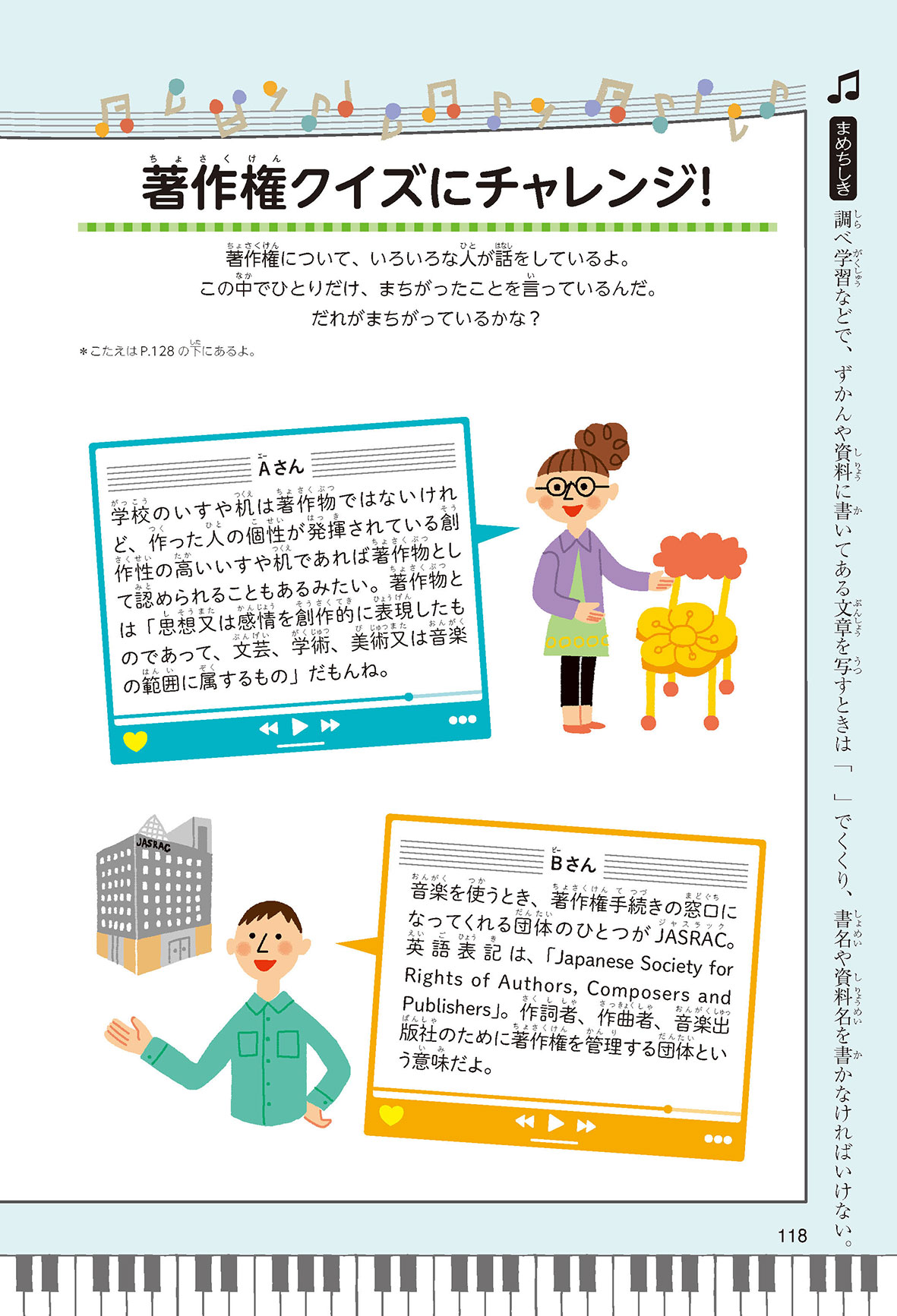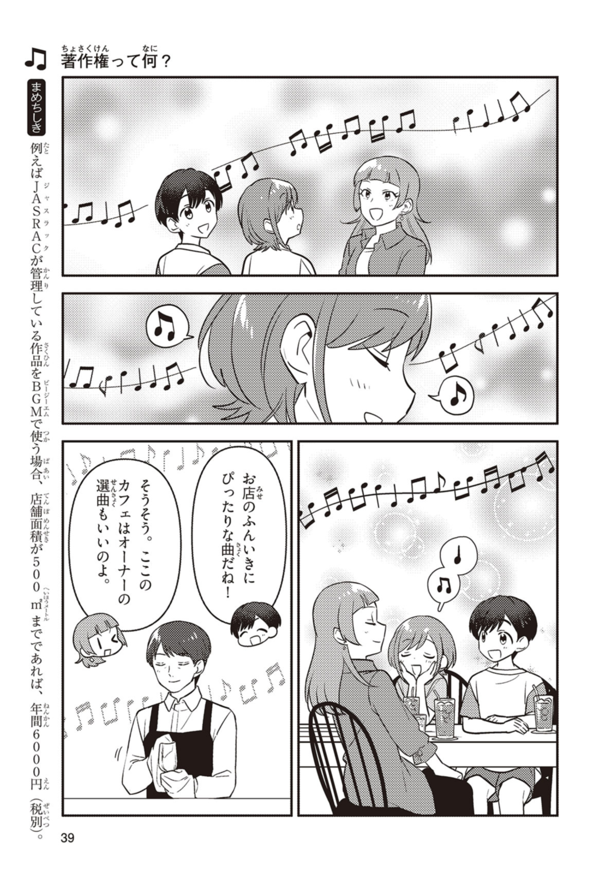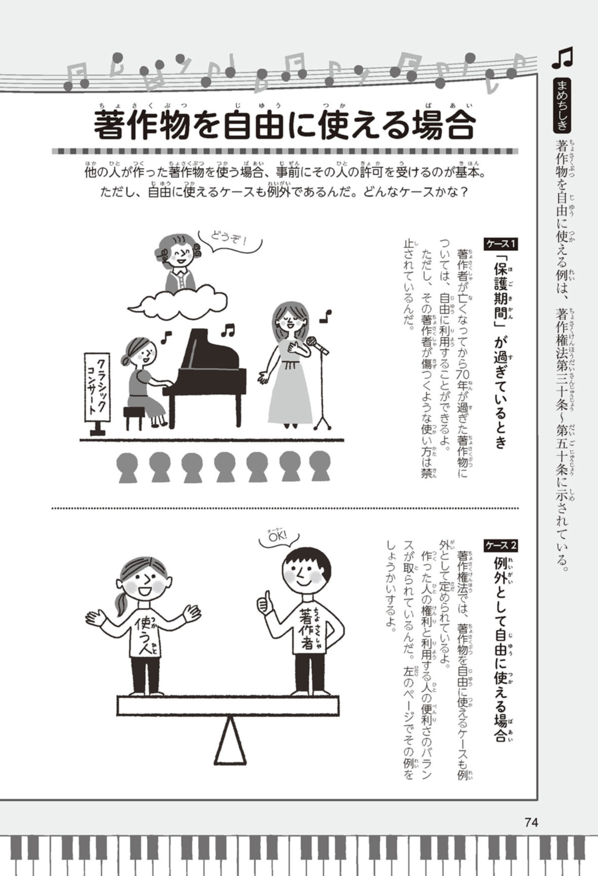 私たちの暮らしは、音楽と深く関わり合っているよね。テレビや動画投稿サイトで好きなミュージシャンの新曲を楽しんだり、お店のBGMで気分が盛り上がったり、学校の授業でみんなと歌ったり演奏したり。実は音楽には、「著作権」という、とても大切な権利があるんだ。 この本は、音楽の著作権について、楽しくしょうかいしているよ!