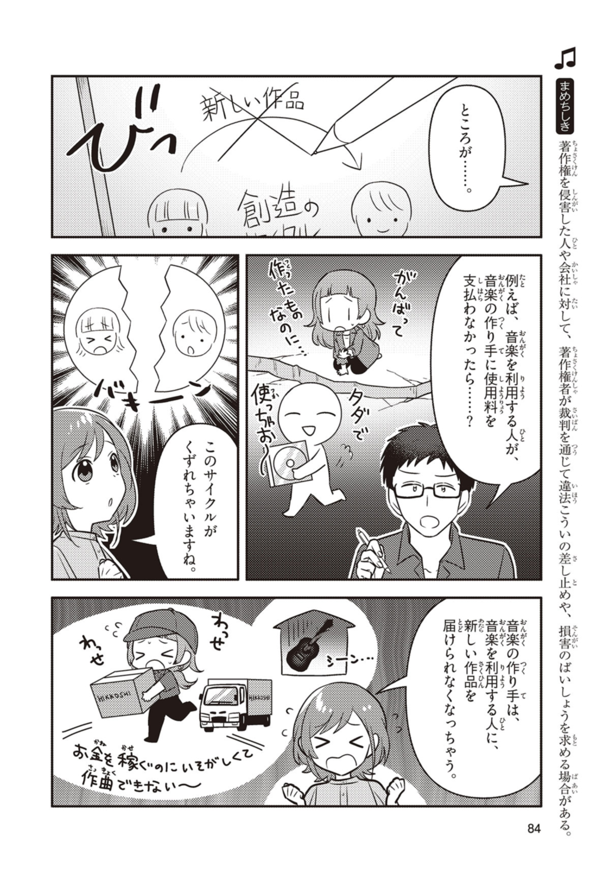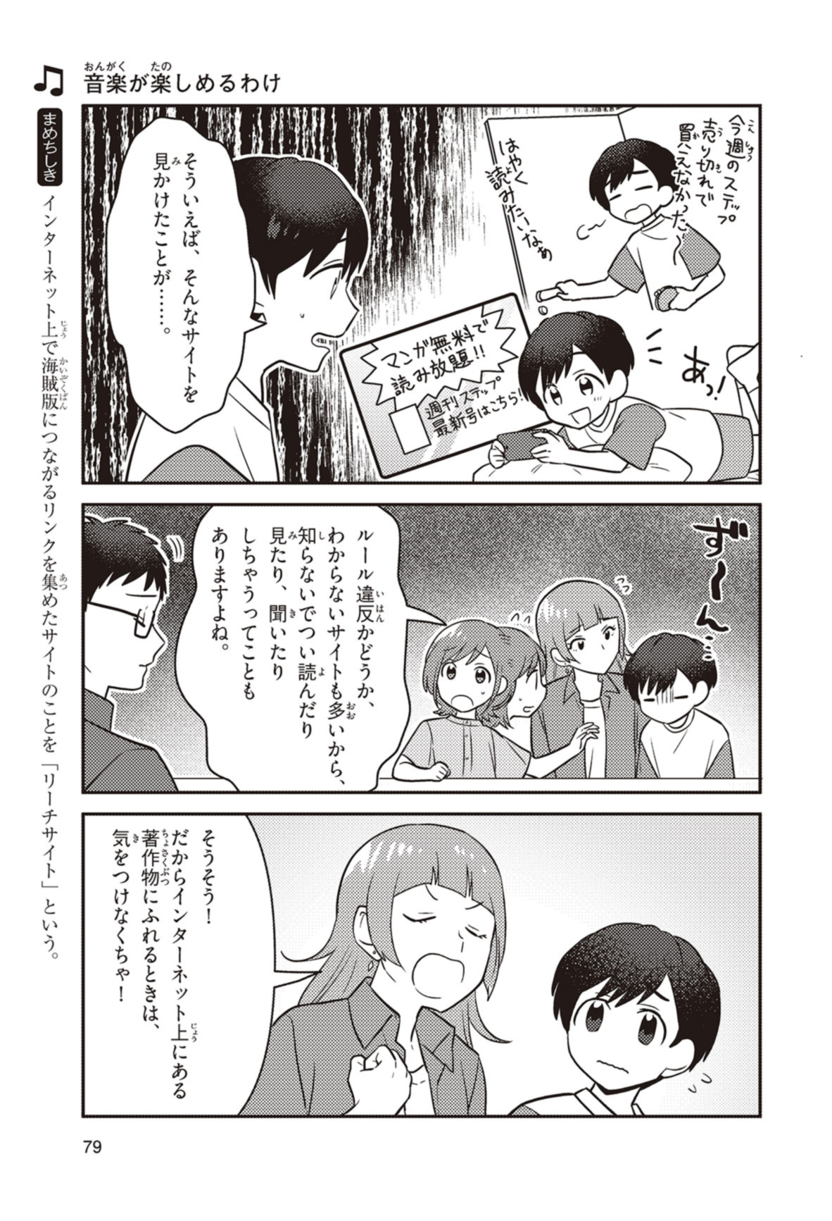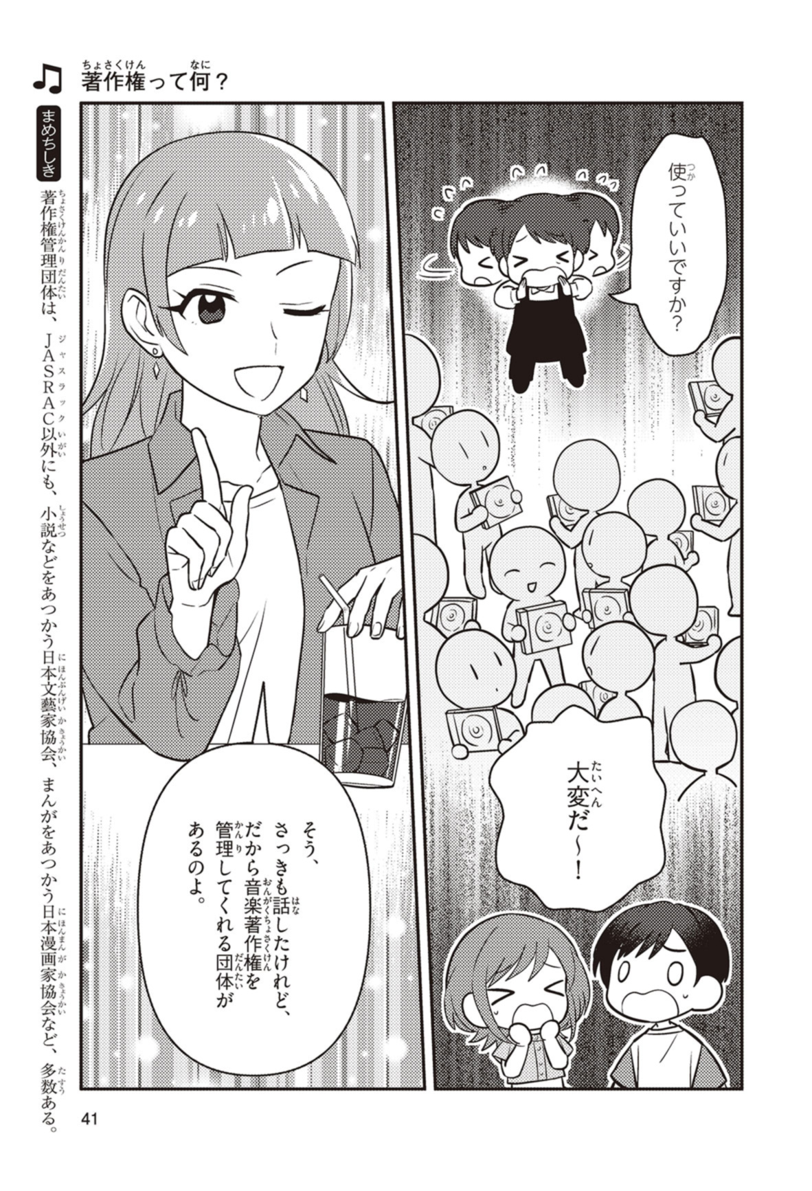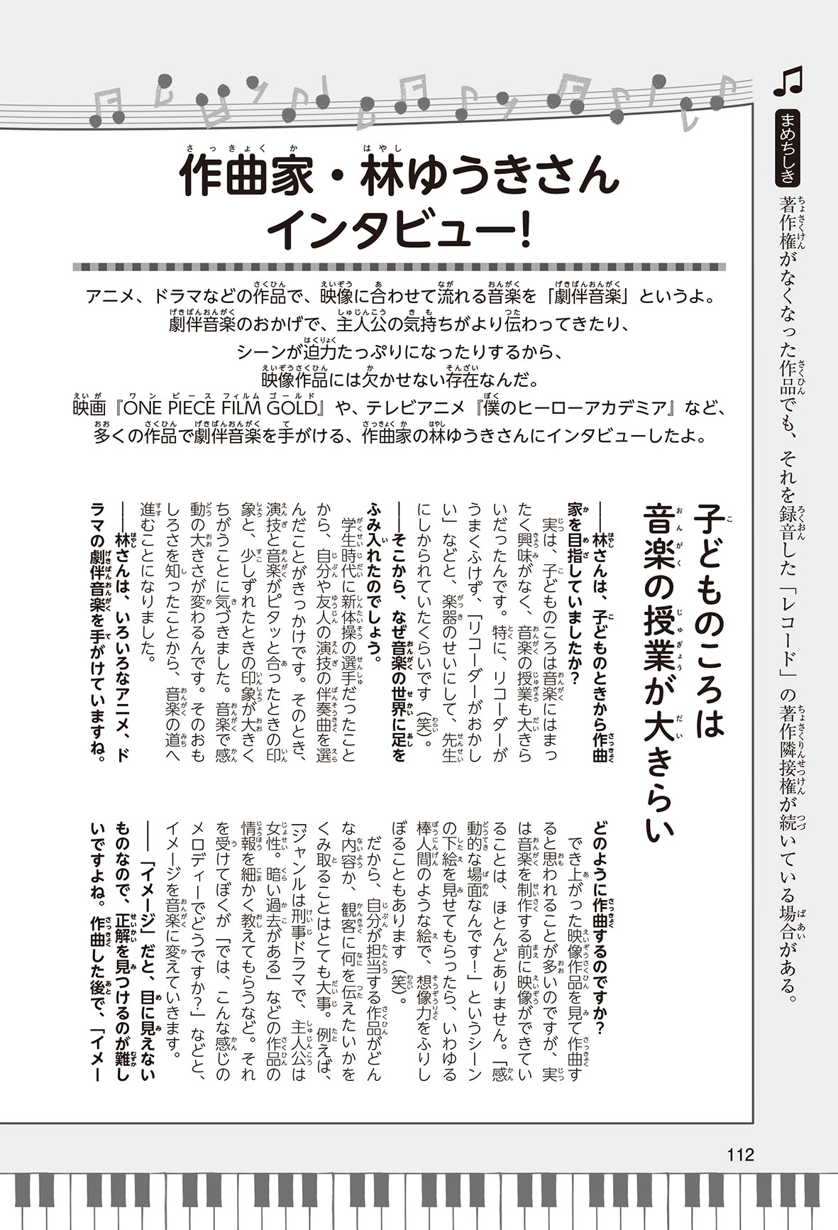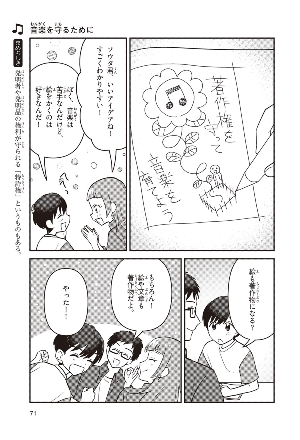 私たちの暮らしは、音楽と深く関わり合っているよね。テレビや動画投稿サイトで好きなミュージシャンの新曲を楽しんだり、お店のBGMで気分が盛り上がったり、学校の授業でみんなと歌ったり演奏したり。実は音楽には、「著作権」という、とても大切な権利があるんだ。 この本は、音楽の著作権について、楽しくしょうかいしているよ!