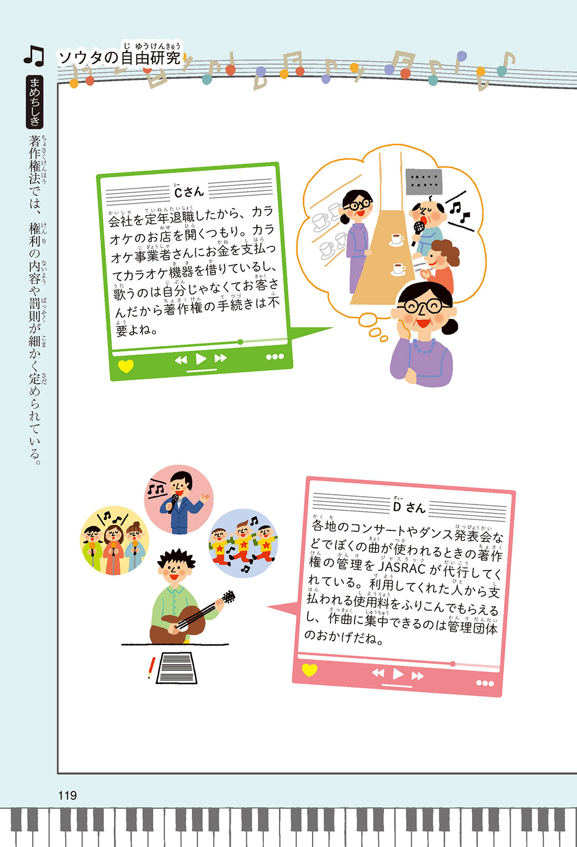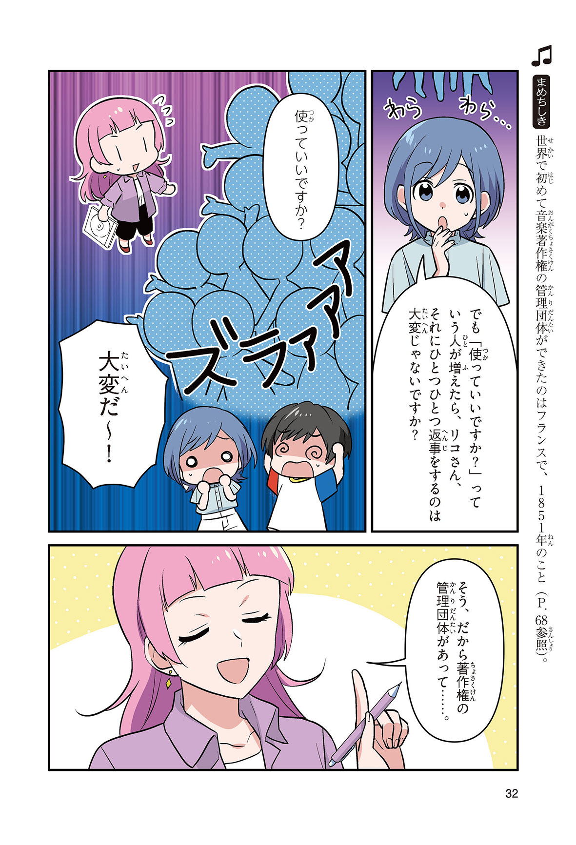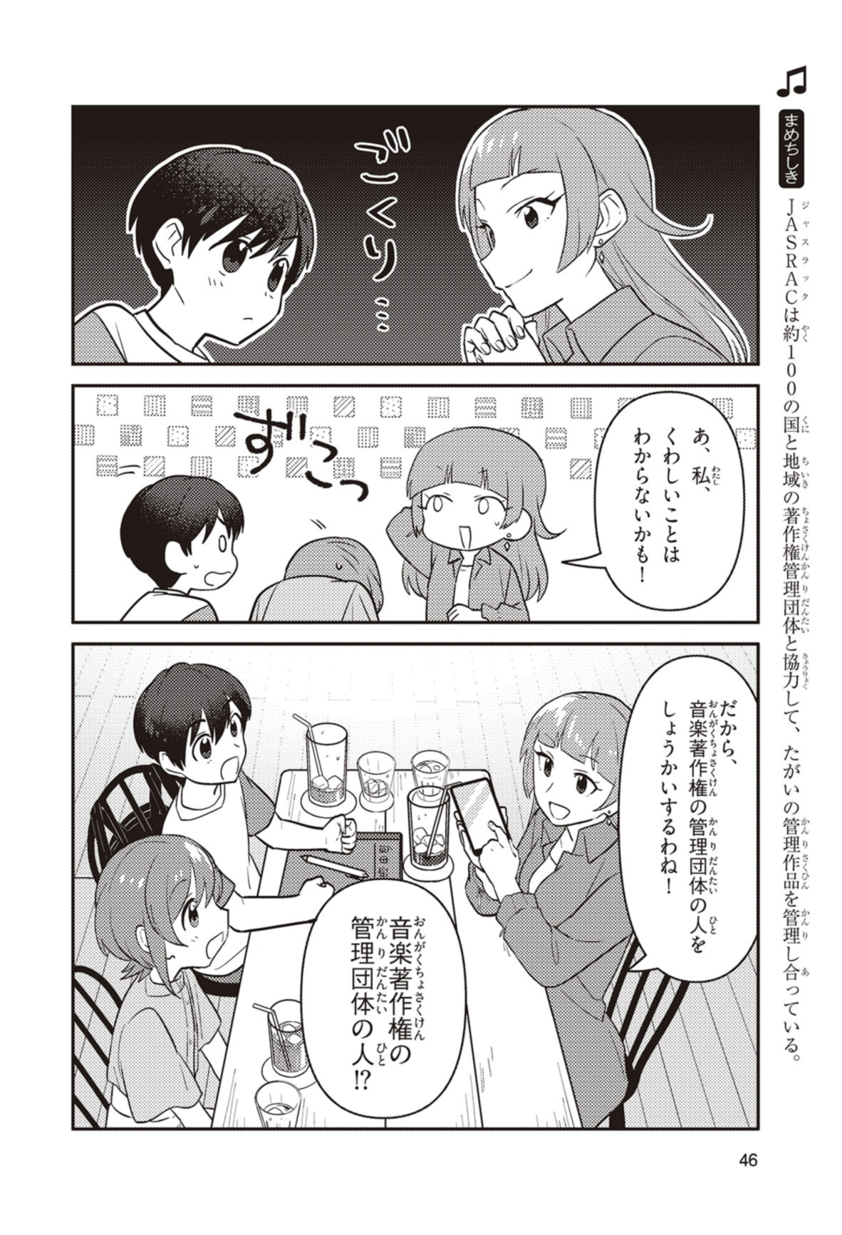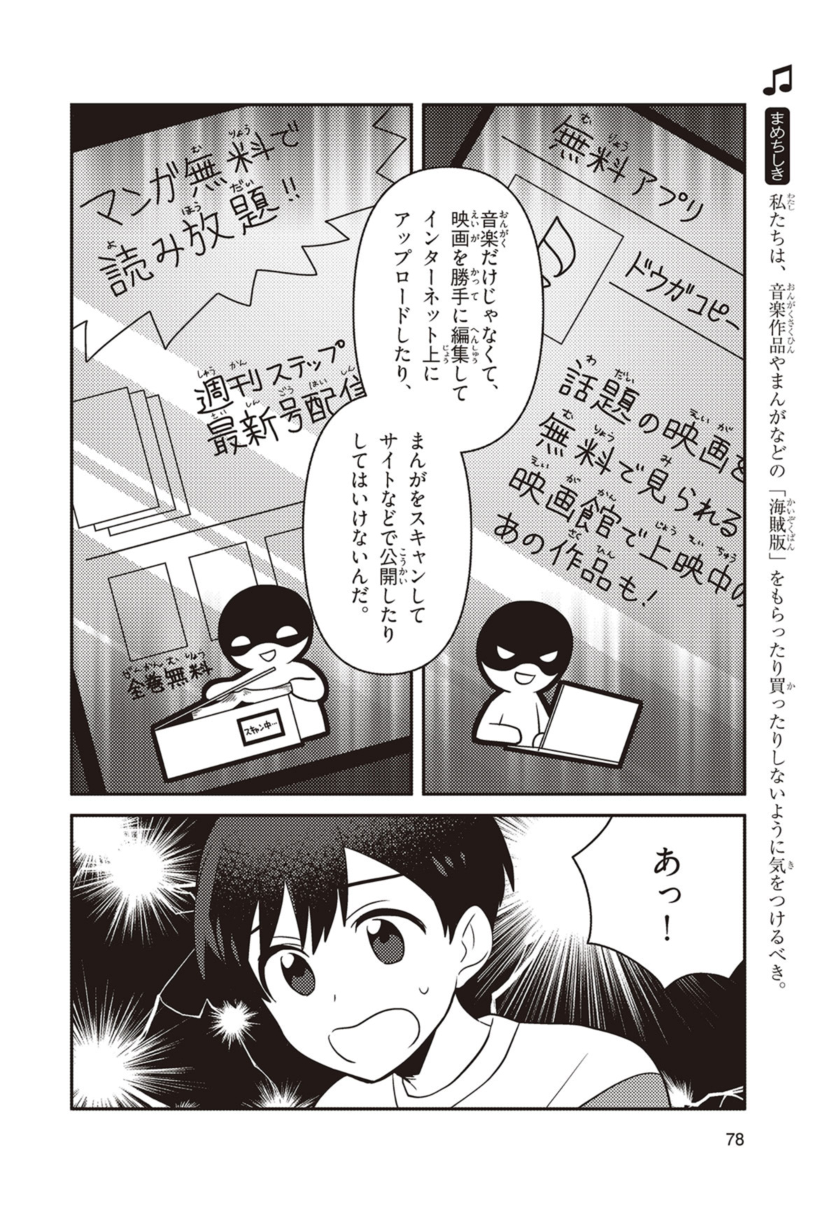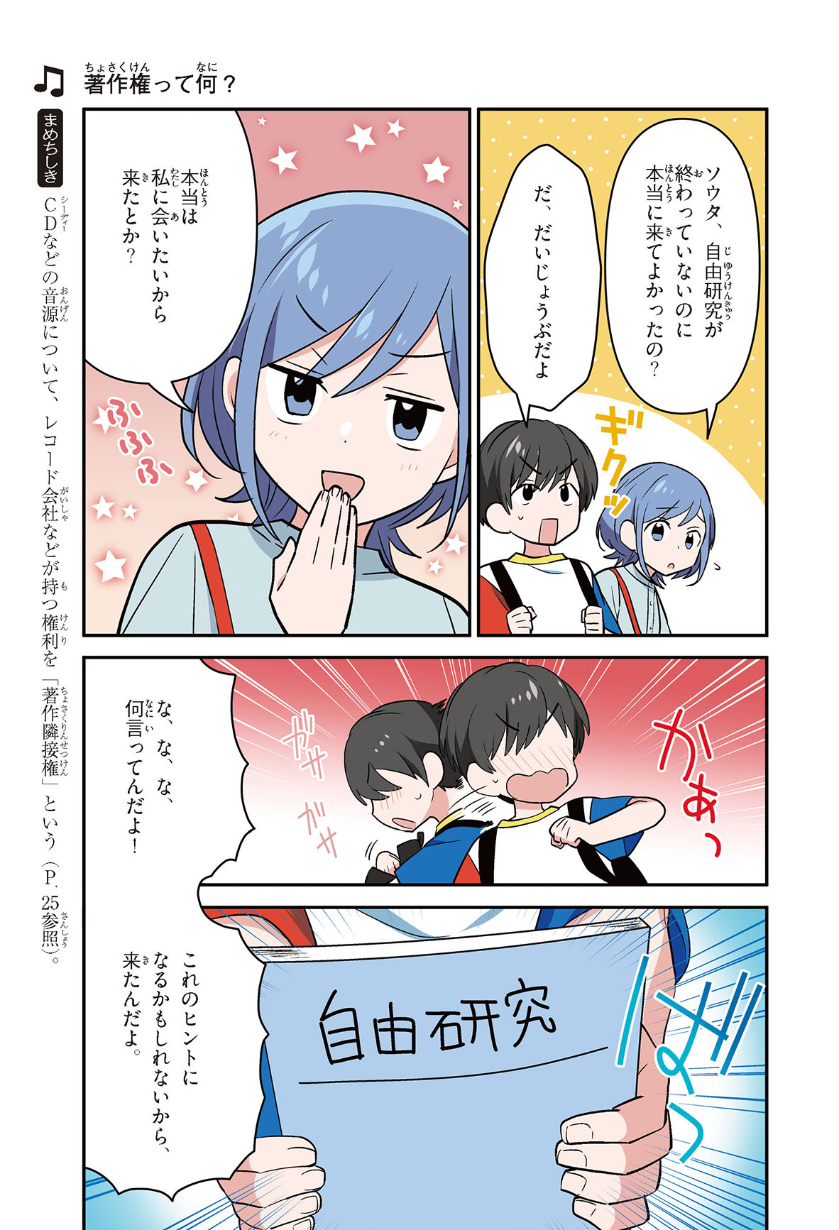 私たちの暮らしは、音楽と深く関わり合っているよね。テレビや動画投稿サイトで好きなミュージシャンの新曲を楽しんだり、お店のBGMで気分が盛り上がったり、学校の授業でみんなと歌ったり演奏したり。実は音楽には、「著作権」という、とても大切な権利があるんだ。 この本は、音楽の著作権について、楽しくしょうかいしているよ!