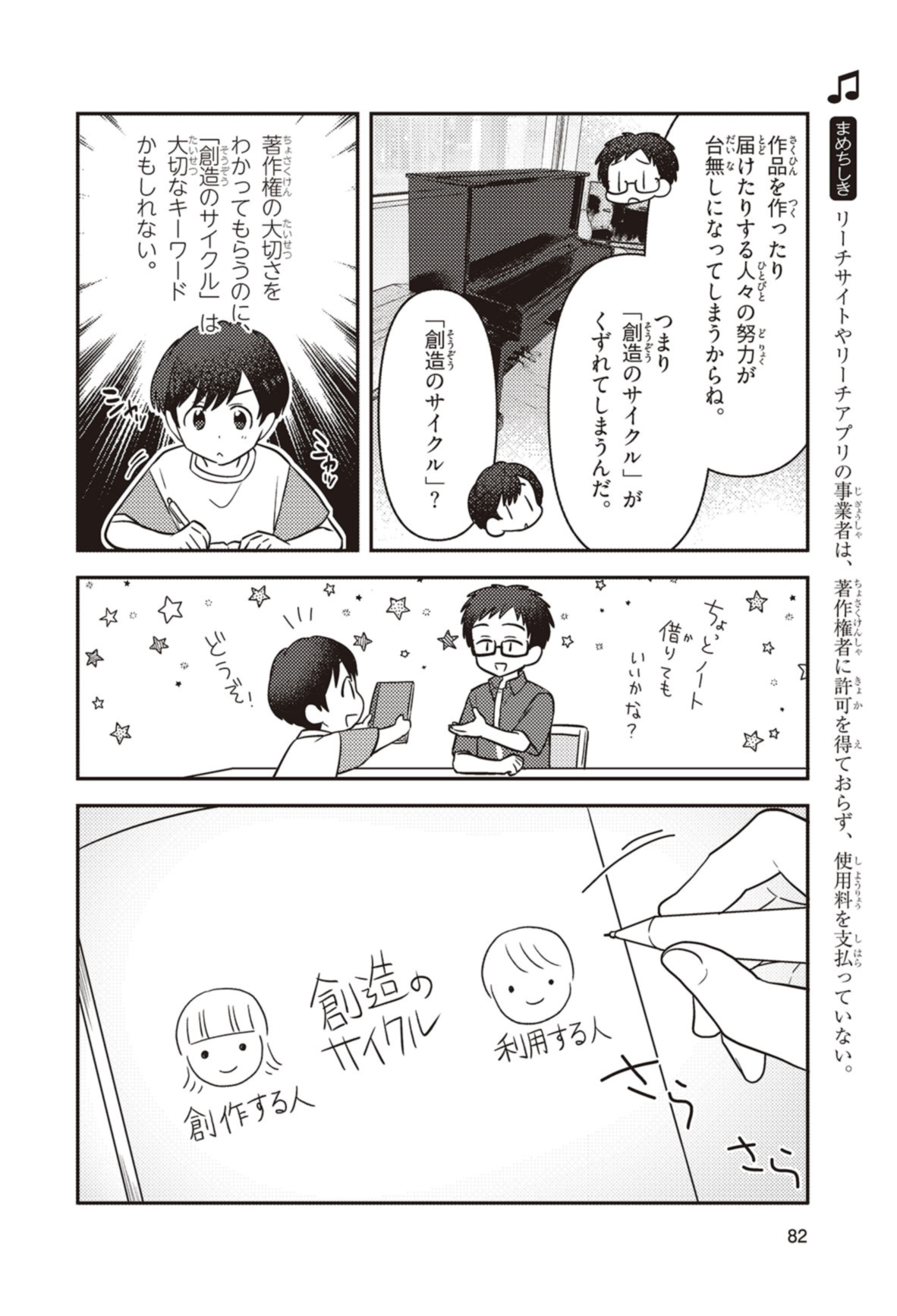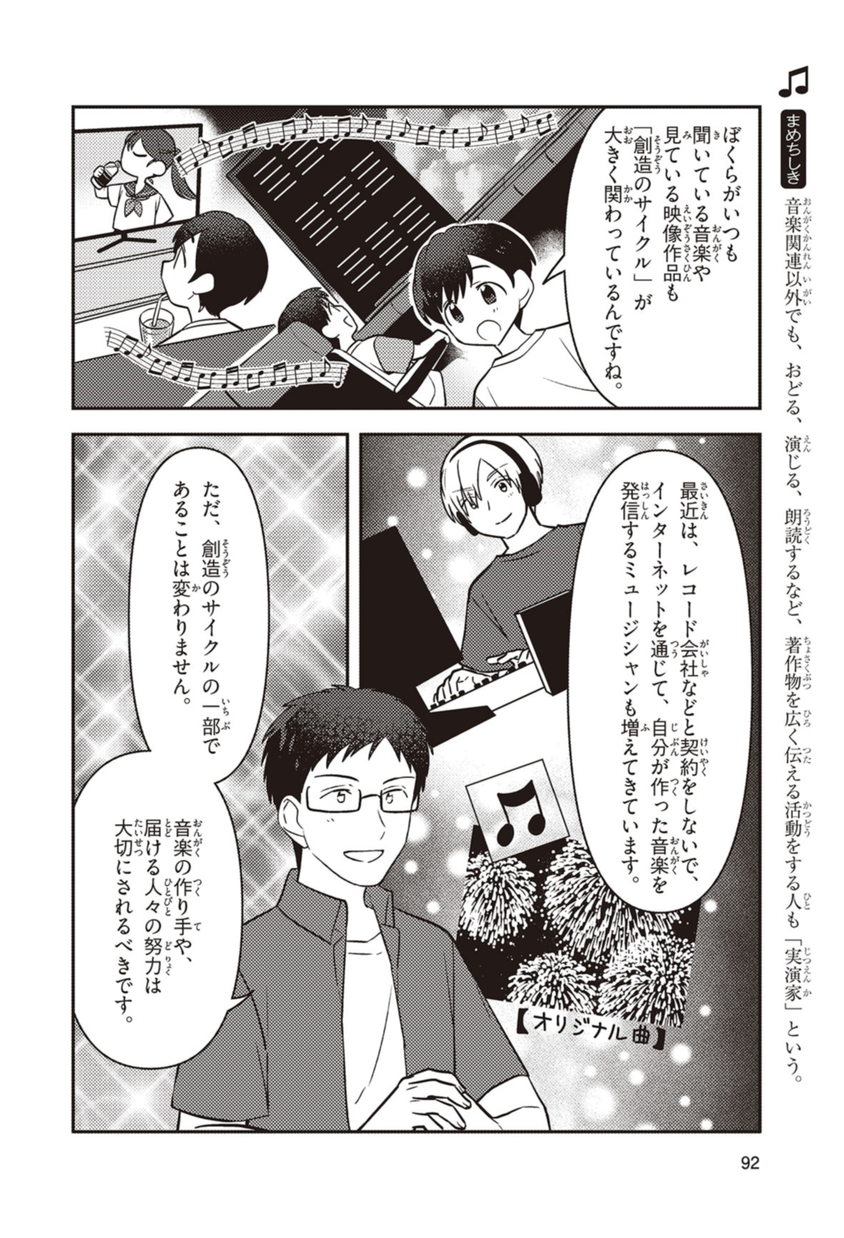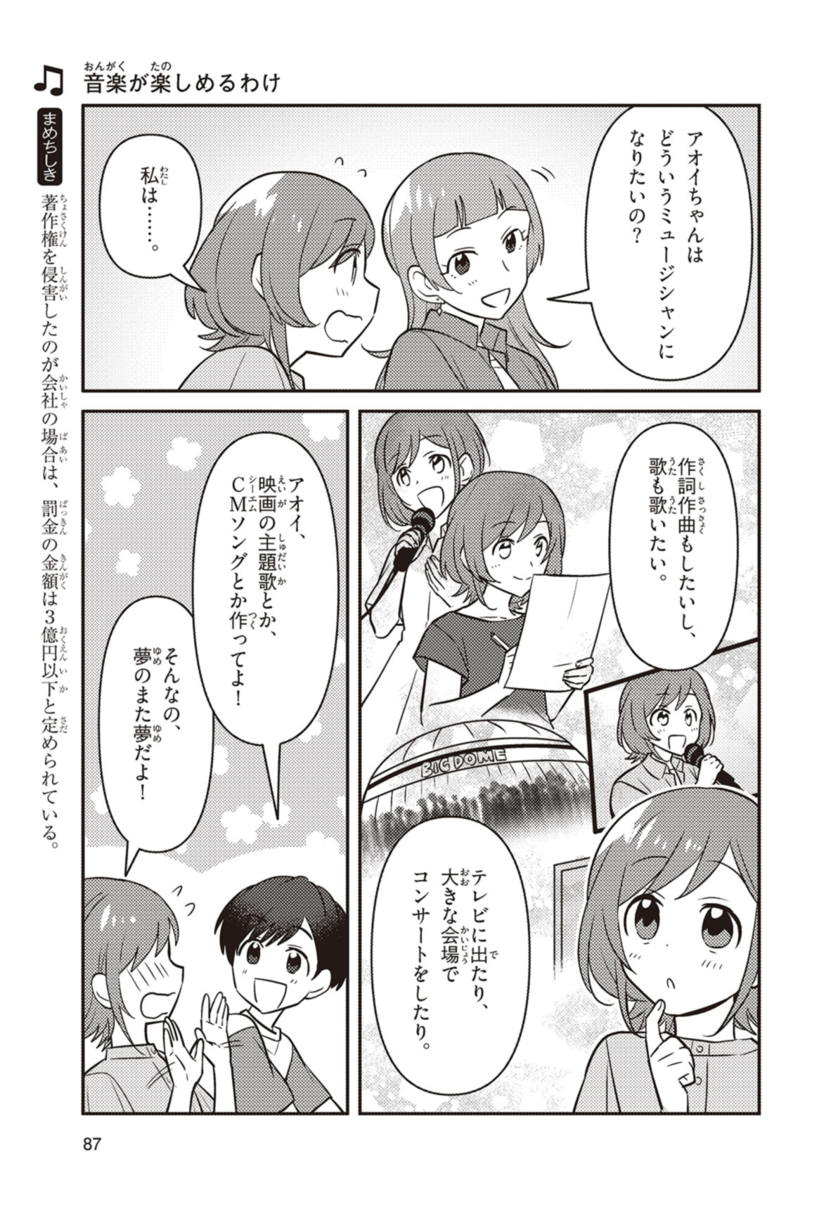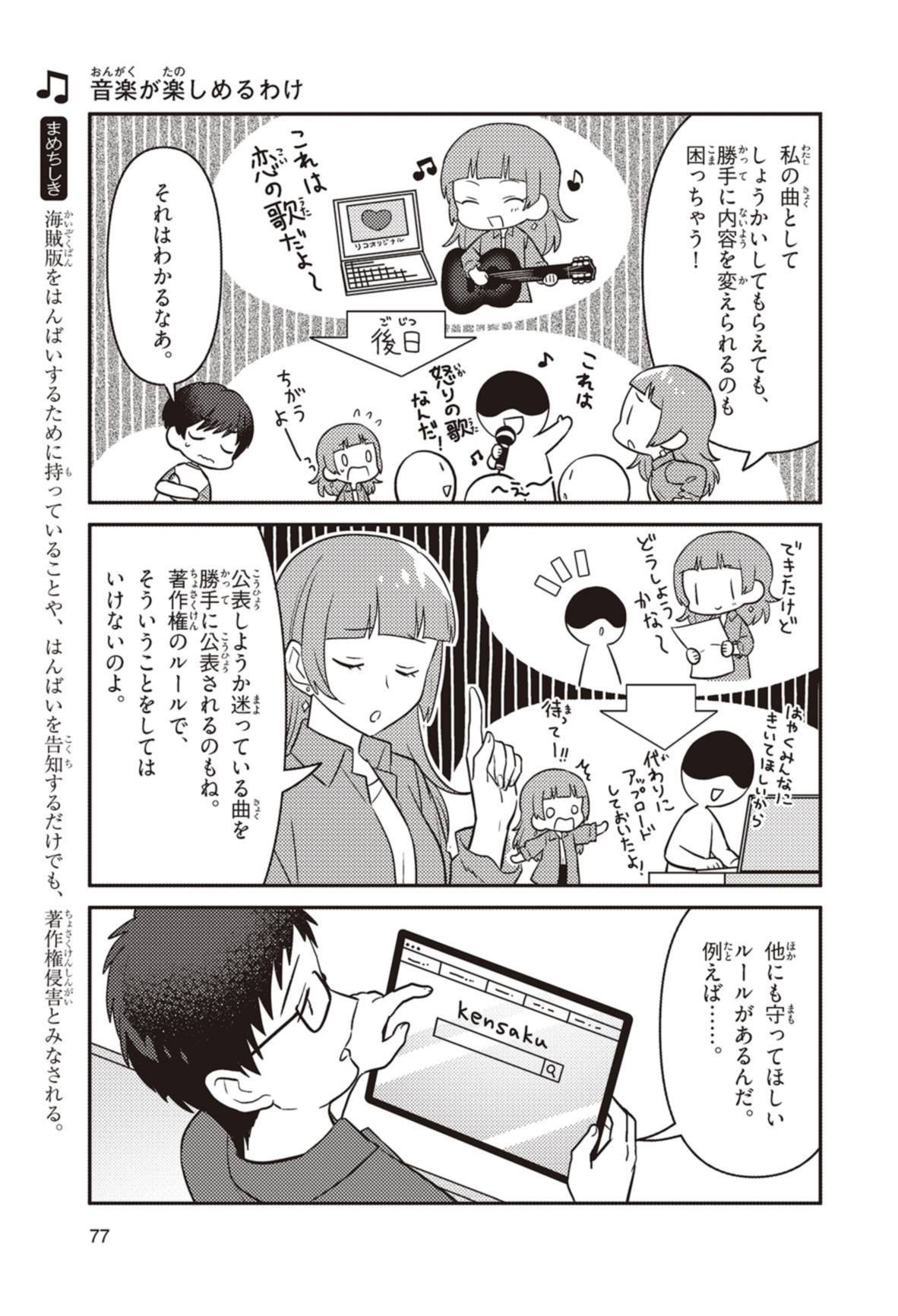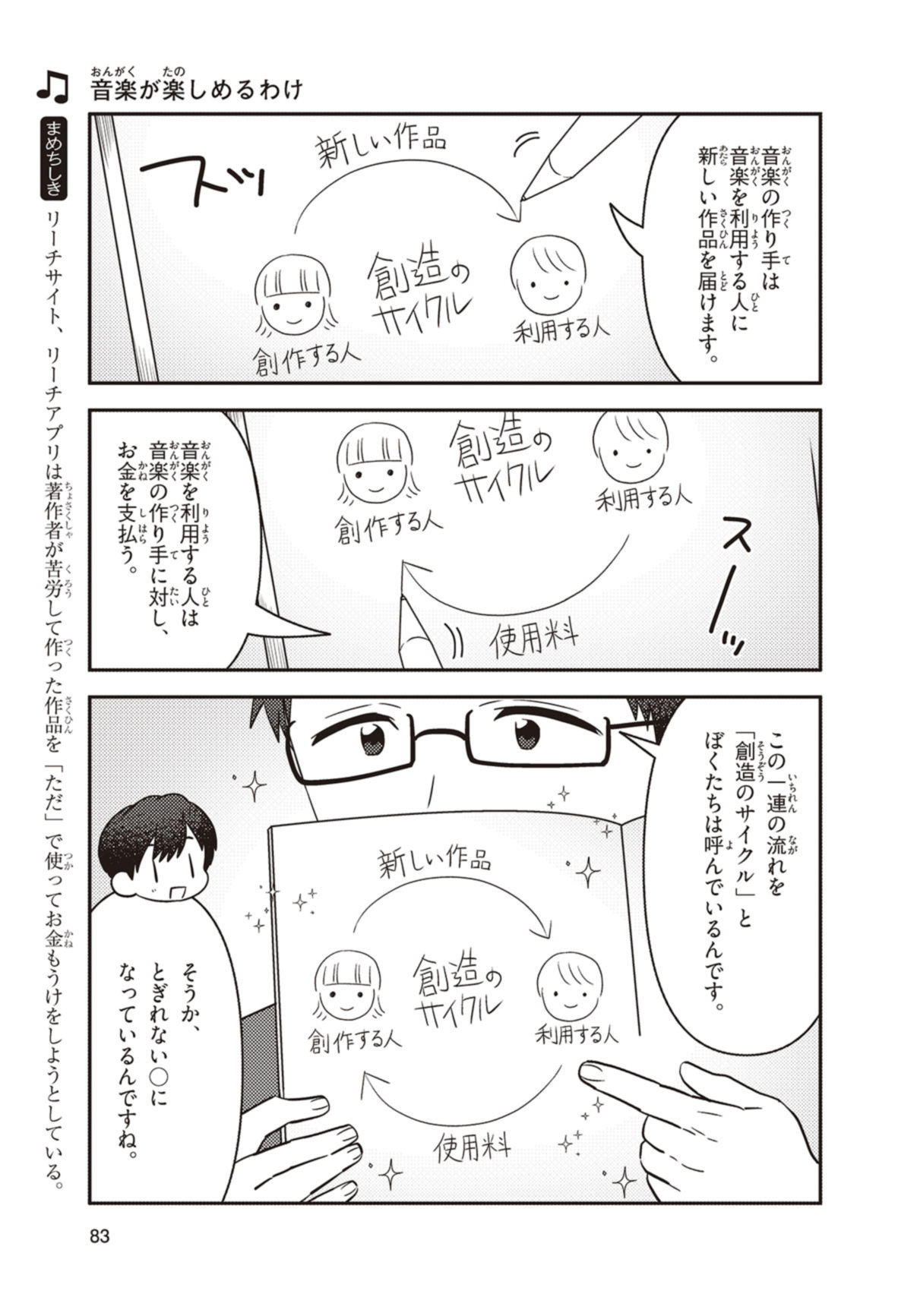 私たちの暮らしは、音楽と深く関わり合っているよね。テレビや動画投稿サイトで好きなミュージシャンの新曲を楽しんだり、お店のBGMで気分が盛り上がったり、学校の授業でみんなと歌ったり演奏したり。実は音楽には、「著作権」という、とても大切な権利があるんだ。 この本は、音楽の著作権について、楽しくしょうかいしているよ!