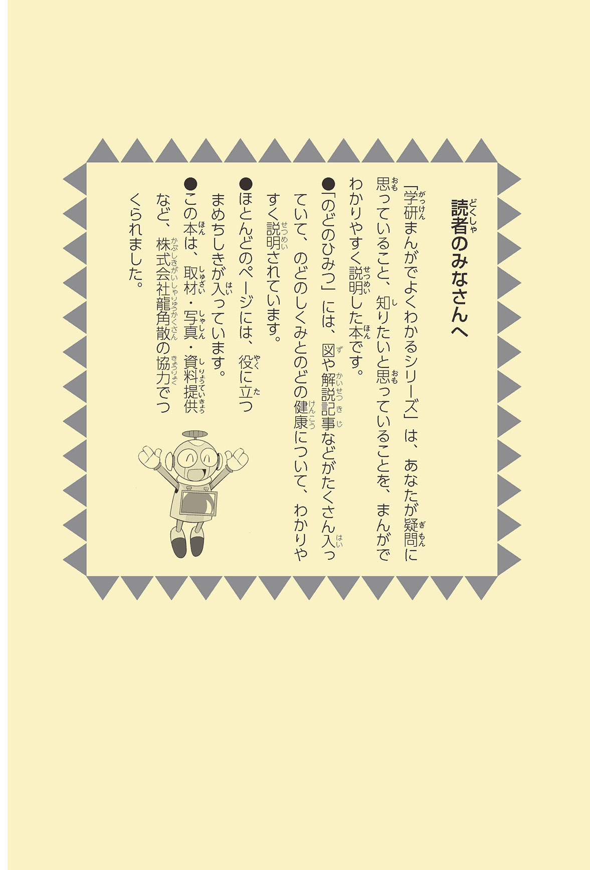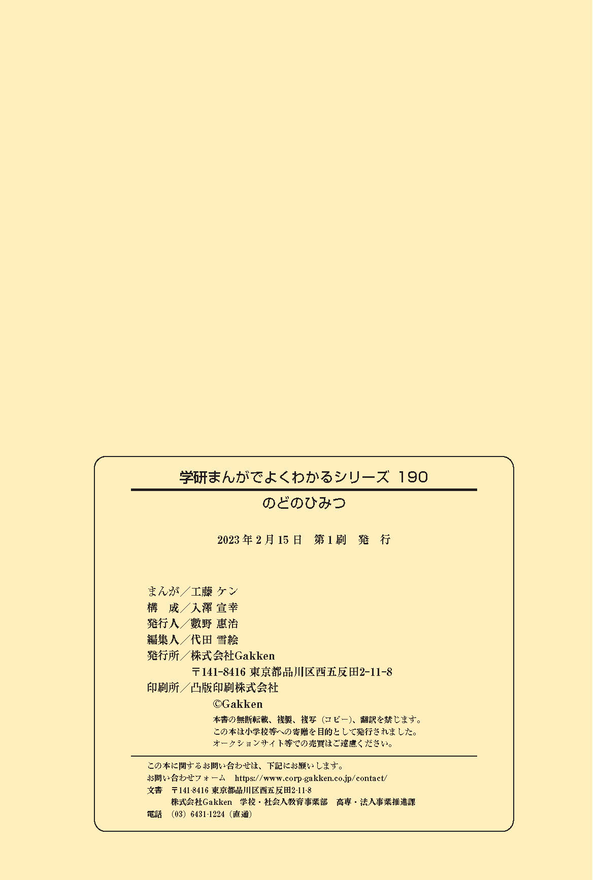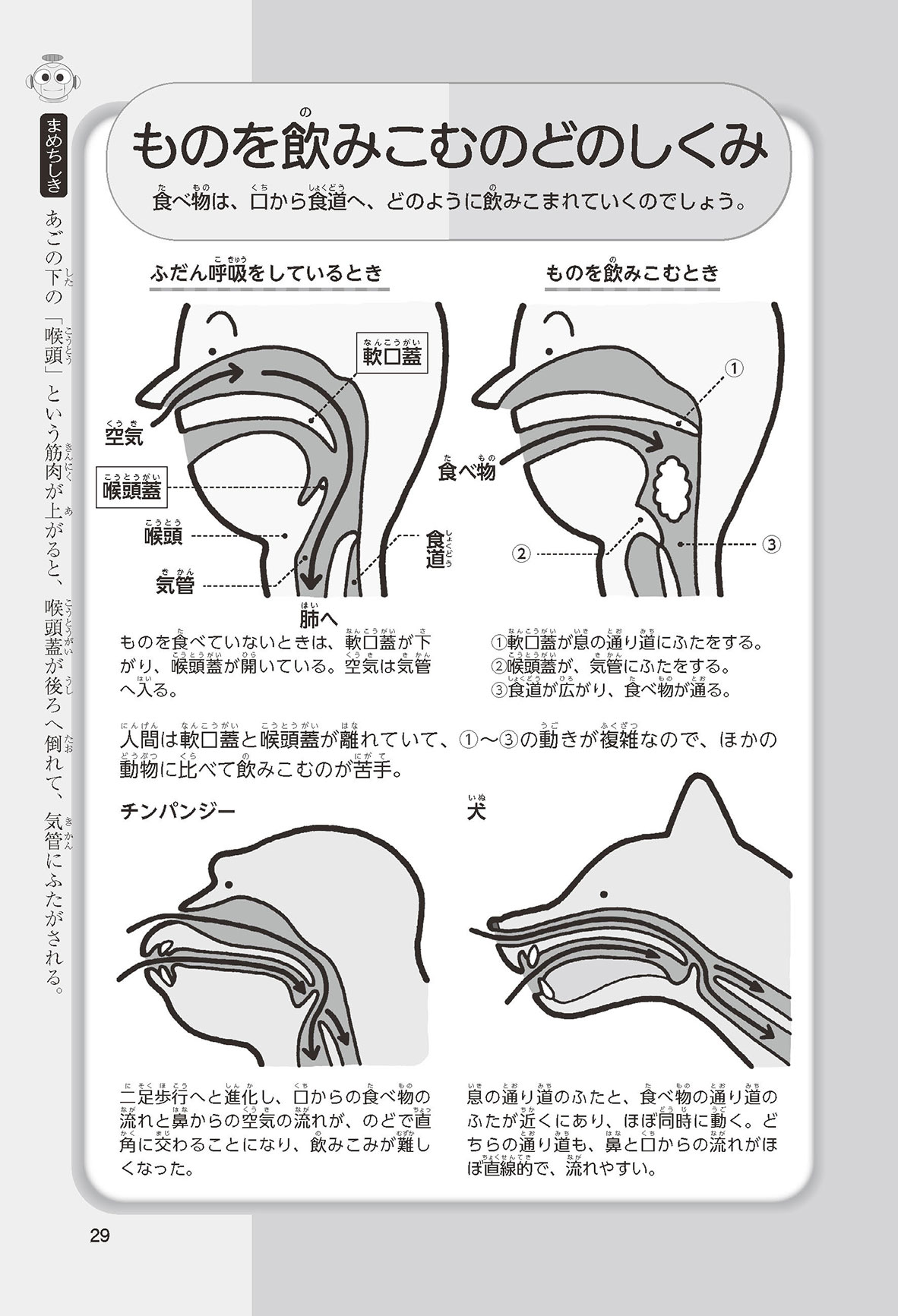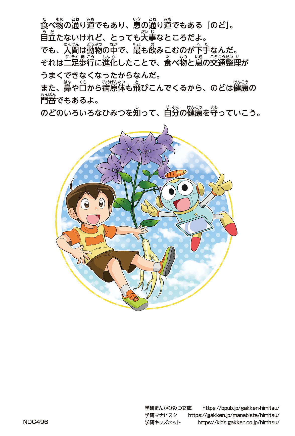 食べ物の通り道でもあり、息の通り道でもある「のど」。目立たないけれど、とっても大事なところだ。でも、人間は動物の中で、最も飲みこむのが下手。それは二足歩行に進化したことで、食べ物と息の交通整理がうまくできなくなったからなんだ。また、鼻や口から病原体も飛びこんでくるから、のどは健康の門番ともいえる。のどのいろいろなひみつを知って、自分の健康を守っていこう。