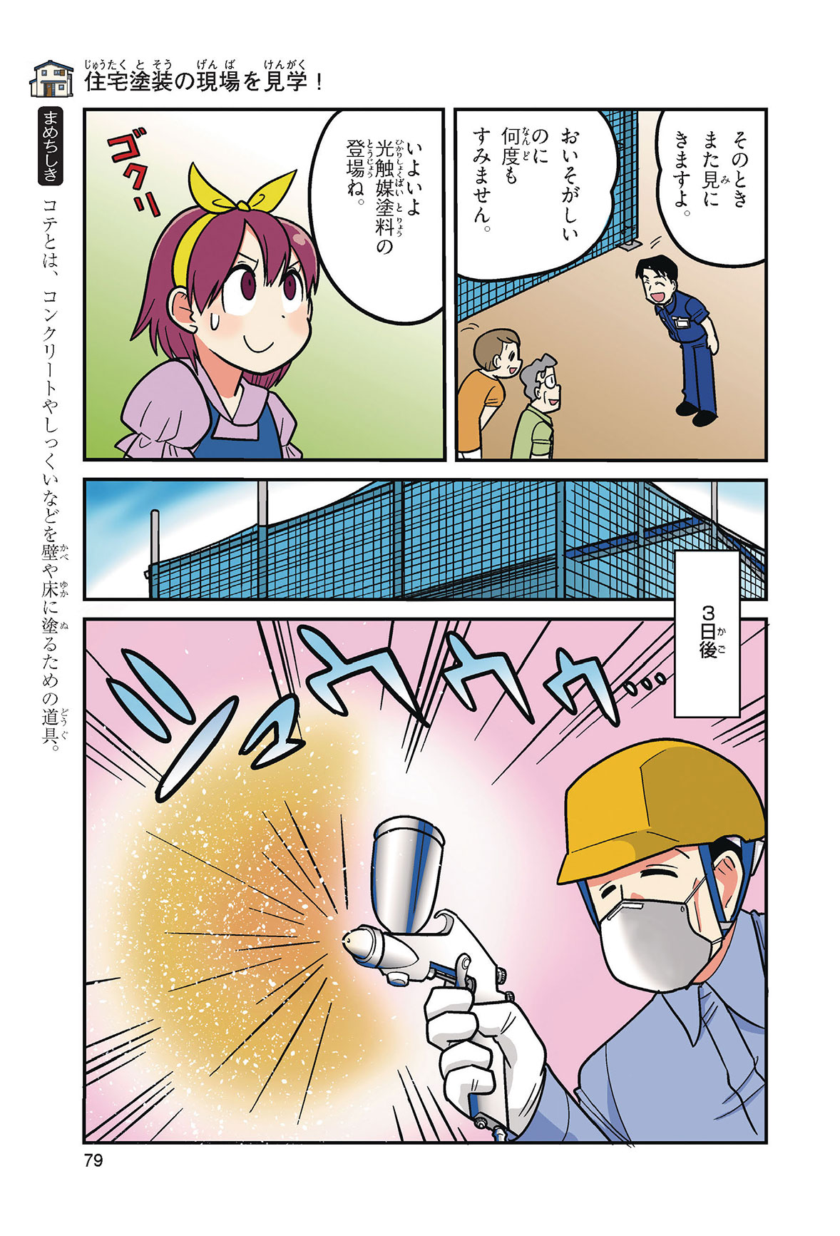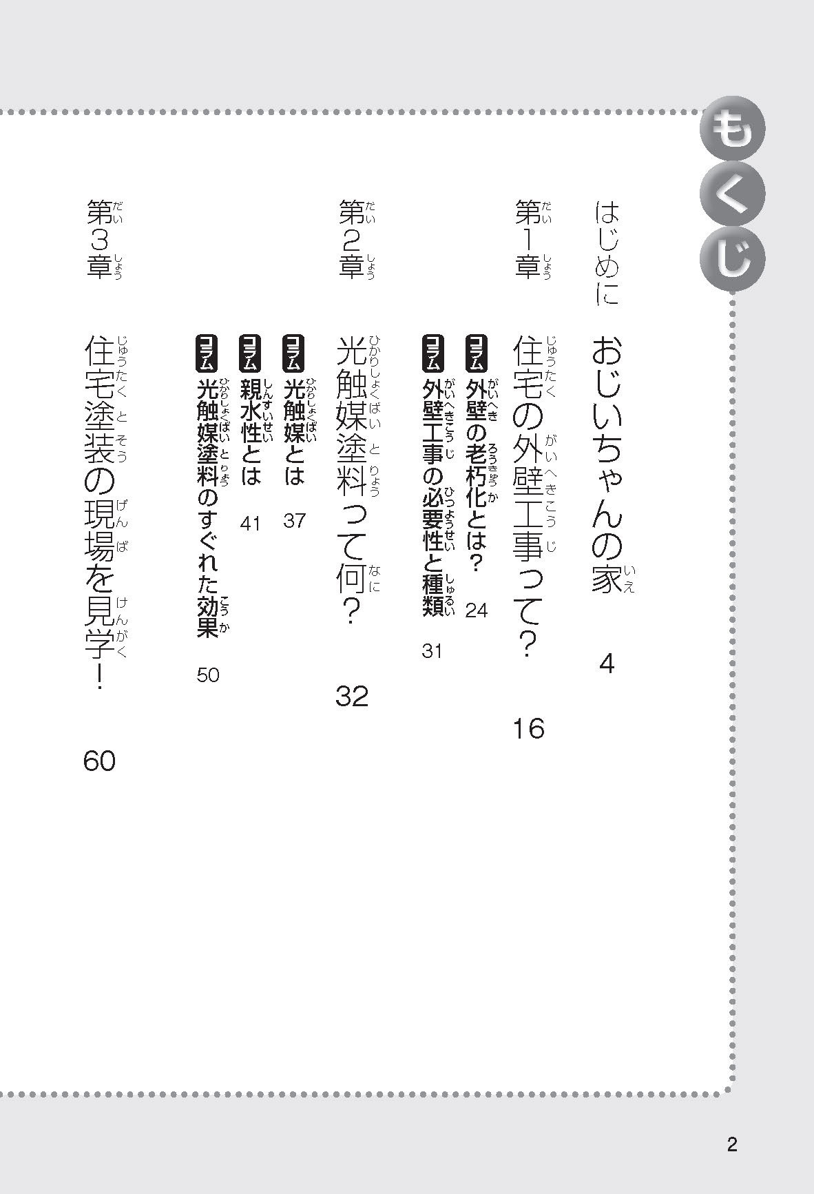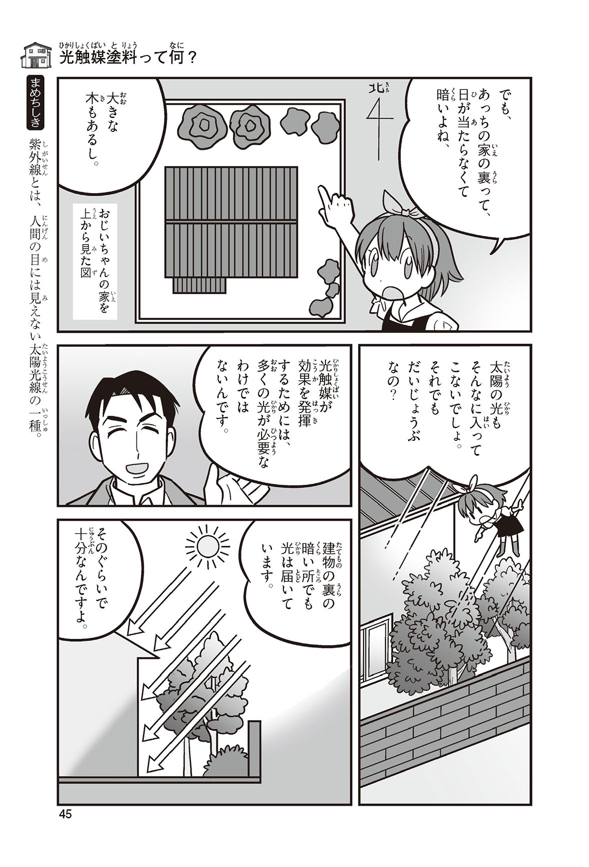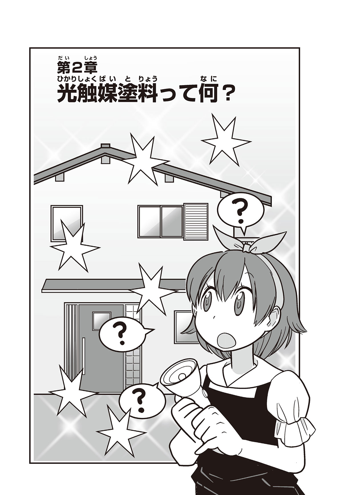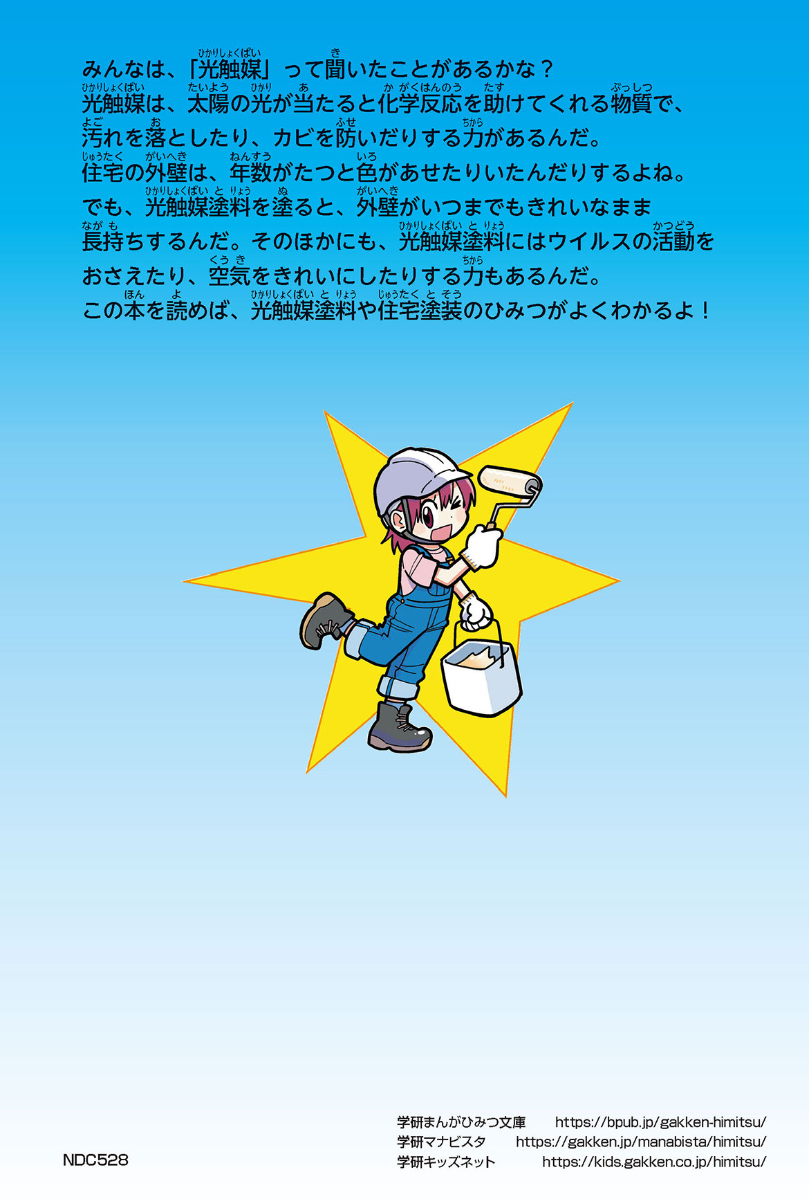 「光触媒」って知っているかな?太陽の光が当たると化学反応を助けてくれる物質で、汚れを落としたり、カビを防いだりする力があるんだ。住宅の外壁は、年数がたつと色があせたりいたんだりするけど、光触媒塗料を塗ると、外壁がきれいなまま長持ちするんだ。そのほかにも、ウイルスの活動をおさえたり、空気をきれいにしたりする力もあるんだ。この本を読めば、光触媒塗料や住宅塗装のことがよくわかるよ!