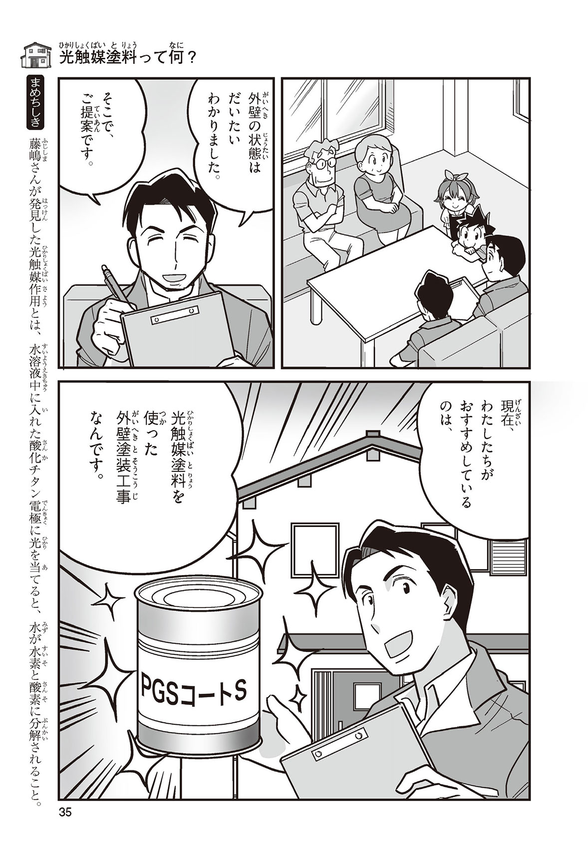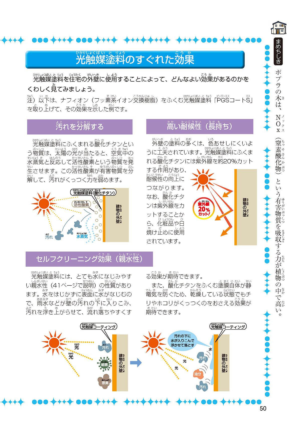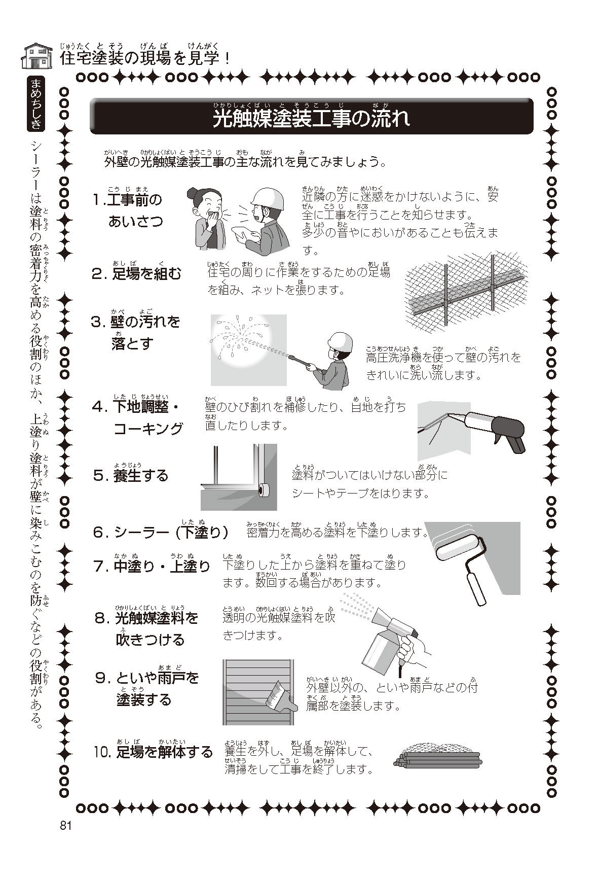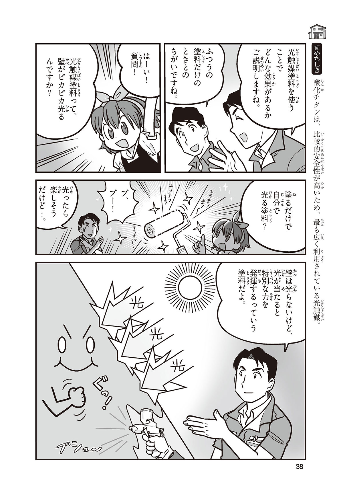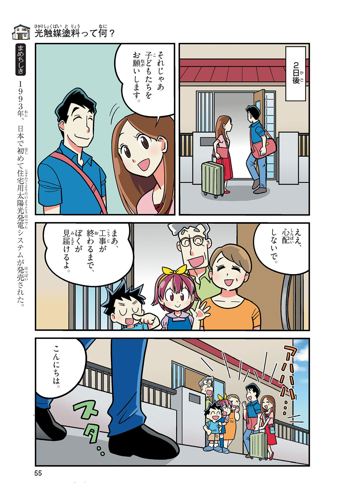 「光触媒」って知っているかな?太陽の光が当たると化学反応を助けてくれる物質で、汚れを落としたり、カビを防いだりする力があるんだ。住宅の外壁は、年数がたつと色があせたりいたんだりするけど、光触媒塗料を塗ると、外壁がきれいなまま長持ちするんだ。そのほかにも、ウイルスの活動をおさえたり、空気をきれいにしたりする力もあるんだ。この本を読めば、光触媒塗料や住宅塗装のことがよくわかるよ!