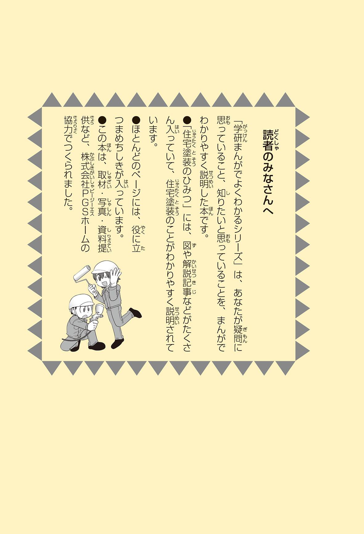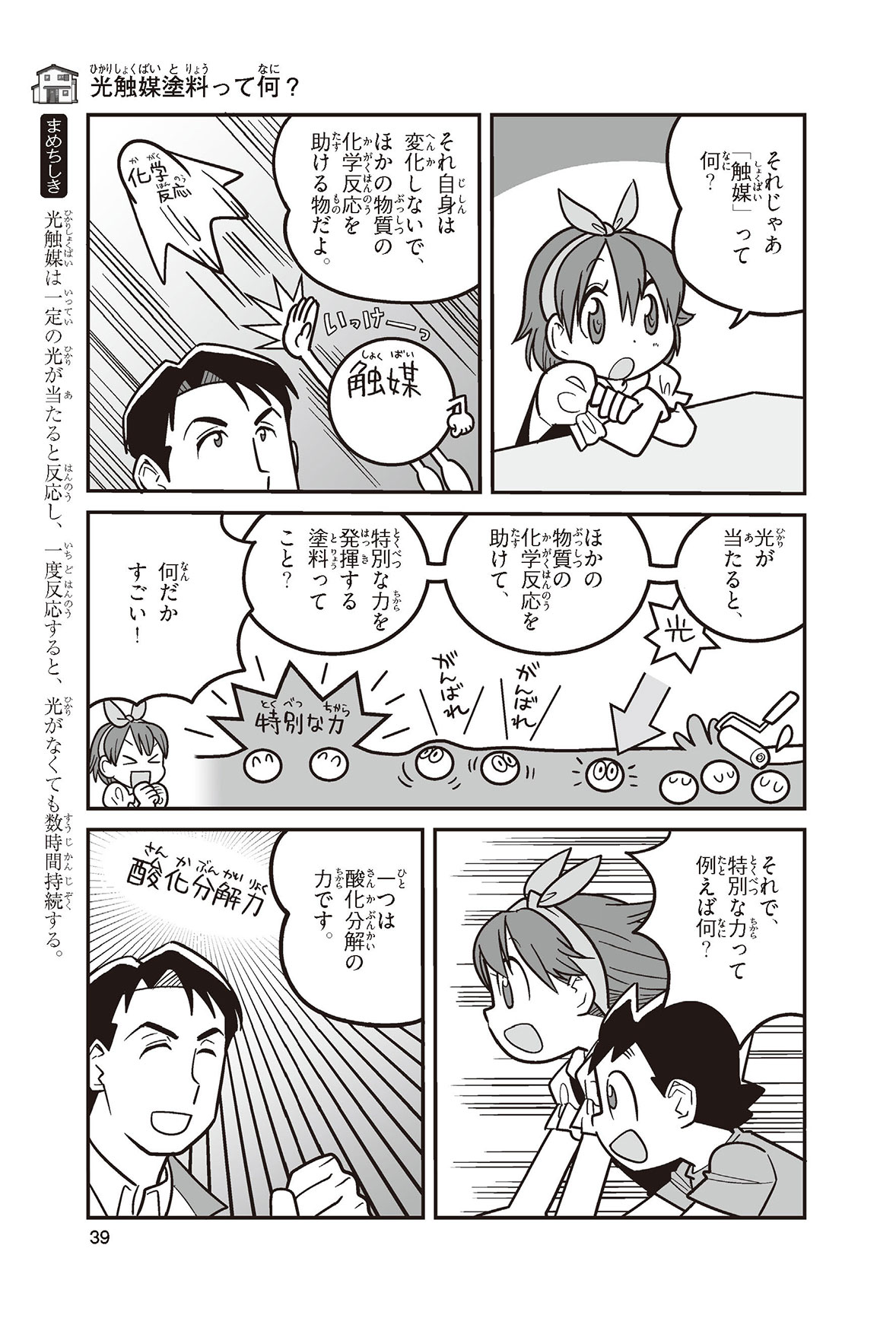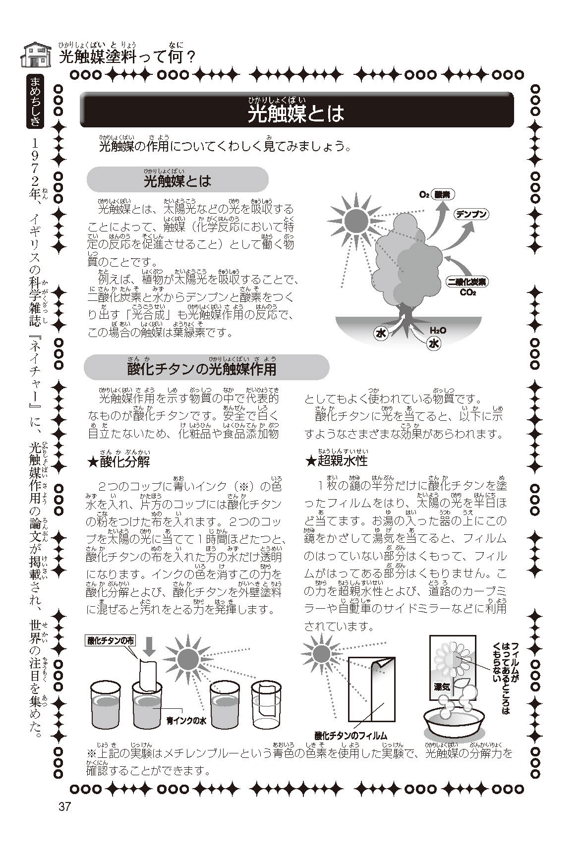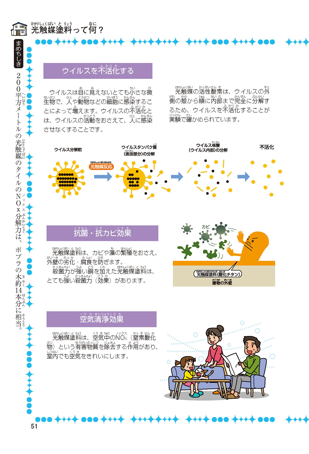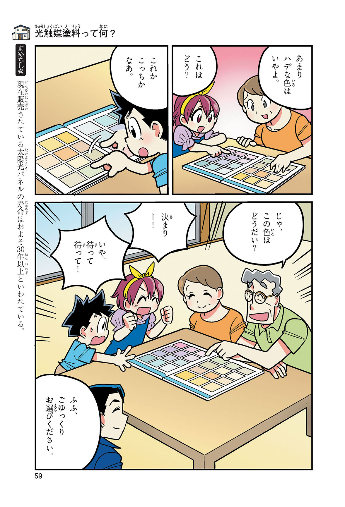 「光触媒」って知っているかな?太陽の光が当たると化学反応を助けてくれる物質で、汚れを落としたり、カビを防いだりする力があるんだ。住宅の外壁は、年数がたつと色があせたりいたんだりするけど、光触媒塗料を塗ると、外壁がきれいなまま長持ちするんだ。そのほかにも、ウイルスの活動をおさえたり、空気をきれいにしたりする力もあるんだ。この本を読めば、光触媒塗料や住宅塗装のことがよくわかるよ!
