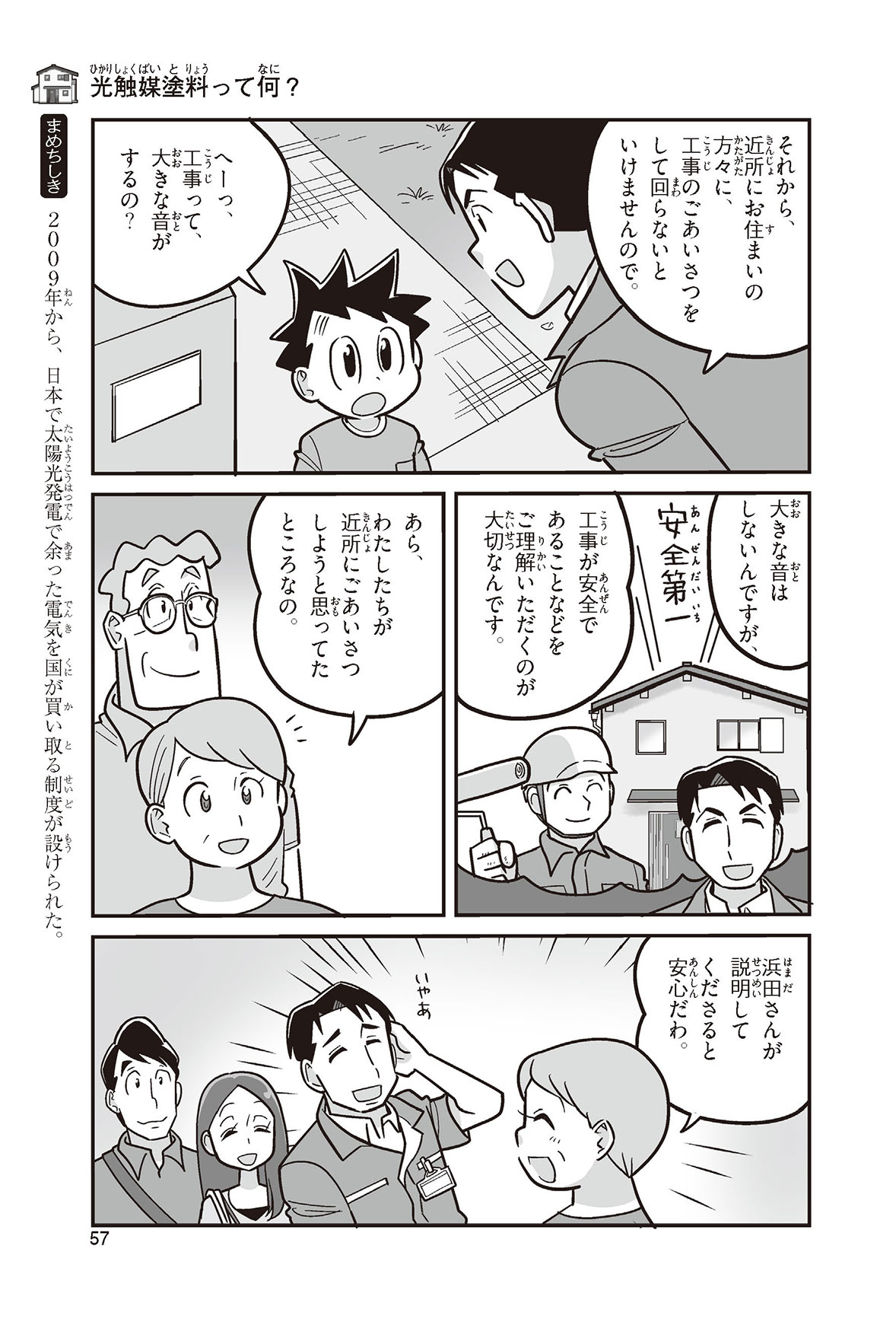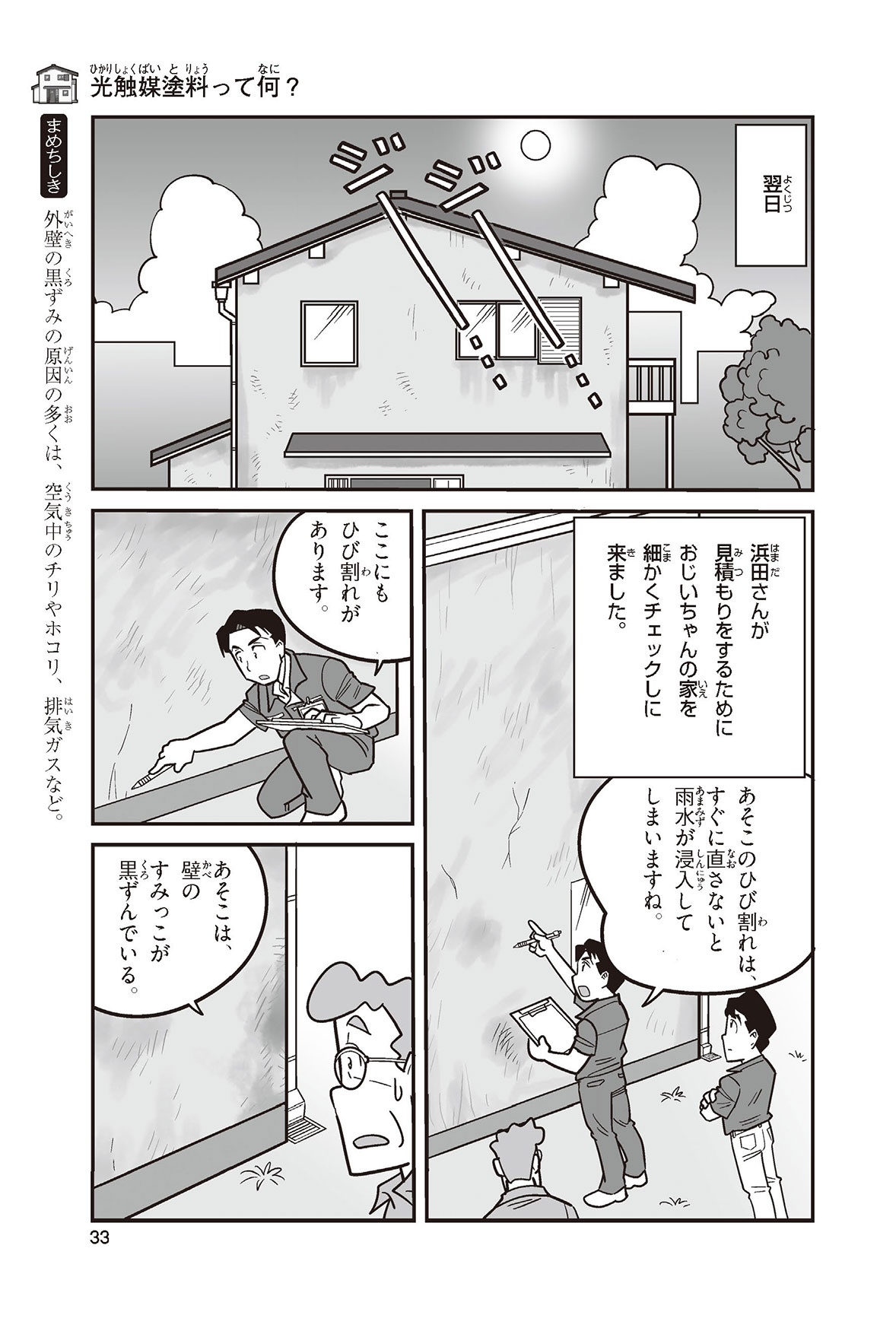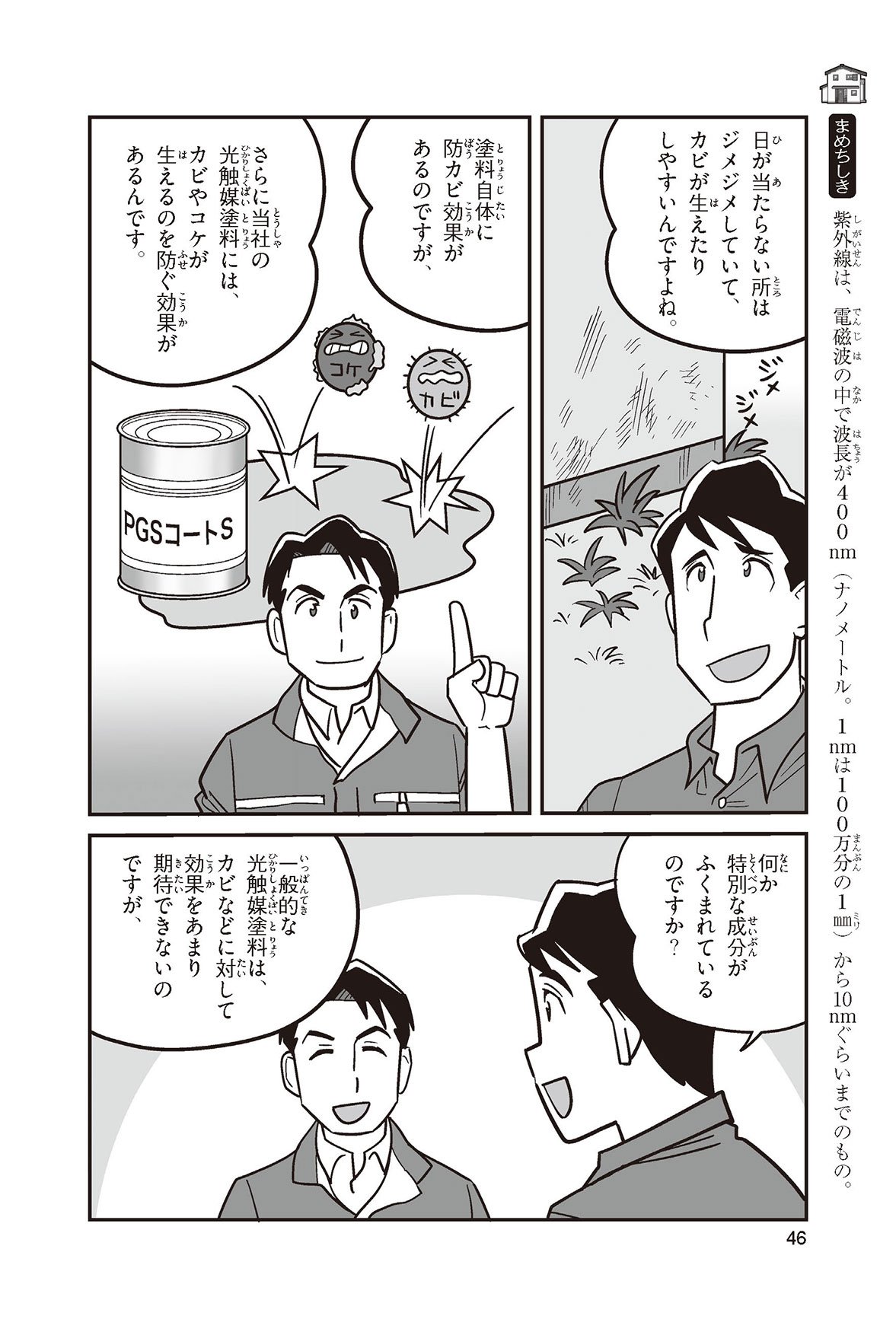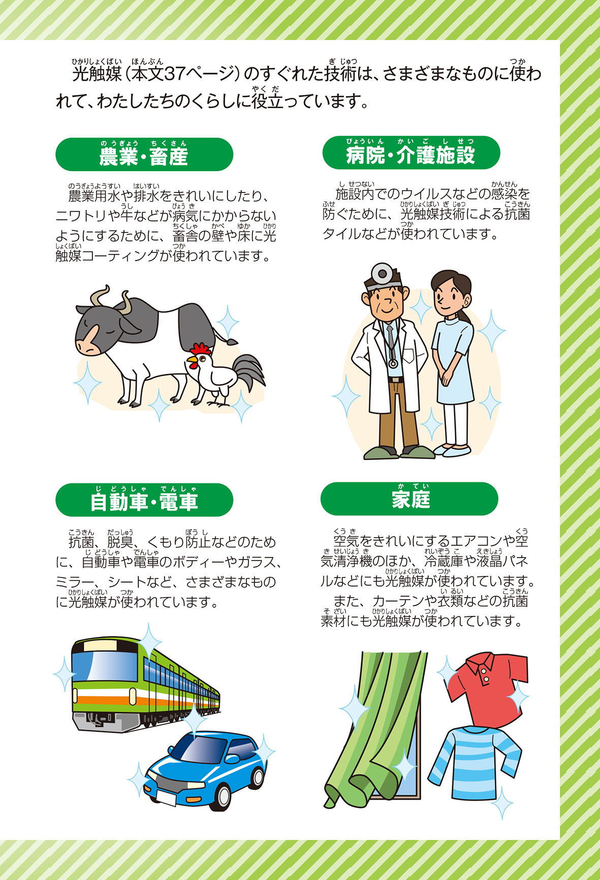 「光触媒」って知っているかな?太陽の光が当たると化学反応を助けてくれる物質で、汚れを落としたり、カビを防いだりする力があるんだ。住宅の外壁は、年数がたつと色があせたりいたんだりするけど、光触媒塗料を塗ると、外壁がきれいなまま長持ちするんだ。そのほかにも、ウイルスの活動をおさえたり、空気をきれいにしたりする力もあるんだ。この本を読めば、光触媒塗料や住宅塗装のことがよくわかるよ!