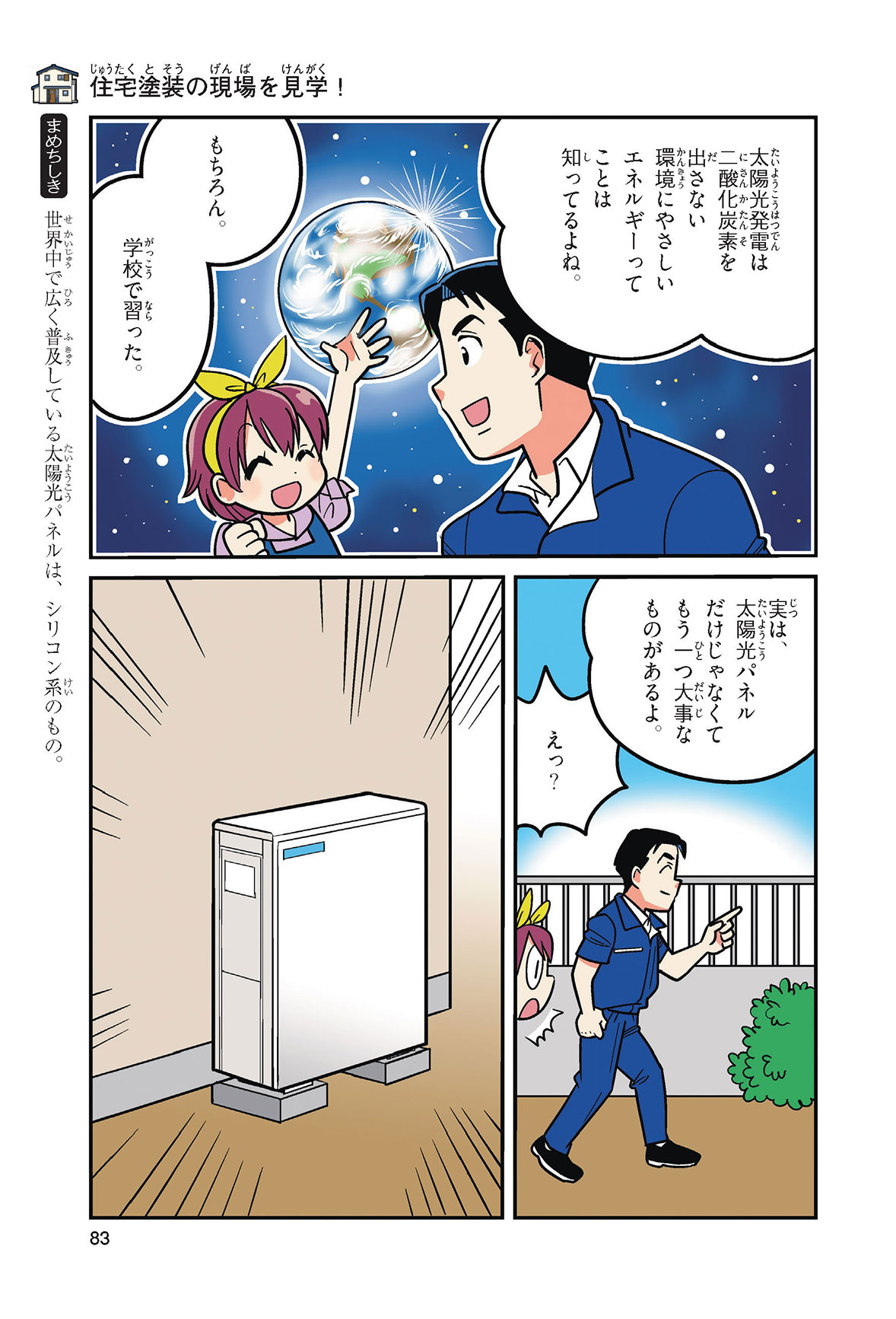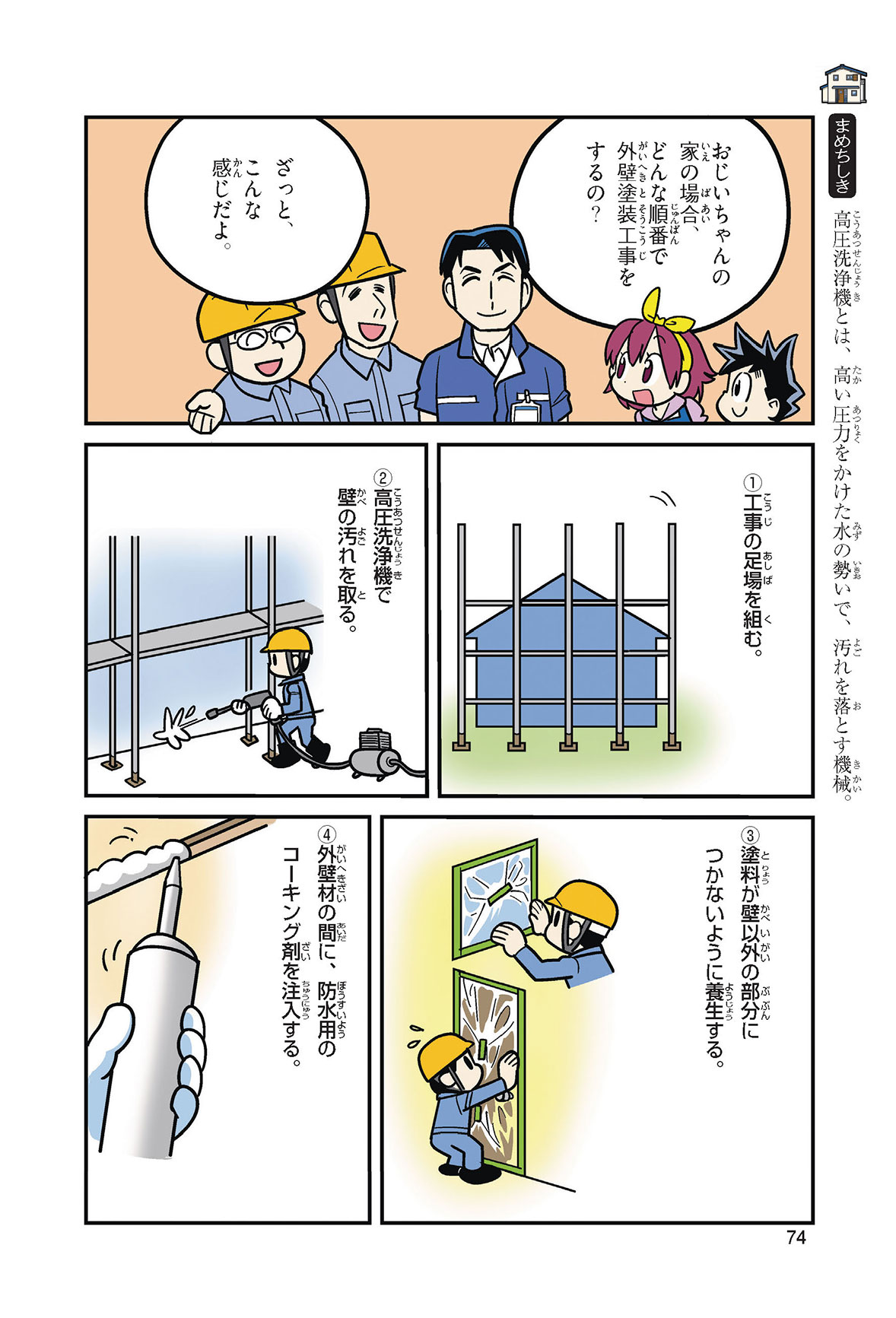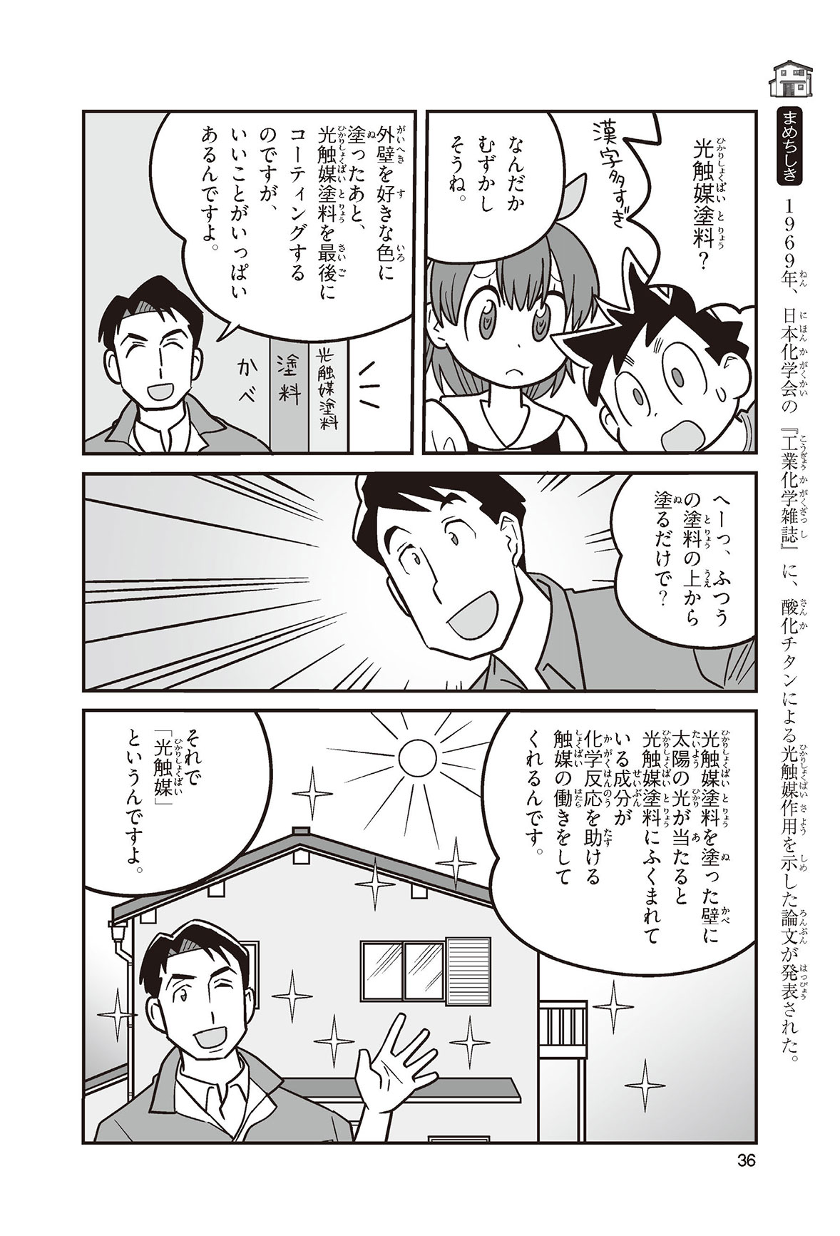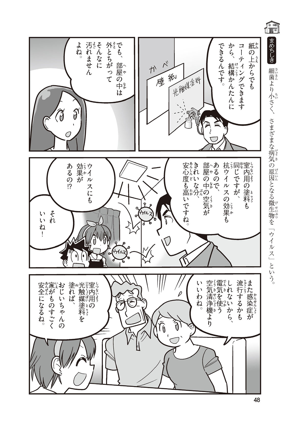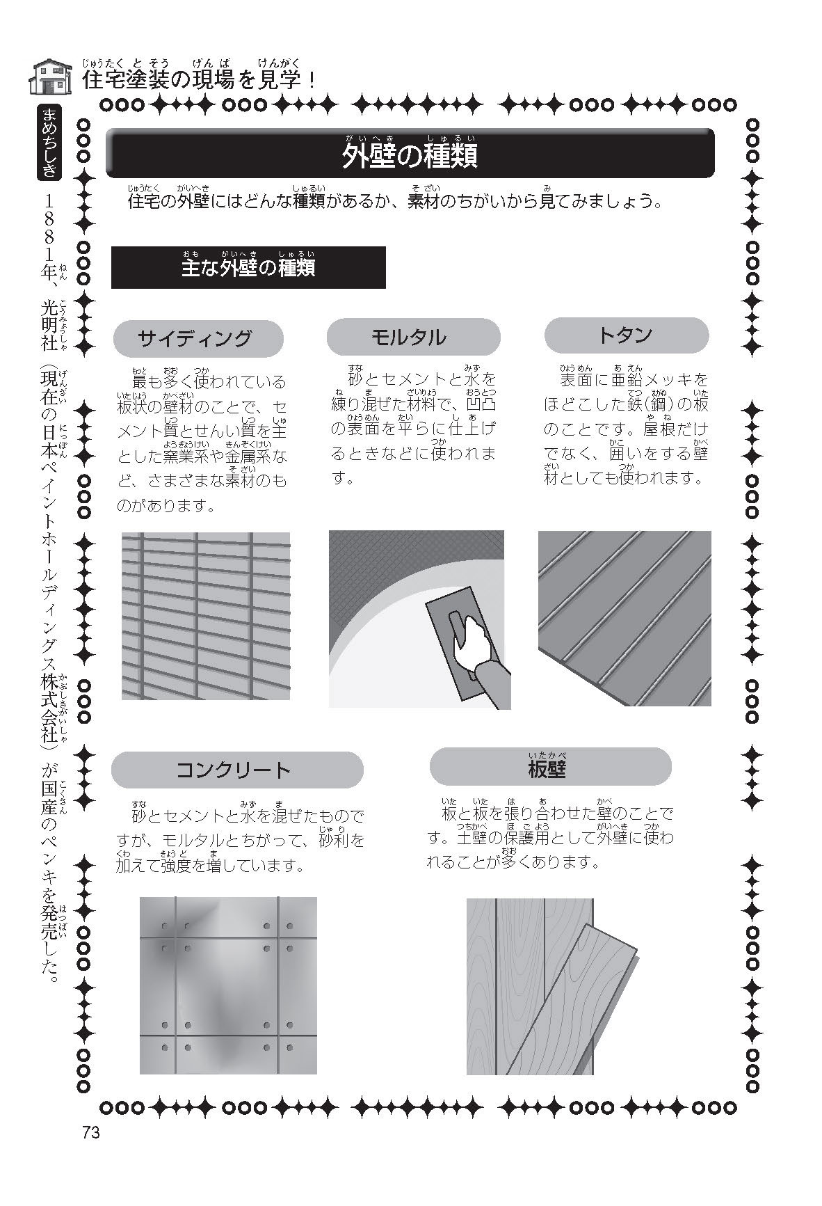 「光触媒」って知っているかな?太陽の光が当たると化学反応を助けてくれる物質で、汚れを落としたり、カビを防いだりする力があるんだ。住宅の外壁は、年数がたつと色があせたりいたんだりするけど、光触媒塗料を塗ると、外壁がきれいなまま長持ちするんだ。そのほかにも、ウイルスの活動をおさえたり、空気をきれいにしたりする力もあるんだ。この本を読めば、光触媒塗料や住宅塗装のことがよくわかるよ!