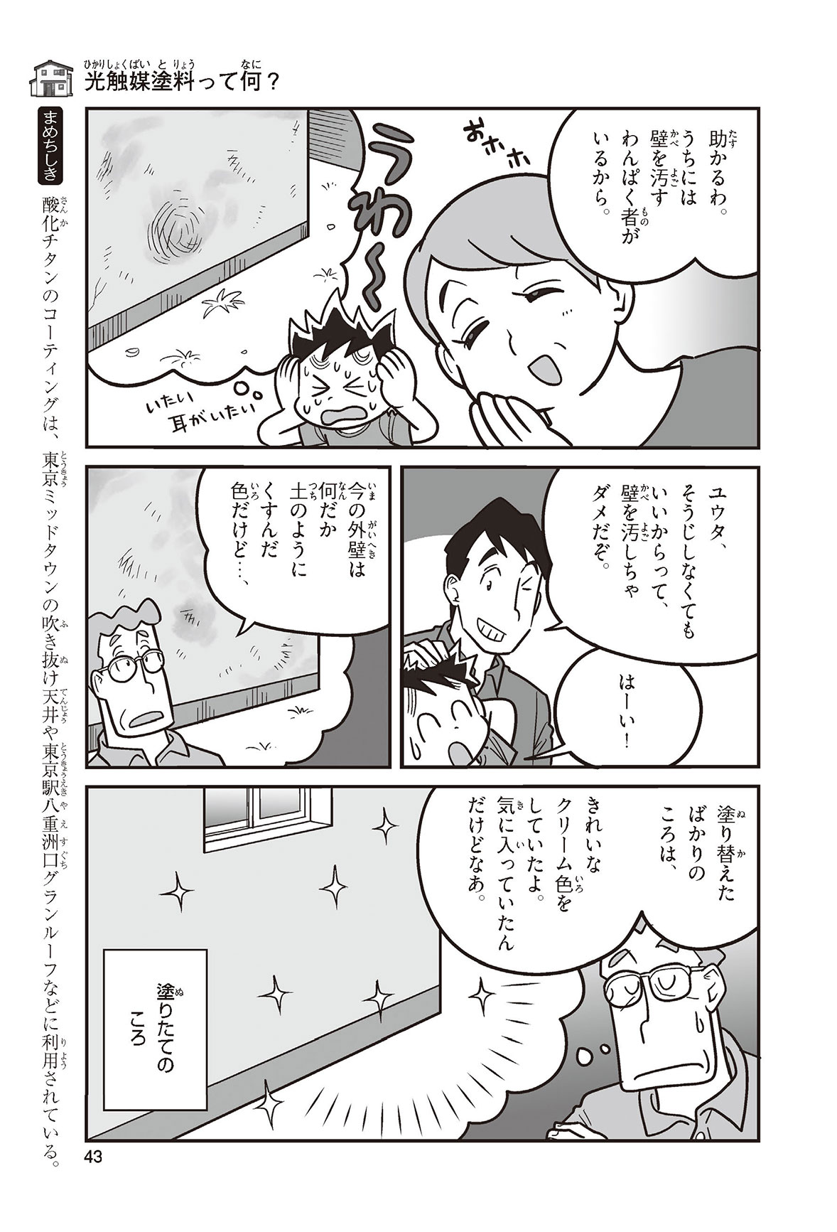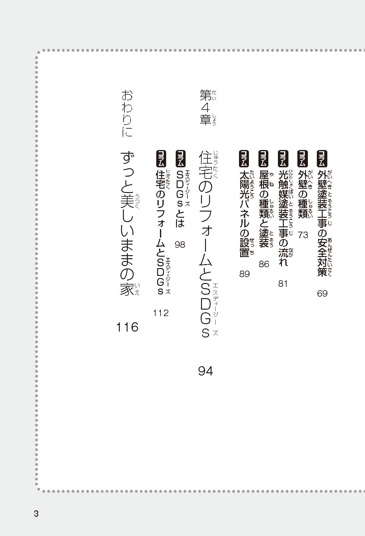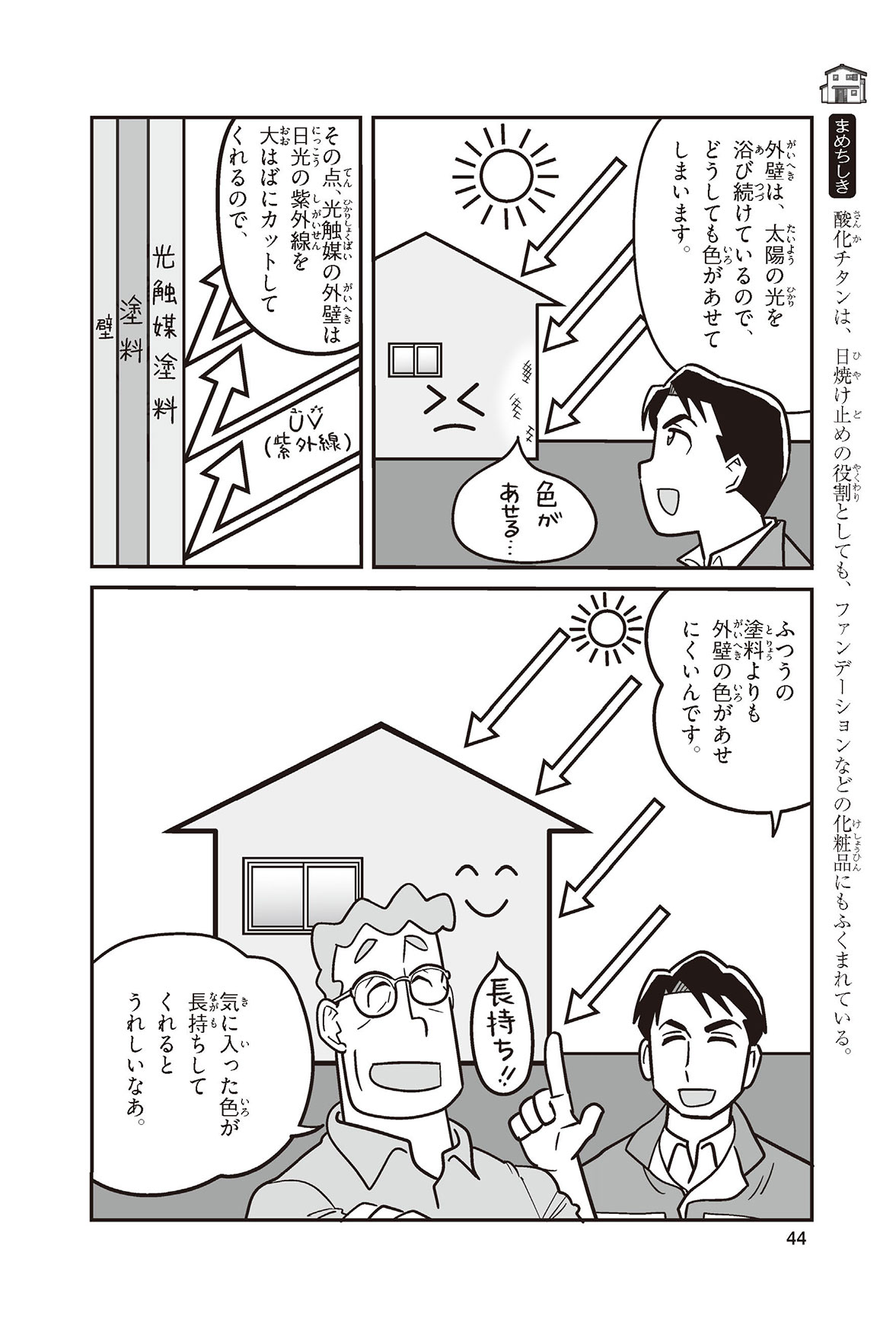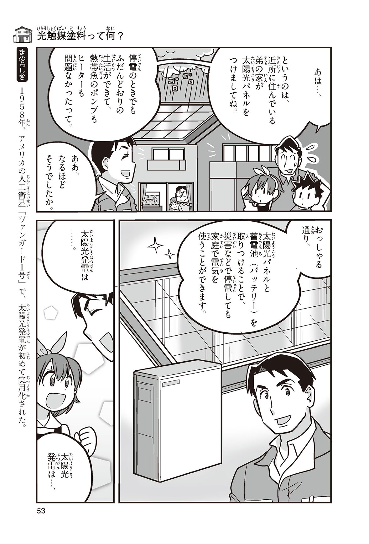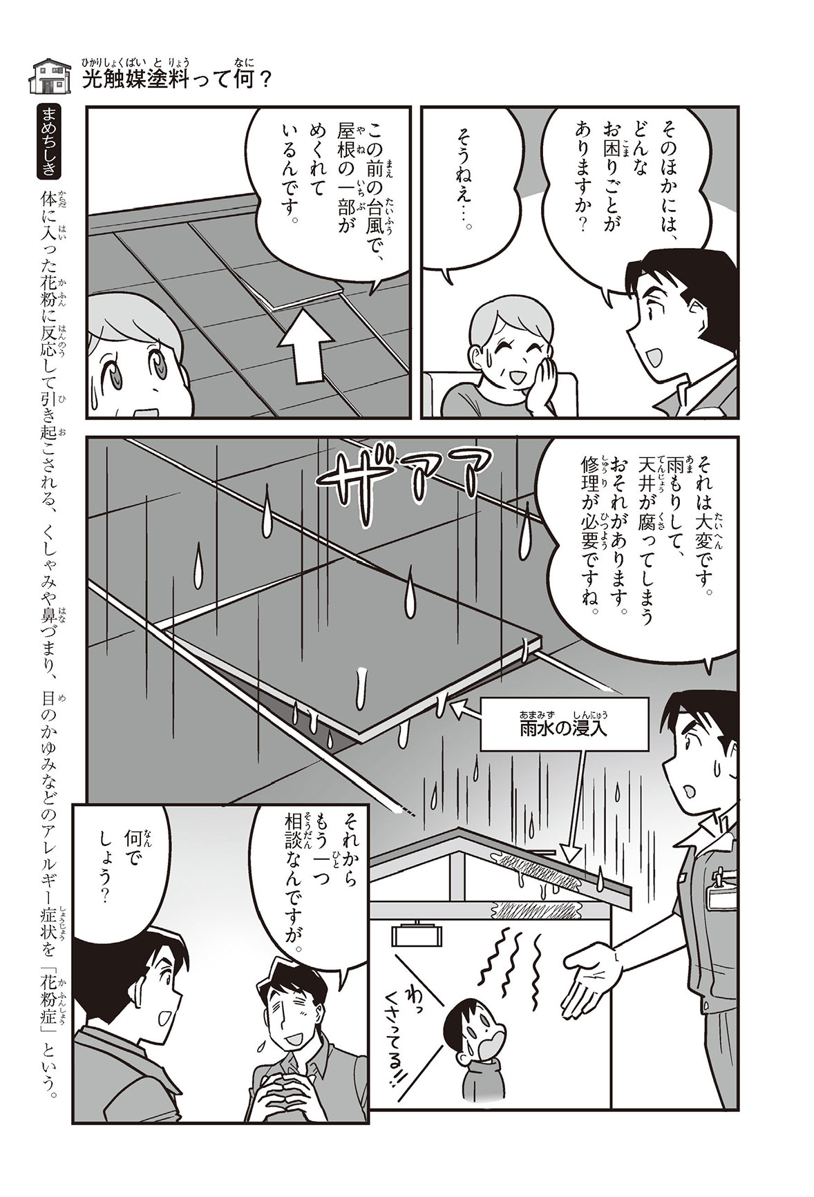 「光触媒」って知っているかな?太陽の光が当たると化学反応を助けてくれる物質で、汚れを落としたり、カビを防いだりする力があるんだ。住宅の外壁は、年数がたつと色があせたりいたんだりするけど、光触媒塗料を塗ると、外壁がきれいなまま長持ちするんだ。そのほかにも、ウイルスの活動をおさえたり、空気をきれいにしたりする力もあるんだ。この本を読めば、光触媒塗料や住宅塗装のことがよくわかるよ!