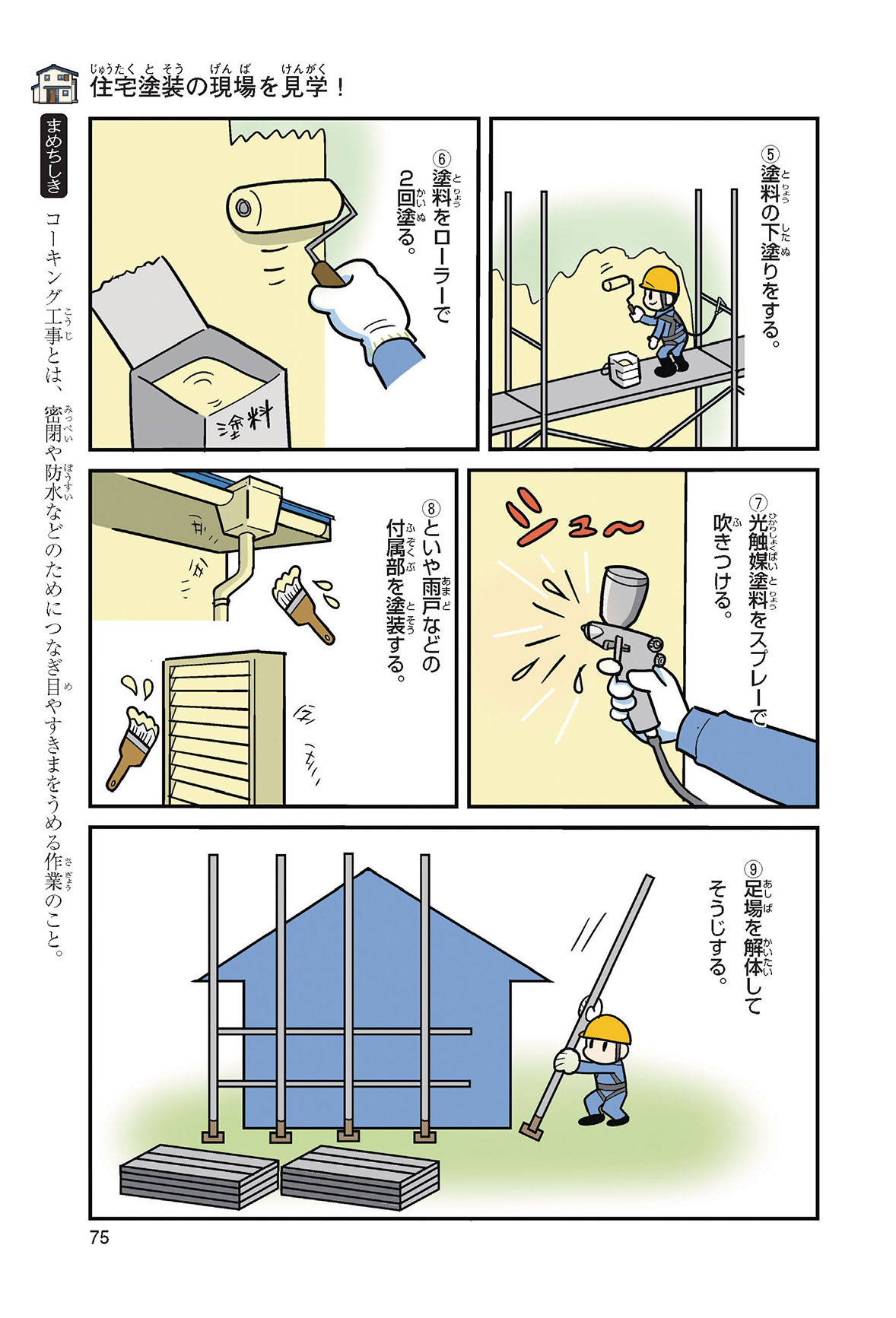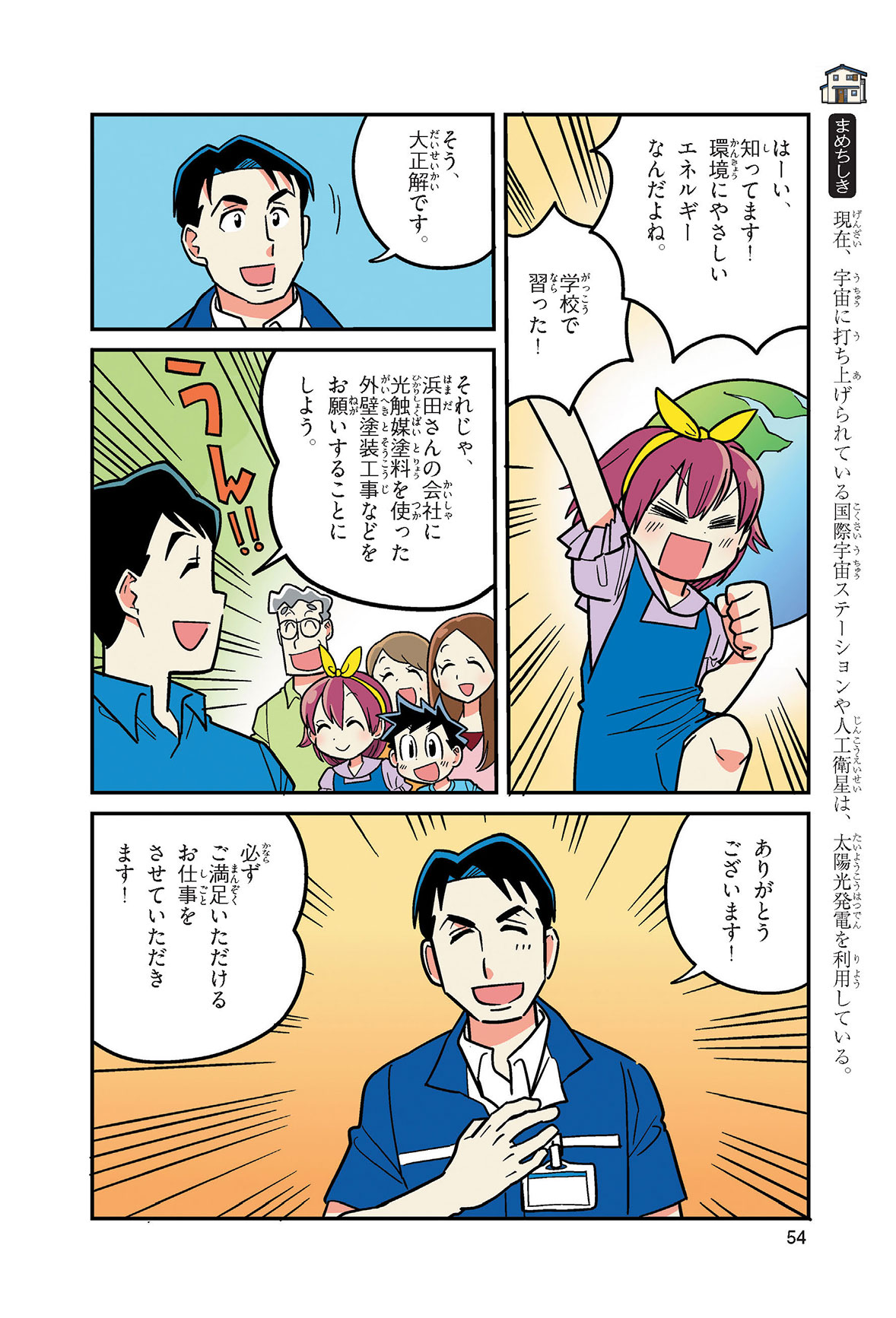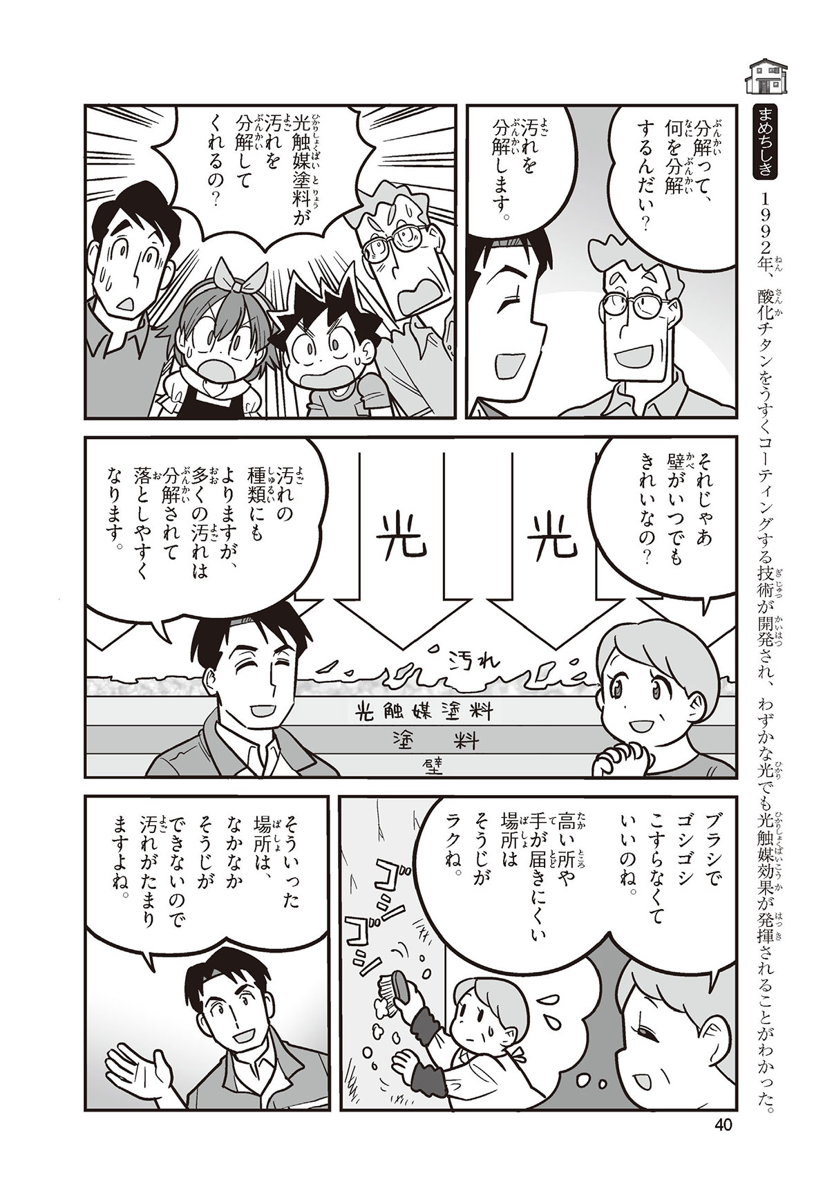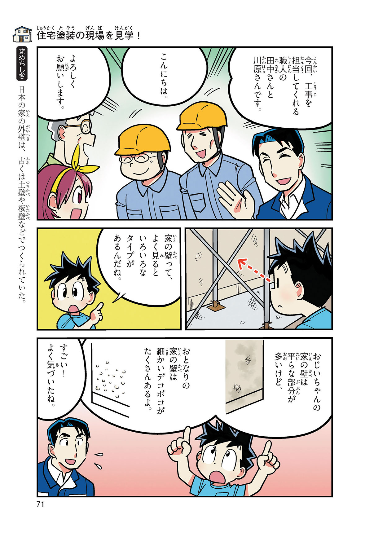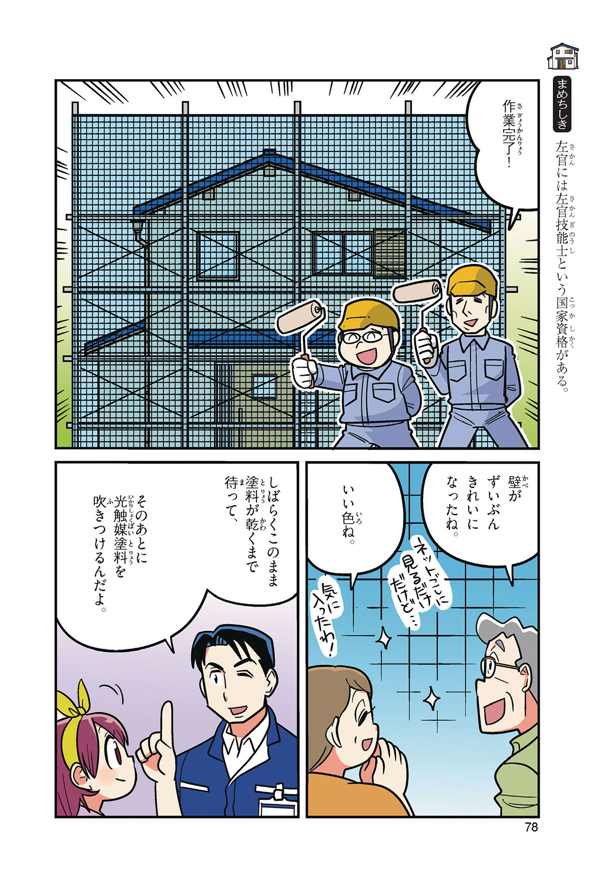 「光触媒」って知っているかな?太陽の光が当たると化学反応を助けてくれる物質で、汚れを落としたり、カビを防いだりする力があるんだ。住宅の外壁は、年数がたつと色があせたりいたんだりするけど、光触媒塗料を塗ると、外壁がきれいなまま長持ちするんだ。そのほかにも、ウイルスの活動をおさえたり、空気をきれいにしたりする力もあるんだ。この本を読めば、光触媒塗料や住宅塗装のことがよくわかるよ!