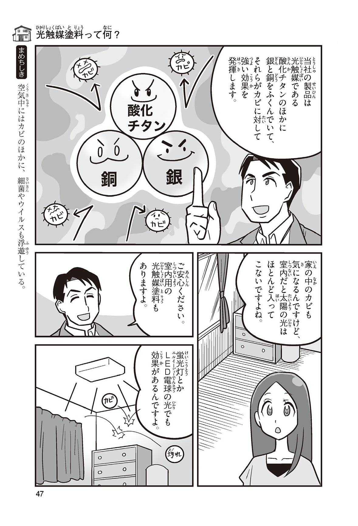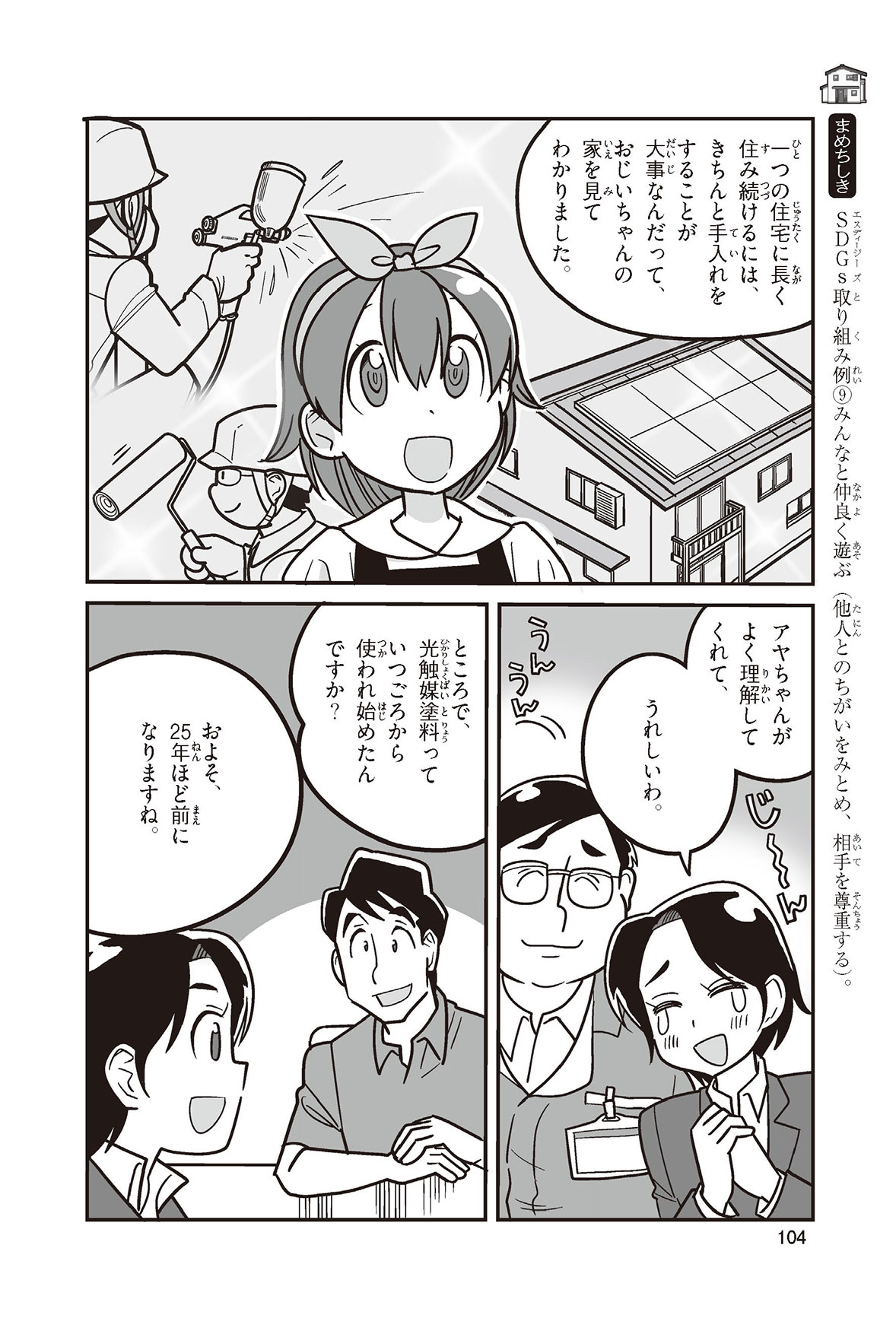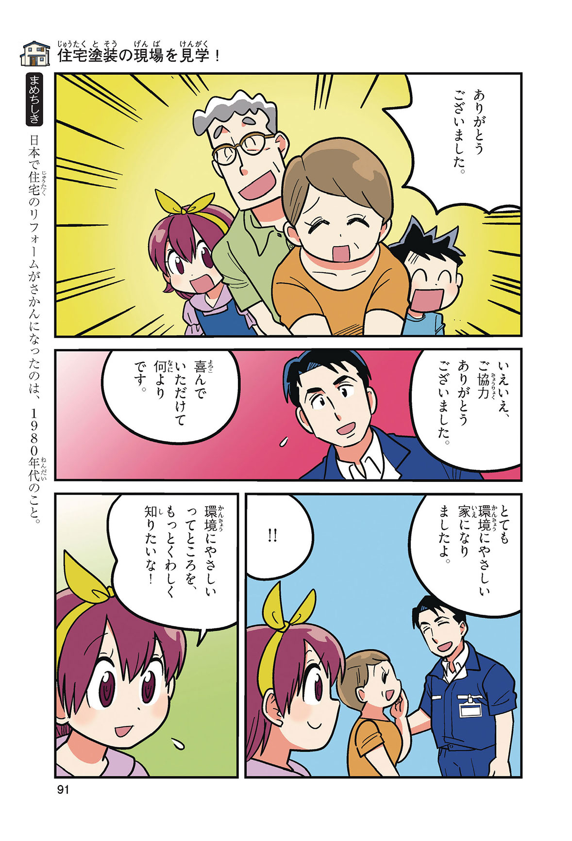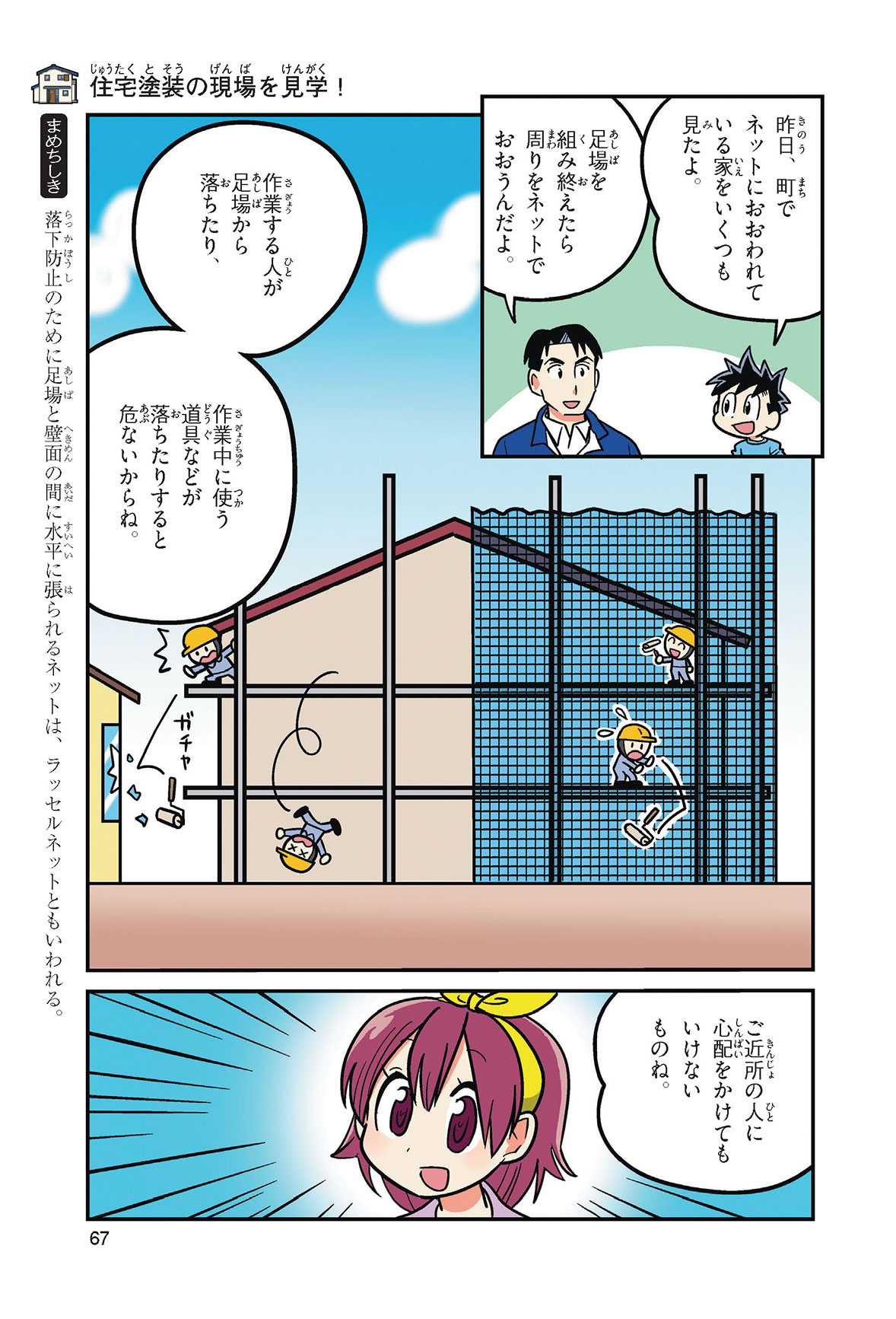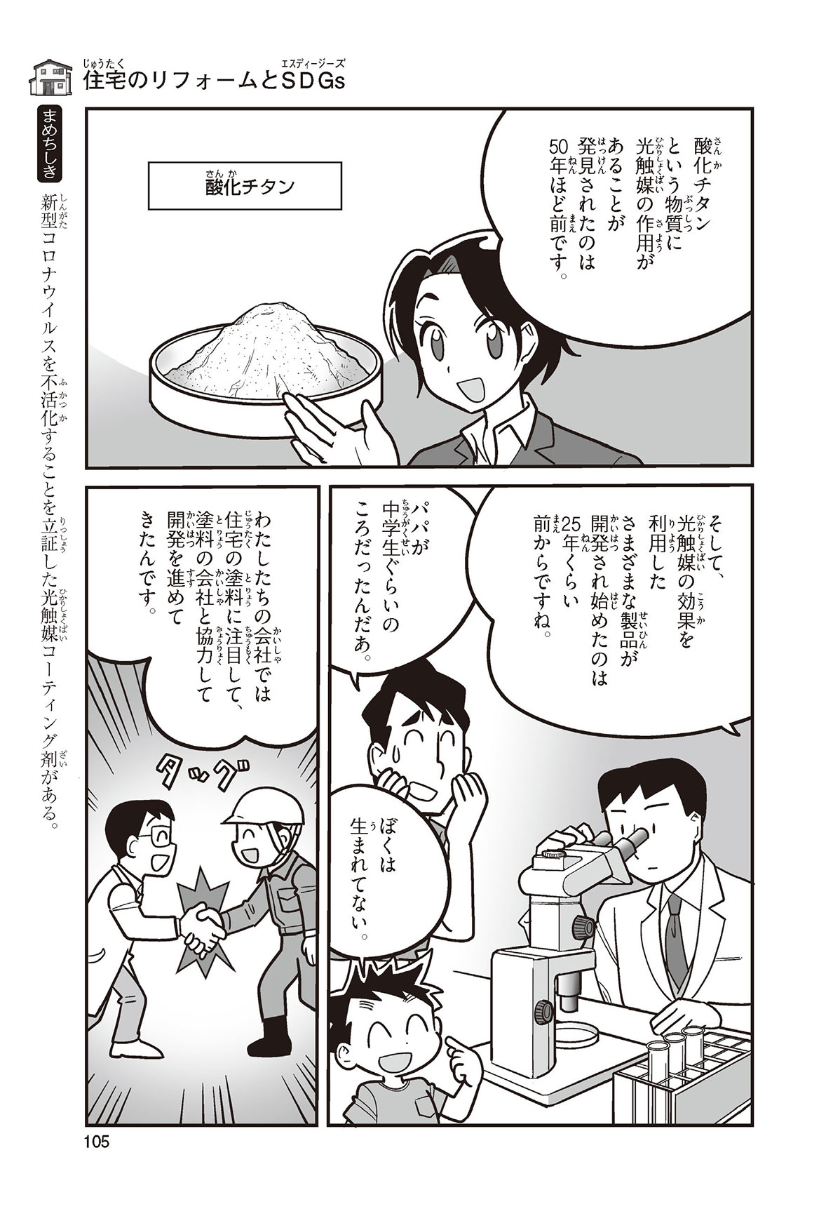 「光触媒」って知っているかな?太陽の光が当たると化学反応を助けてくれる物質で、汚れを落としたり、カビを防いだりする力があるんだ。住宅の外壁は、年数がたつと色があせたりいたんだりするけど、光触媒塗料を塗ると、外壁がきれいなまま長持ちするんだ。そのほかにも、ウイルスの活動をおさえたり、空気をきれいにしたりする力もあるんだ。この本を読めば、光触媒塗料や住宅塗装のことがよくわかるよ!
