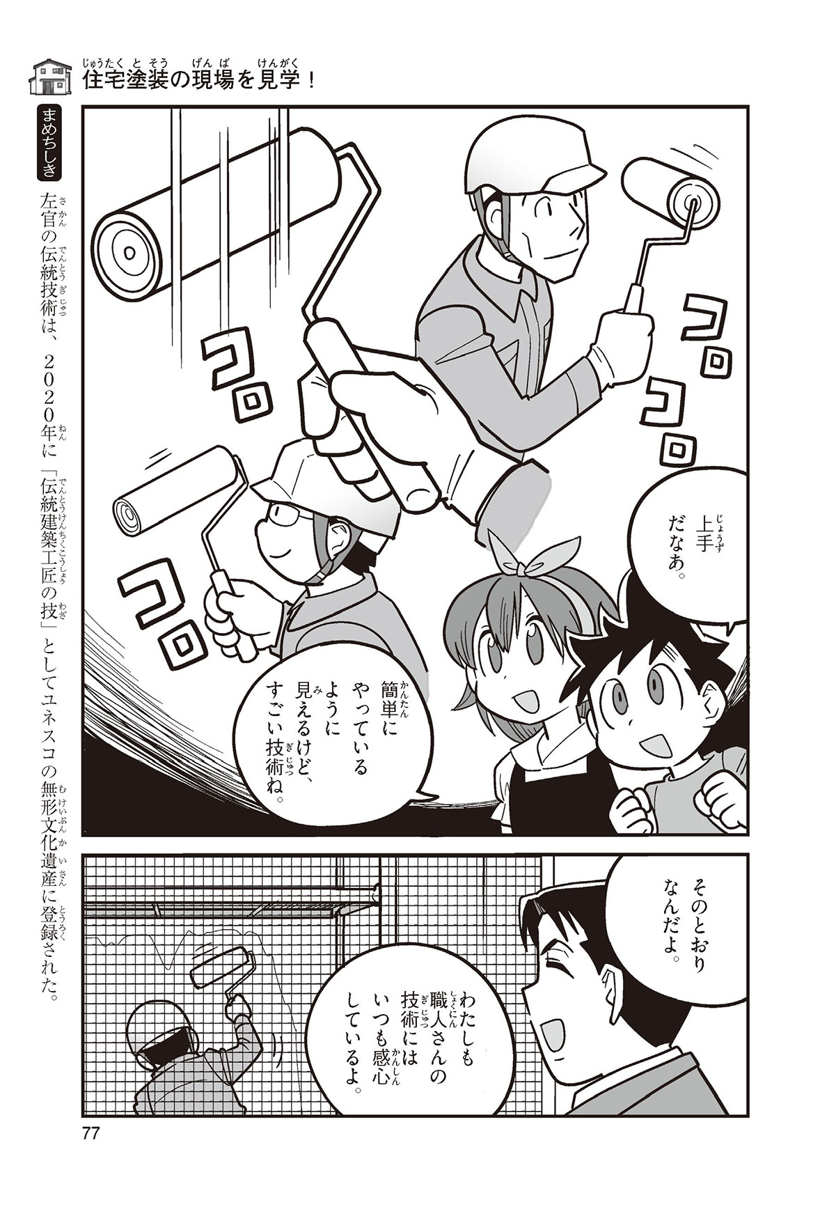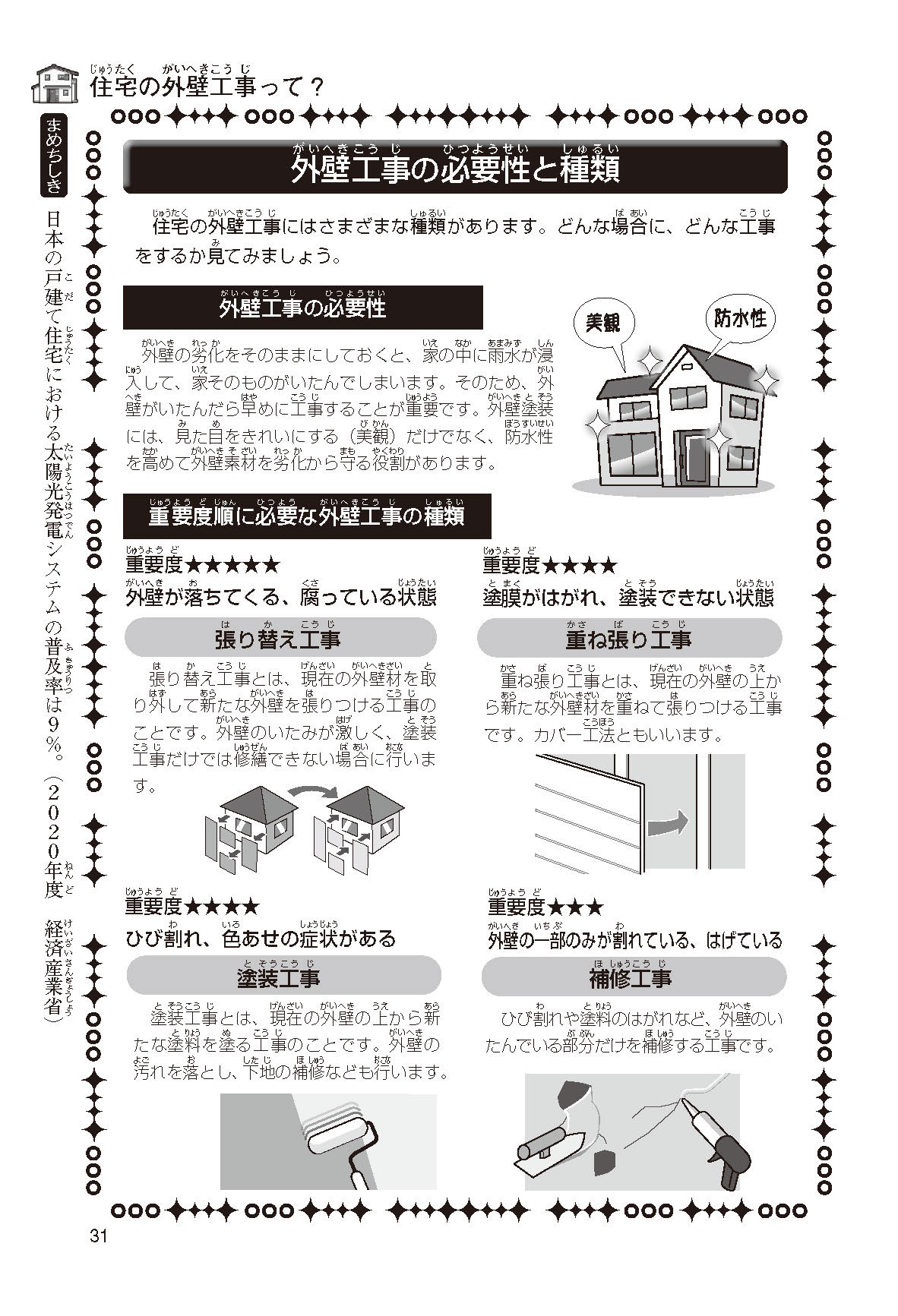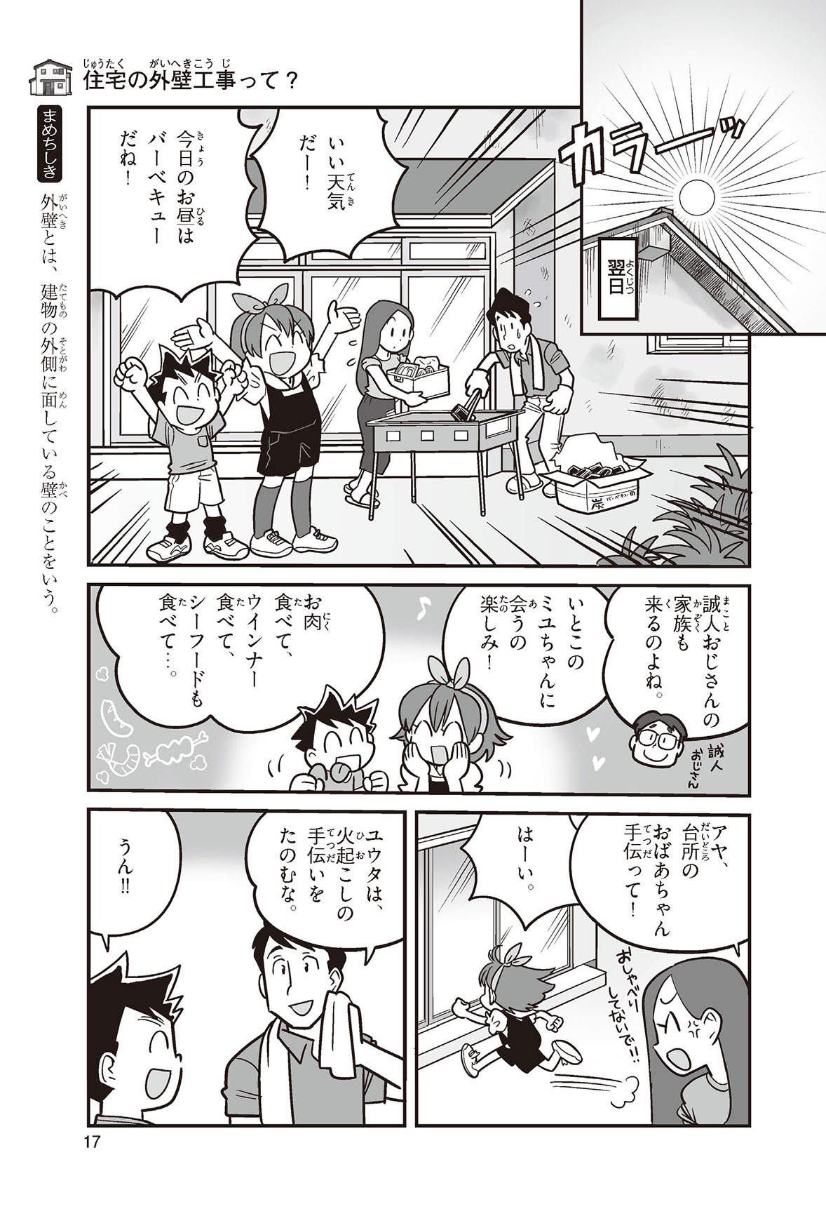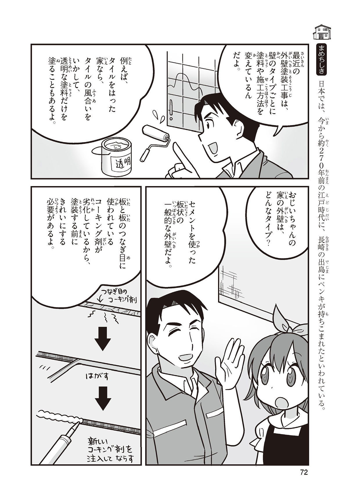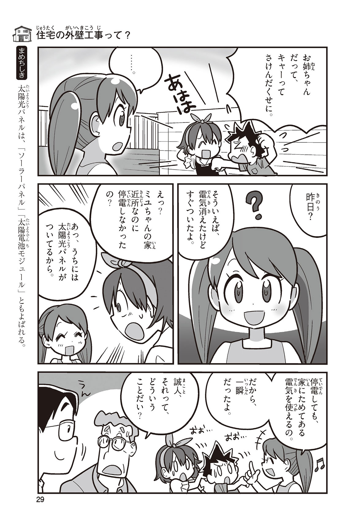 「光触媒」って知っているかな?太陽の光が当たると化学反応を助けてくれる物質で、汚れを落としたり、カビを防いだりする力があるんだ。住宅の外壁は、年数がたつと色があせたりいたんだりするけど、光触媒塗料を塗ると、外壁がきれいなまま長持ちするんだ。そのほかにも、ウイルスの活動をおさえたり、空気をきれいにしたりする力もあるんだ。この本を読めば、光触媒塗料や住宅塗装のことがよくわかるよ!