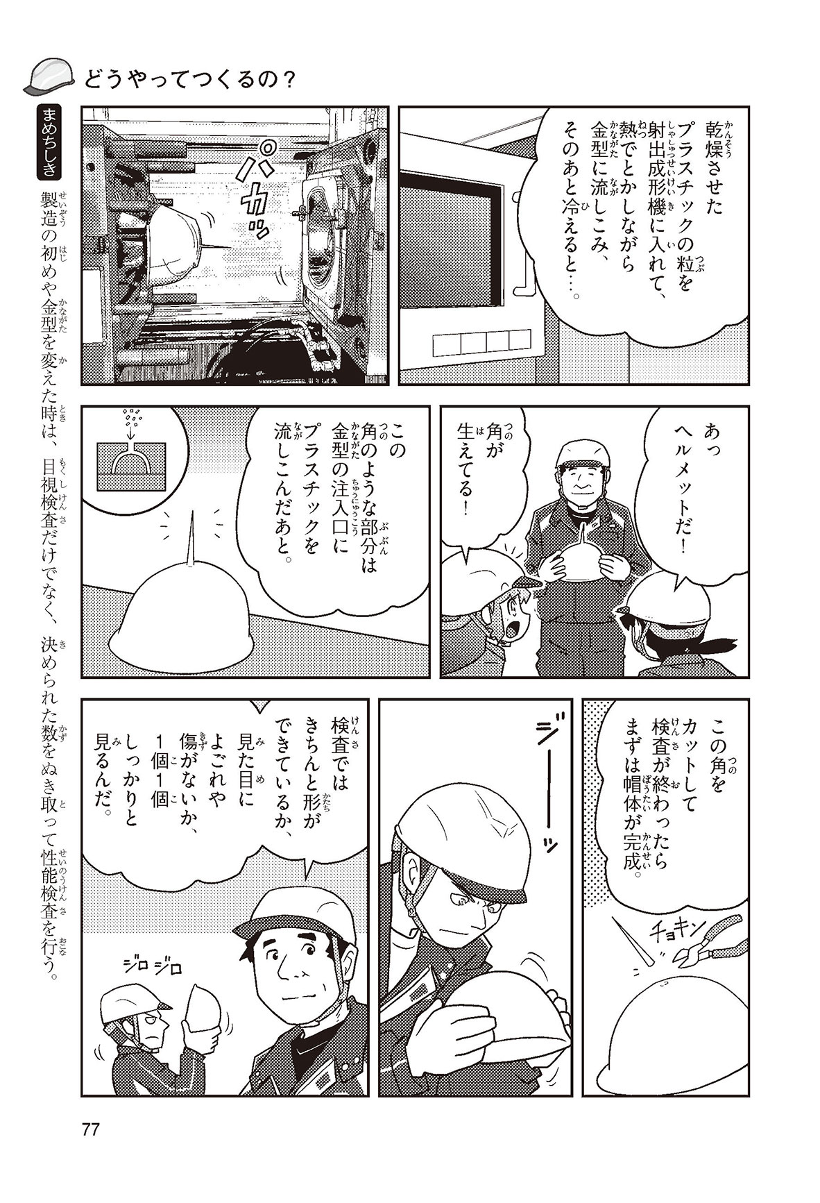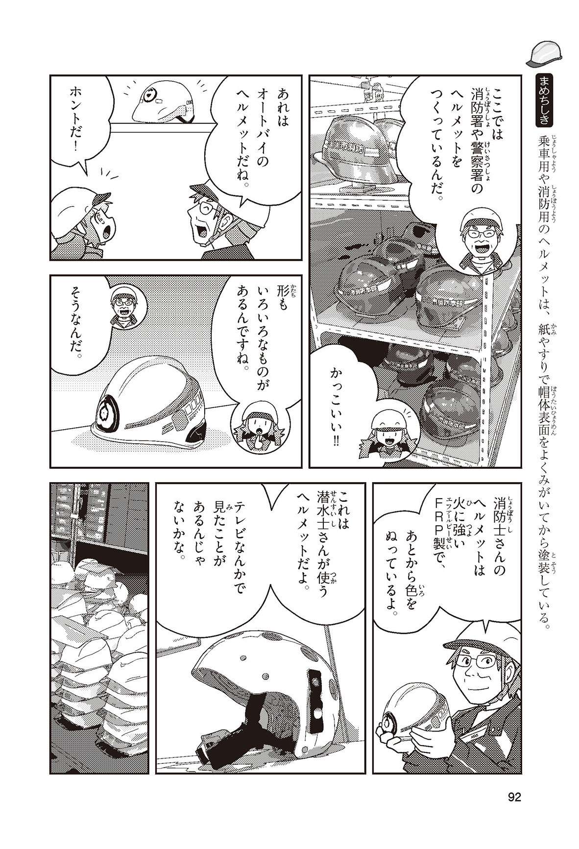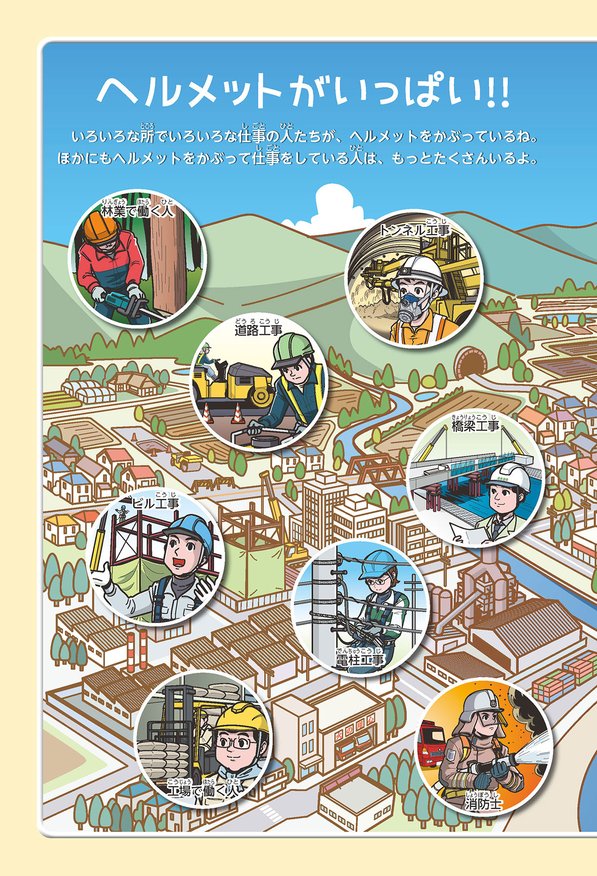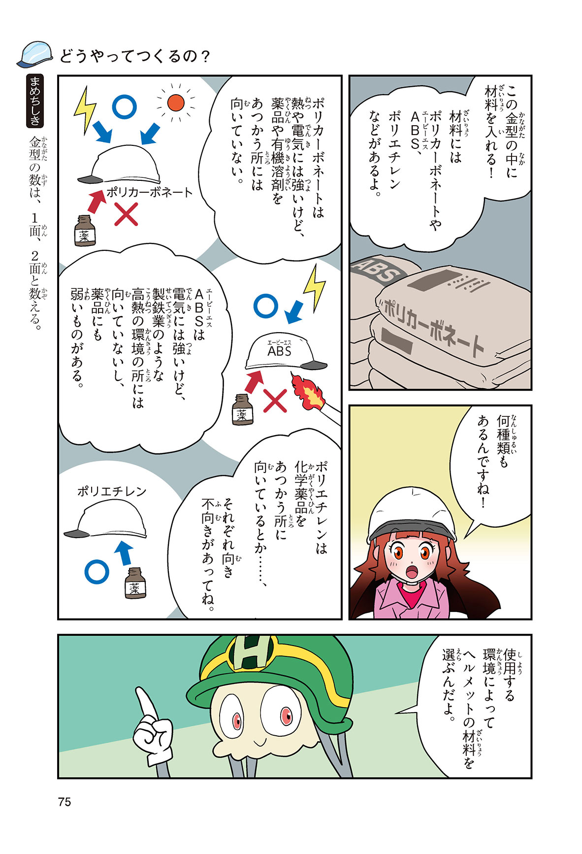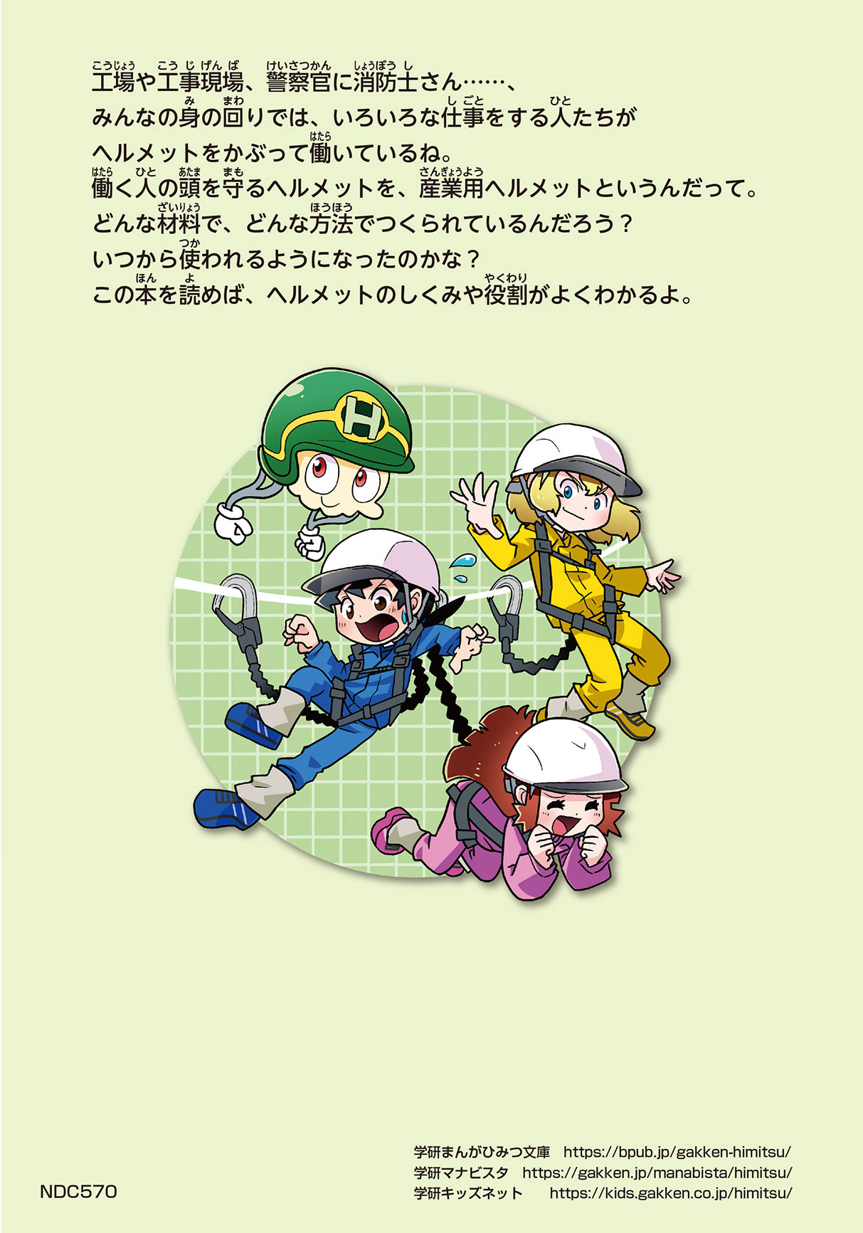 工場や工事現場、警察官に消防士さん……、みんなの身の回りでは、いろいろな仕事をする人たちがヘルメットをかぶって働いているね。働く人の頭を守るヘルメットを、産業用ヘルメットというんだって。どんな材料で、どんな方法でつくられているんだろう? いつから使われるようになったのかな? この本を読めば、ヘルメットのしくみや役割がよくわかるよ。