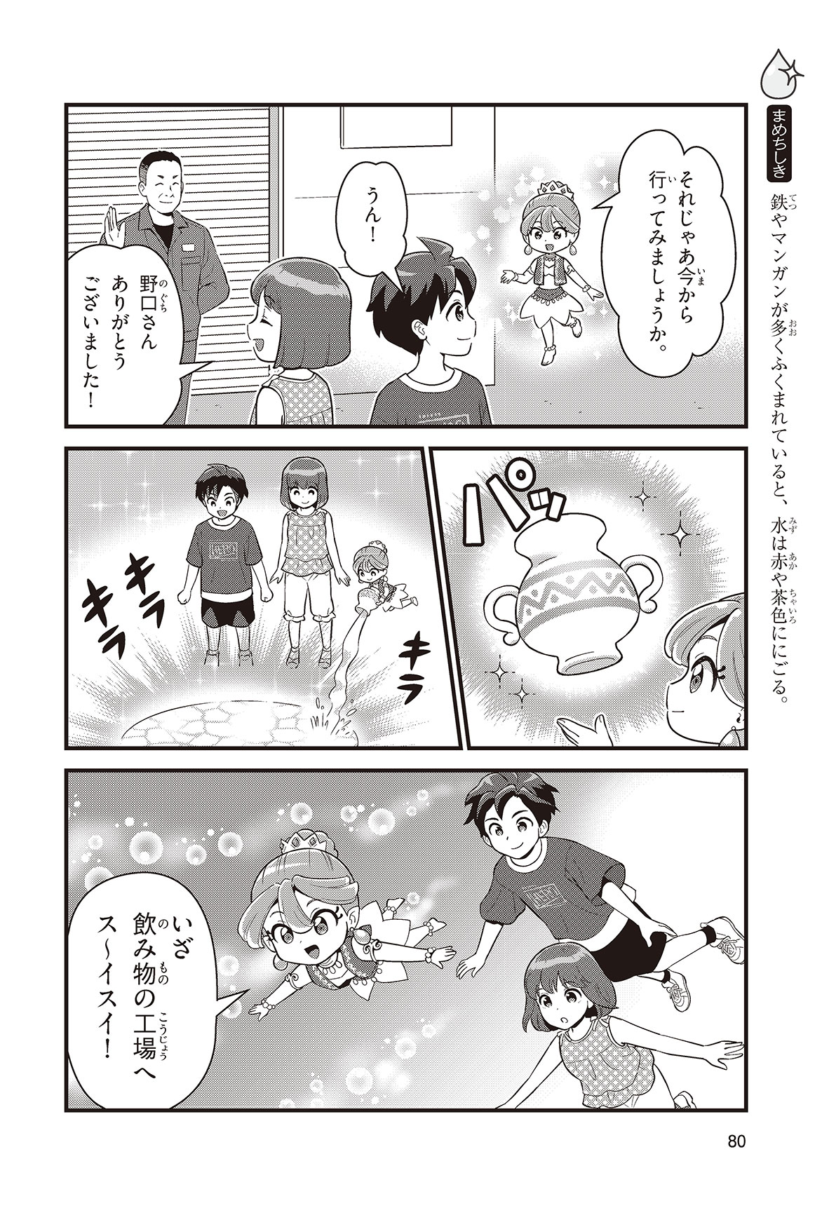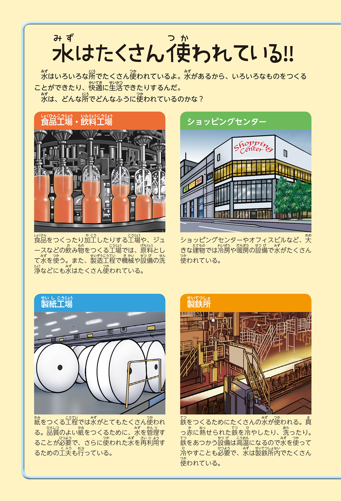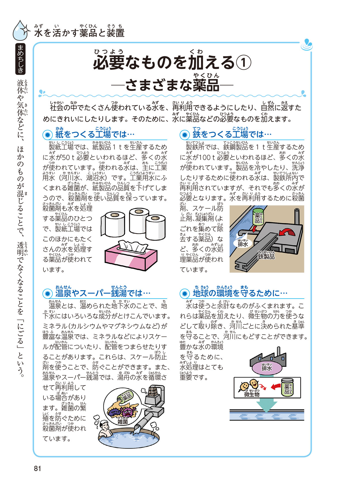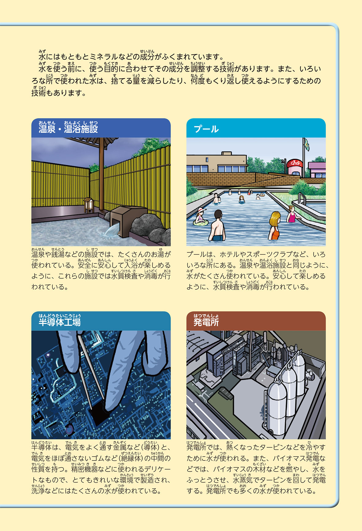 毎日の生活の中で、水はいろいろな所で使われているよ。生活以外でも、水はたくさん使われているんだ。飲むための水、ものをつくるための水、お風呂の水など、水は見た目が同じでも、ふくまれている成分にちがいがあるんだ。