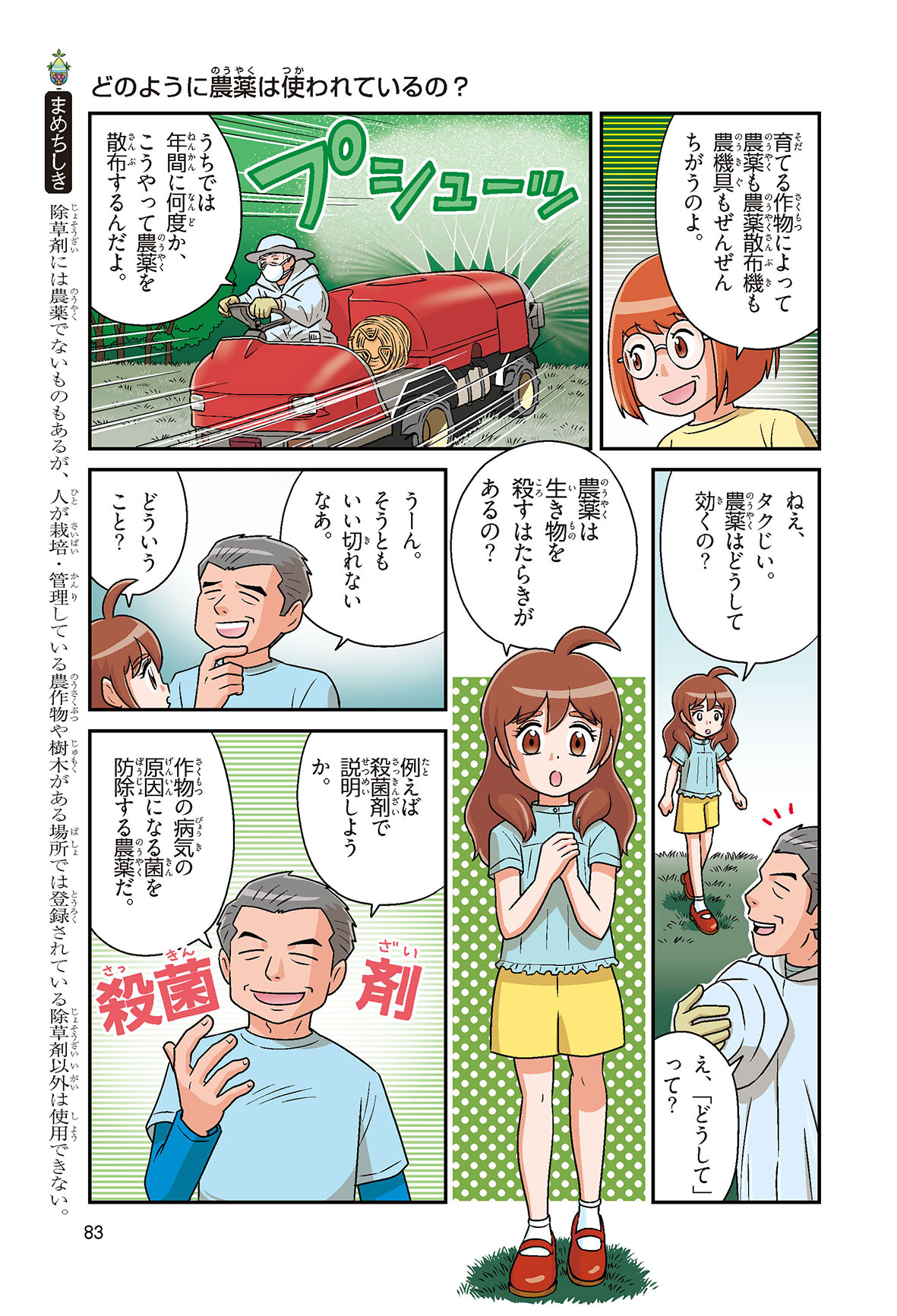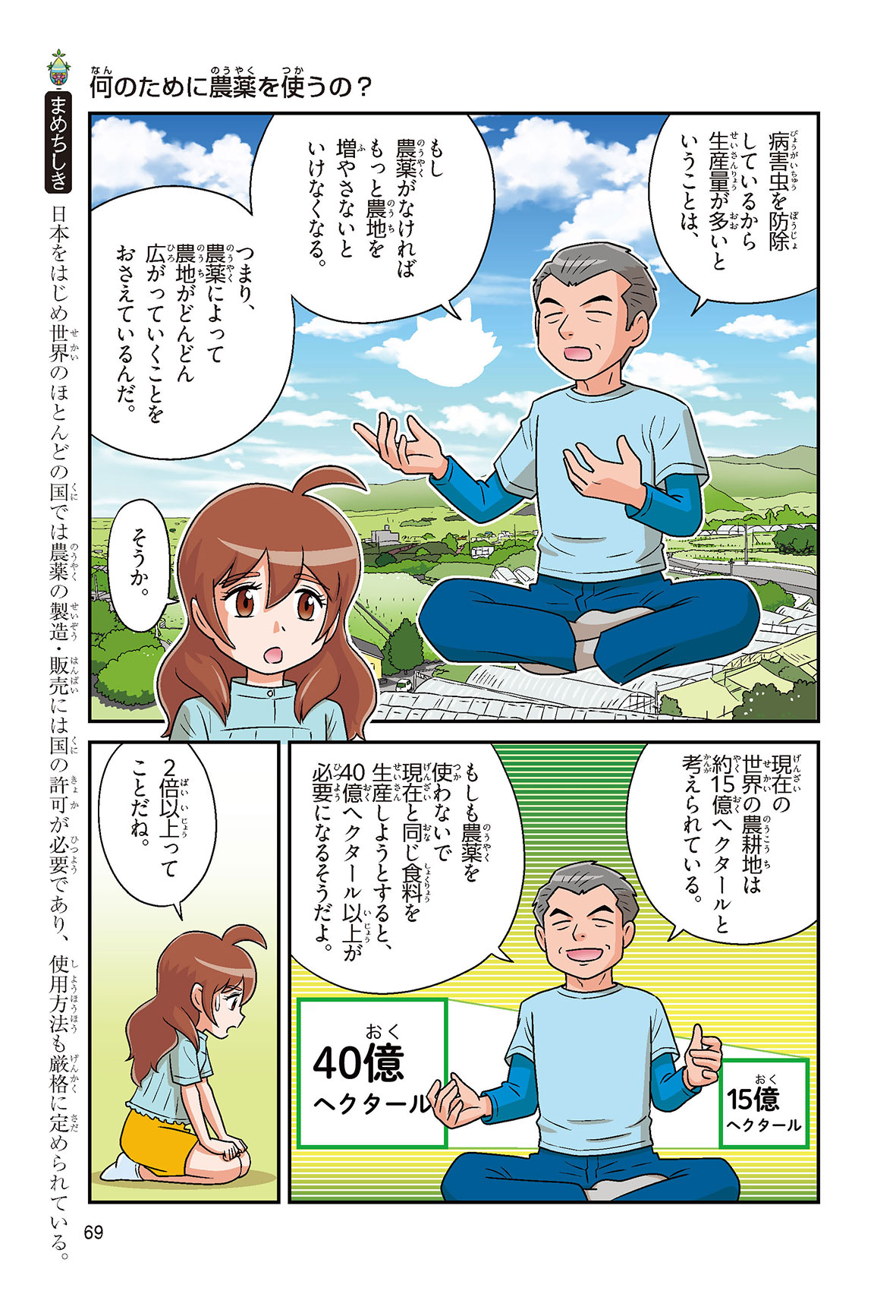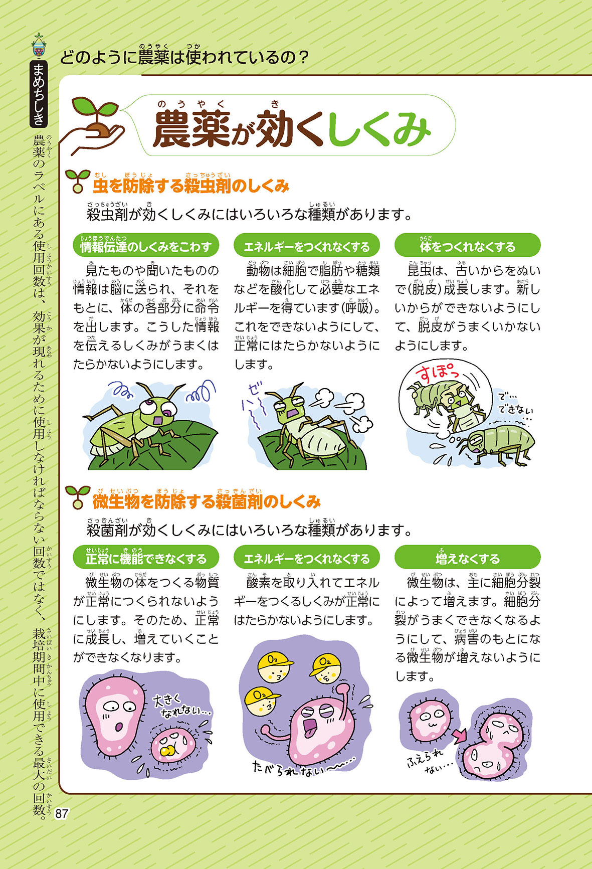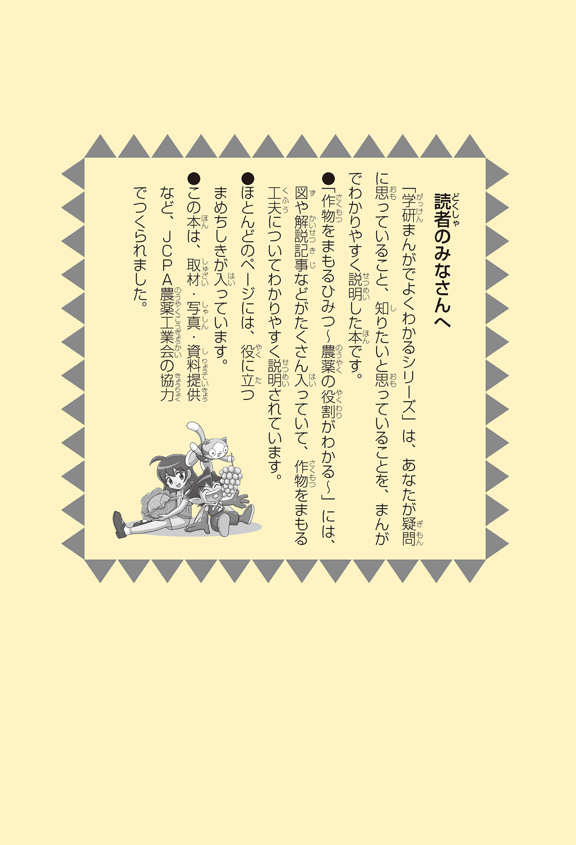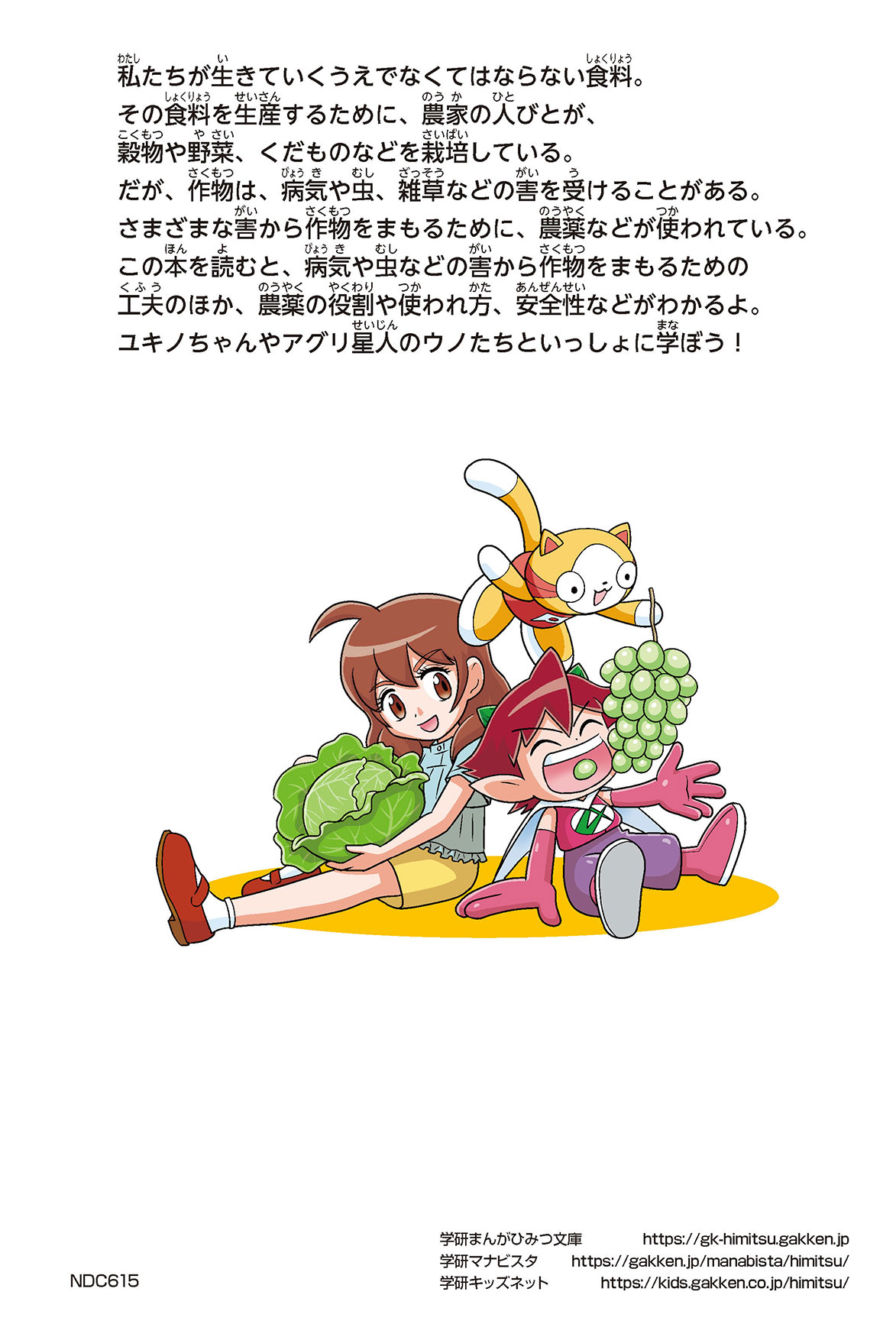 みんなの食料を生産するために、農家の人びとが、穀物や野菜、くだものなどを栽培している。だけど、作物は、病気や虫、雑草などの害を受けることがある。この本を読むと、病気や虫などの害から作物をまもるための工夫や、農薬の役割や使われ方、安全性などがわかるよ。