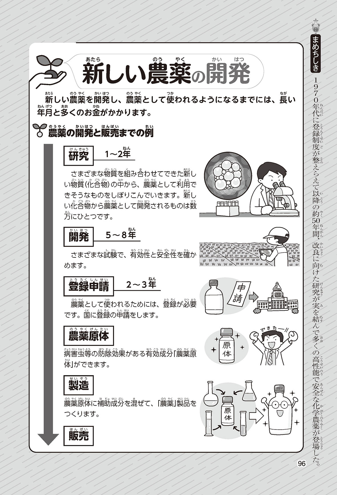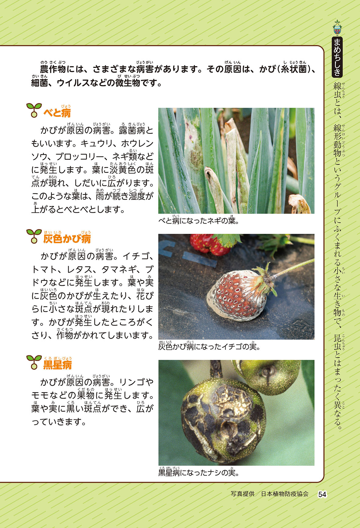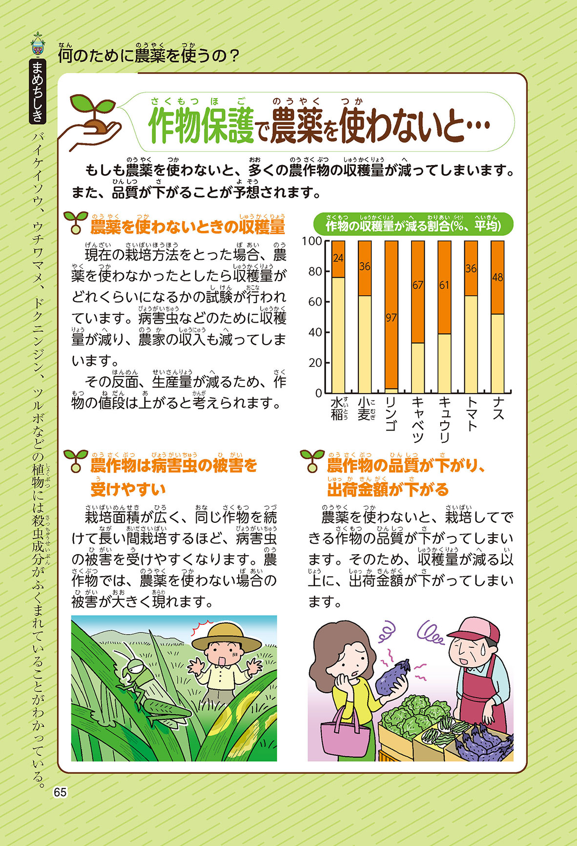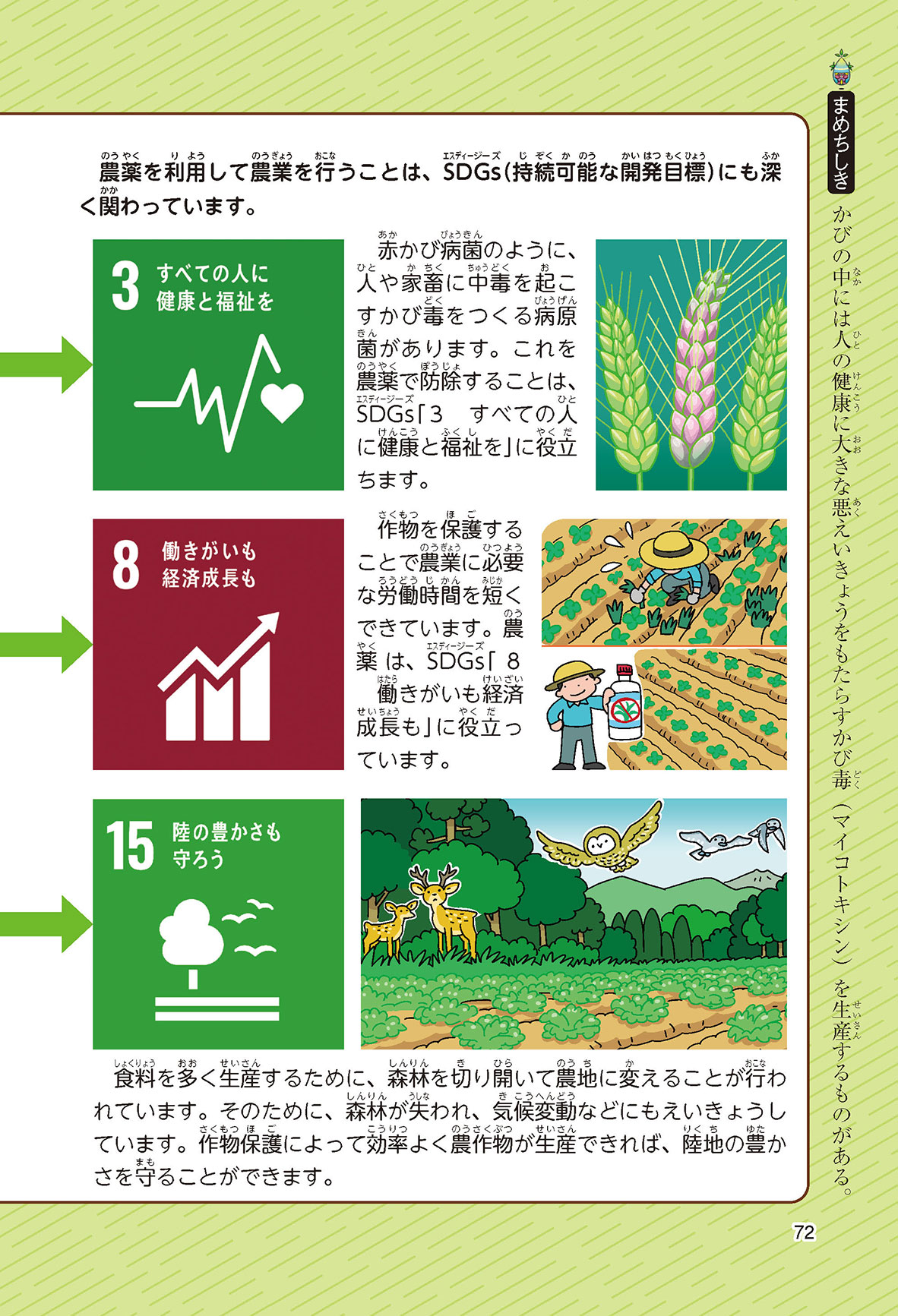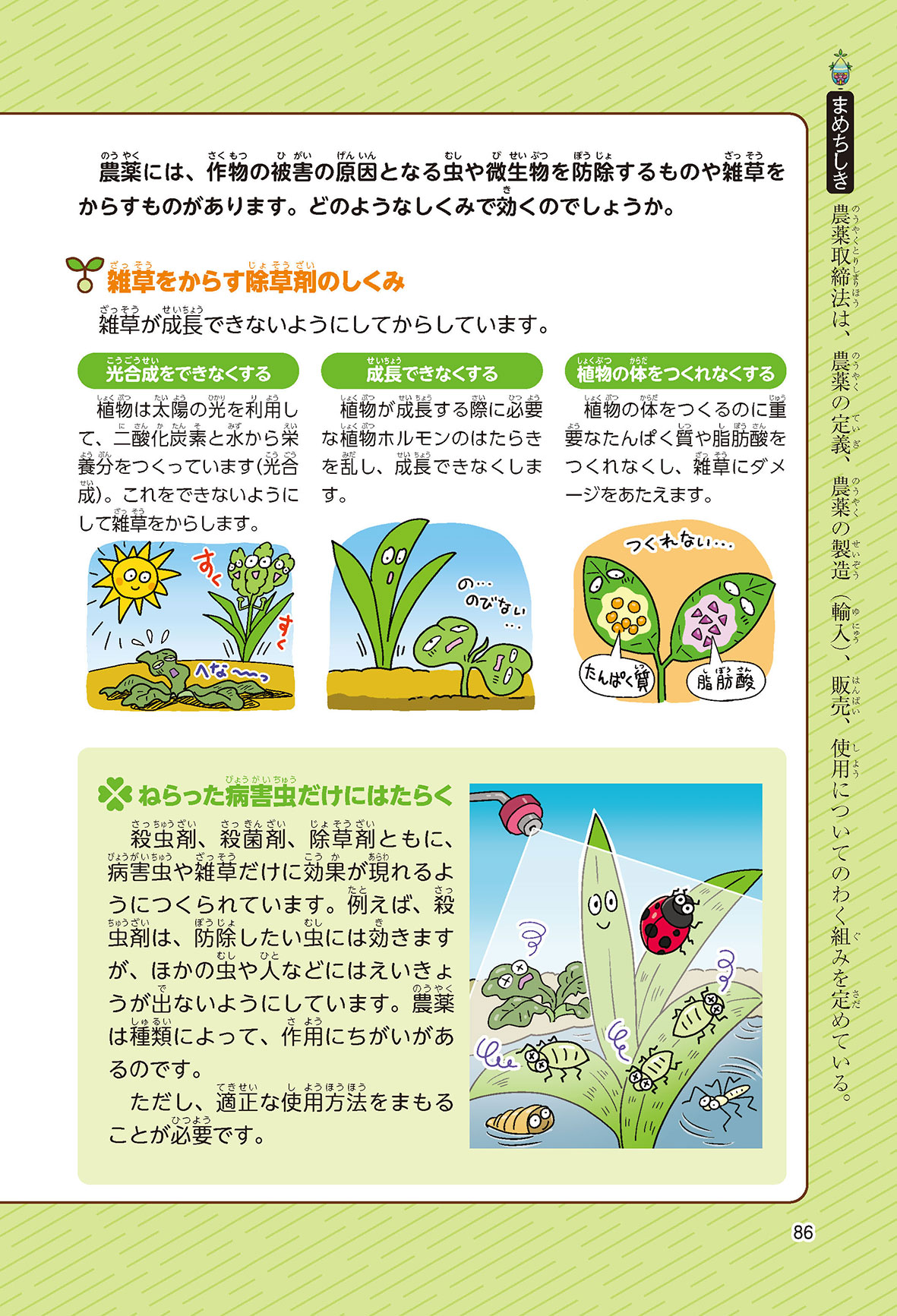 みんなの食料を生産するために、農家の人びとが、穀物や野菜、くだものなどを栽培している。だけど、作物は、病気や虫、雑草などの害を受けることがある。この本を読むと、病気や虫などの害から作物をまもるための工夫や、農薬の役割や使われ方、安全性などがわかるよ。