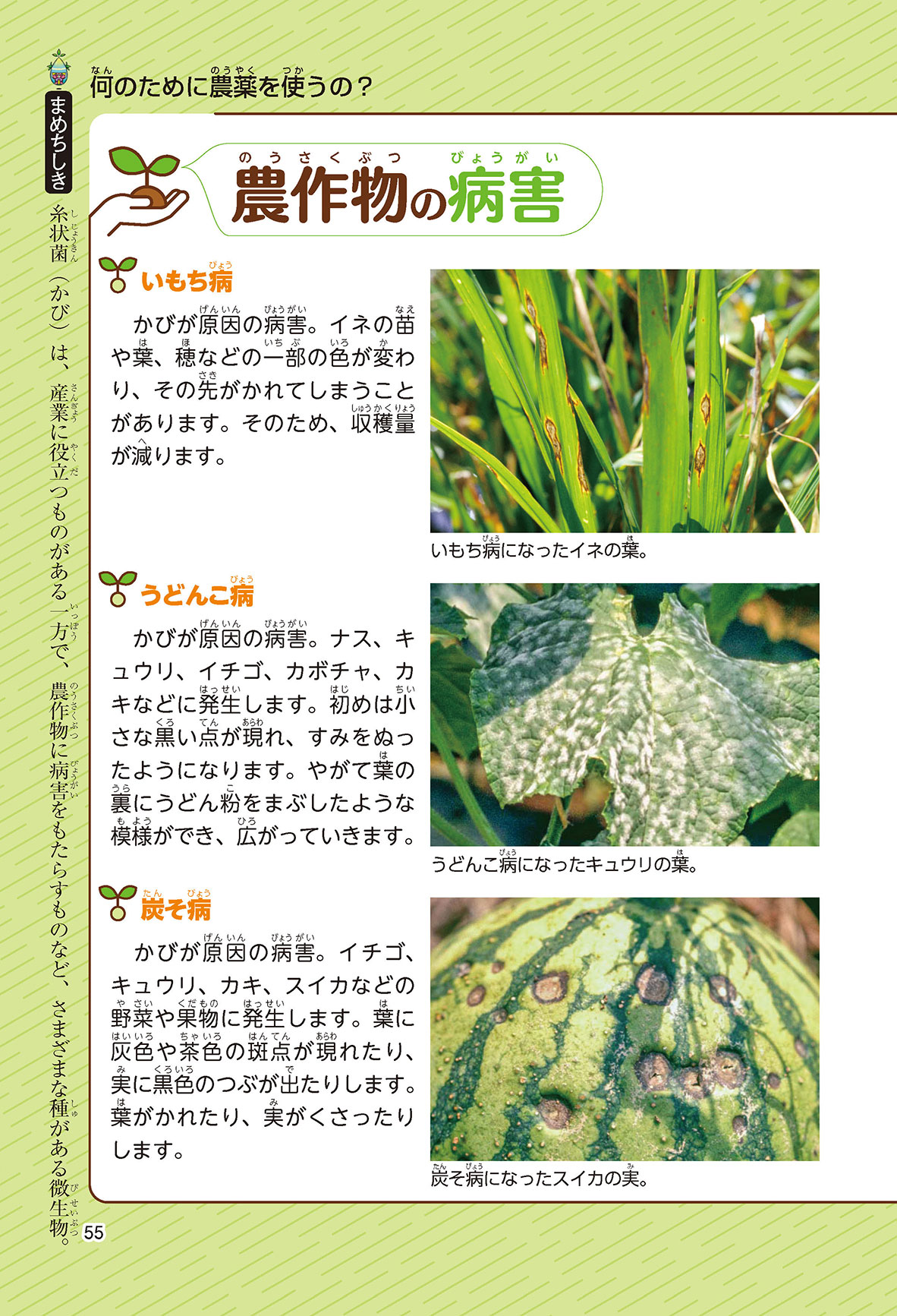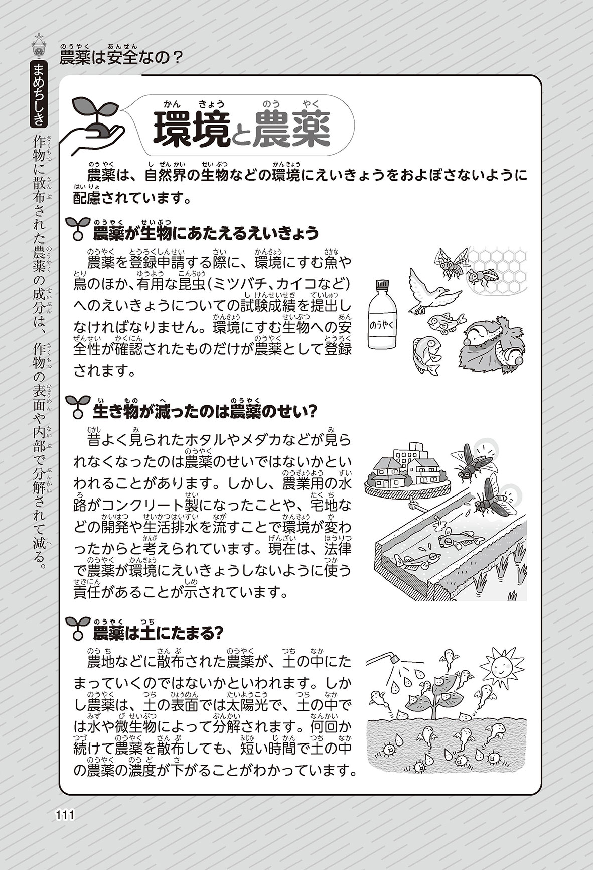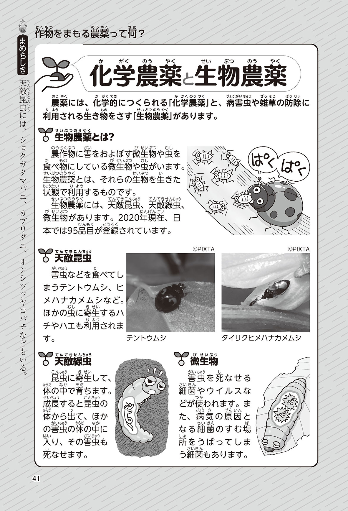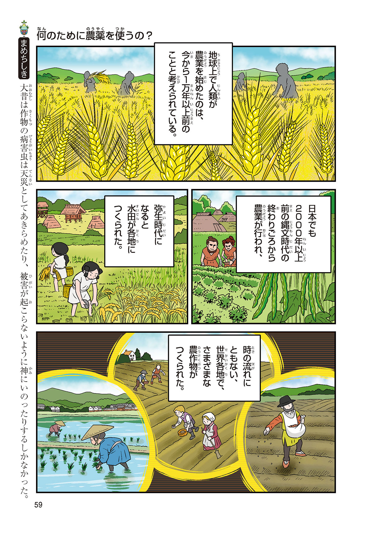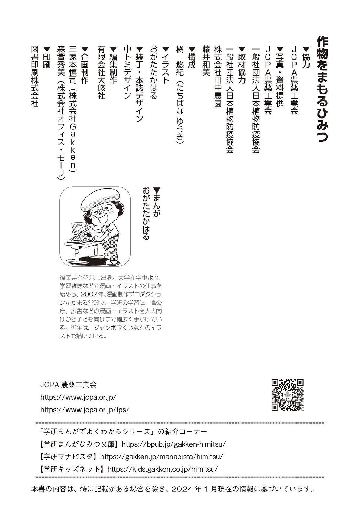 みんなの食料を生産するために、農家の人びとが、穀物や野菜、くだものなどを栽培している。だけど、作物は、病気や虫、雑草などの害を受けることがある。この本を読むと、病気や虫などの害から作物をまもるための工夫や、農薬の役割や使われ方、安全性などがわかるよ。