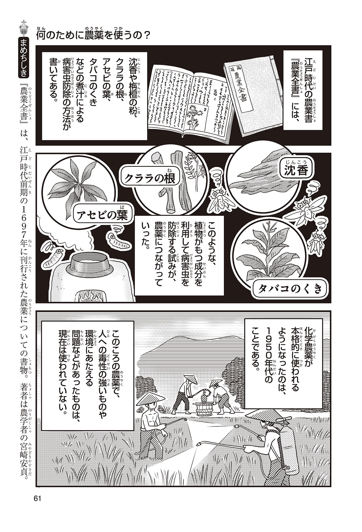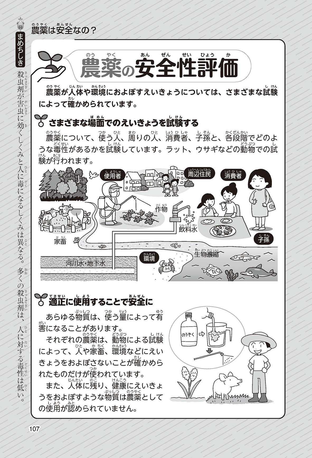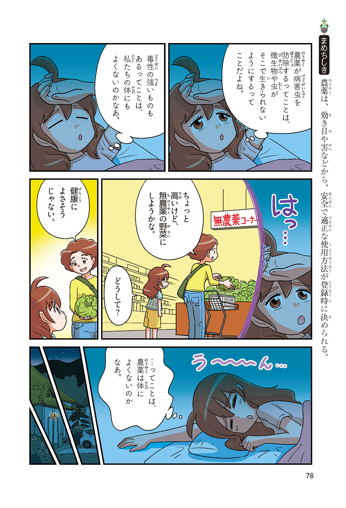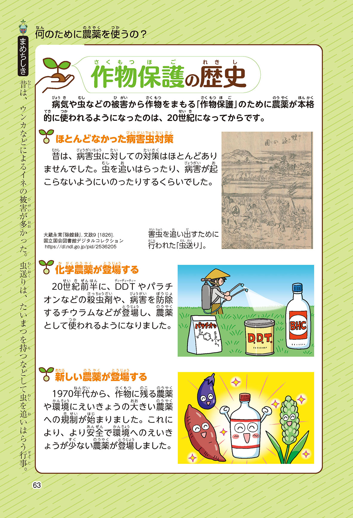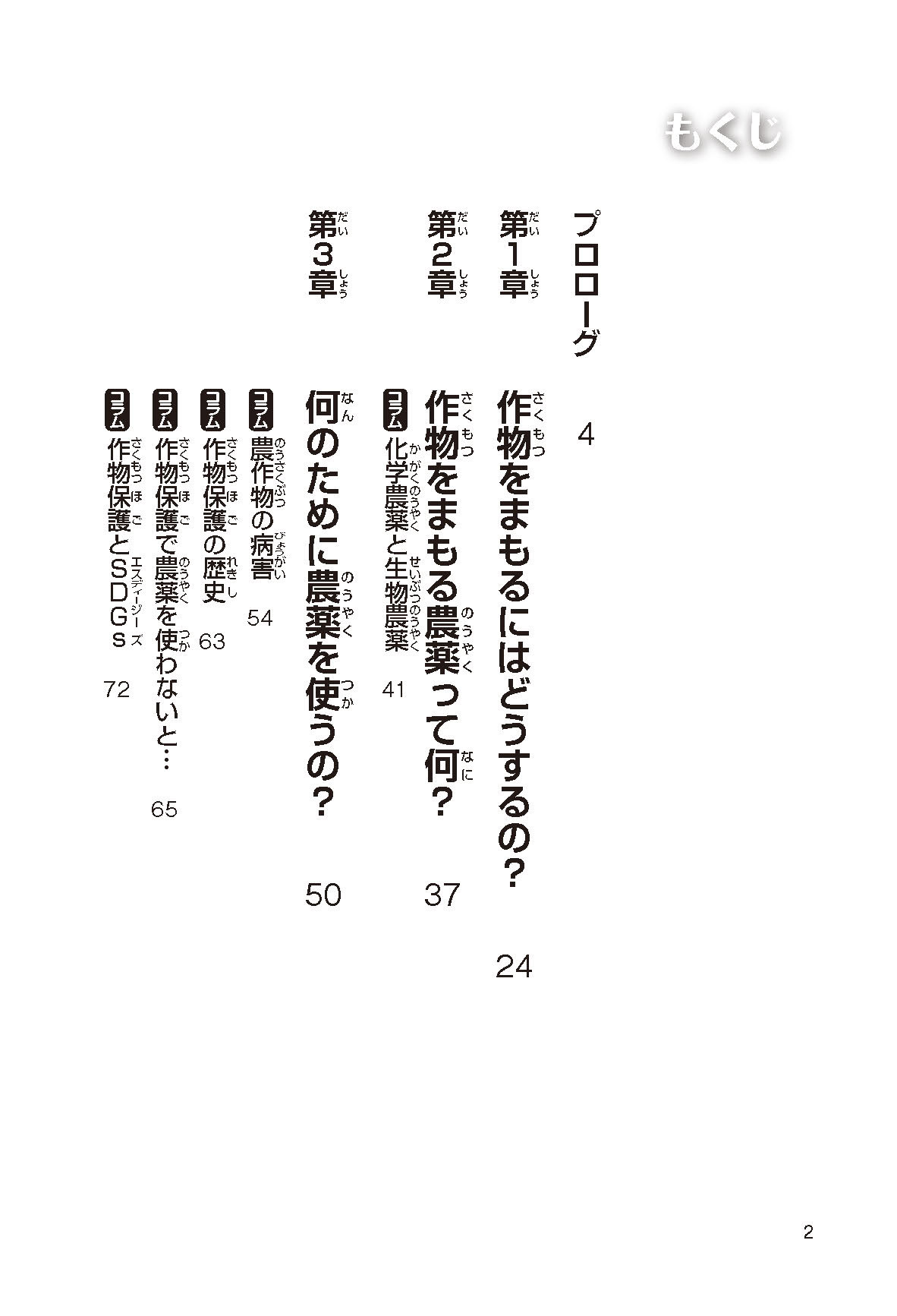 みんなの食料を生産するために、農家の人びとが、穀物や野菜、くだものなどを栽培している。だけど、作物は、病気や虫、雑草などの害を受けることがある。この本を読むと、病気や虫などの害から作物をまもるための工夫や、農薬の役割や使われ方、安全性などがわかるよ。