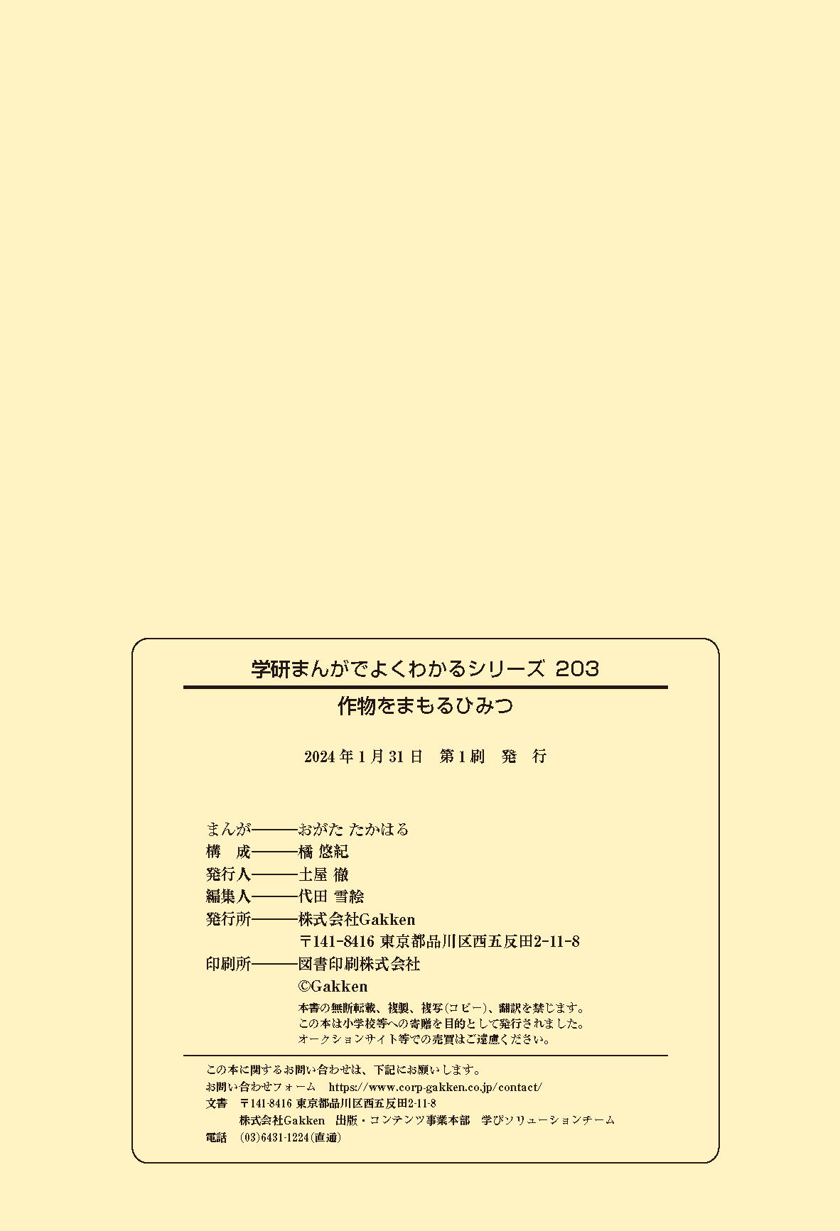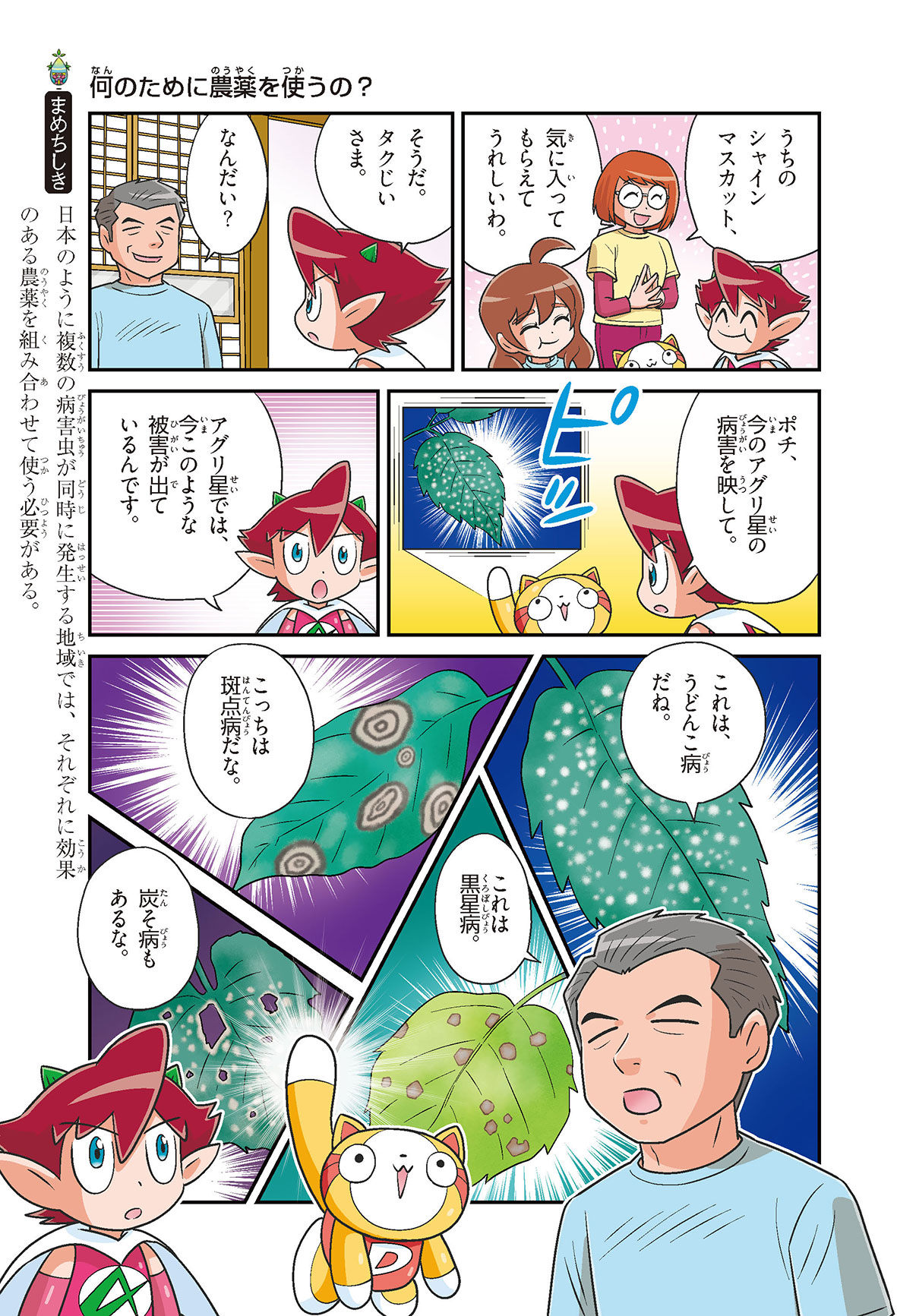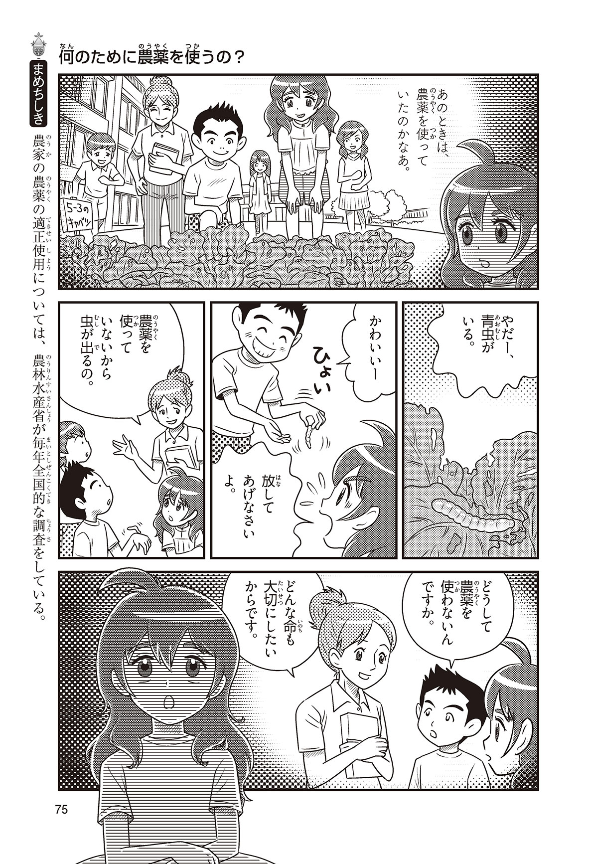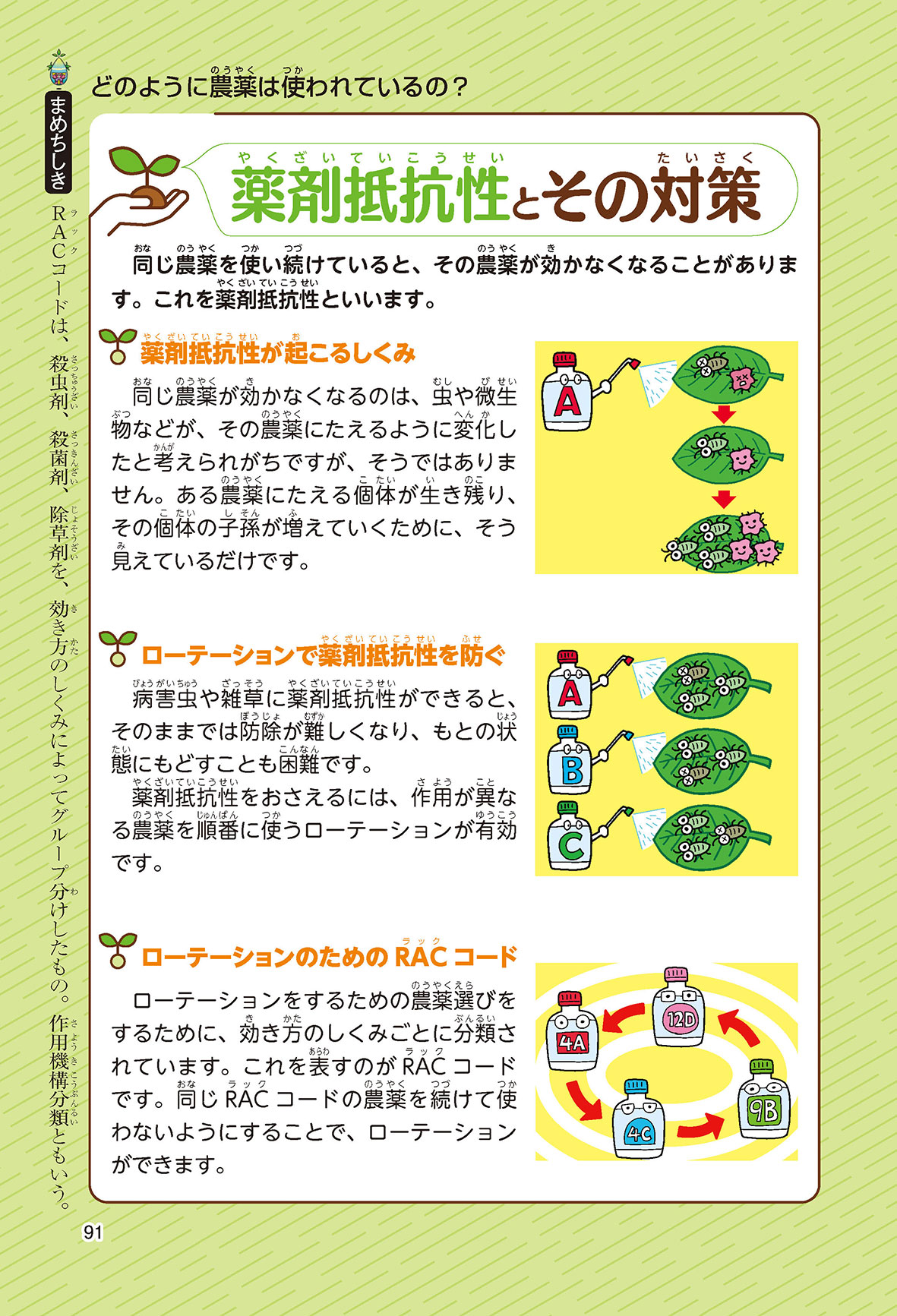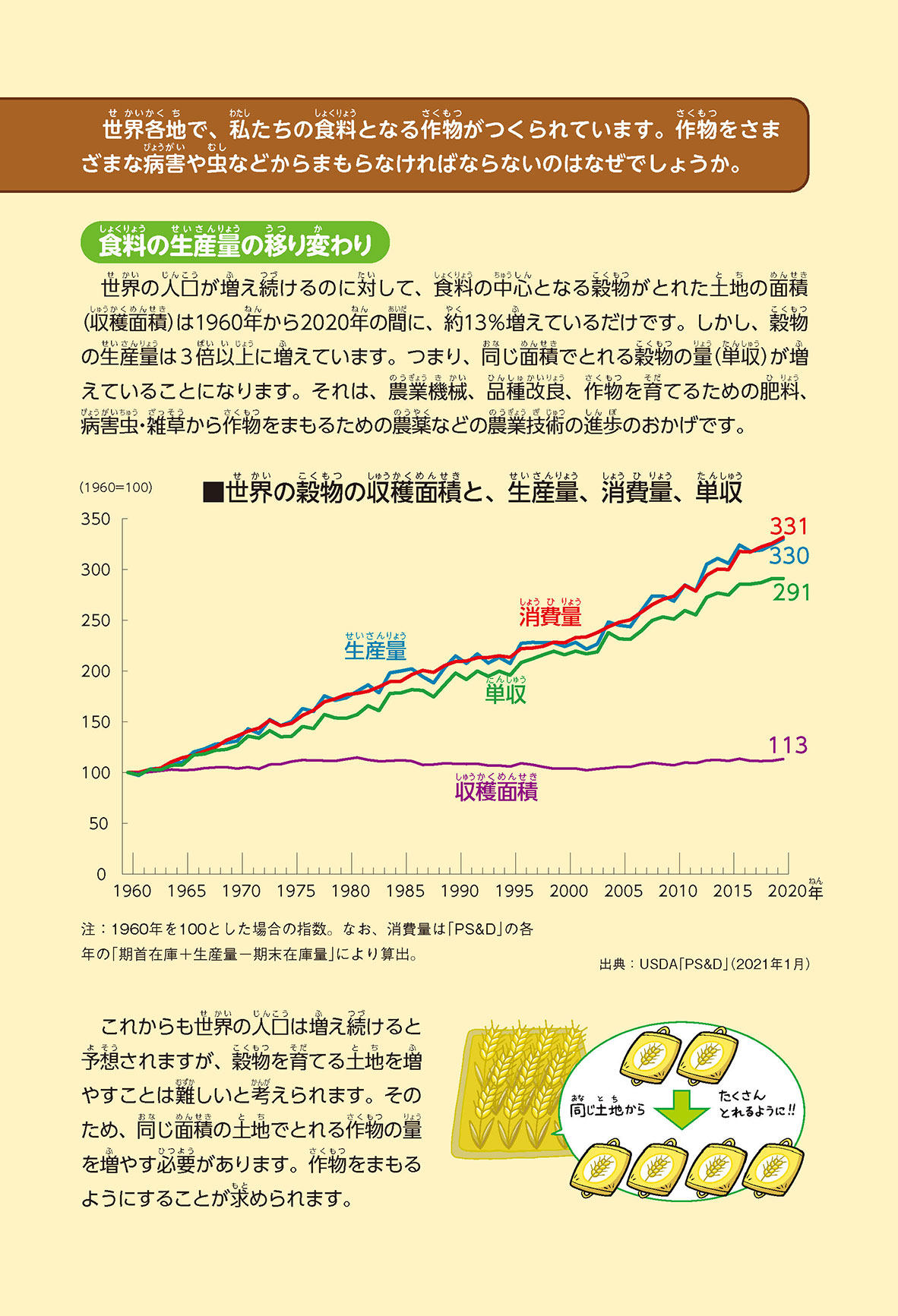 みんなの食料を生産するために、農家の人びとが、穀物や野菜、くだものなどを栽培している。だけど、作物は、病気や虫、雑草などの害を受けることがある。この本を読むと、病気や虫などの害から作物をまもるための工夫や、農薬の役割や使われ方、安全性などがわかるよ。