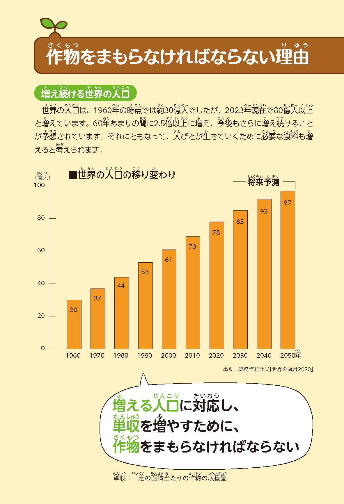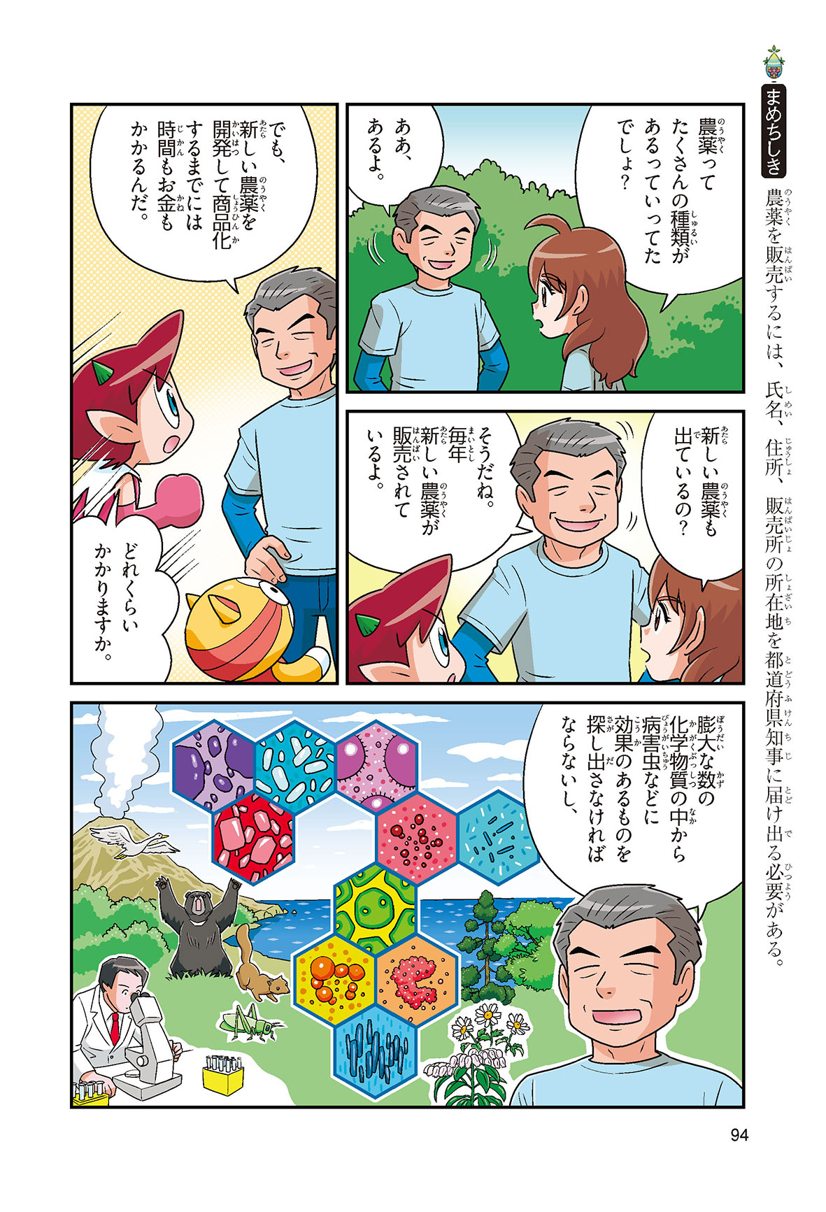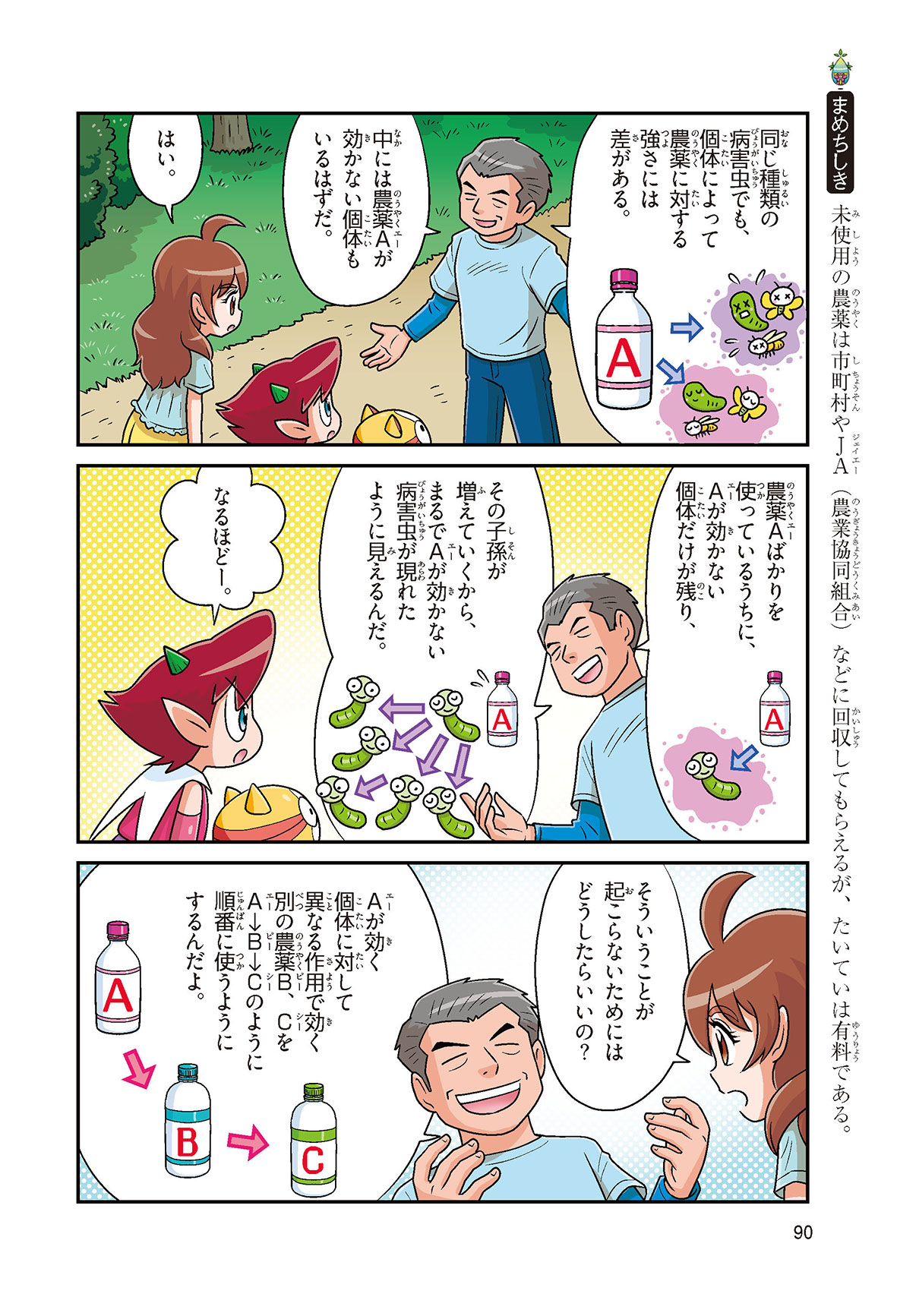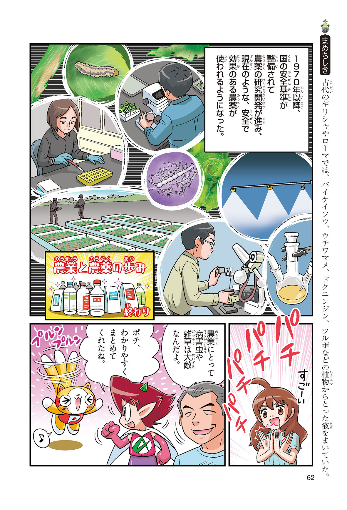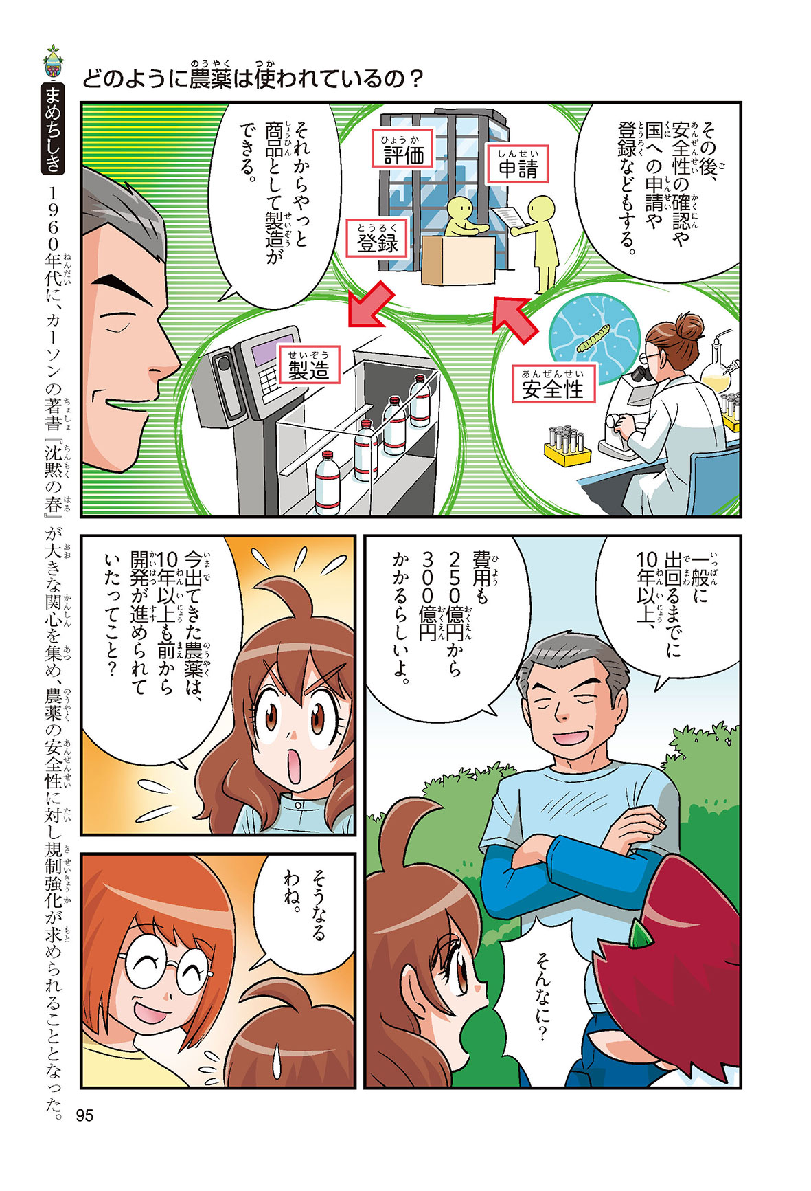 みんなの食料を生産するために、農家の人びとが、穀物や野菜、くだものなどを栽培している。だけど、作物は、病気や虫、雑草などの害を受けることがある。この本を読むと、病気や虫などの害から作物をまもるための工夫や、農薬の役割や使われ方、安全性などがわかるよ。