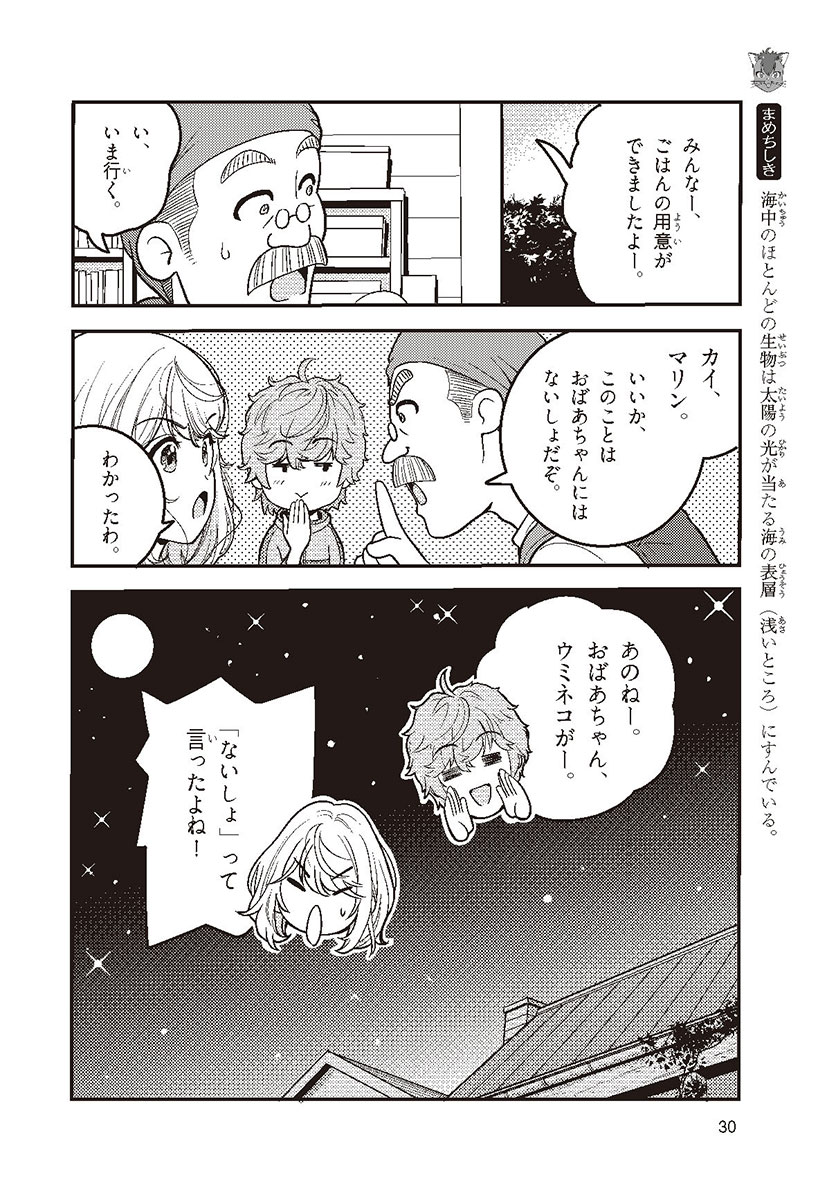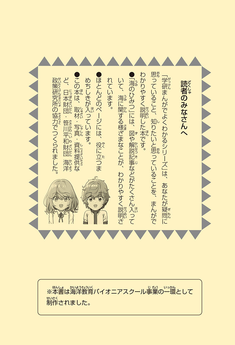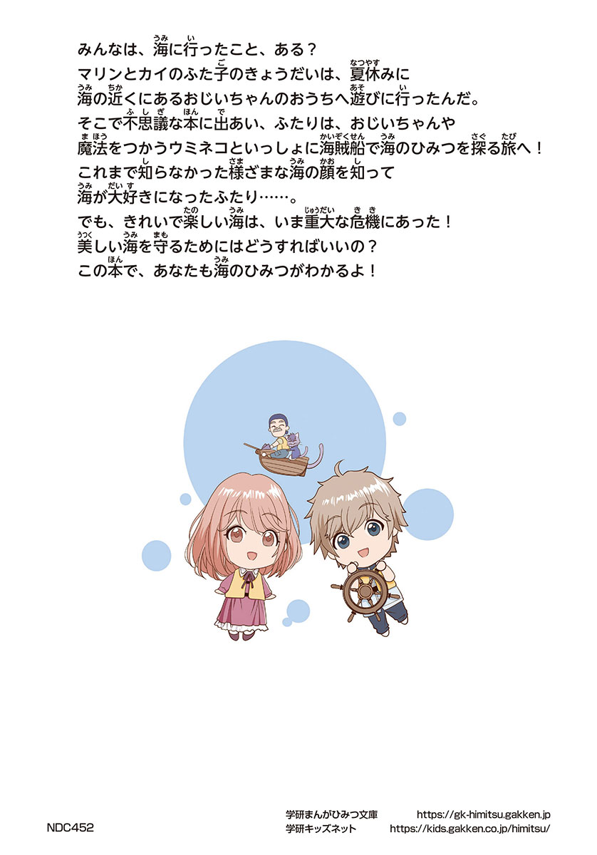 みんなは、海に行ったこと、ある? マリンとカイのふた子のきょうだいはおじいちゃんの家で不思議な本に出あい、魔法をつかうウミネコといっしょに海のひみつを探る旅へ出ることに! 海が大好きになったふたりだけど、海は、いま重大な危機にあった! 美しい海を守るためにはどうすればいいの? この本で、あなたも海のひみつがわかるよ!