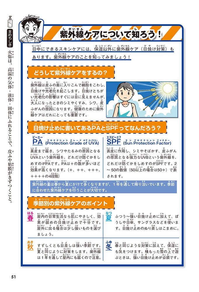 体をあらうときに気をつけたいことや、日焼け止めをぬる量についてなど、