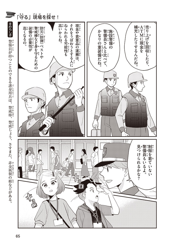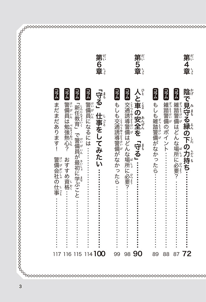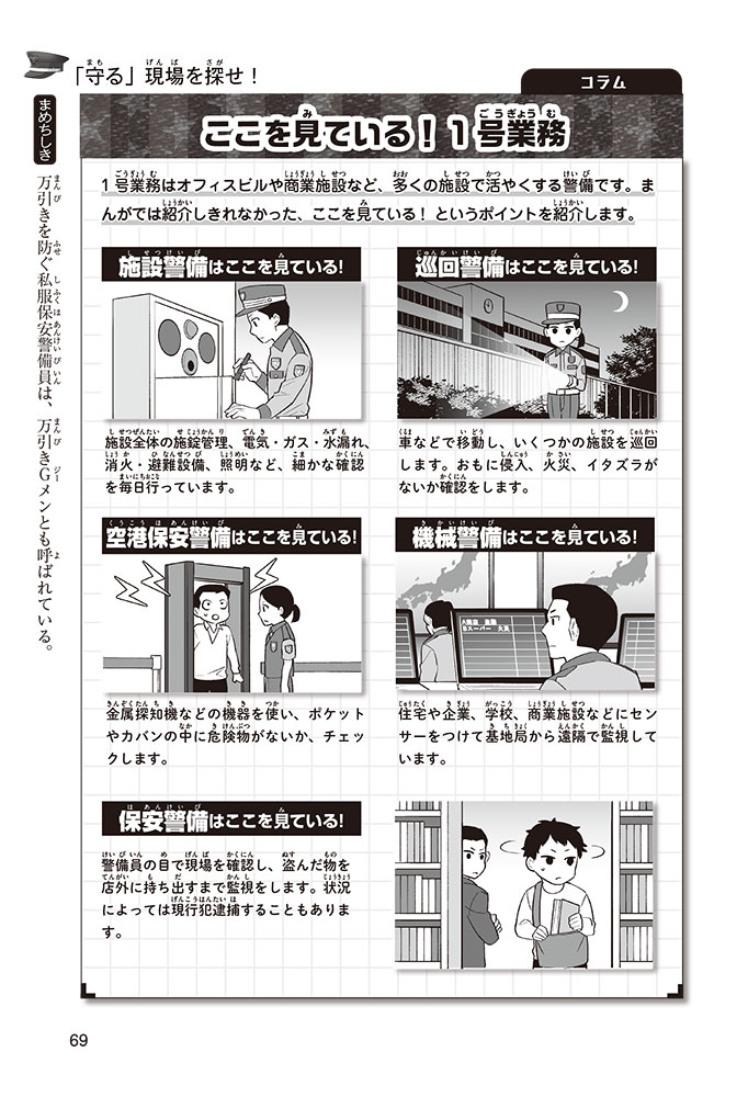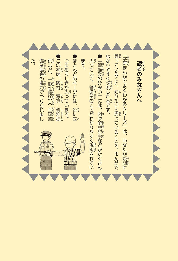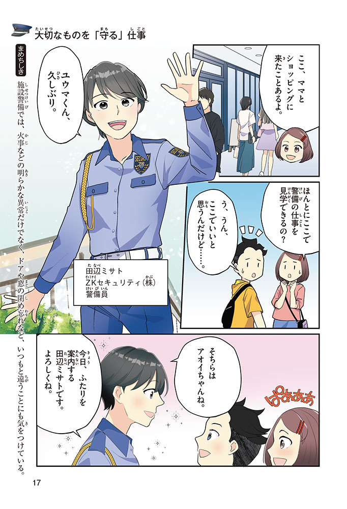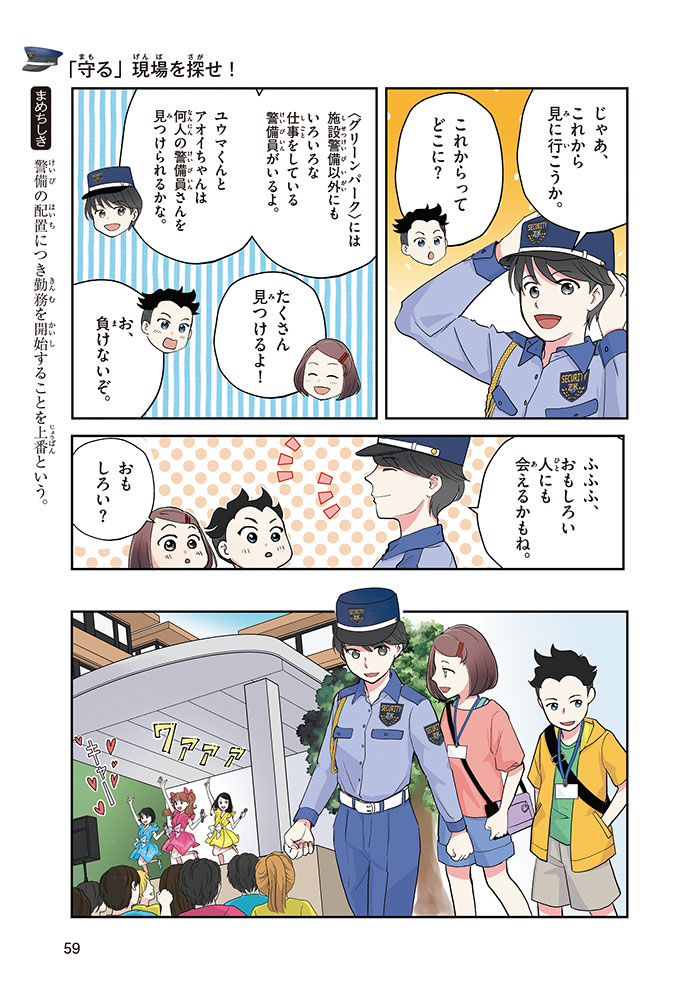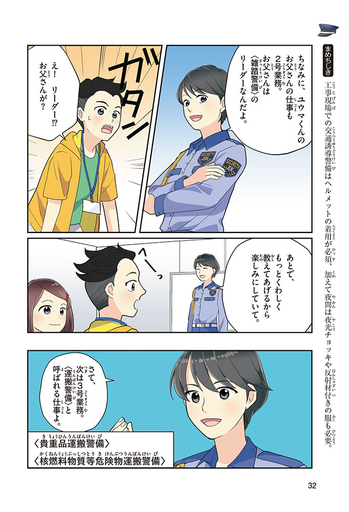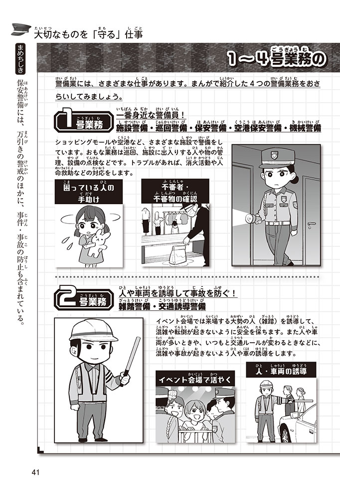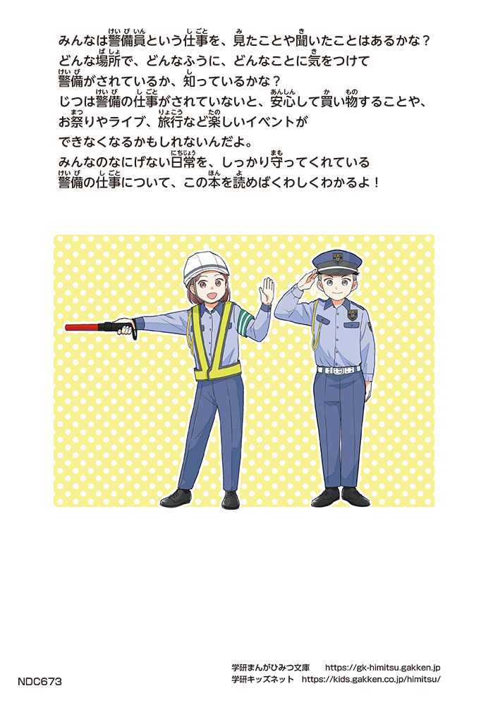 みんなは警備員という仕事を、見たことや聞いたことはあるかな? どんな場所で、どんなふうに、どんなことに気をつけて警備がされているか、知っているかな? じつは警備の仕事がされていないと、安心して買い物することや、お祭りやライブ、旅行など楽しいイベントができなくなるかもしれないんだよ。本書では、警備会社で働く父をもつ小学生のユウマと、友だちのアオイが警備の仕事についての調べ学習をすることに。みんなのなにげない日常を、しっかり守ってくれている警備業のひみつを、ユウマとアオイといっしょに見ていこう!