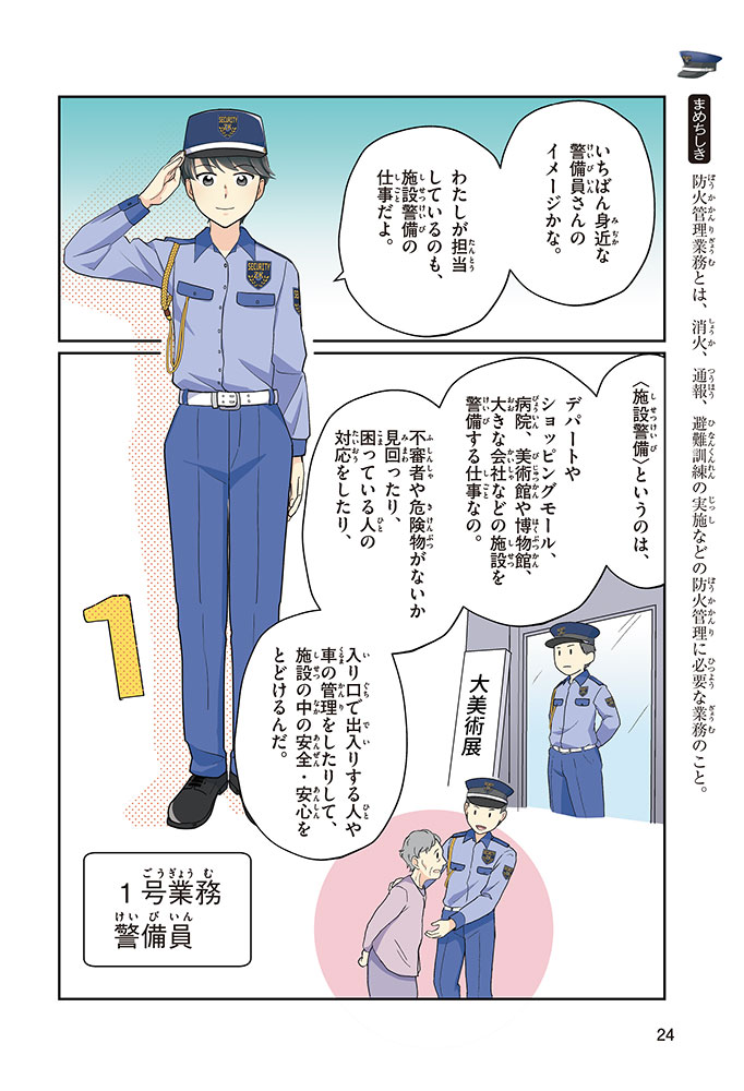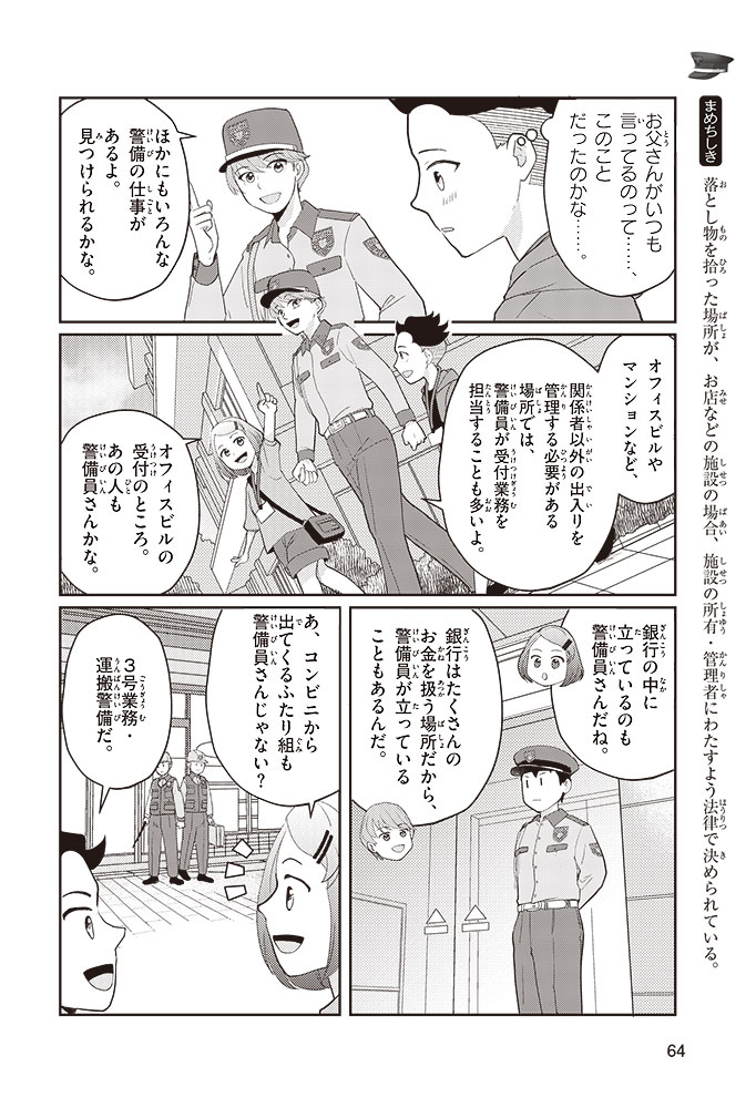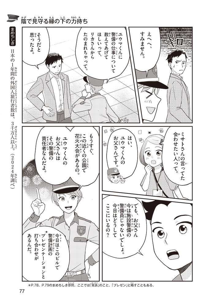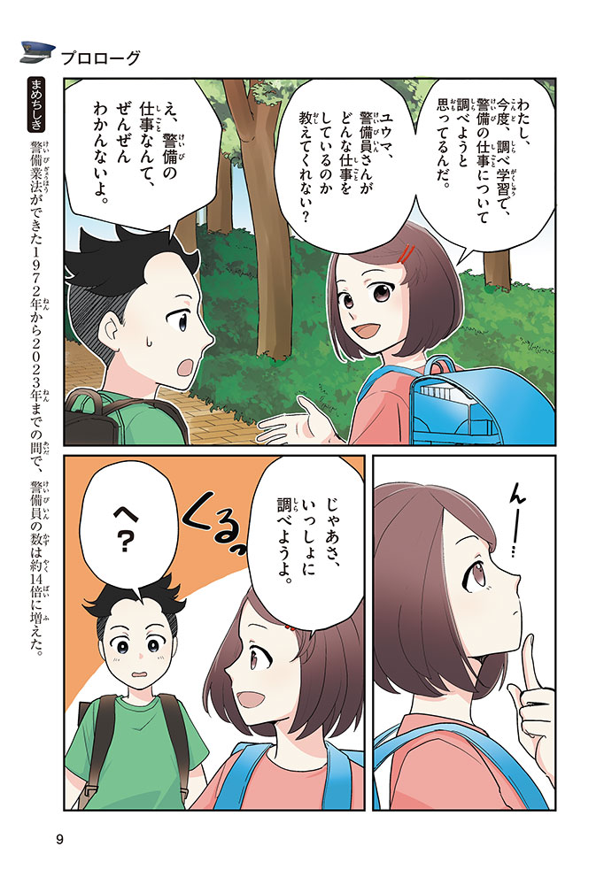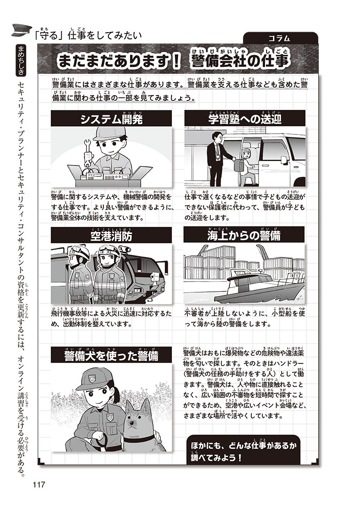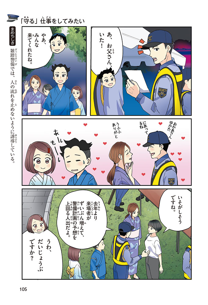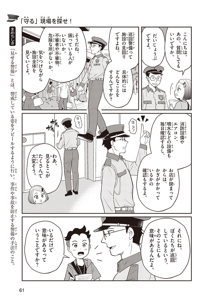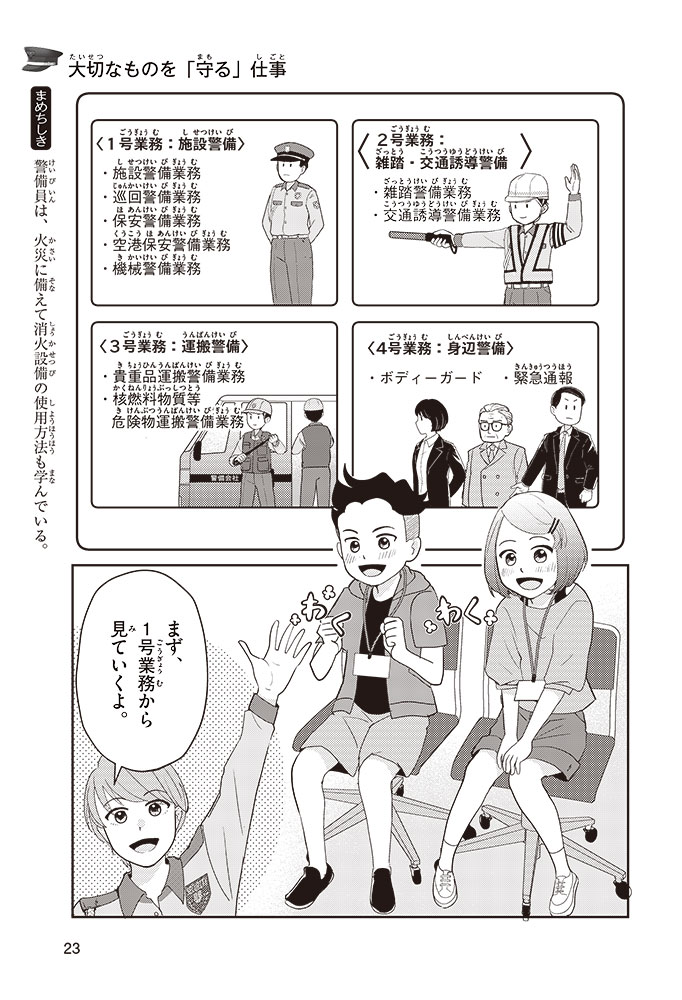 みんなは警備員という仕事を、見たことや聞いたことはあるかな? どんな場所で、どんなふうに、どんなことに気をつけて警備がされているか、知っているかな? じつは警備の仕事がされていないと、安心して買い物することや、お祭りやライブ、旅行など楽しいイベントができなくなるかもしれないんだよ。本書では、警備会社で働く父をもつ小学生のユウマと、友だちのアオイが警備の仕事についての調べ学習をすることに。みんなのなにげない日常を、しっかり守ってくれている警備業のひみつを、ユウマとアオイといっしょに見ていこう!
