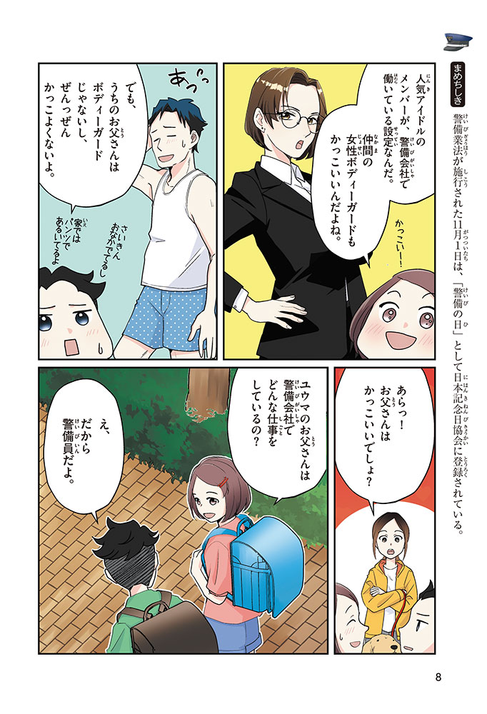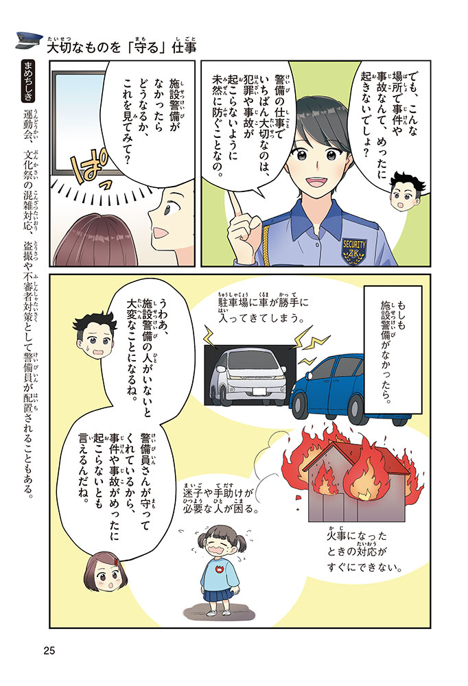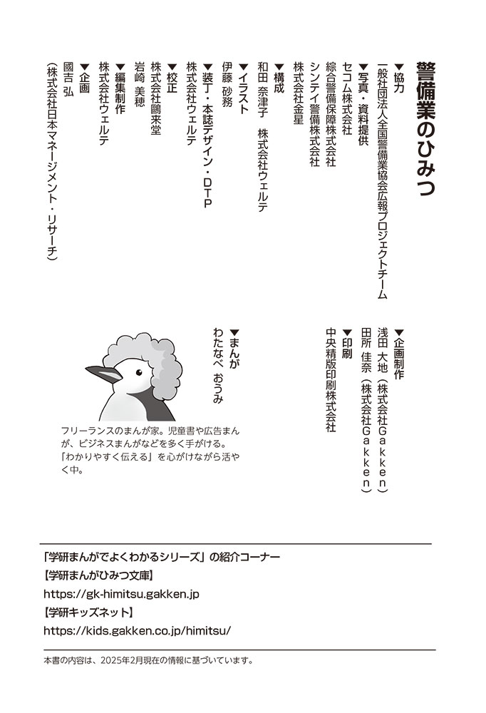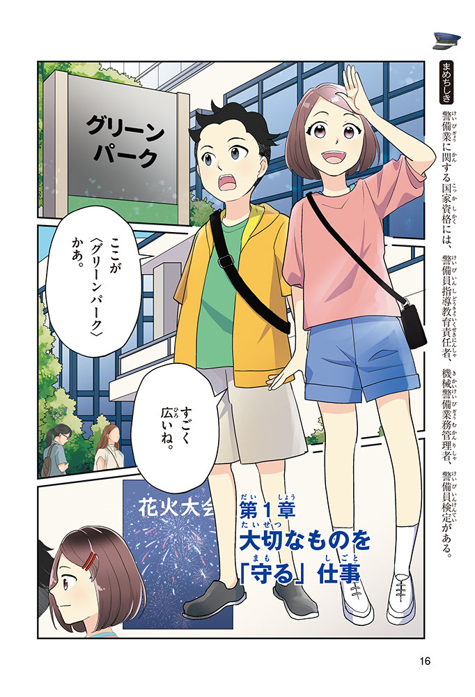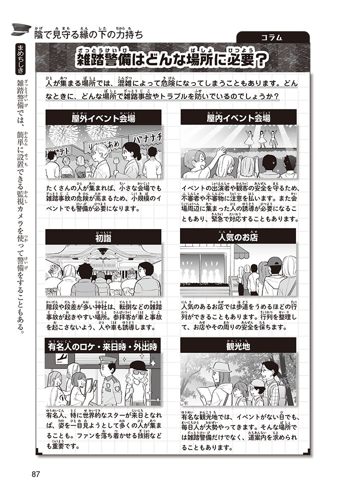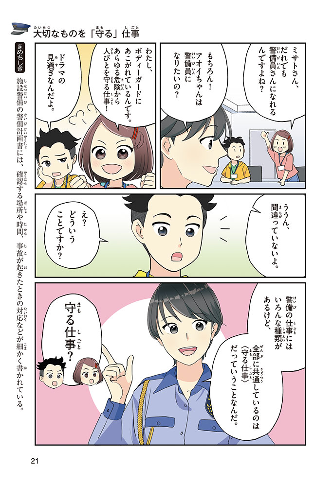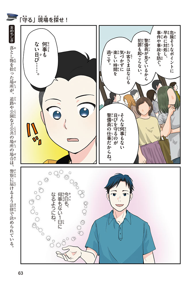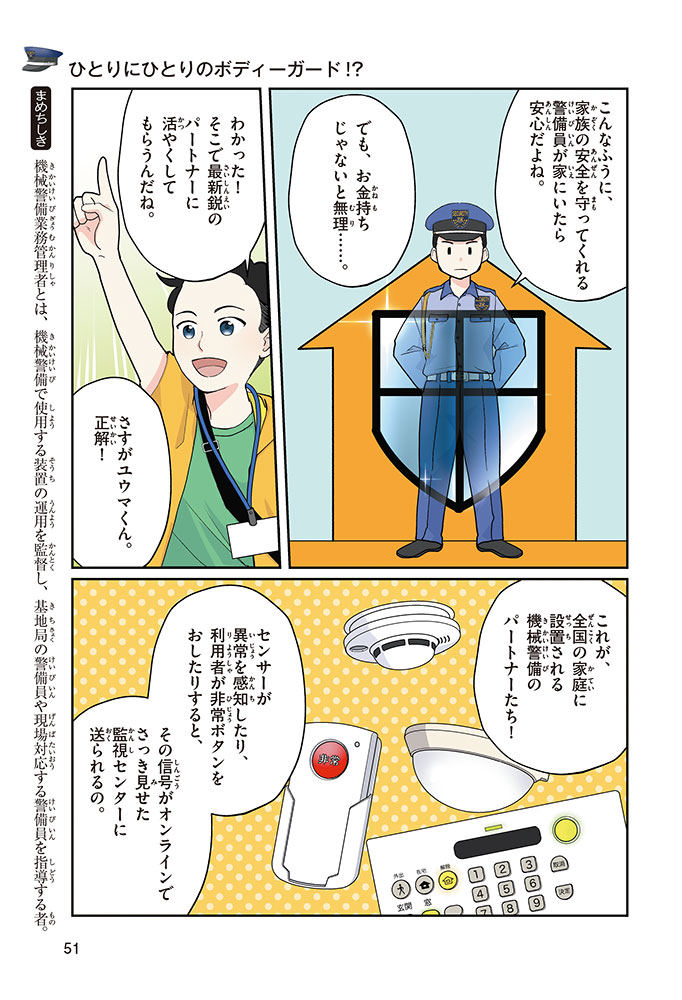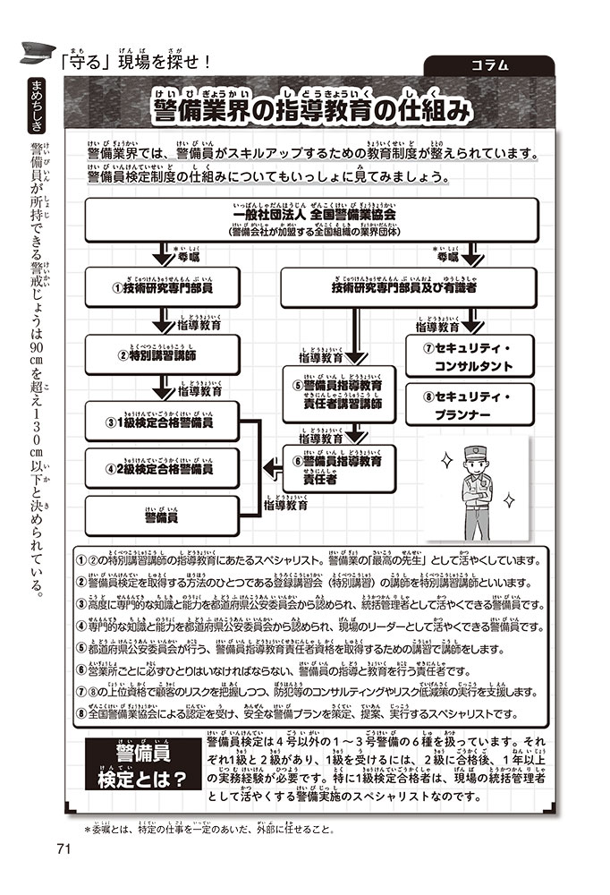 みんなは警備員という仕事を、見たことや聞いたことはあるかな? どんな場所で、どんなふうに、どんなことに気をつけて警備がされているか、知っているかな? じつは警備の仕事がされていないと、安心して買い物することや、お祭りやライブ、旅行など楽しいイベントができなくなるかもしれないんだよ。本書では、警備会社で働く父をもつ小学生のユウマと、友だちのアオイが警備の仕事についての調べ学習をすることに。みんなのなにげない日常を、しっかり守ってくれている警備業のひみつを、ユウマとアオイといっしょに見ていこう!