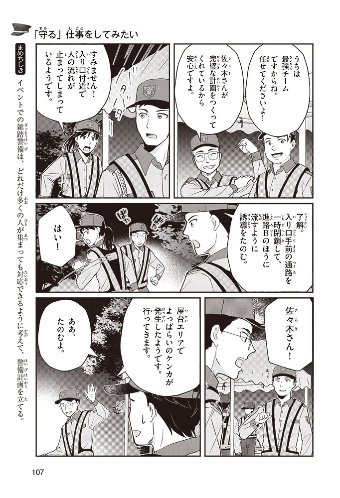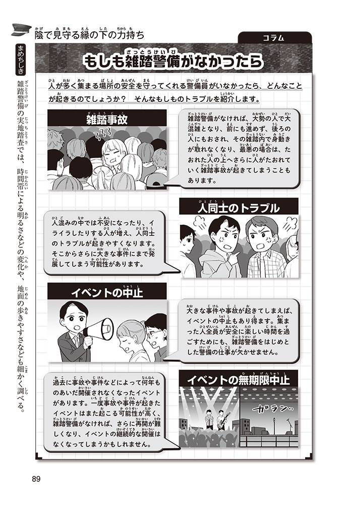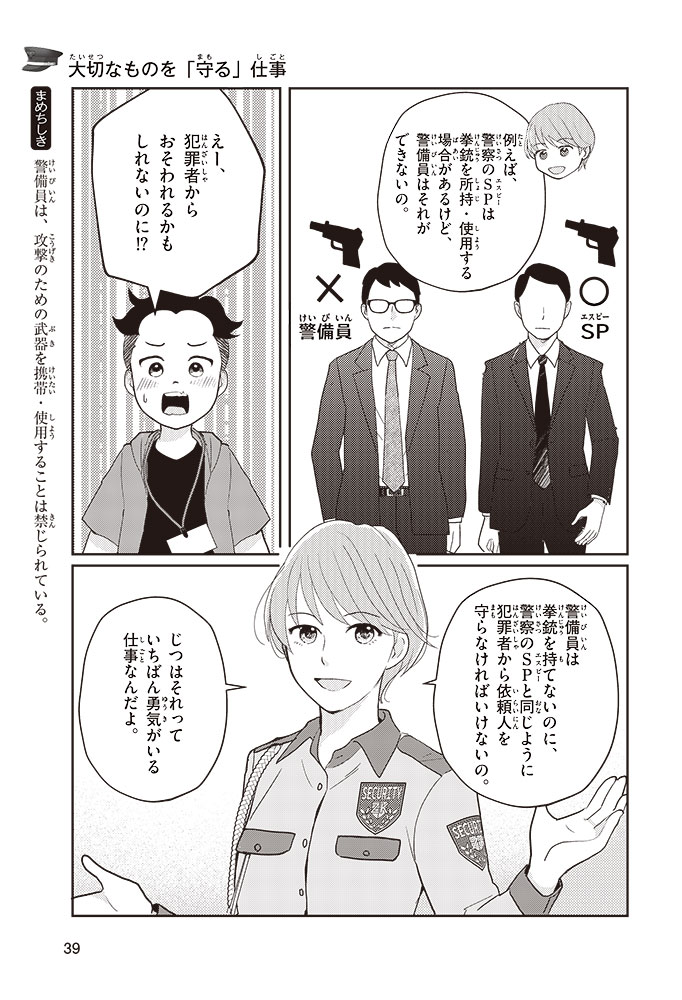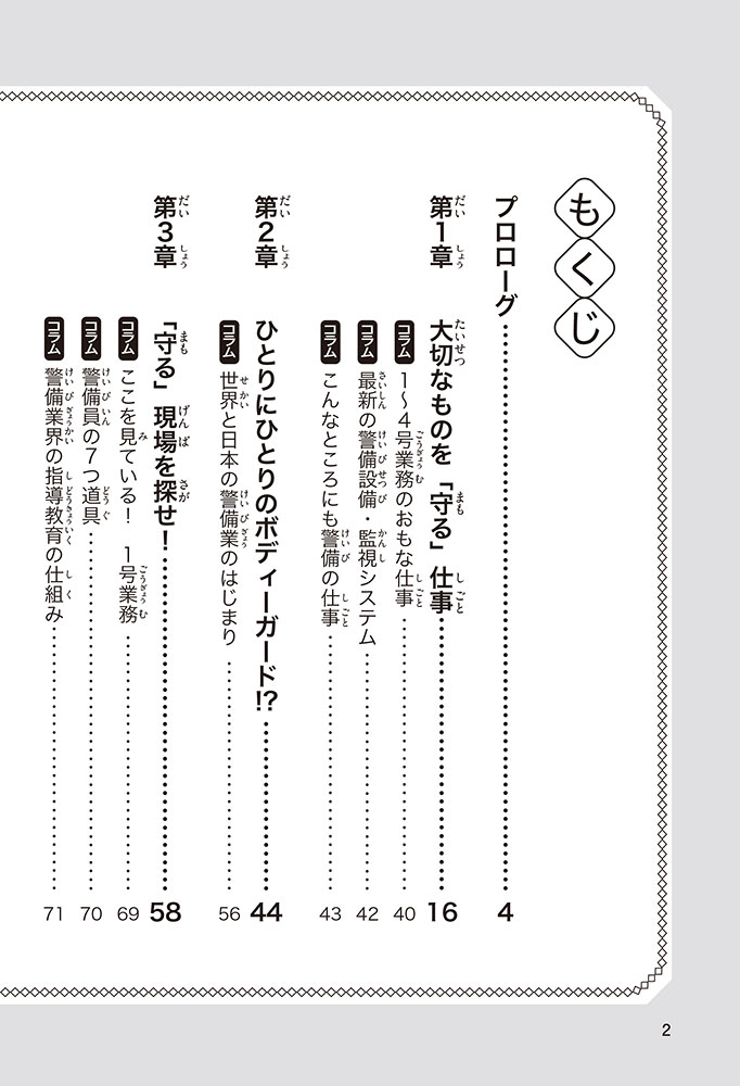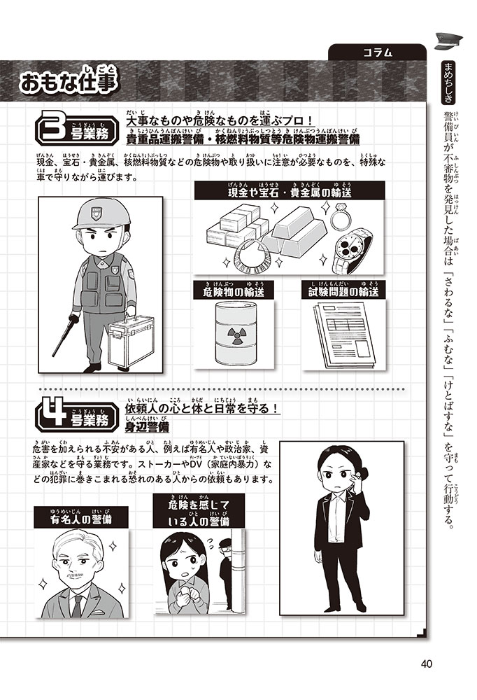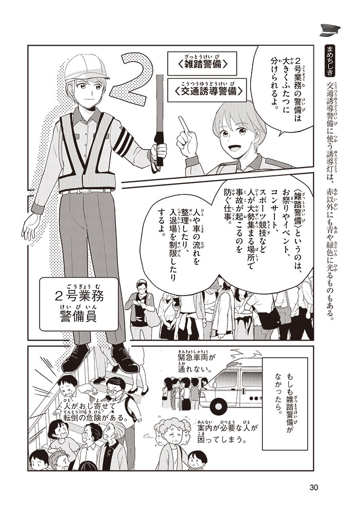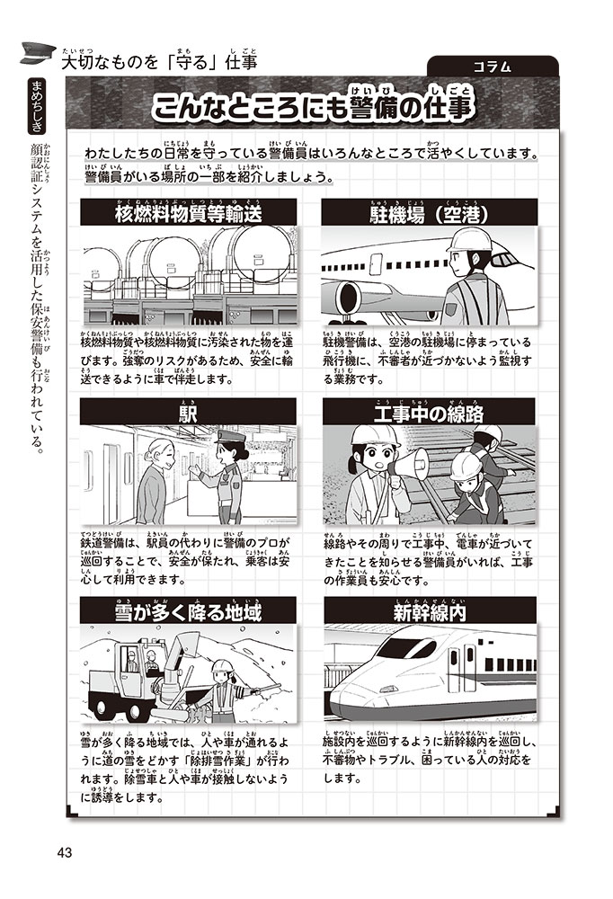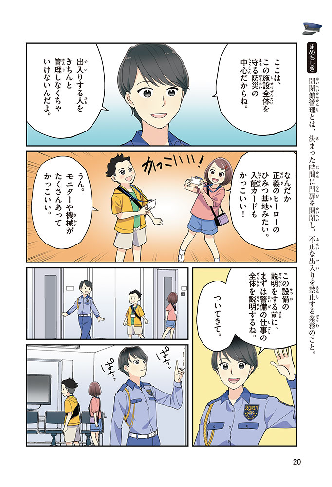 みんなは警備員という仕事を、見たことや聞いたことはあるかな? どんな場所で、どんなふうに、どんなことに気をつけて警備がされているか、知っているかな? じつは警備の仕事がされていないと、安心して買い物することや、お祭りやライブ、旅行など楽しいイベントができなくなるかもしれないんだよ。本書では、警備会社で働く父をもつ小学生のユウマと、友だちのアオイが警備の仕事についての調べ学習をすることに。みんなのなにげない日常を、しっかり守ってくれている警備業のひみつを、ユウマとアオイといっしょに見ていこう!