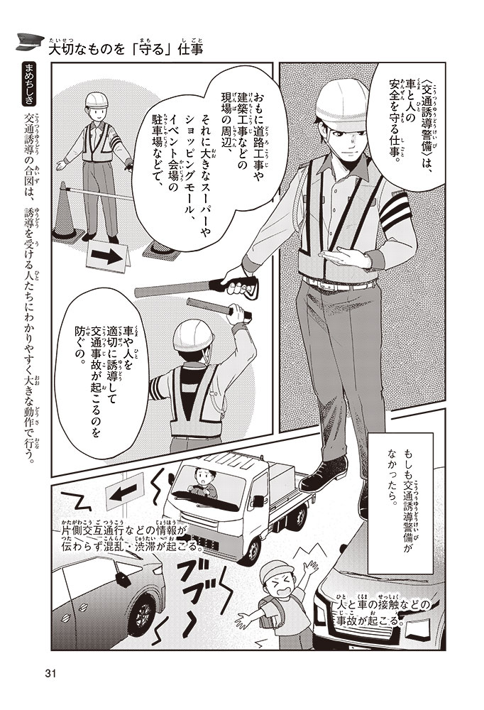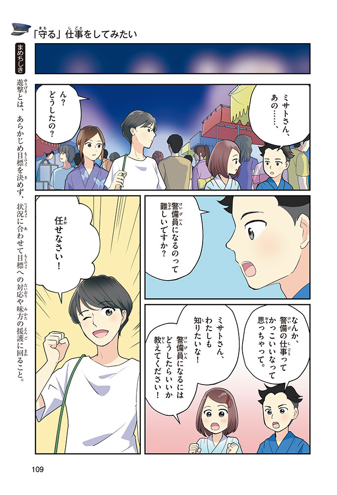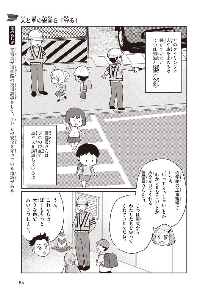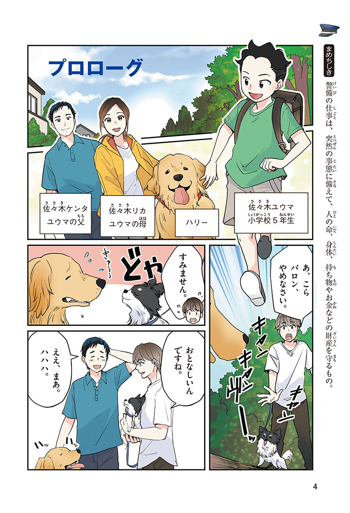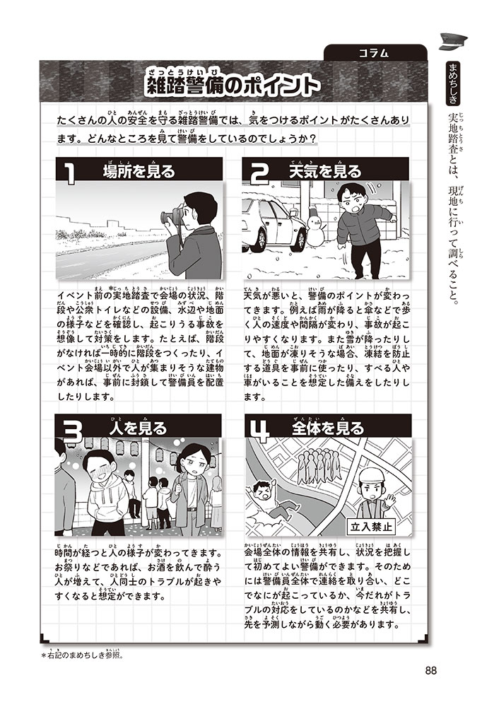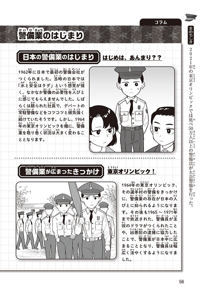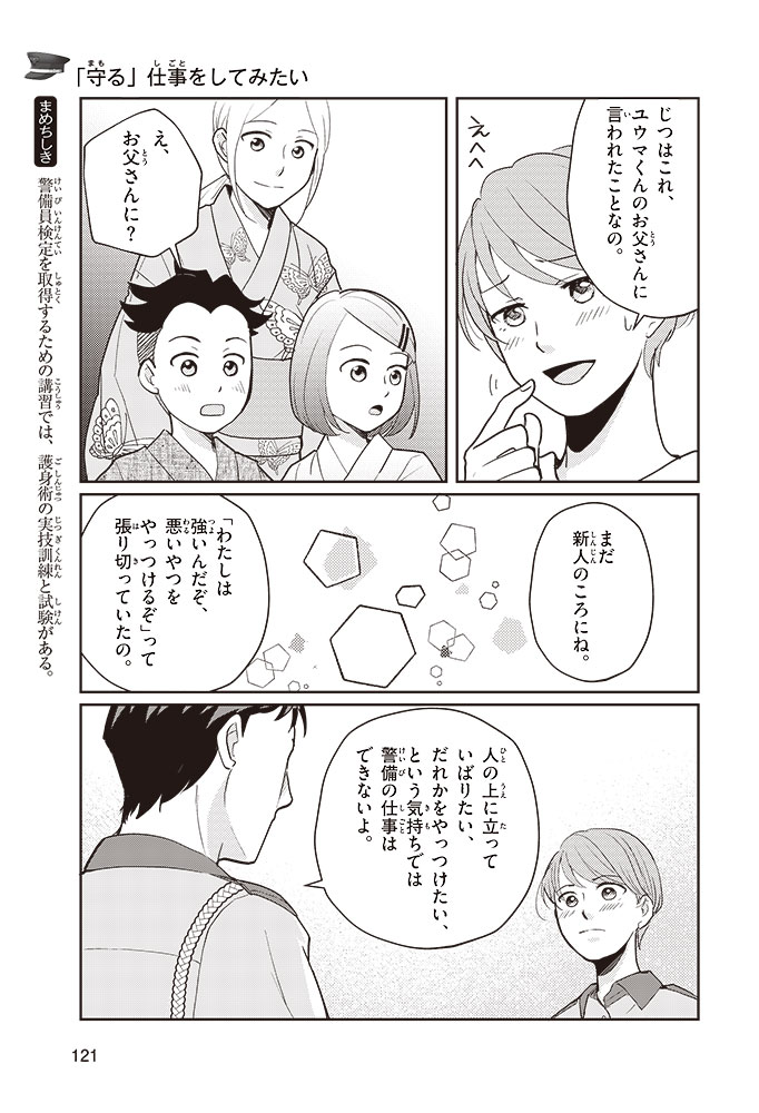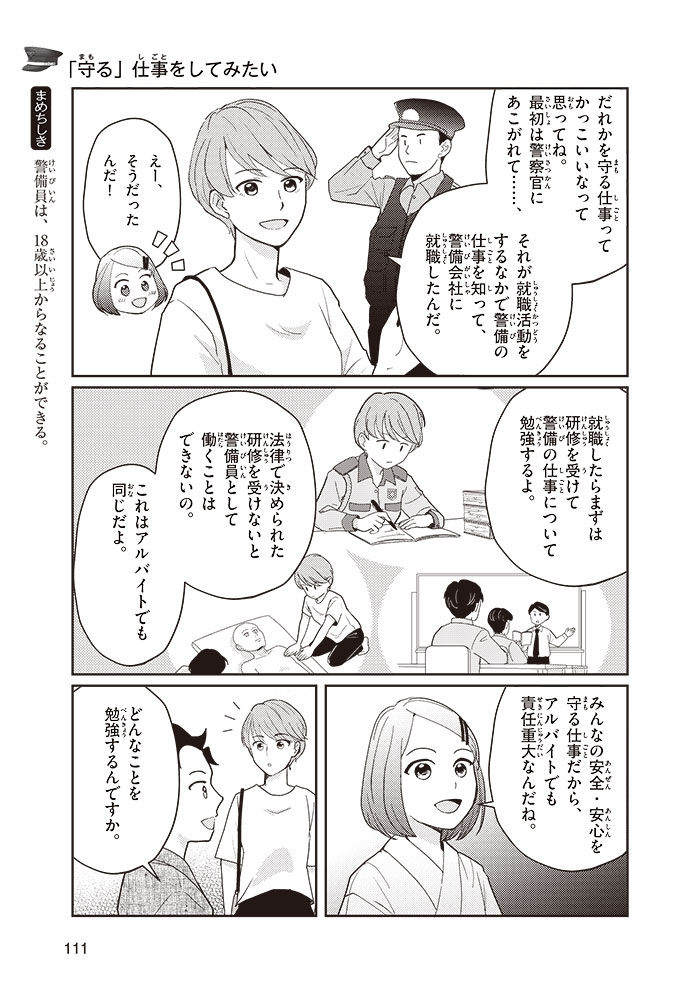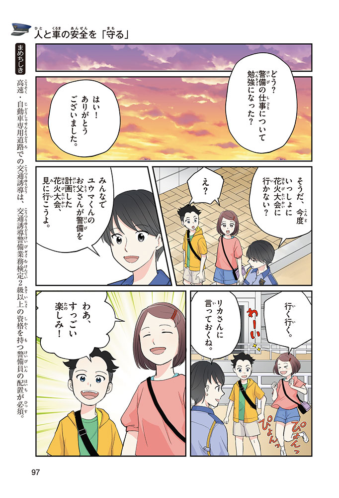 みんなは警備員という仕事を、見たことや聞いたことはあるかな? どんな場所で、どんなふうに、どんなことに気をつけて警備がされているか、知っているかな? じつは警備の仕事がされていないと、安心して買い物することや、お祭りやライブ、旅行など楽しいイベントができなくなるかもしれないんだよ。本書では、警備会社で働く父をもつ小学生のユウマと、友だちのアオイが警備の仕事についての調べ学習をすることに。みんなのなにげない日常を、しっかり守ってくれている警備業のひみつを、ユウマとアオイといっしょに見ていこう!