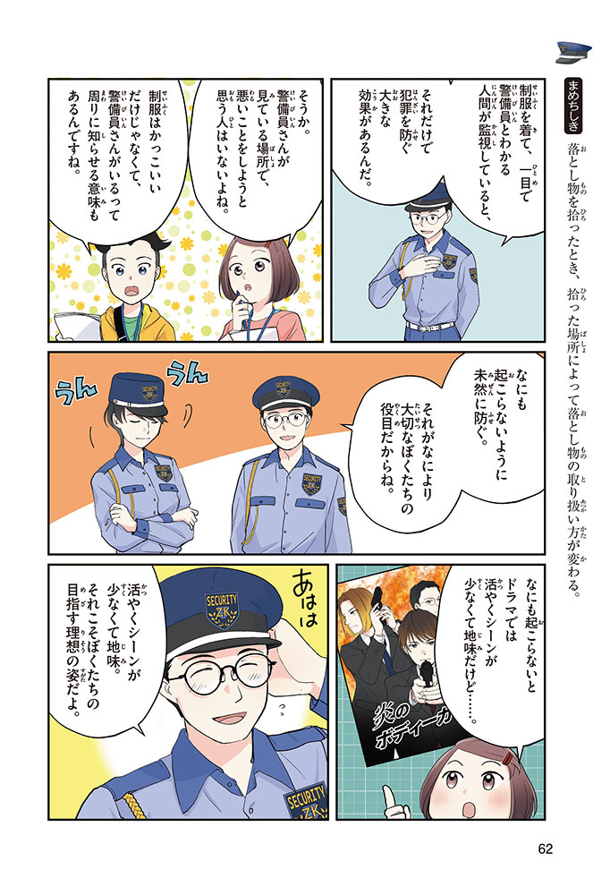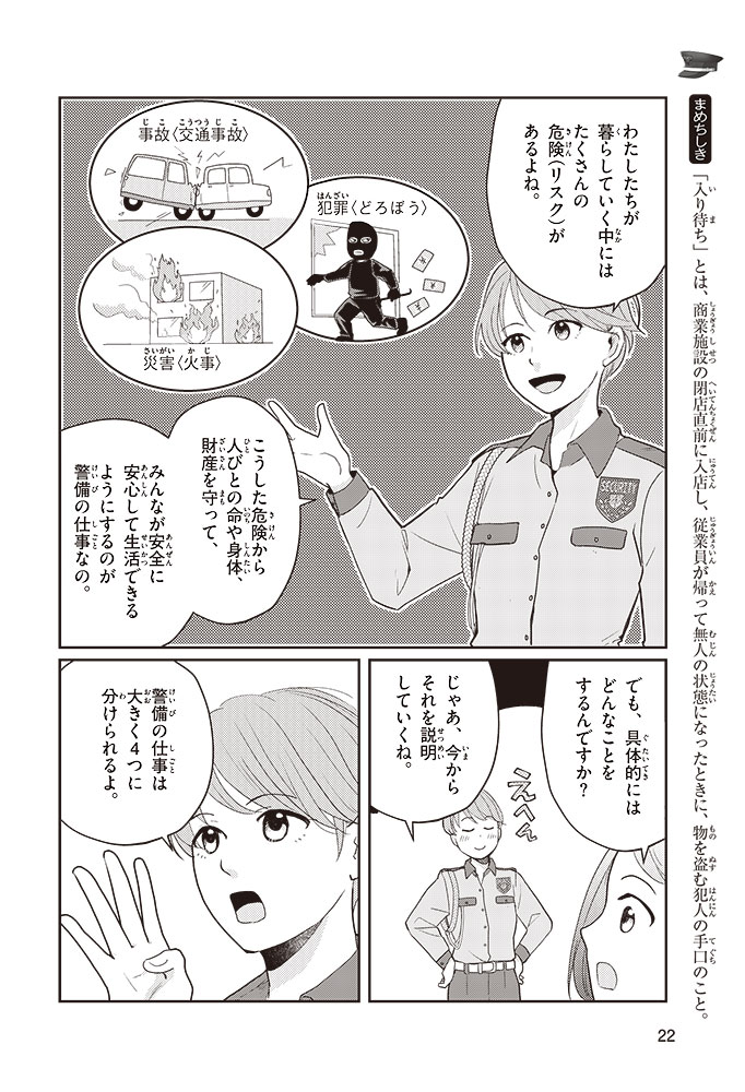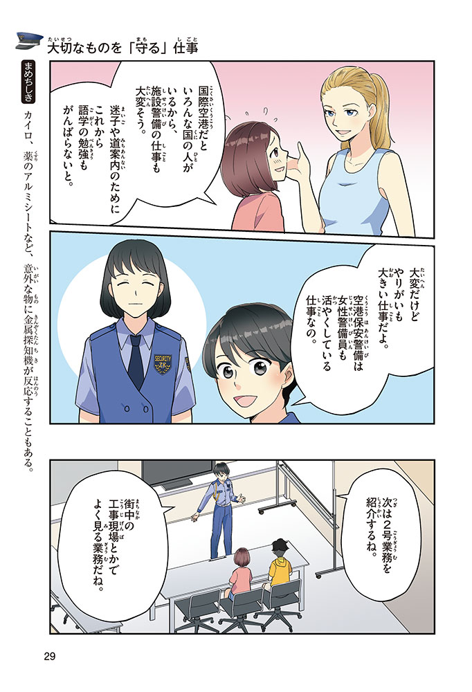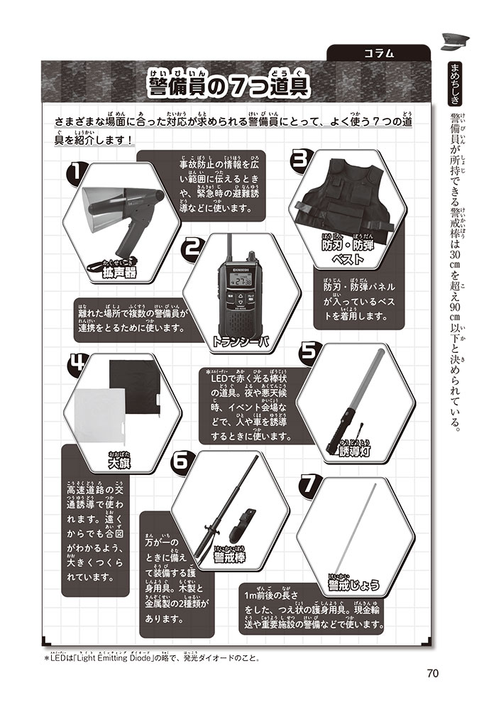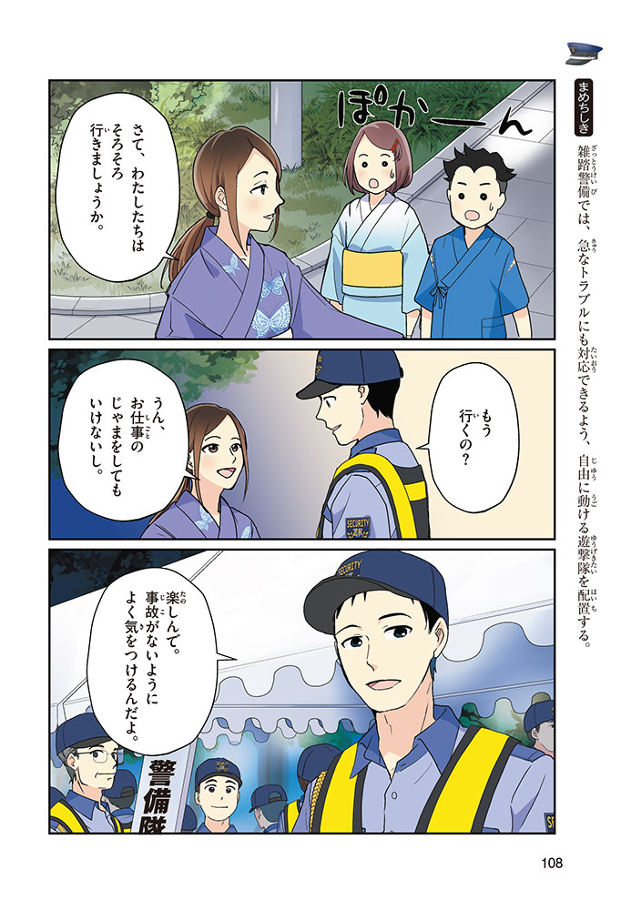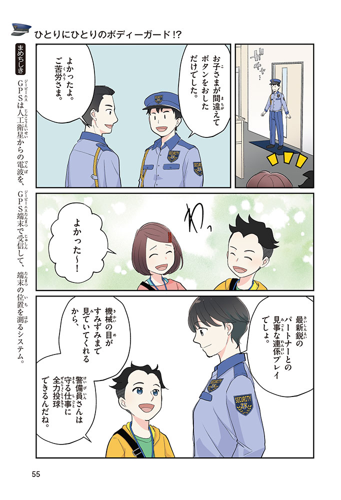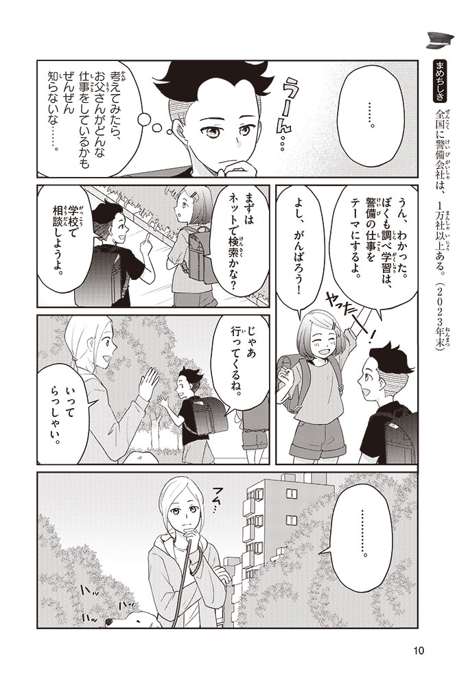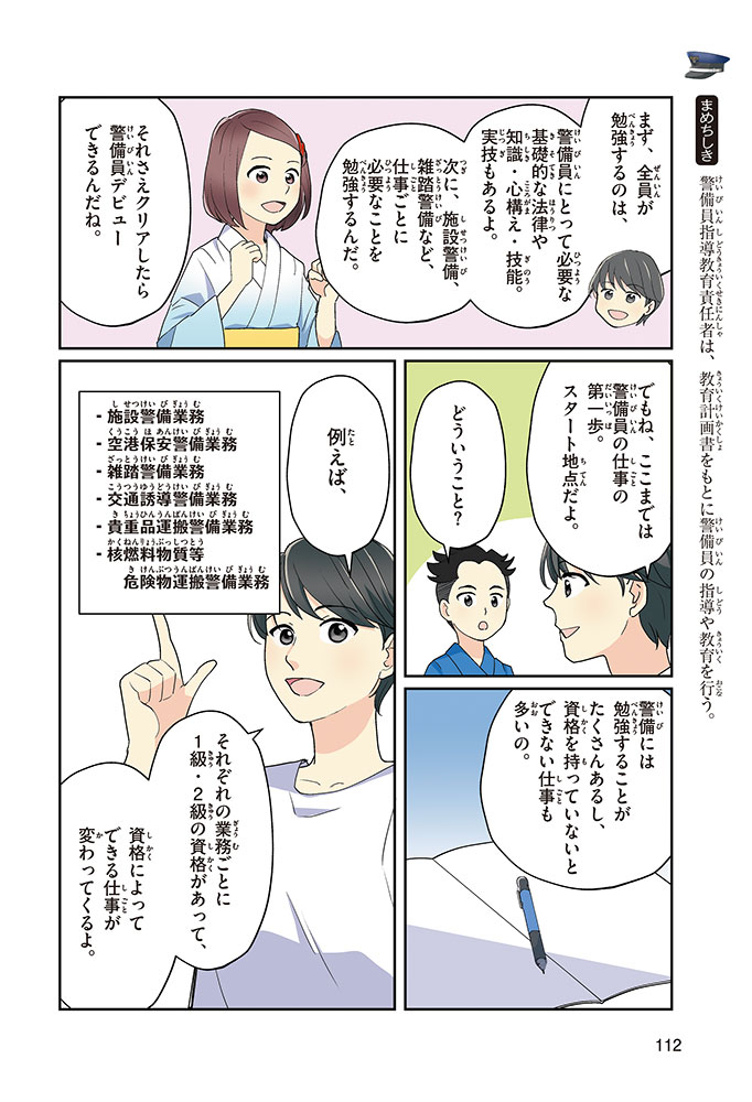 みんなは警備員という仕事を、見たことや聞いたことはあるかな? どんな場所で、どんなふうに、どんなことに気をつけて警備がされているか、知っているかな? じつは警備の仕事がされていないと、安心して買い物することや、お祭りやライブ、旅行など楽しいイベントができなくなるかもしれないんだよ。本書では、警備会社で働く父をもつ小学生のユウマと、友だちのアオイが警備の仕事についての調べ学習をすることに。みんなのなにげない日常を、しっかり守ってくれている警備業のひみつを、ユウマとアオイといっしょに見ていこう!
