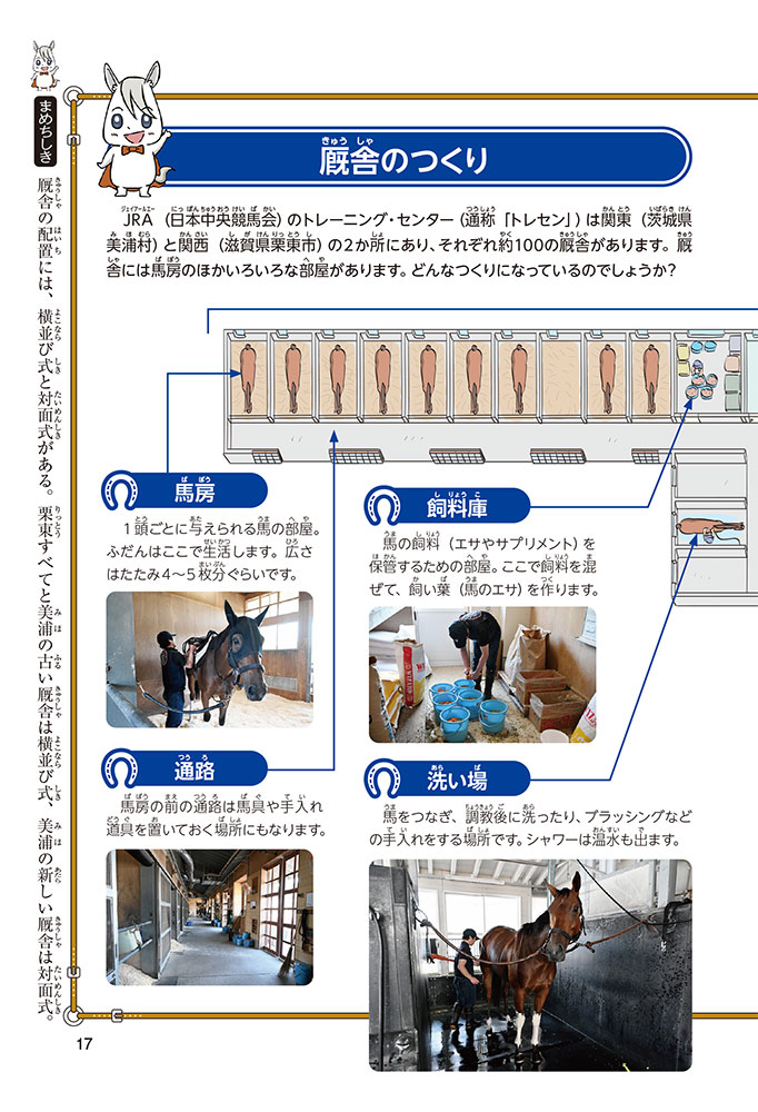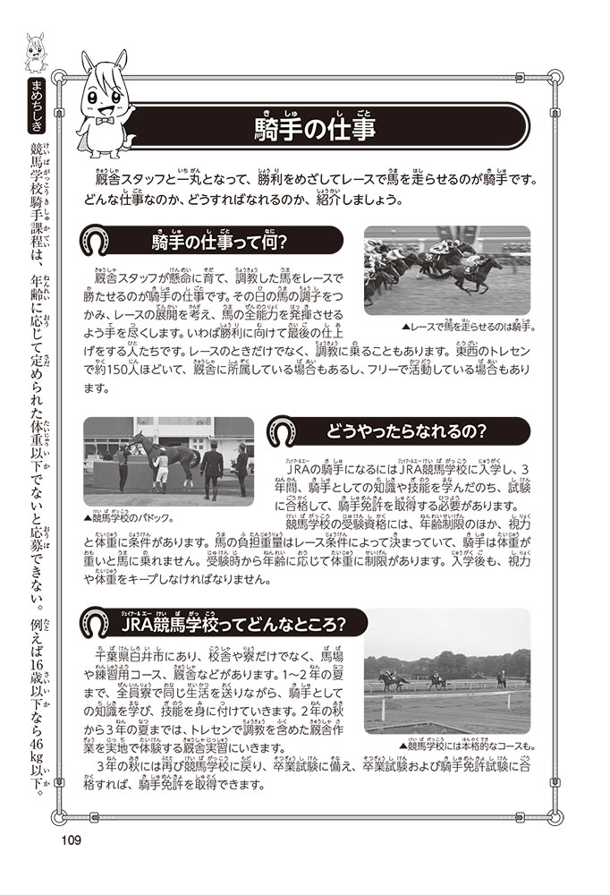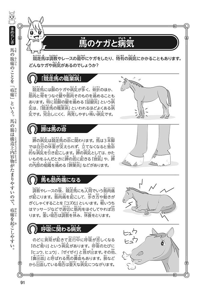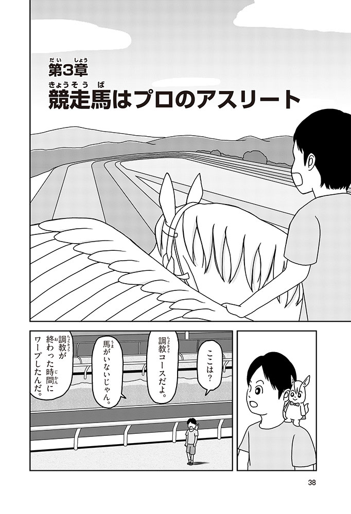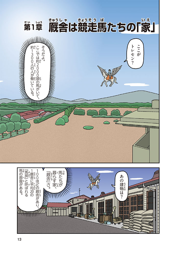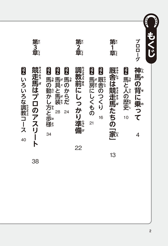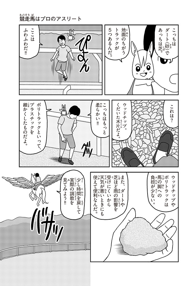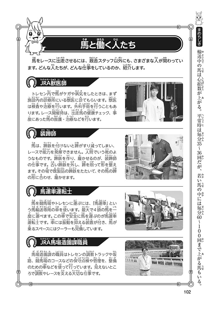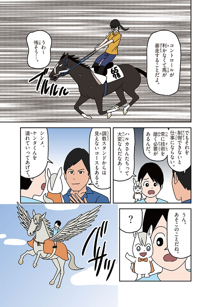 4000年以上にわたり、人を乗せて走ることで、人の役に立ってきた馬。今も走ることは馬にとって大切な仕事なんだ。そんな馬を育てる人ってどんな人たちなんだろう? ケンタと馬の妖精シンメと一緒に、馬たちが暮らしトレーニングをしている施設に飛び、その様子を見てみよう! 速い馬を育てる人たちのひみつがよくわかるよ!