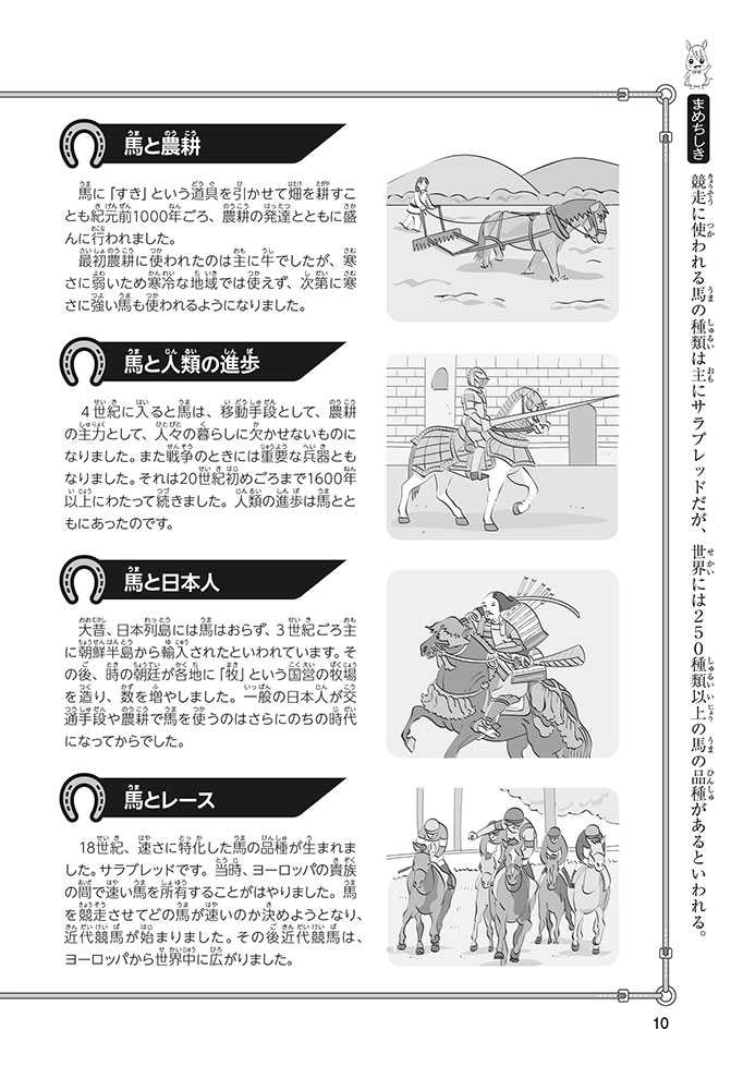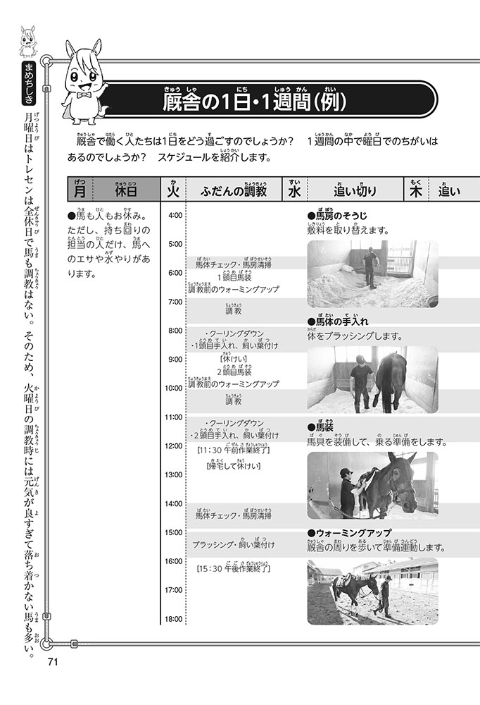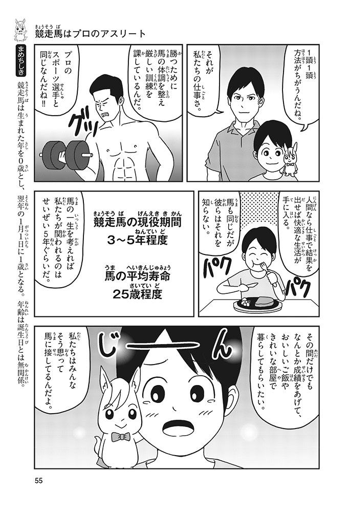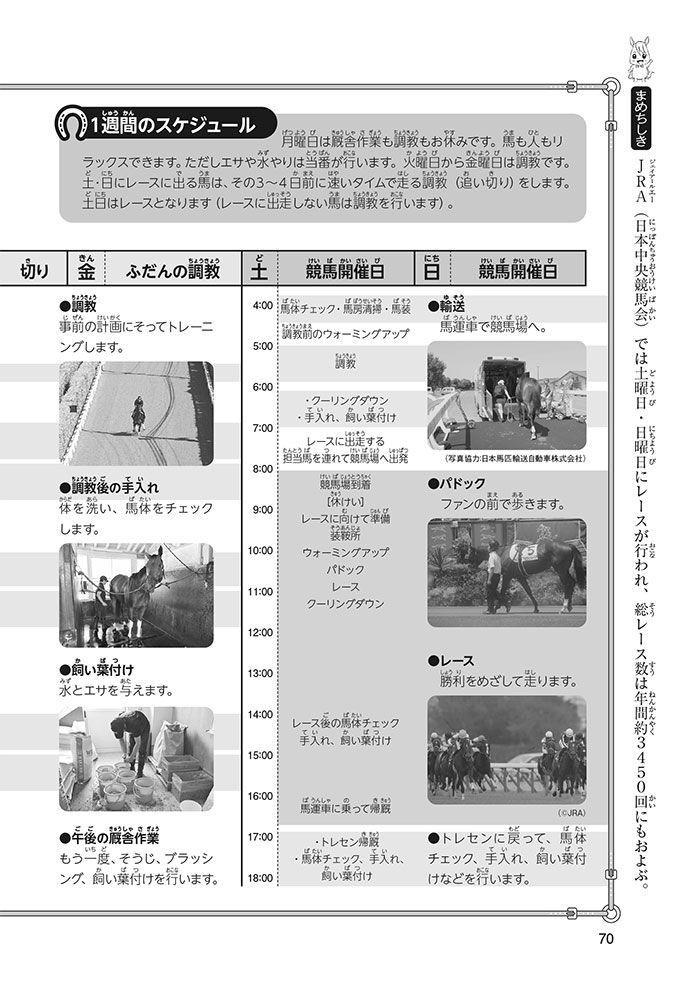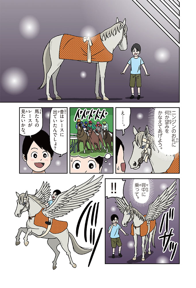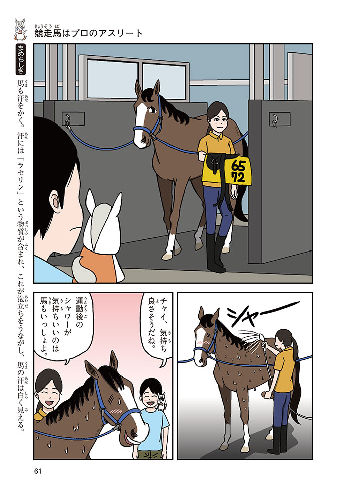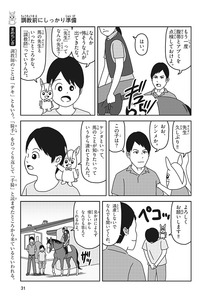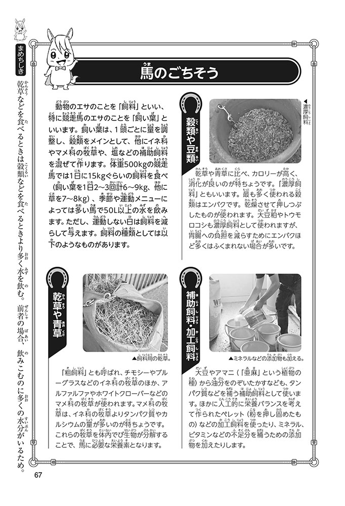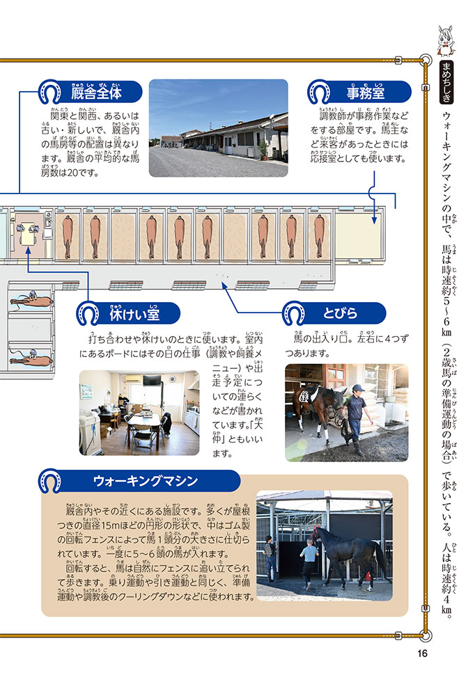 4000年以上にわたり、人を乗せて走ることで、人の役に立ってきた馬。今も走ることは馬にとって大切な仕事なんだ。そんな馬を育てる人ってどんな人たちなんだろう? ケンタと馬の妖精シンメと一緒に、馬たちが暮らしトレーニングをしている施設に飛び、その様子を見てみよう! 速い馬を育てる人たちのひみつがよくわかるよ!
