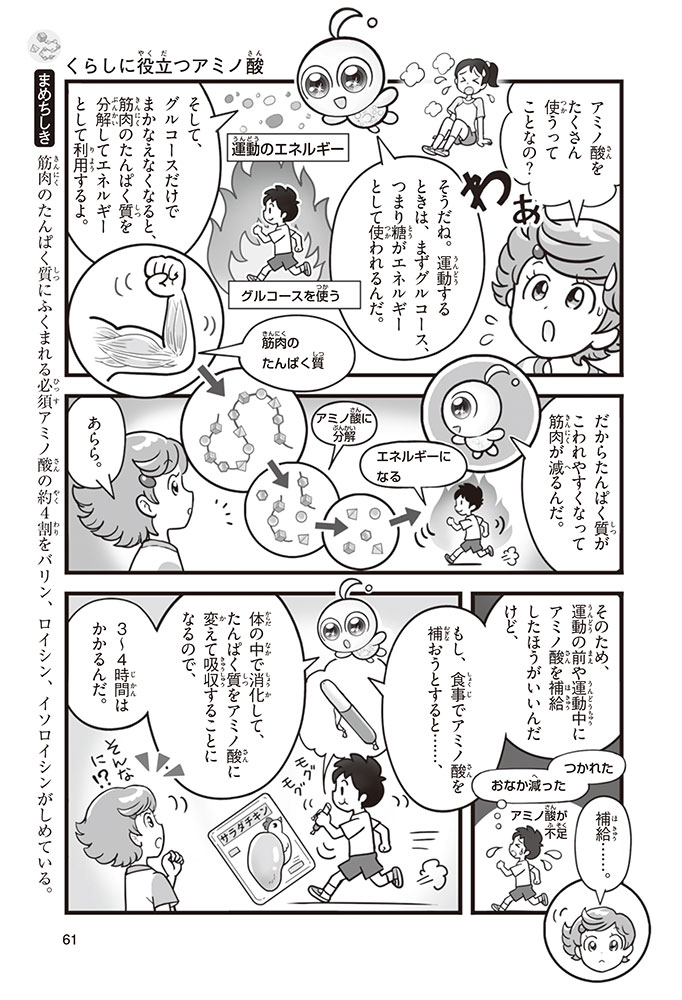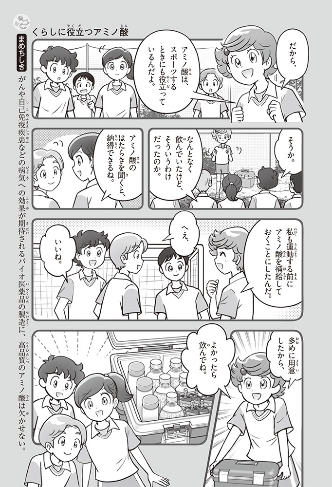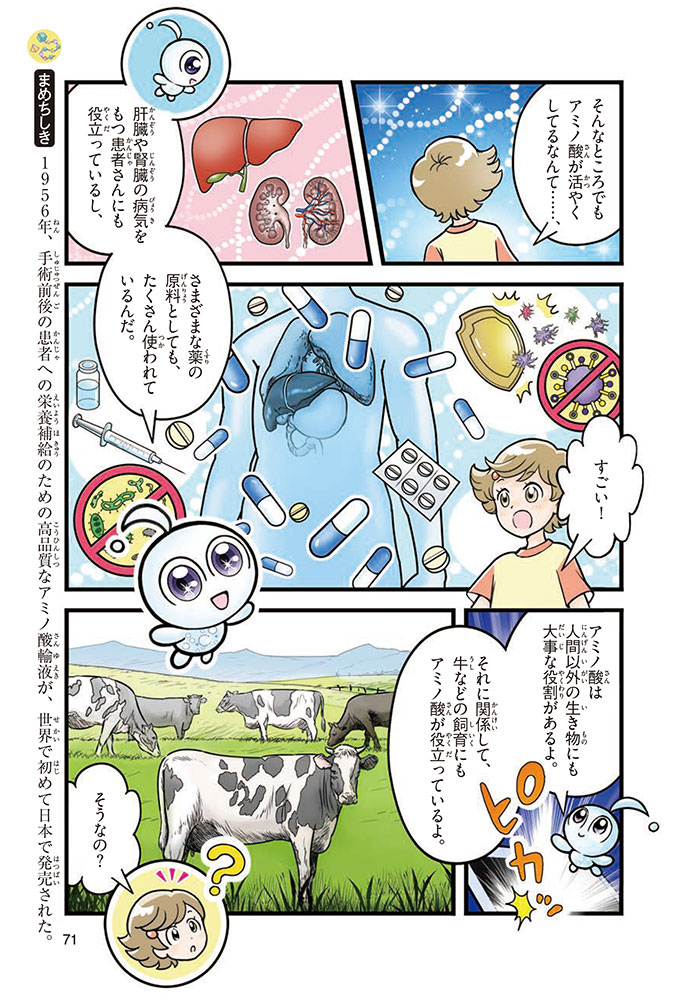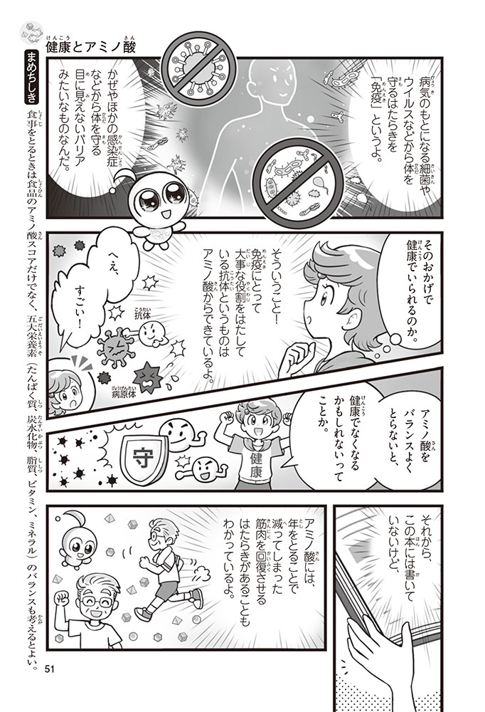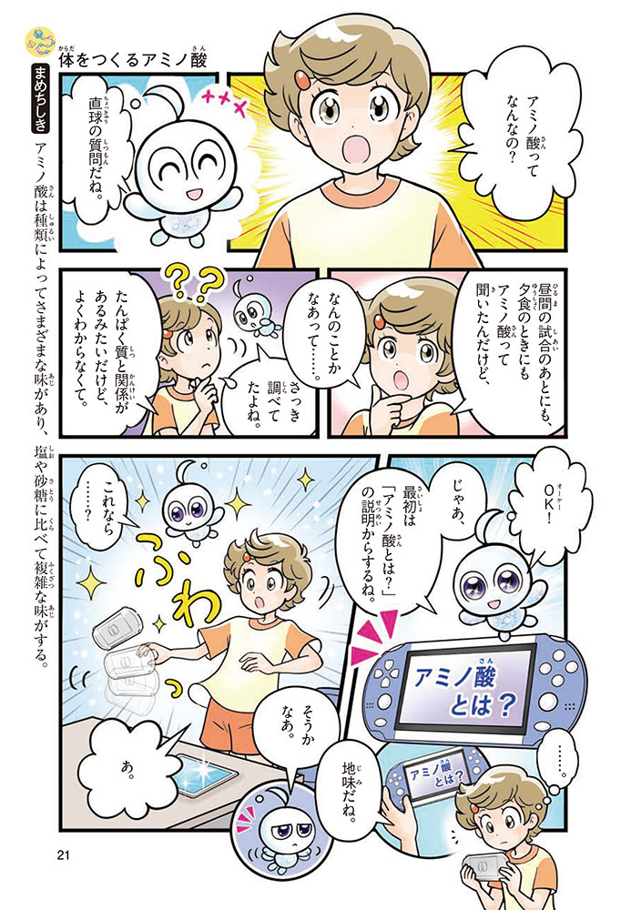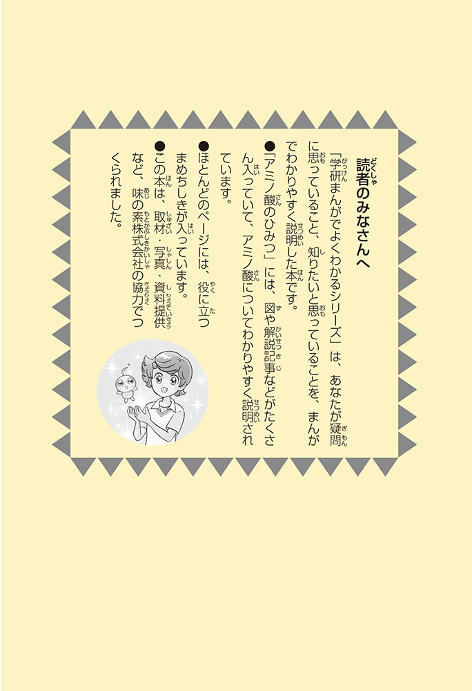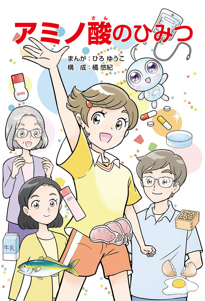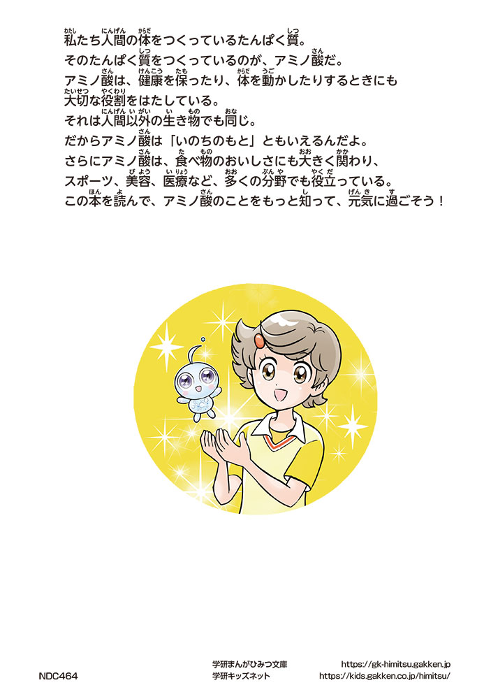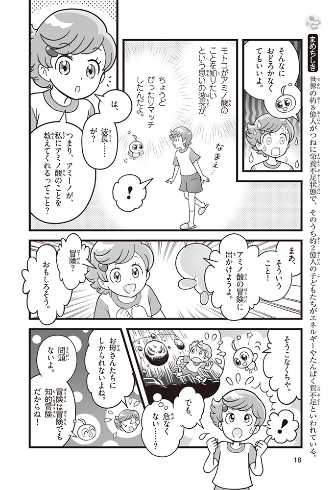 私たちの体をつくっているたんぱく質。そのたんぱく質をつくっているのが「アミノ酸」なんだ。アミノ酸は健康を保ったり、体を動かしたりするときにも大切な役割をはたしている。だからアミノ酸は「いのちのもと」ともいえるんだよ。さらにアミノ酸は、食べ物のおいしさにも大きく関わり、スポーツ、美容、医療など、多くの分野でも役立っているんだ。本書は、サッカー大会で友人がアミノ酸配合のドリンクを飲んでいたことをきっかけに、アミノ酸に興味をもつようになった小学生の阿地野(あじの)モトコが主人公。アミノ酸の妖精アミーノと出会い、いっしょに調べながら学んでいくよ。みんなもこの本を読んで、アミノ酸についてもっと知って、毎日を元気に過ごそう!
