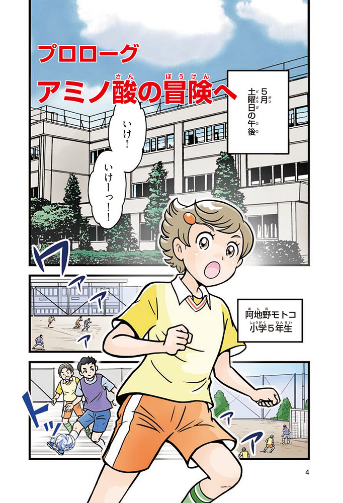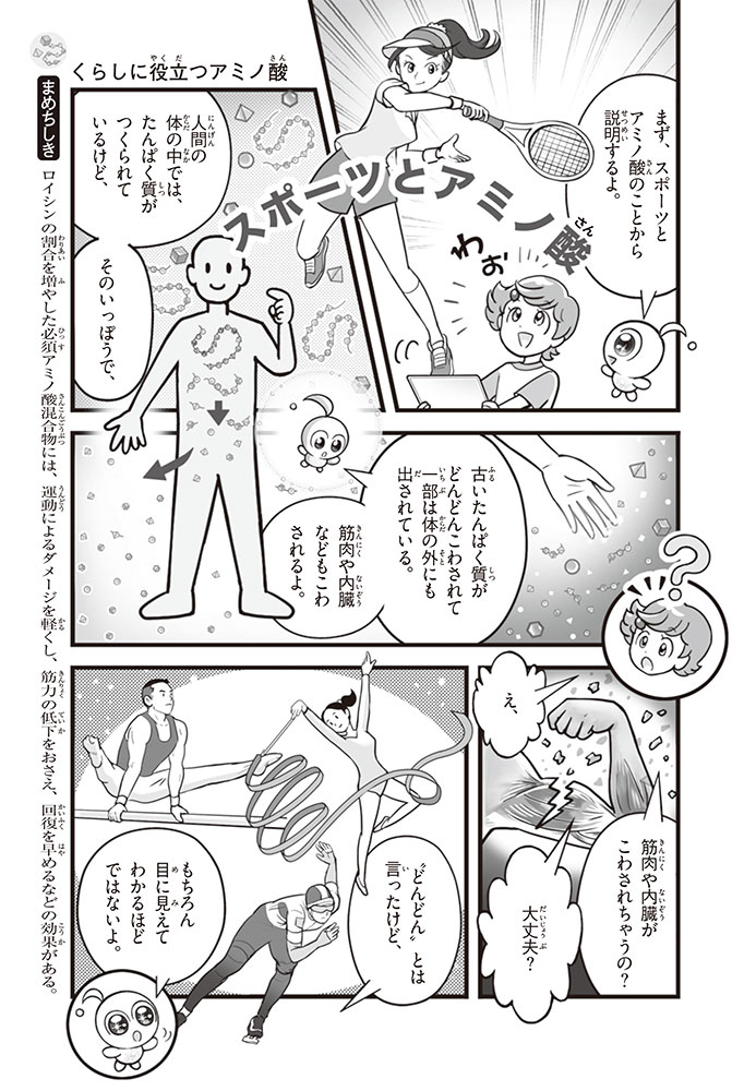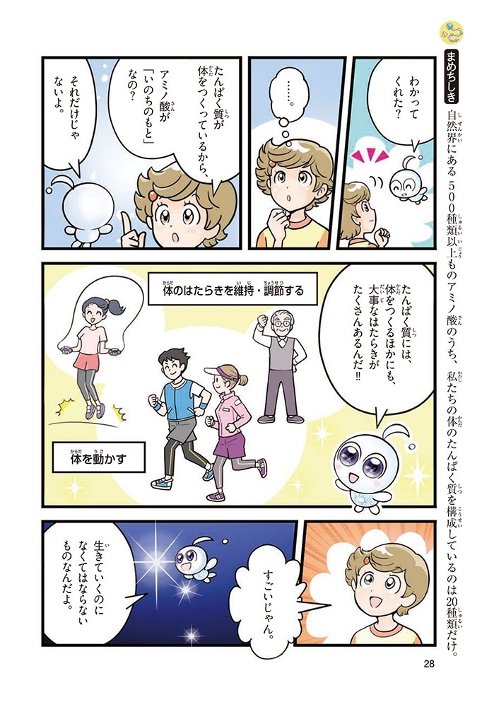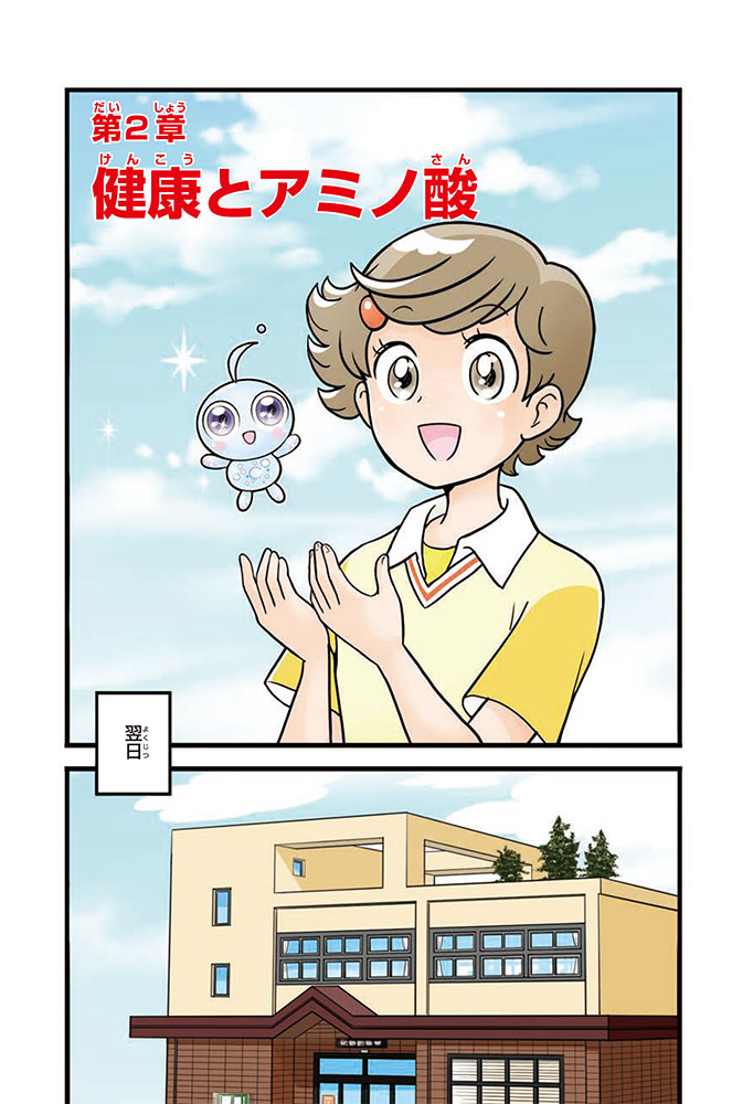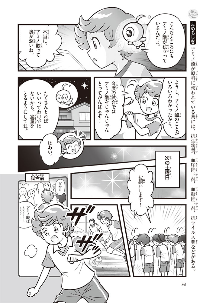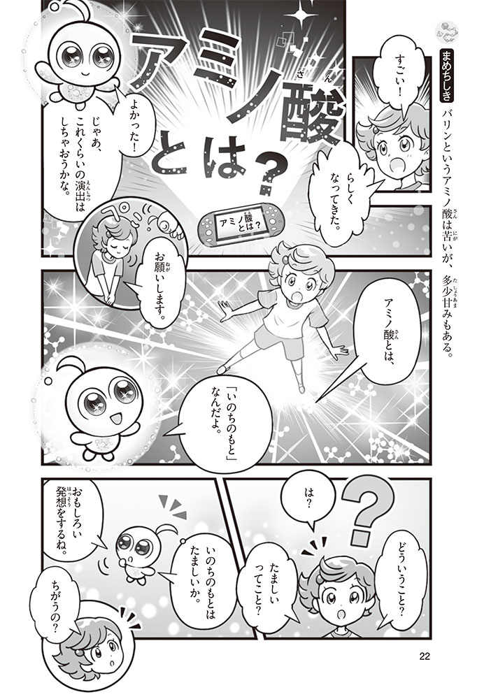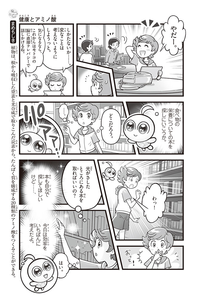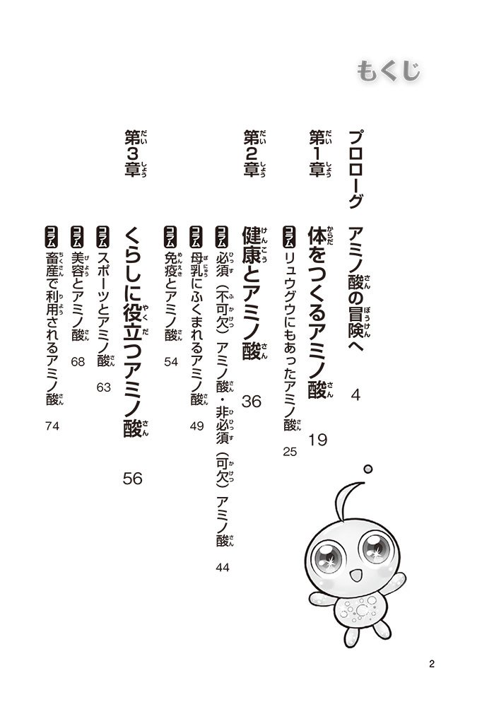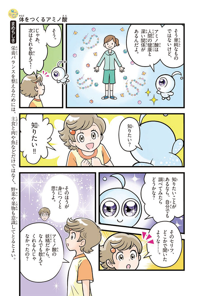 私たちの体をつくっているたんぱく質。そのたんぱく質をつくっているのが「アミノ酸」なんだ。アミノ酸は健康を保ったり、体を動かしたりするときにも大切な役割をはたしている。だからアミノ酸は「いのちのもと」ともいえるんだよ。さらにアミノ酸は、食べ物のおいしさにも大きく関わり、スポーツ、美容、医療など、多くの分野でも役立っているんだ。本書は、サッカー大会で友人がアミノ酸配合のドリンクを飲んでいたことをきっかけに、アミノ酸に興味をもつようになった小学生の阿地野(あじの)モトコが主人公。アミノ酸の妖精アミーノと出会い、いっしょに調べながら学んでいくよ。みんなもこの本を読んで、アミノ酸についてもっと知って、毎日を元気に過ごそう!