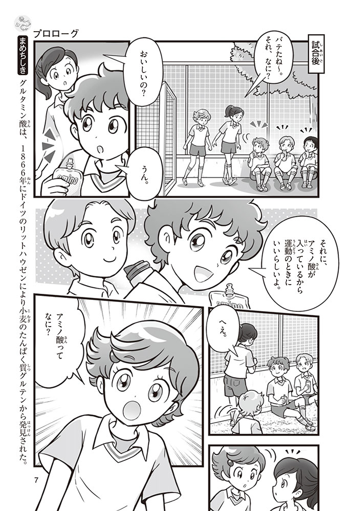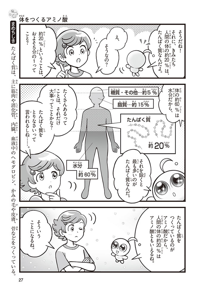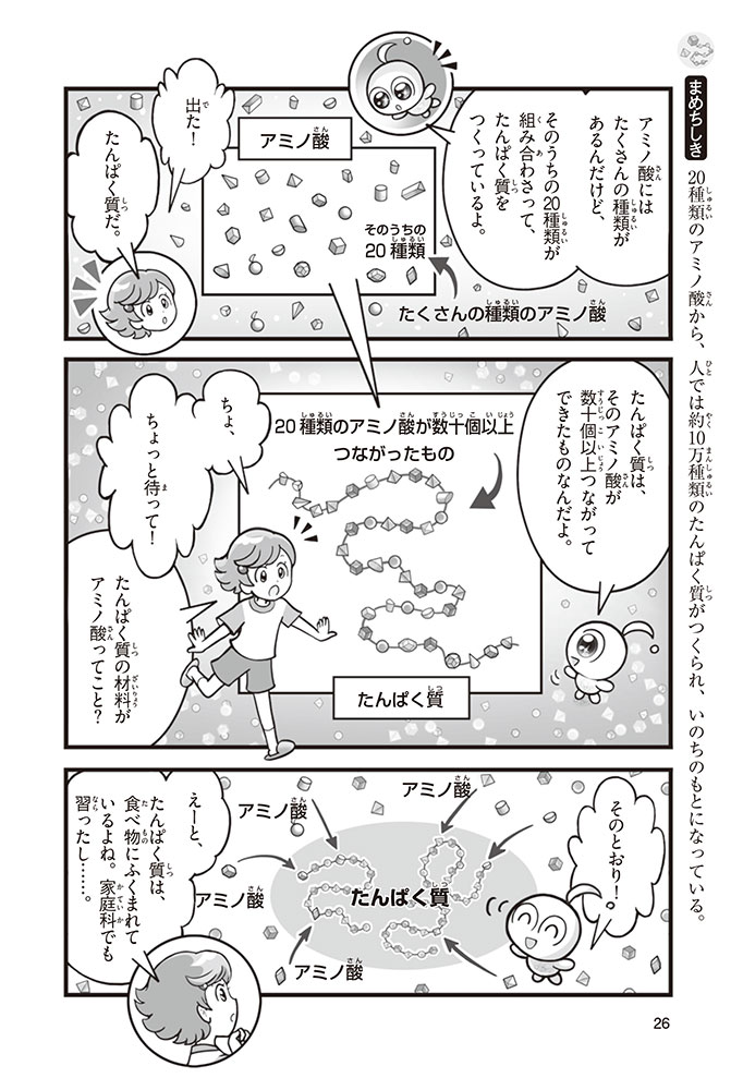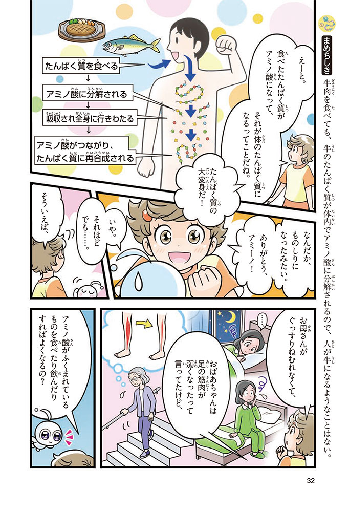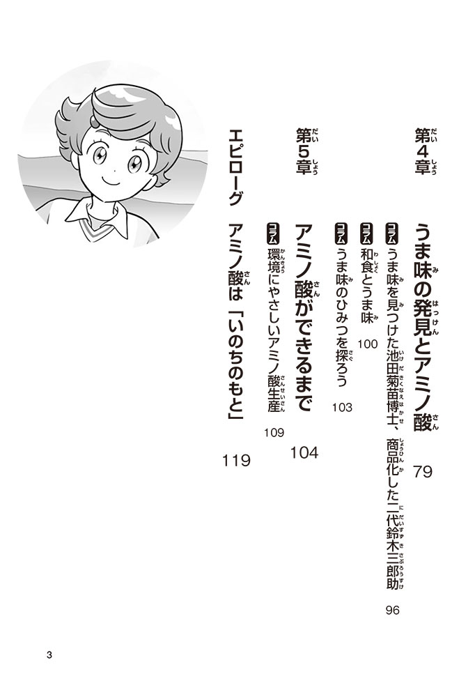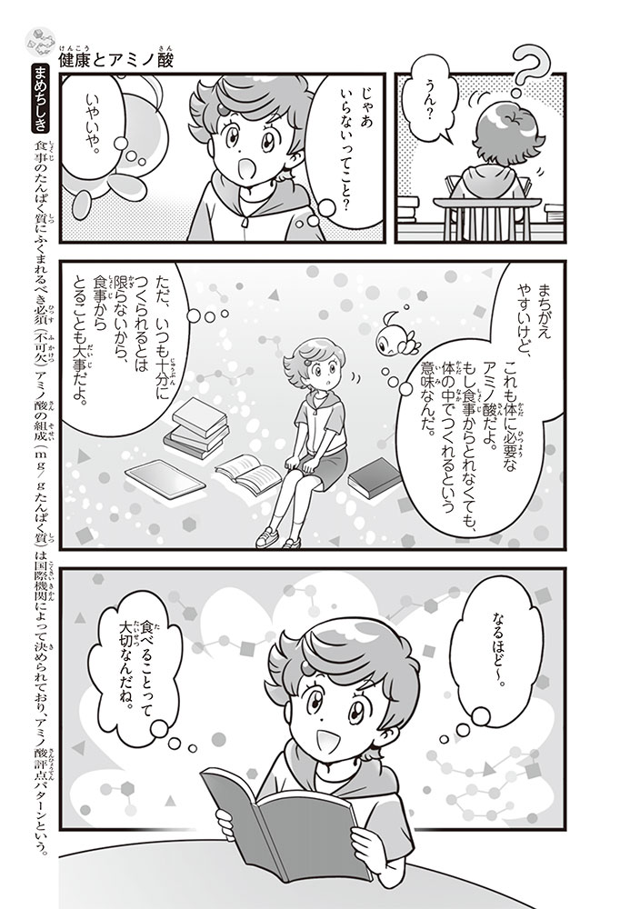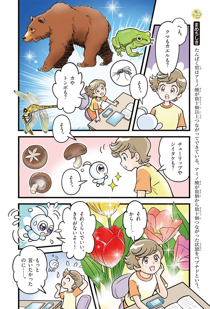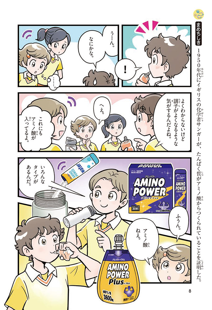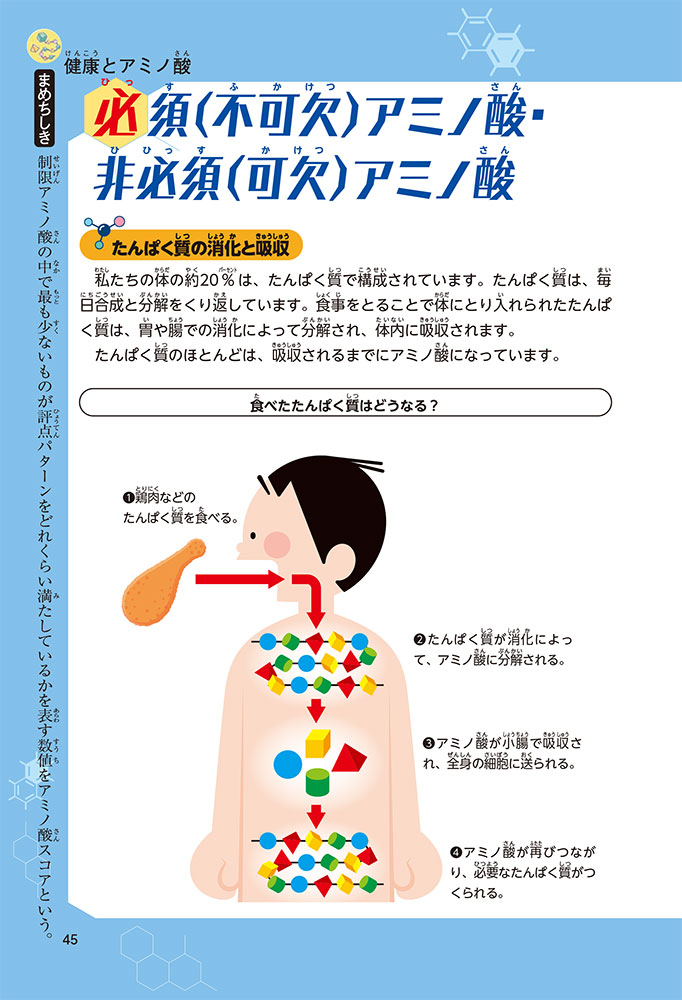 私たちの体をつくっているたんぱく質。そのたんぱく質をつくっているのが「アミノ酸」なんだ。アミノ酸は健康を保ったり、体を動かしたりするときにも大切な役割をはたしている。だからアミノ酸は「いのちのもと」ともいえるんだよ。さらにアミノ酸は、食べ物のおいしさにも大きく関わり、スポーツ、美容、医療など、多くの分野でも役立っているんだ。本書は、サッカー大会で友人がアミノ酸配合のドリンクを飲んでいたことをきっかけに、アミノ酸に興味をもつようになった小学生の阿地野(あじの)モトコが主人公。アミノ酸の妖精アミーノと出会い、いっしょに調べながら学んでいくよ。みんなもこの本を読んで、アミノ酸についてもっと知って、毎日を元気に過ごそう!