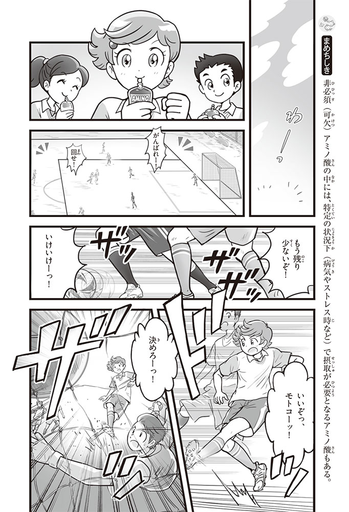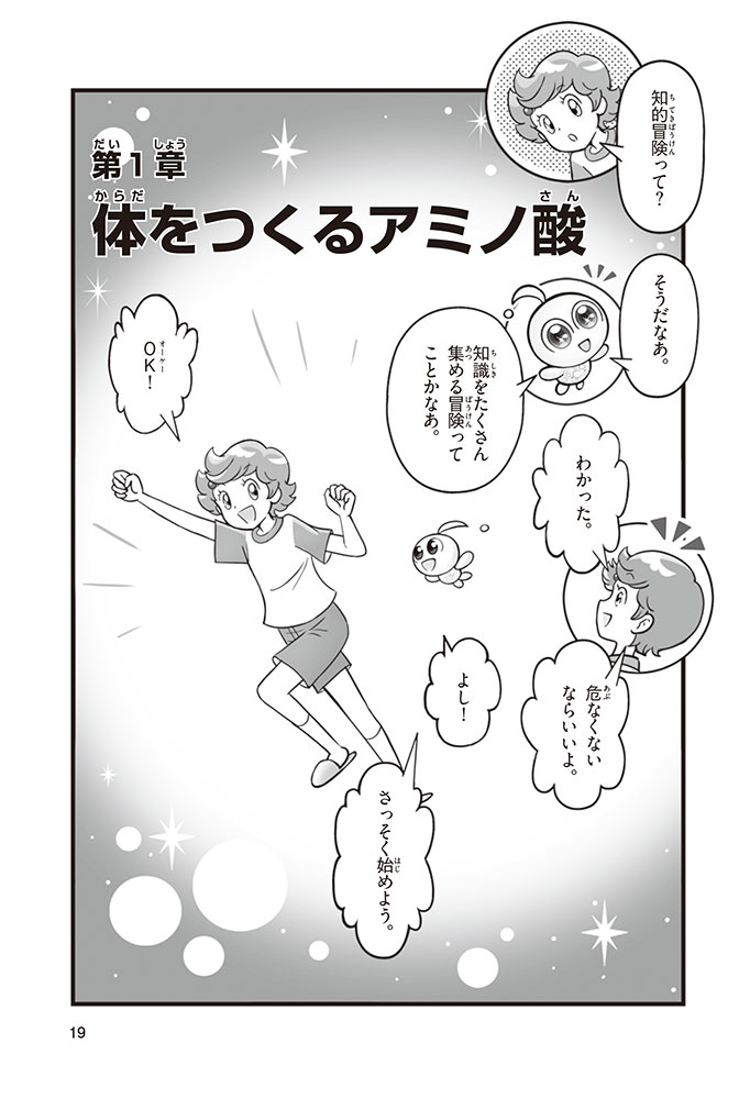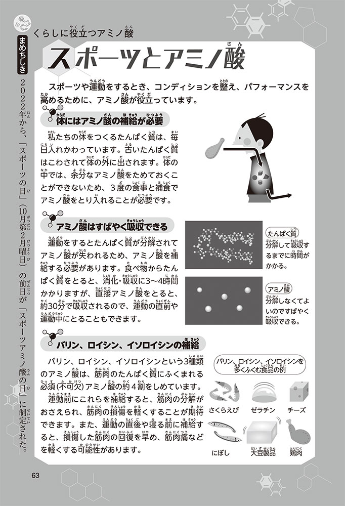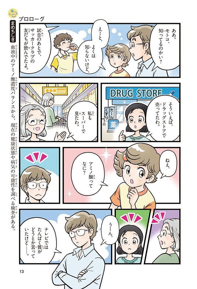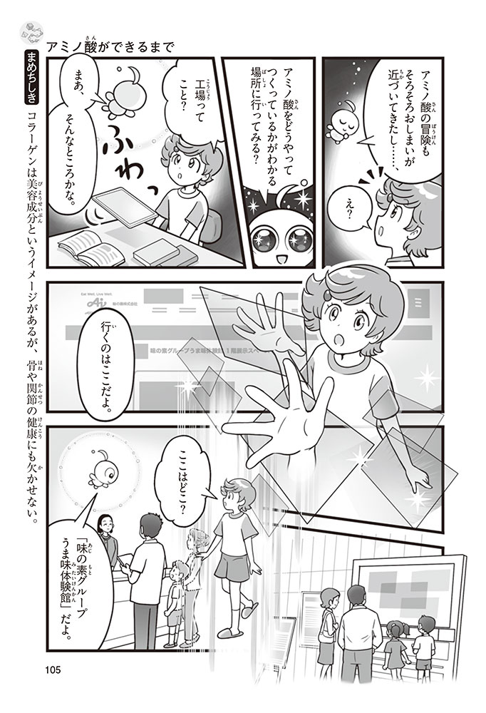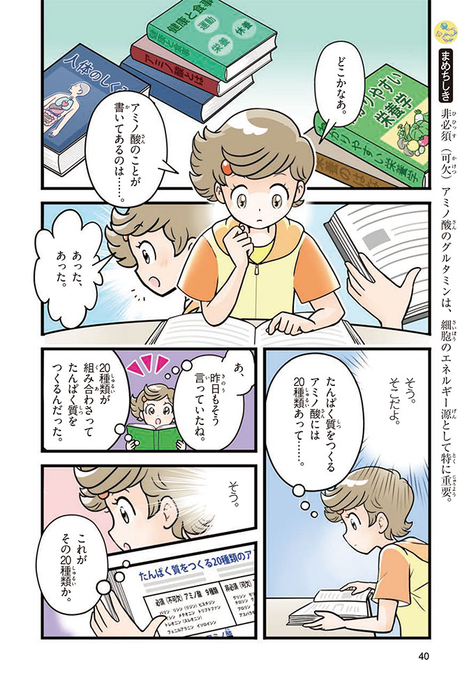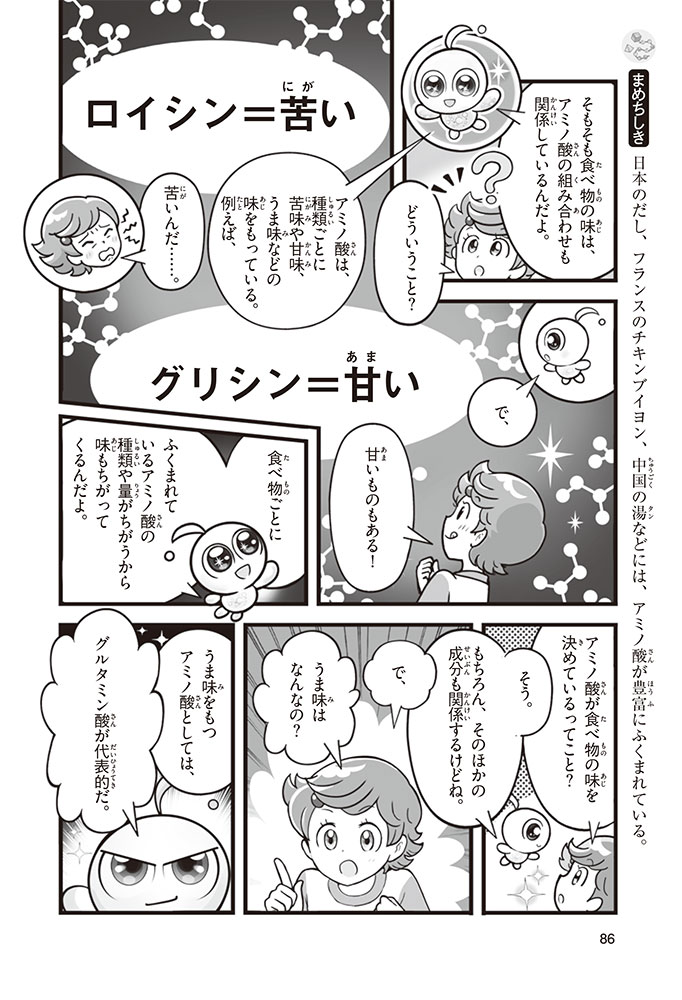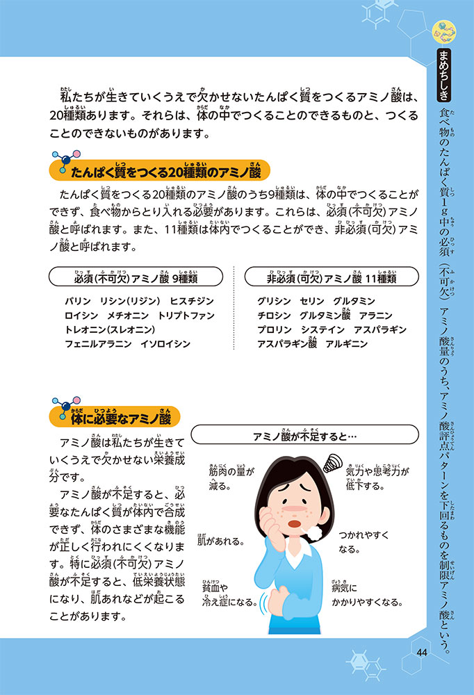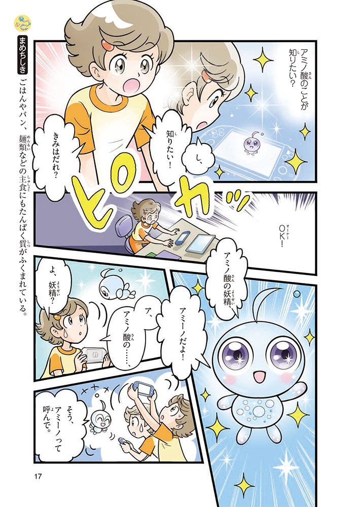 私たちの体をつくっているたんぱく質。そのたんぱく質をつくっているのが「アミノ酸」なんだ。アミノ酸は健康を保ったり、体を動かしたりするときにも大切な役割をはたしている。だからアミノ酸は「いのちのもと」ともいえるんだよ。さらにアミノ酸は、食べ物のおいしさにも大きく関わり、スポーツ、美容、医療など、多くの分野でも役立っているんだ。本書は、サッカー大会で友人がアミノ酸配合のドリンクを飲んでいたことをきっかけに、アミノ酸に興味をもつようになった小学生の阿地野(あじの)モトコが主人公。アミノ酸の妖精アミーノと出会い、いっしょに調べながら学んでいくよ。みんなもこの本を読んで、アミノ酸についてもっと知って、毎日を元気に過ごそう!
