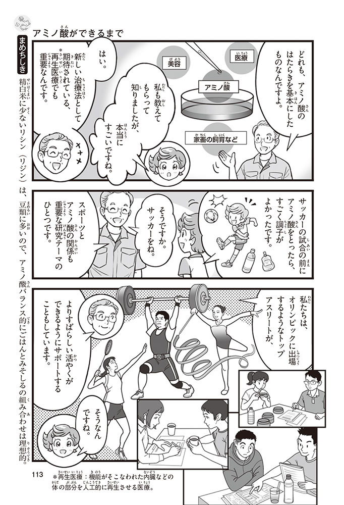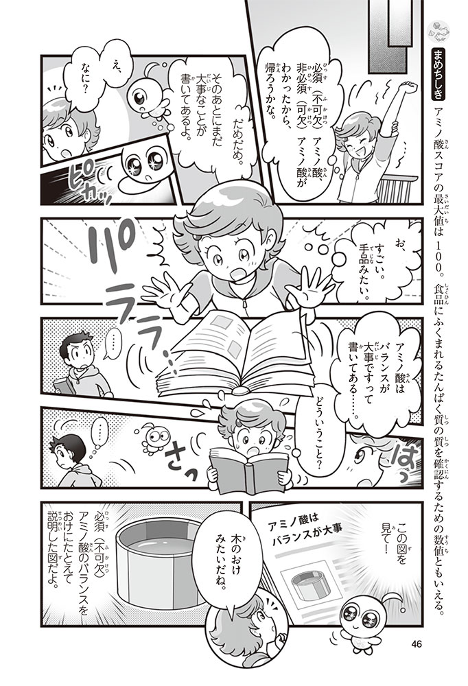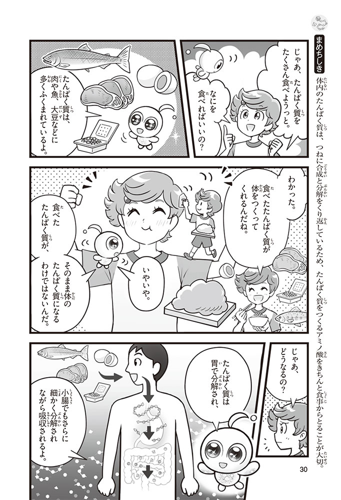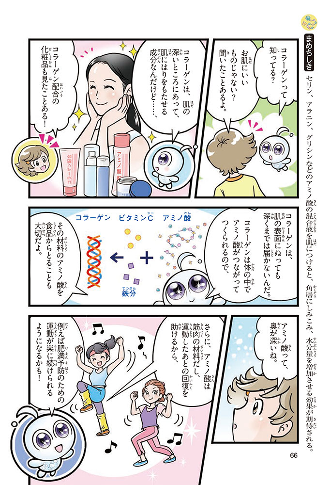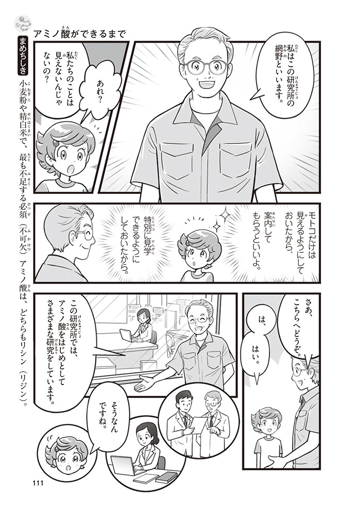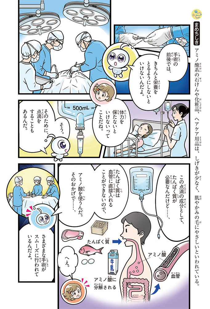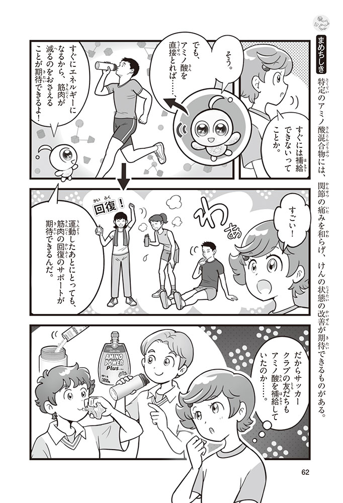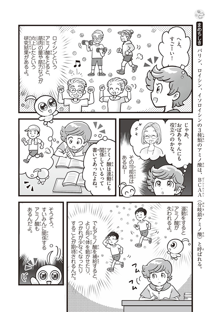 私たちの体をつくっているたんぱく質。そのたんぱく質をつくっているのが「アミノ酸」なんだ。アミノ酸は健康を保ったり、体を動かしたりするときにも大切な役割をはたしている。だからアミノ酸は「いのちのもと」ともいえるんだよ。さらにアミノ酸は、食べ物のおいしさにも大きく関わり、スポーツ、美容、医療など、多くの分野でも役立っているんだ。本書は、サッカー大会で友人がアミノ酸配合のドリンクを飲んでいたことをきっかけに、アミノ酸に興味をもつようになった小学生の阿地野(あじの)モトコが主人公。アミノ酸の妖精アミーノと出会い、いっしょに調べながら学んでいくよ。みんなもこの本を読んで、アミノ酸についてもっと知って、毎日を元気に過ごそう!