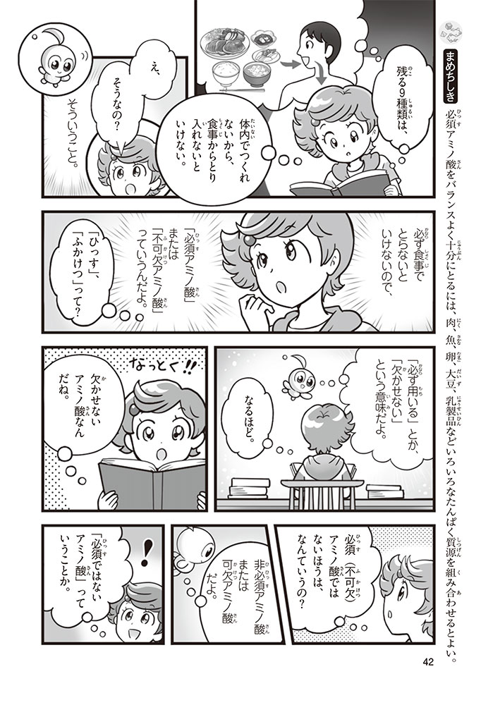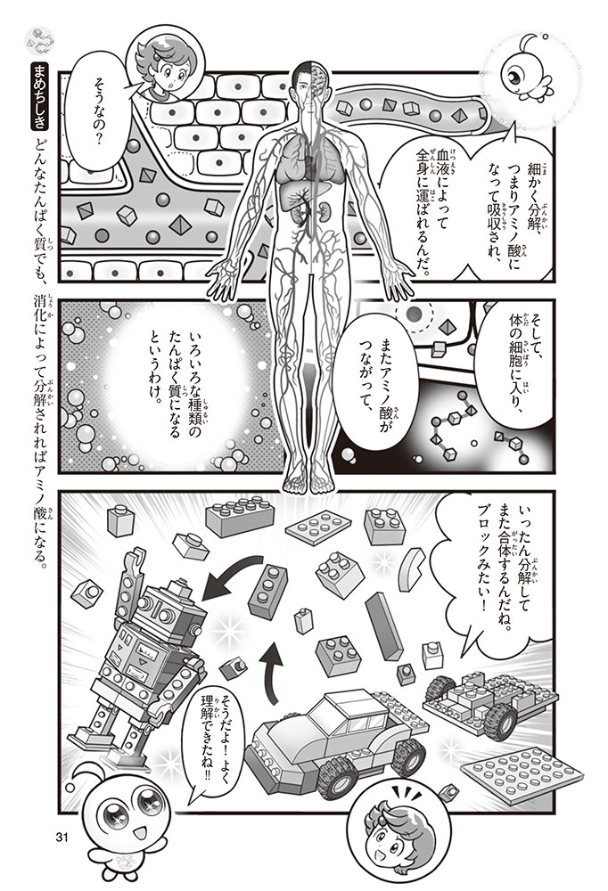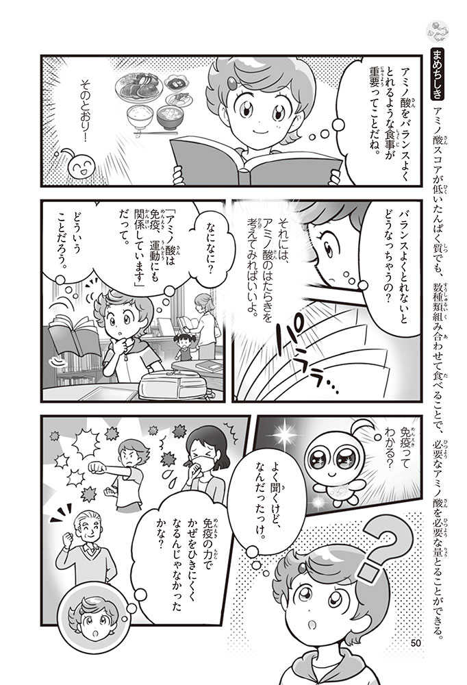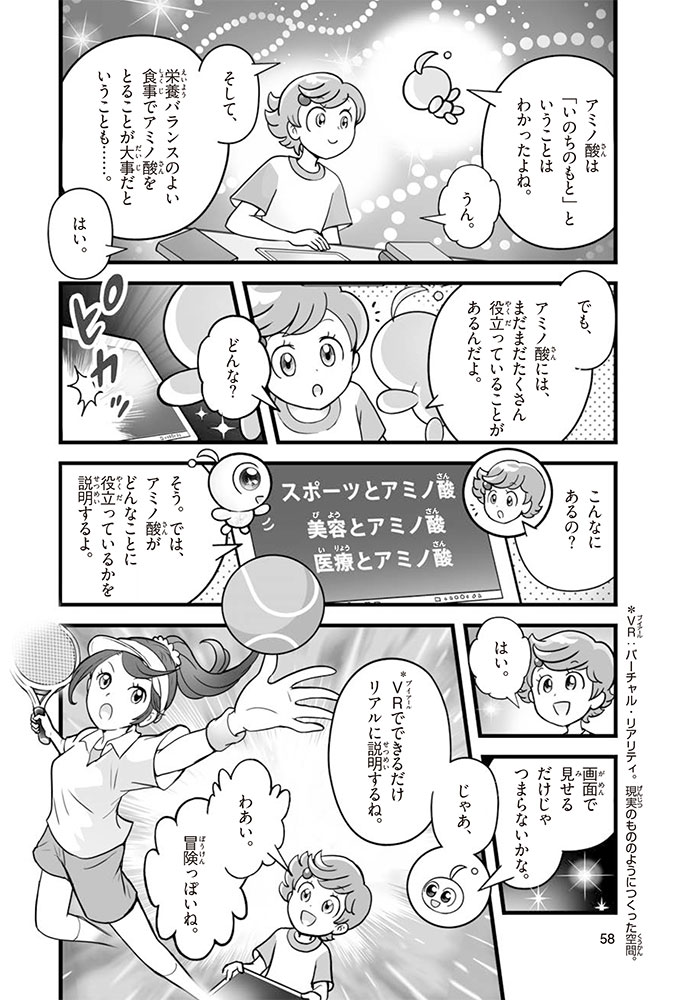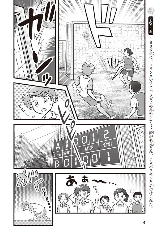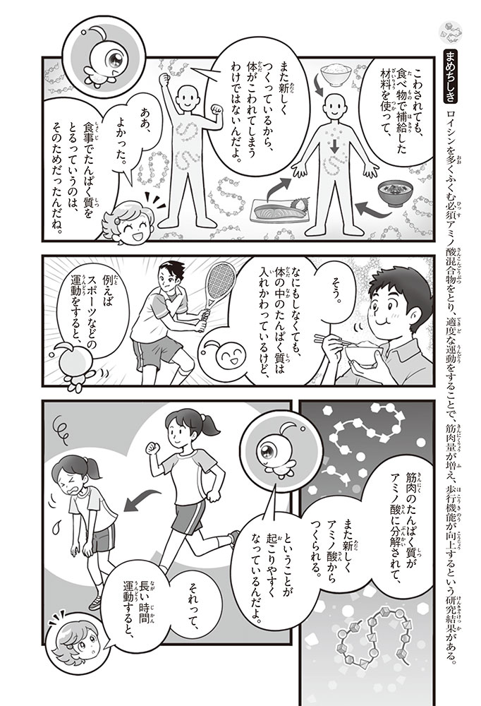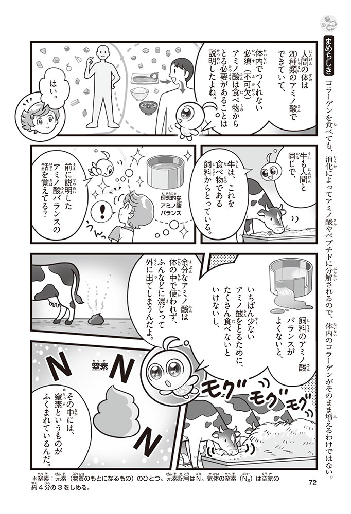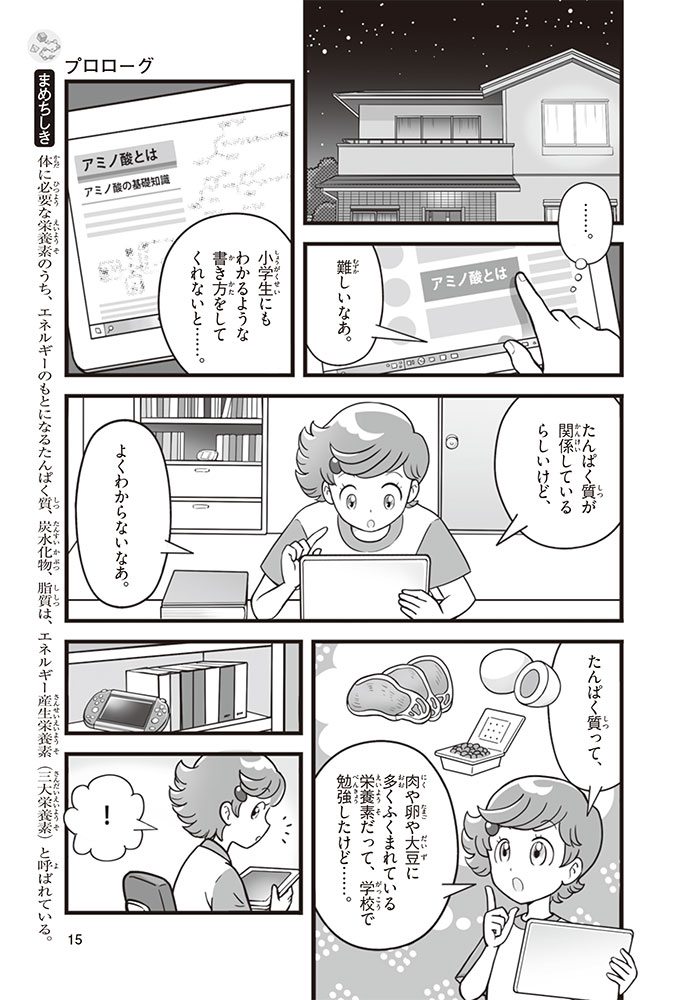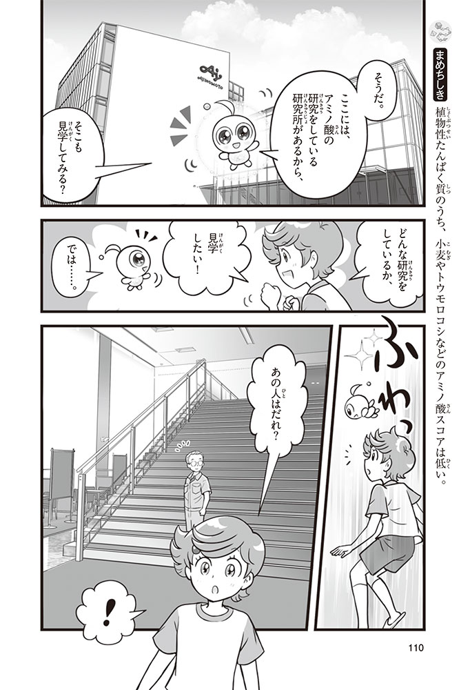 私たちの体をつくっているたんぱく質。そのたんぱく質をつくっているのが「アミノ酸」なんだ。アミノ酸は健康を保ったり、体を動かしたりするときにも大切な役割をはたしている。だからアミノ酸は「いのちのもと」ともいえるんだよ。さらにアミノ酸は、食べ物のおいしさにも大きく関わり、スポーツ、美容、医療など、多くの分野でも役立っているんだ。本書は、サッカー大会で友人がアミノ酸配合のドリンクを飲んでいたことをきっかけに、アミノ酸に興味をもつようになった小学生の阿地野(あじの)モトコが主人公。アミノ酸の妖精アミーノと出会い、いっしょに調べながら学んでいくよ。みんなもこの本を読んで、アミノ酸についてもっと知って、毎日を元気に過ごそう!