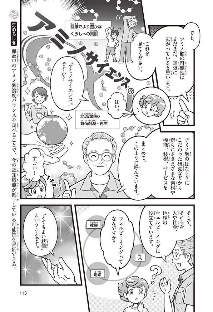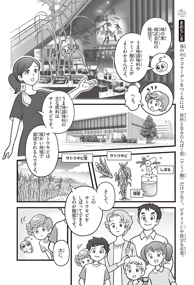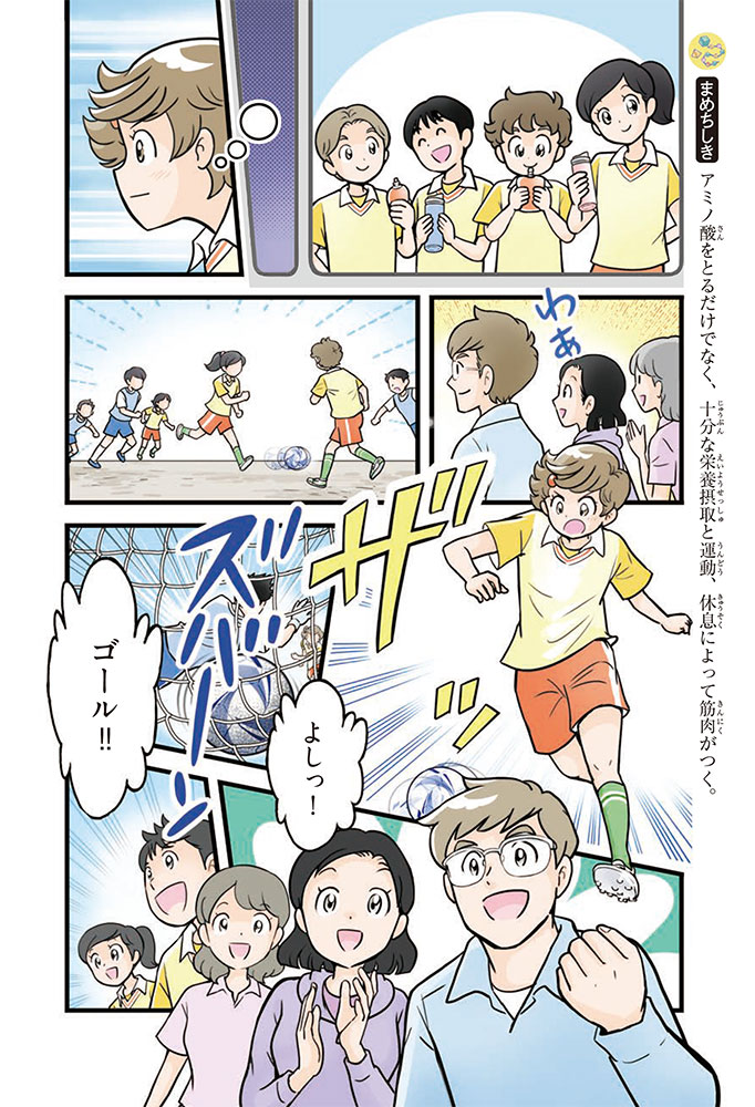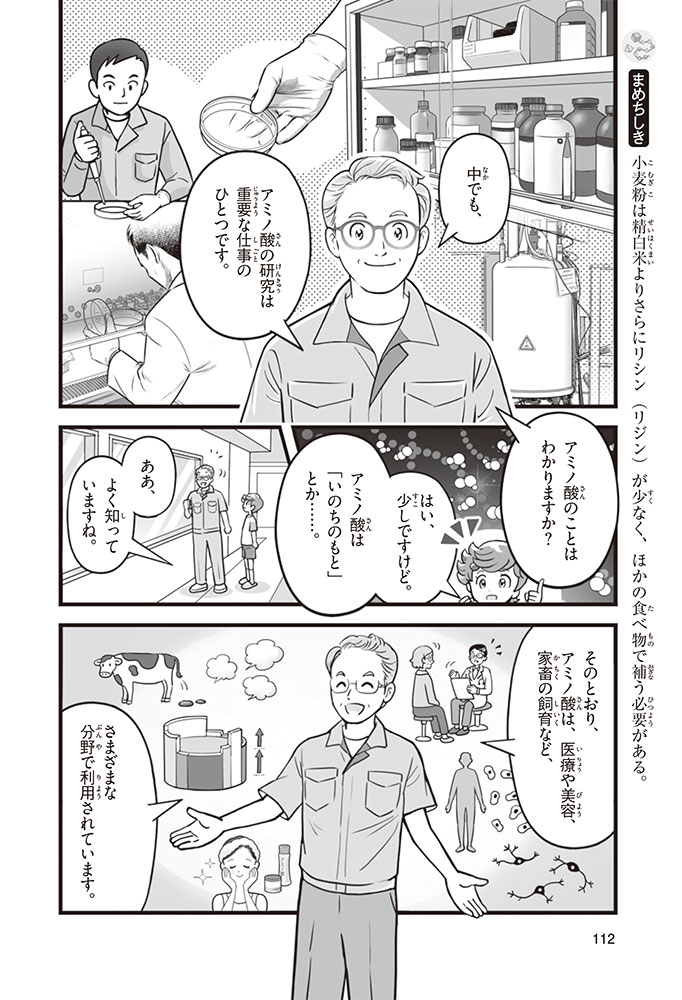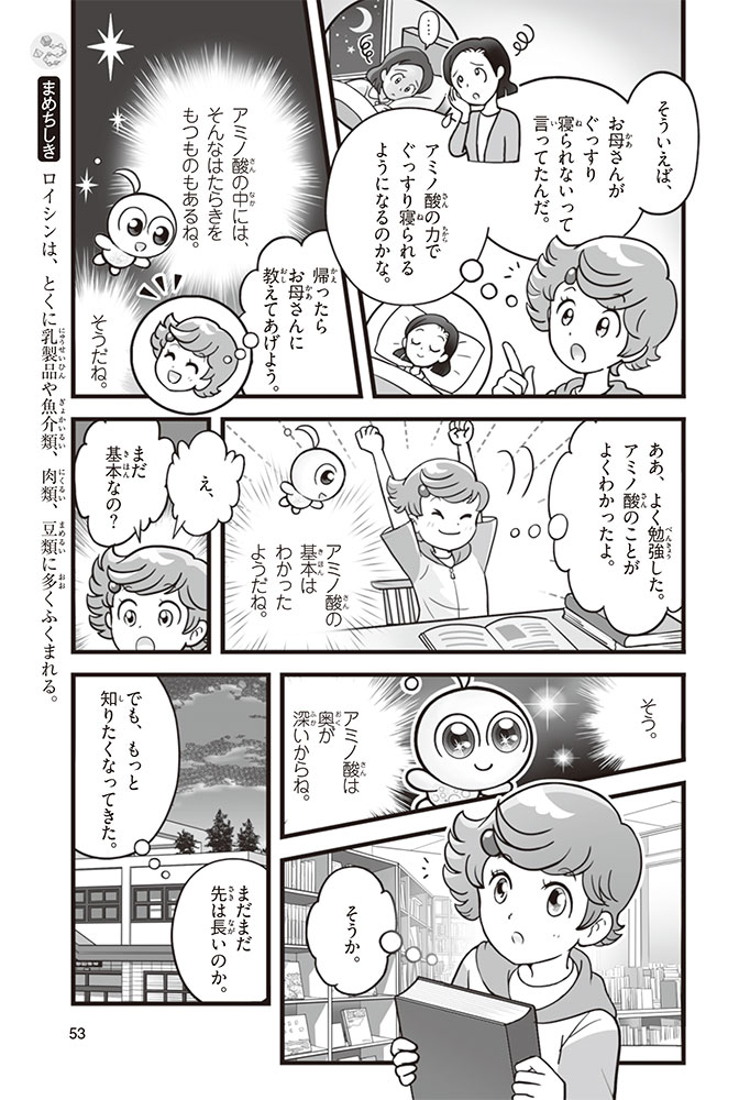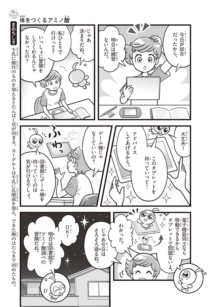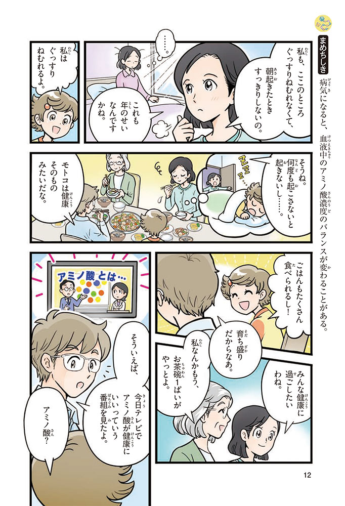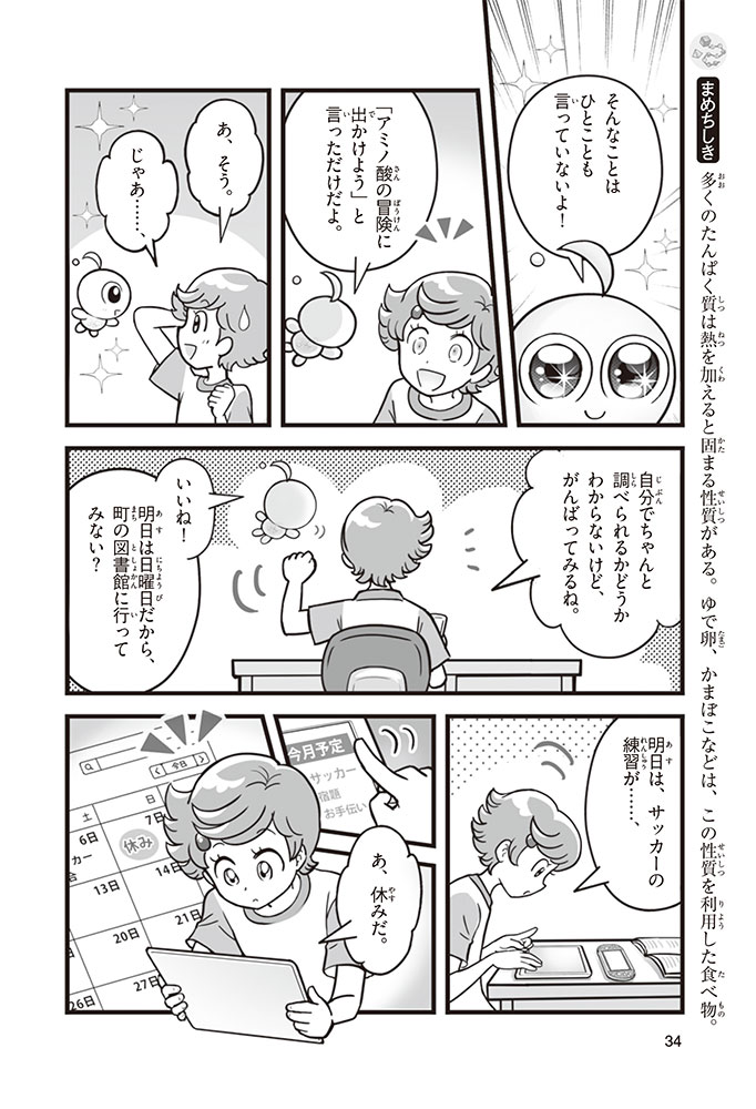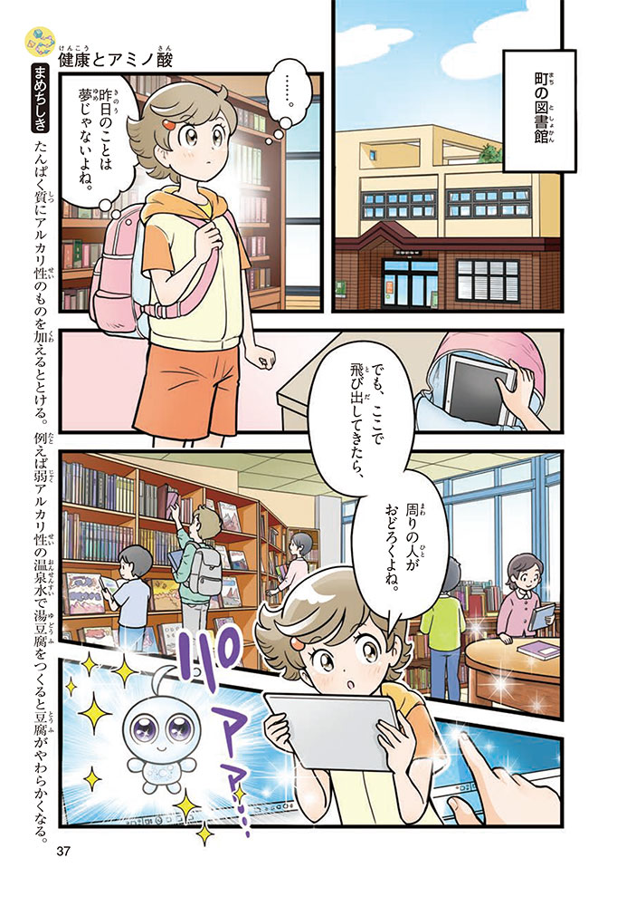 私たちの体をつくっているたんぱく質。そのたんぱく質をつくっているのが「アミノ酸」なんだ。アミノ酸は健康を保ったり、体を動かしたりするときにも大切な役割をはたしている。だからアミノ酸は「いのちのもと」ともいえるんだよ。さらにアミノ酸は、食べ物のおいしさにも大きく関わり、スポーツ、美容、医療など、多くの分野でも役立っているんだ。本書は、サッカー大会で友人がアミノ酸配合のドリンクを飲んでいたことをきっかけに、アミノ酸に興味をもつようになった小学生の阿地野(あじの)モトコが主人公。アミノ酸の妖精アミーノと出会い、いっしょに調べながら学んでいくよ。みんなもこの本を読んで、アミノ酸についてもっと知って、毎日を元気に過ごそう!