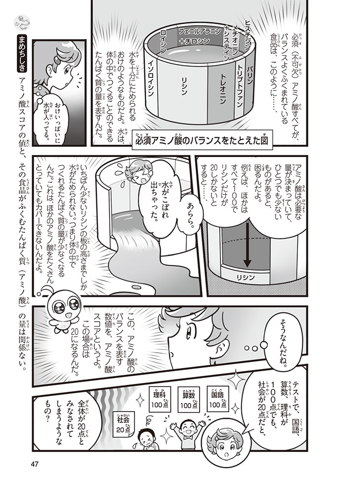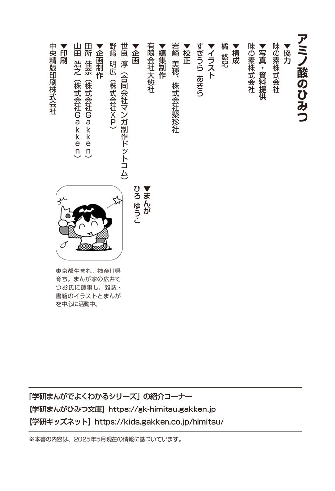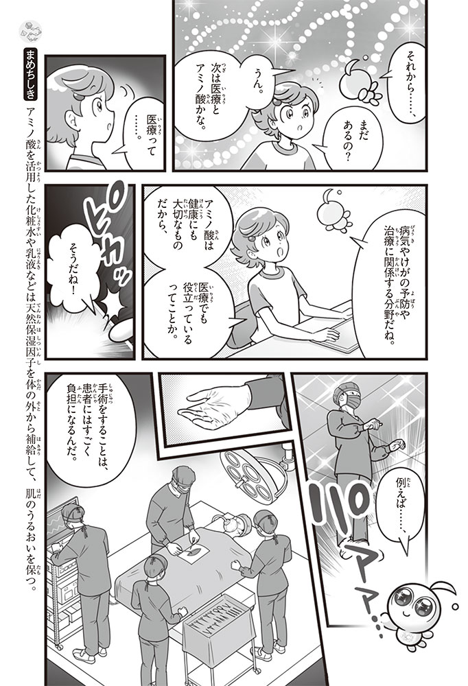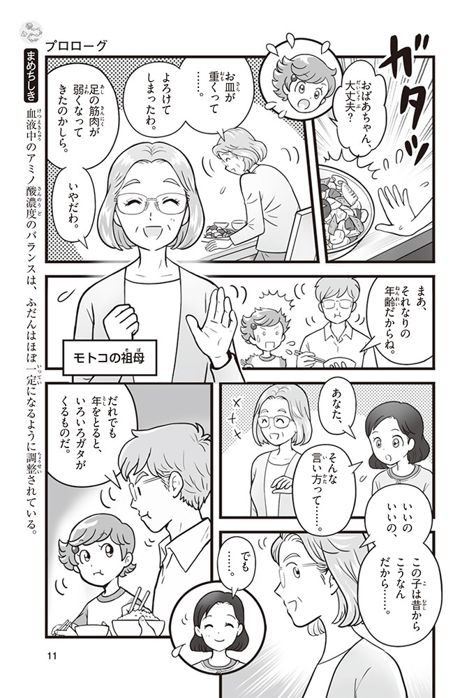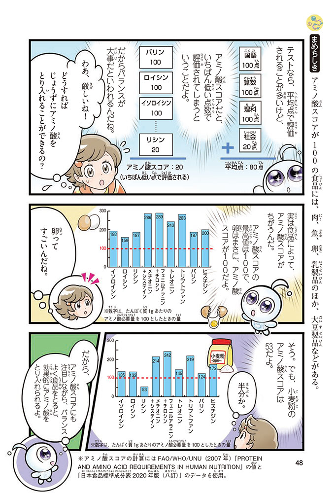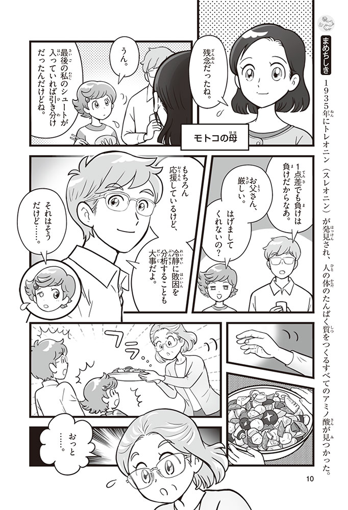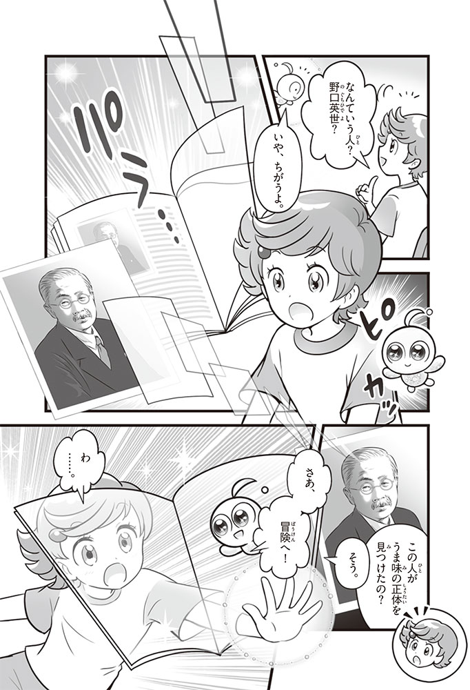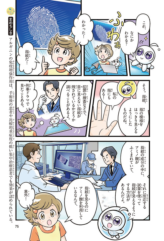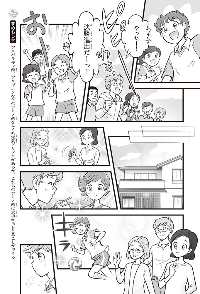 私たちの体をつくっているたんぱく質。そのたんぱく質をつくっているのが「アミノ酸」なんだ。アミノ酸は健康を保ったり、体を動かしたりするときにも大切な役割をはたしている。だからアミノ酸は「いのちのもと」ともいえるんだよ。さらにアミノ酸は、食べ物のおいしさにも大きく関わり、スポーツ、美容、医療など、多くの分野でも役立っているんだ。本書は、サッカー大会で友人がアミノ酸配合のドリンクを飲んでいたことをきっかけに、アミノ酸に興味をもつようになった小学生の阿地野(あじの)モトコが主人公。アミノ酸の妖精アミーノと出会い、いっしょに調べながら学んでいくよ。みんなもこの本を読んで、アミノ酸についてもっと知って、毎日を元気に過ごそう!