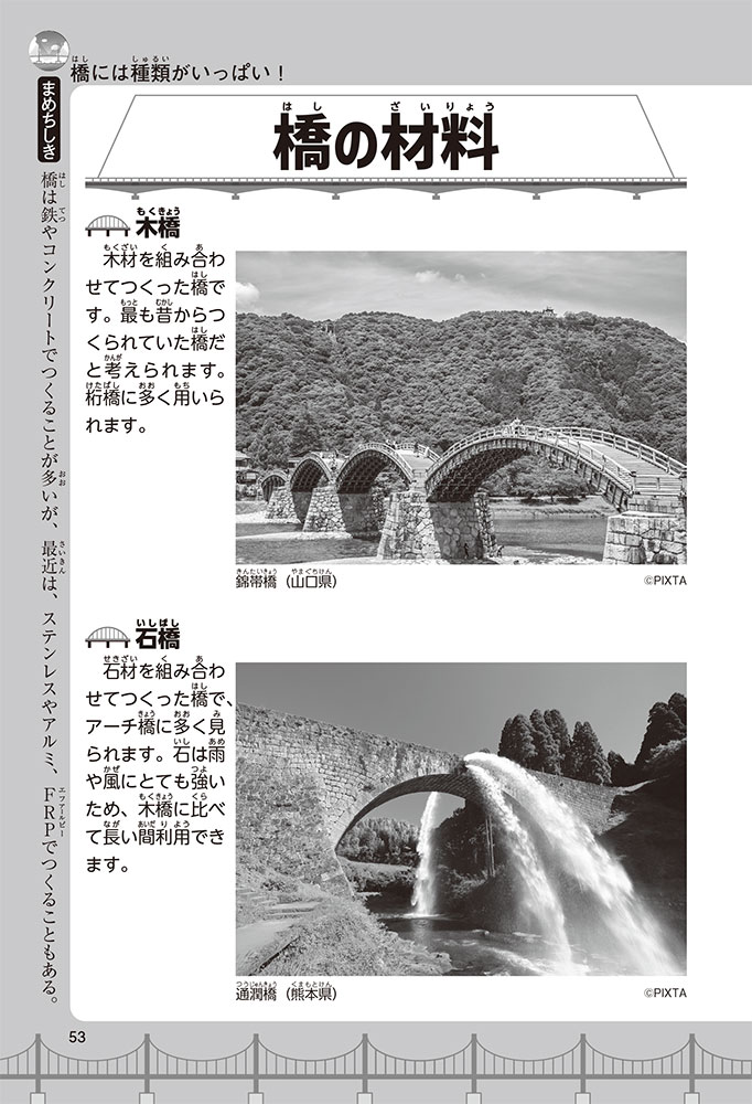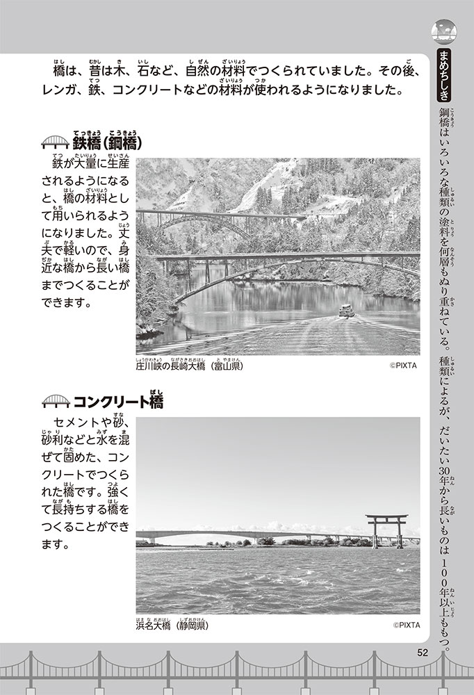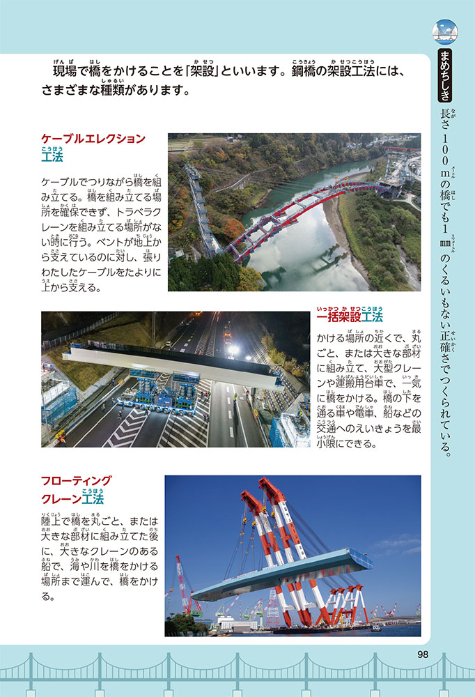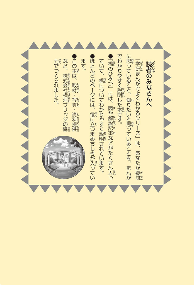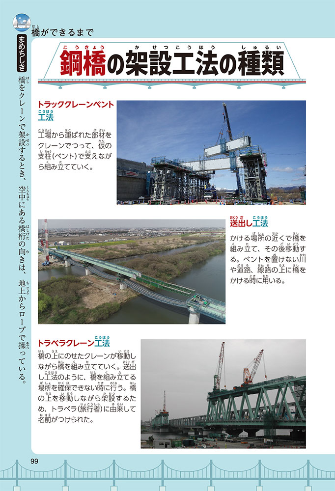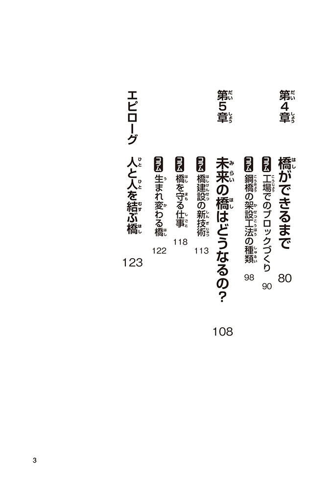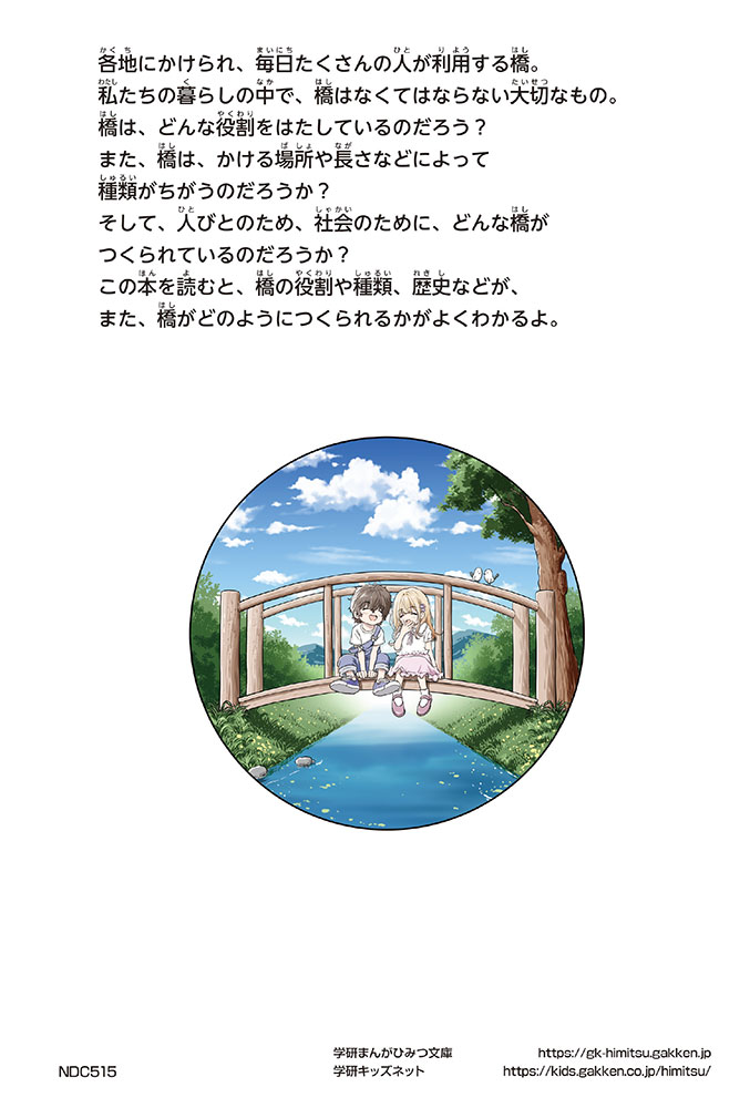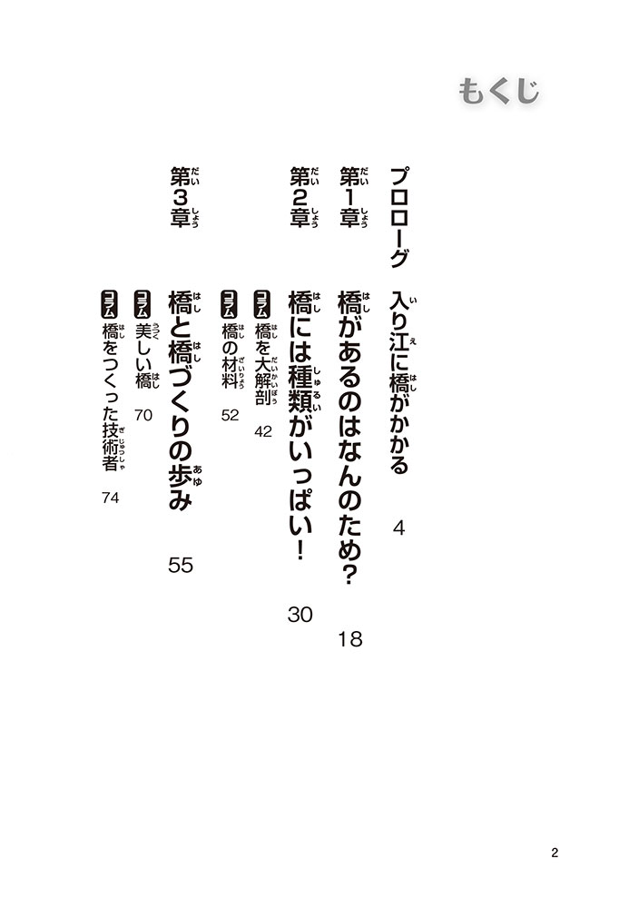 各地にかけられ、多くの人が毎日利用する橋。私たちの暮らしの中で、橋はなくてはならない大切なもの。橋は、かける場所や長さなどによって、さまざまな種類がある。この本を読むと、橋の役割や種類、歴史、そして橋の工法などがよくわかるよ。