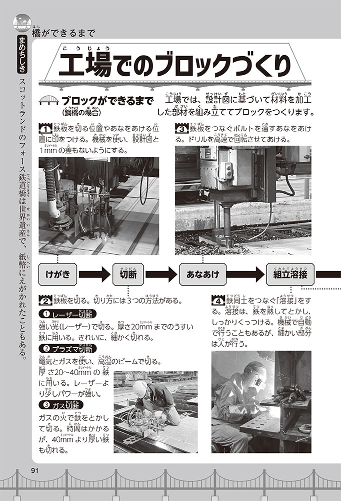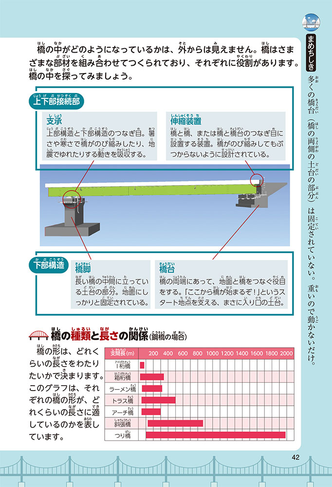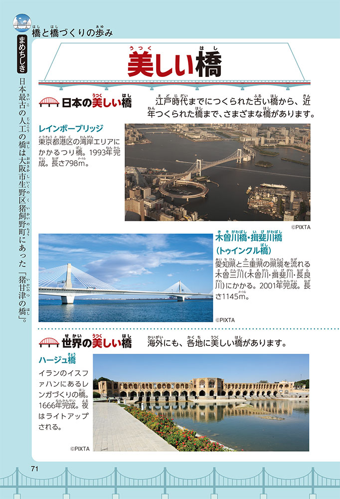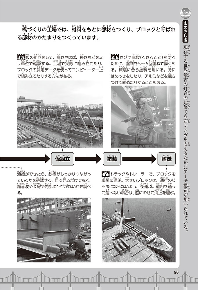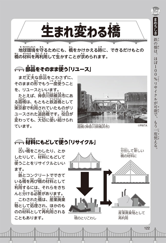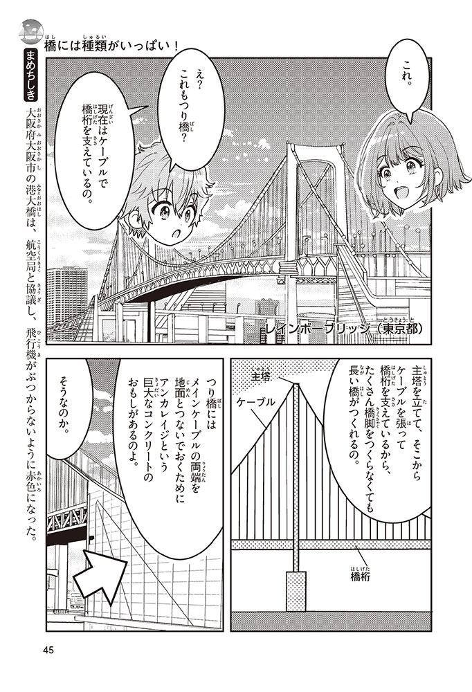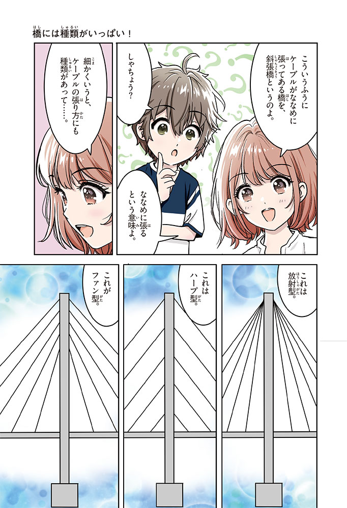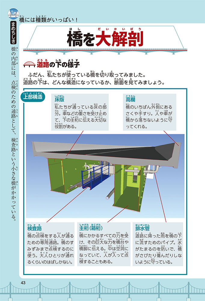 各地にかけられ、多くの人が毎日利用する橋。私たちの暮らしの中で、橋はなくてはならない大切なもの。橋は、かける場所や長さなどによって、さまざまな種類がある。この本を読むと、橋の役割や種類、歴史、そして橋の工法などがよくわかるよ。