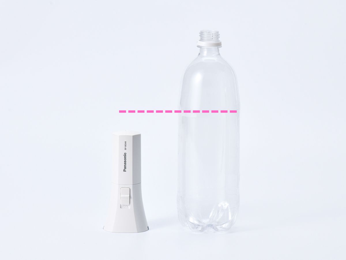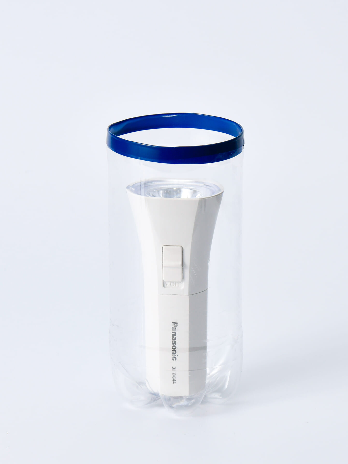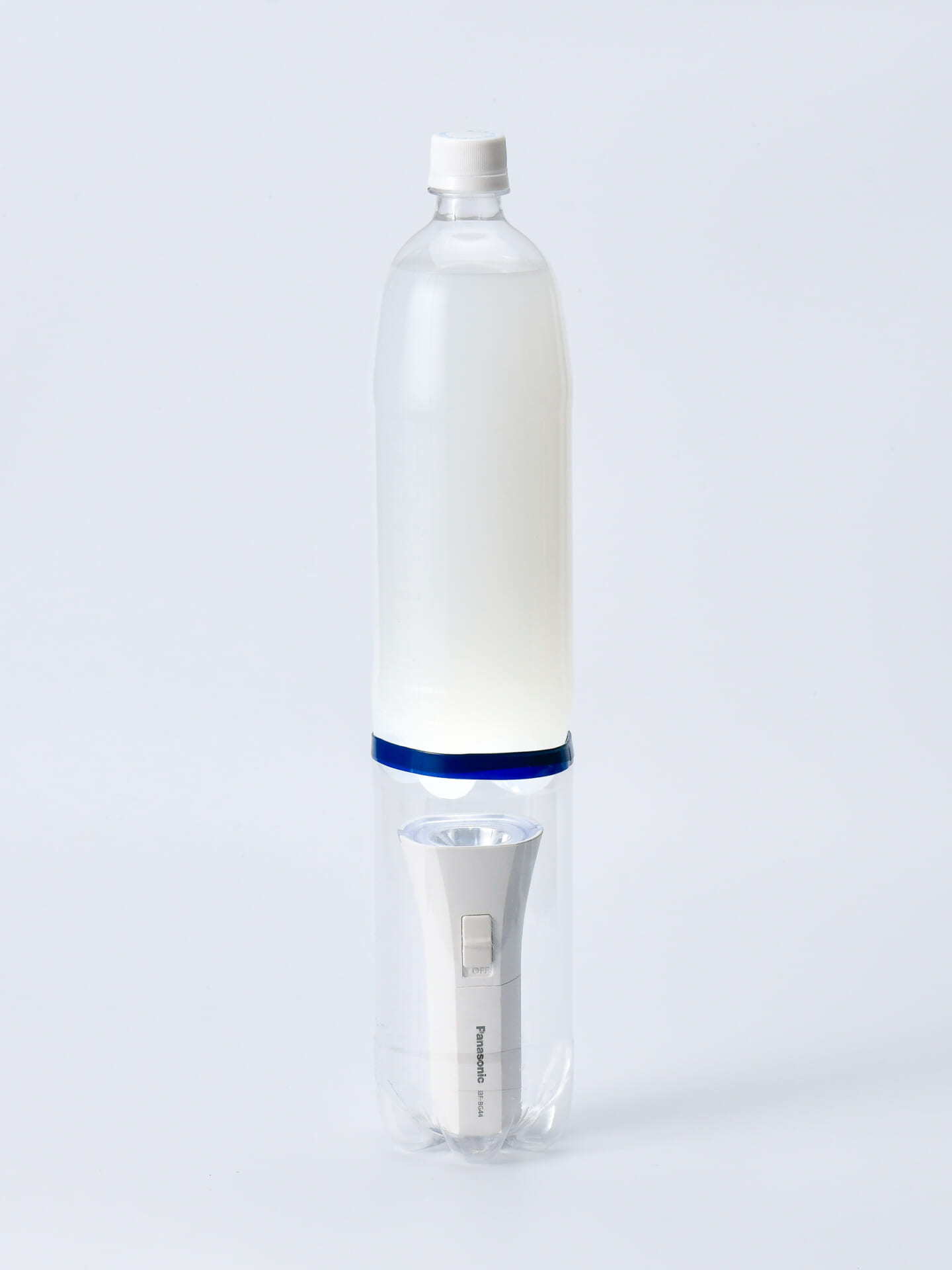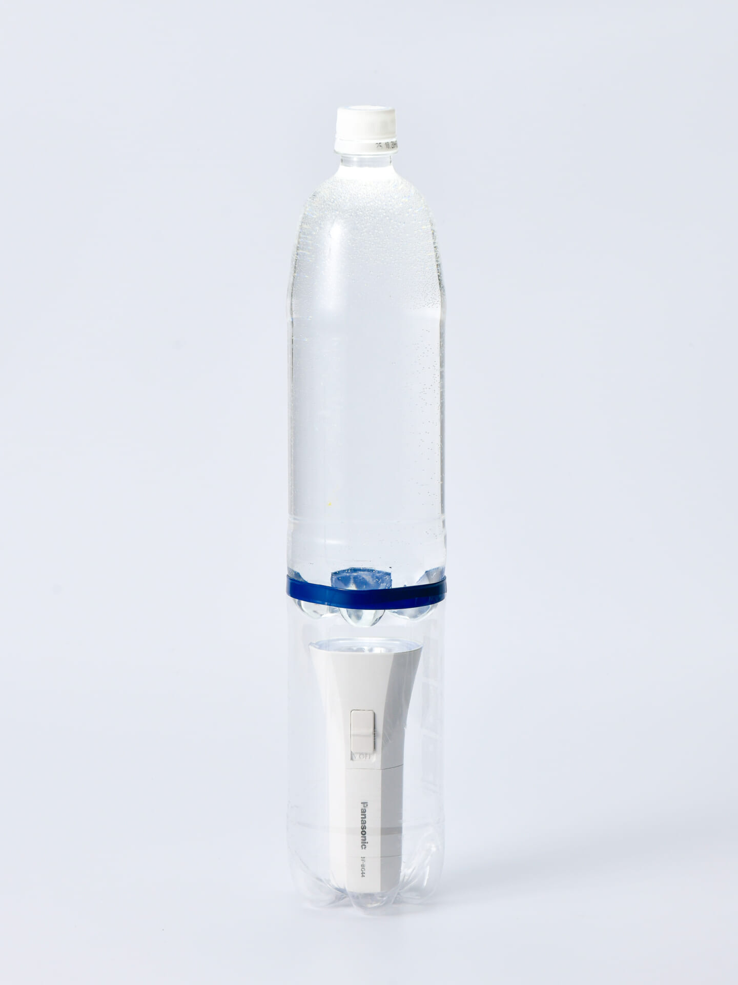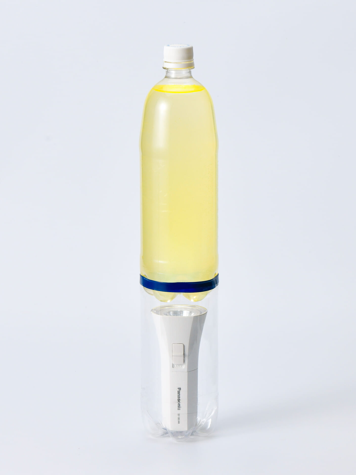懐中電灯のスイッチを入れ、光っているほうを上に向けてペットボトルの中に入れる。