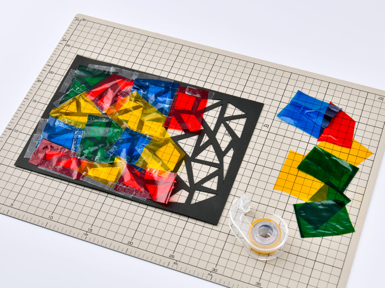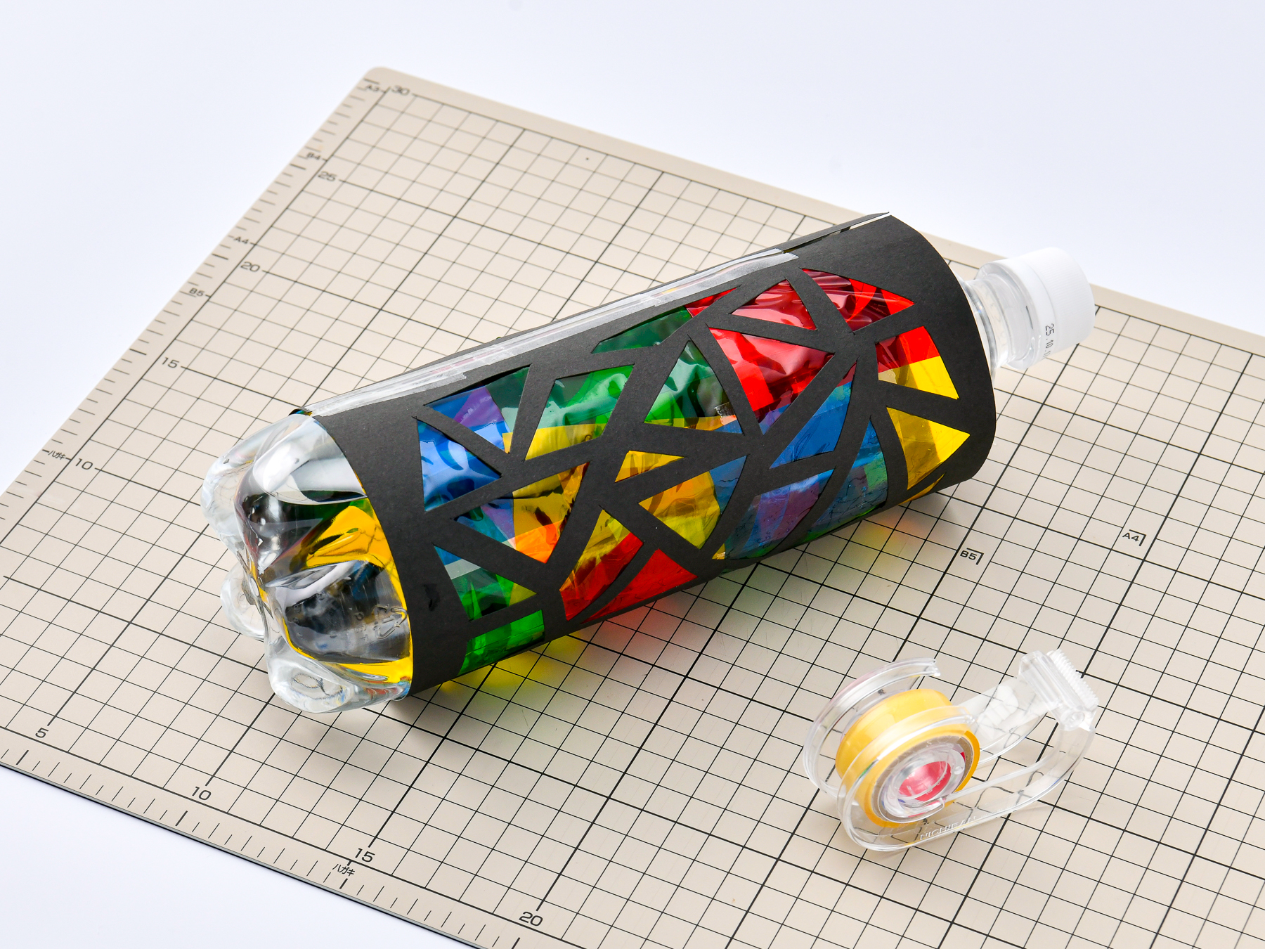 穴をあけた黒い画用紙にカラーセロハンをはったものをペットボトルに巻きつけると、光の色や模様が浮かんでオシャレなランタンに変身!